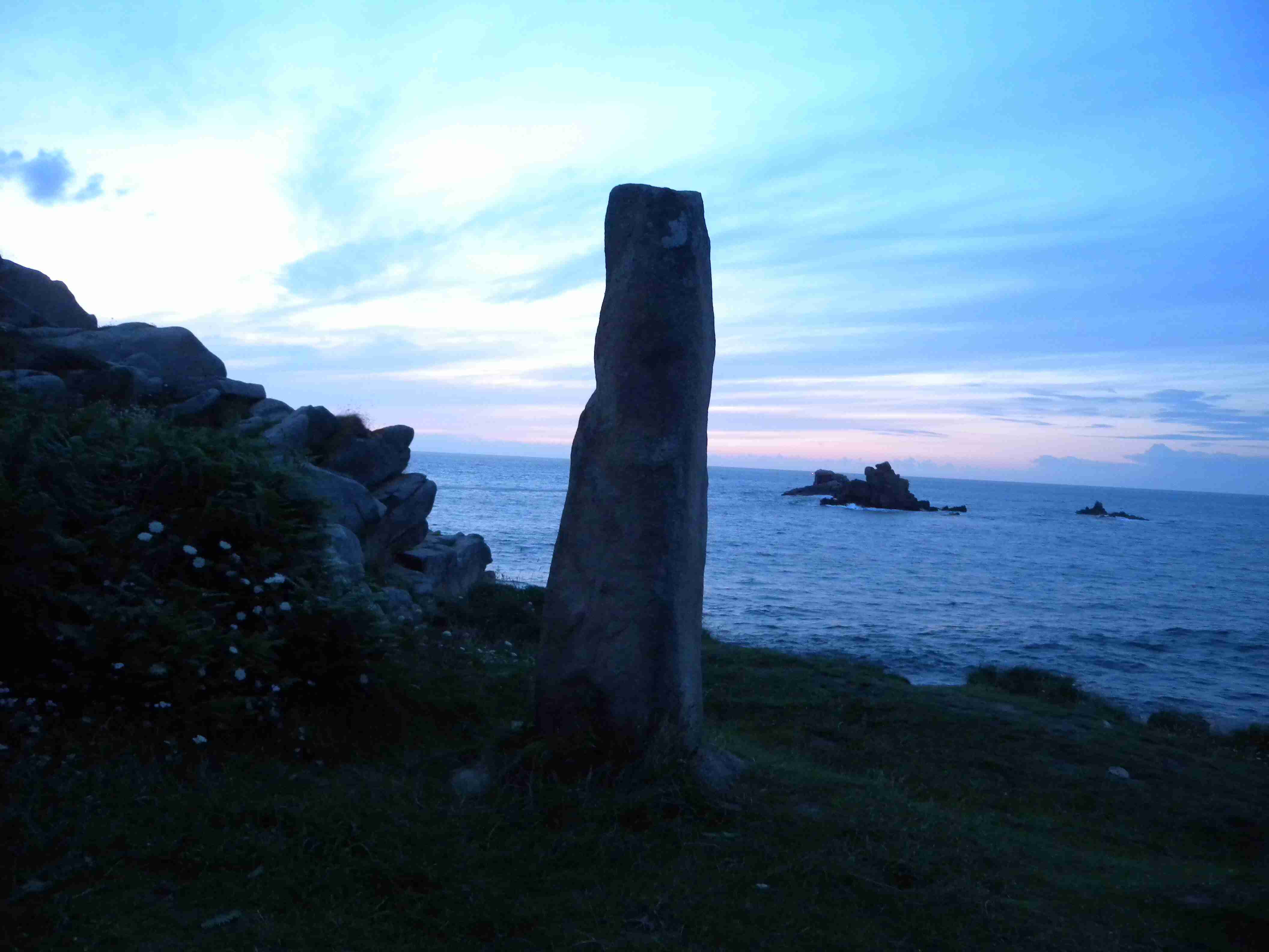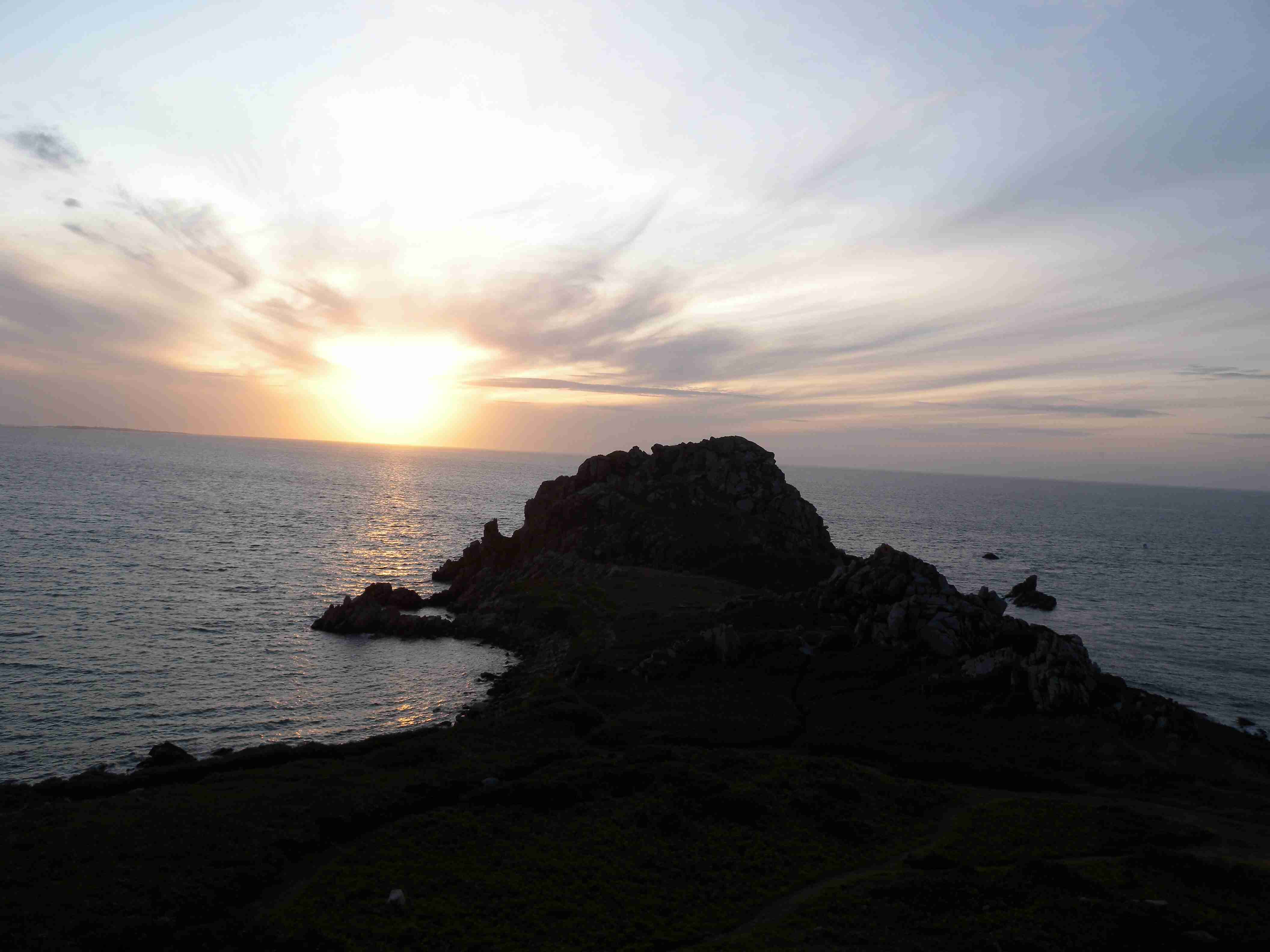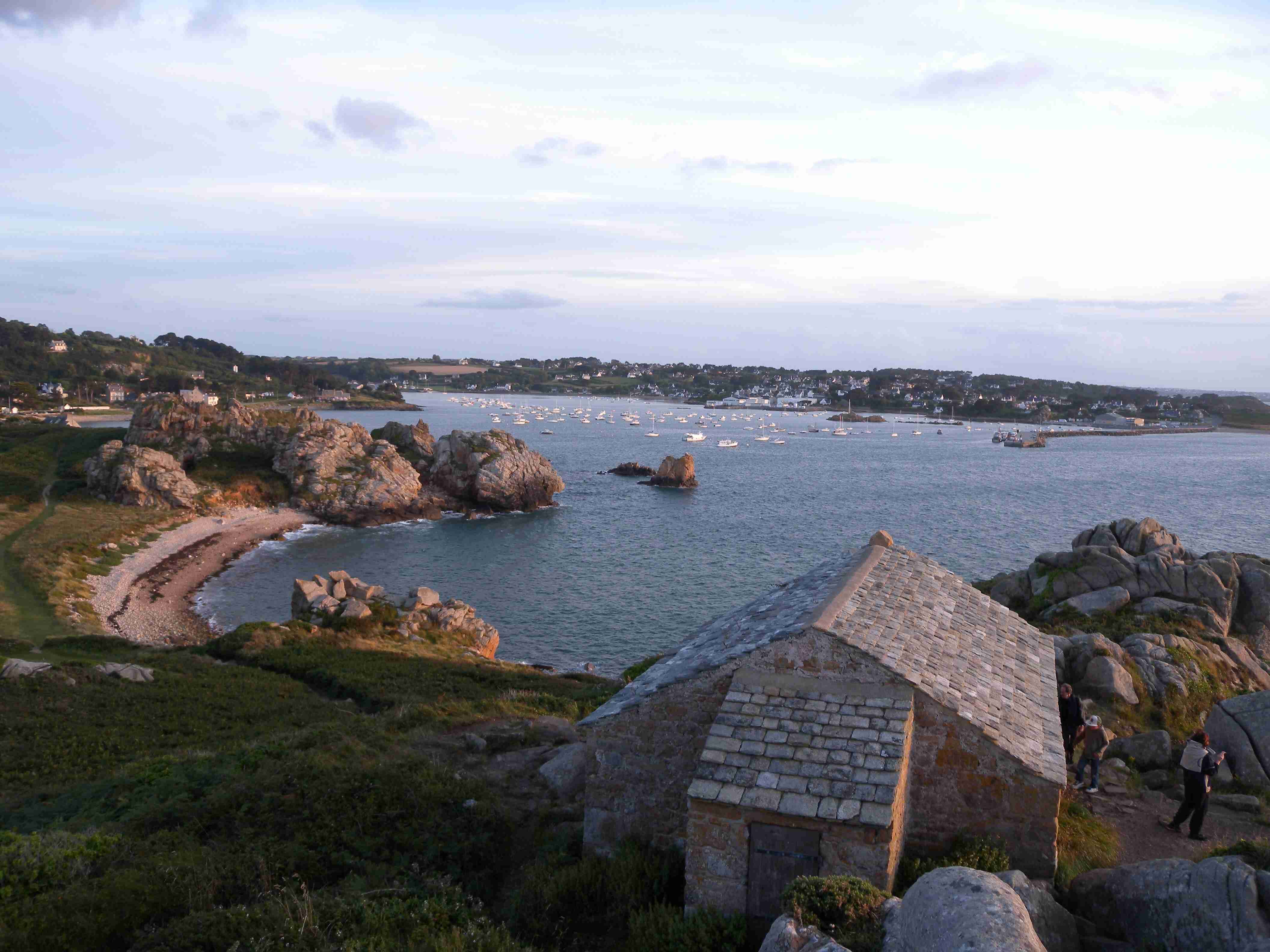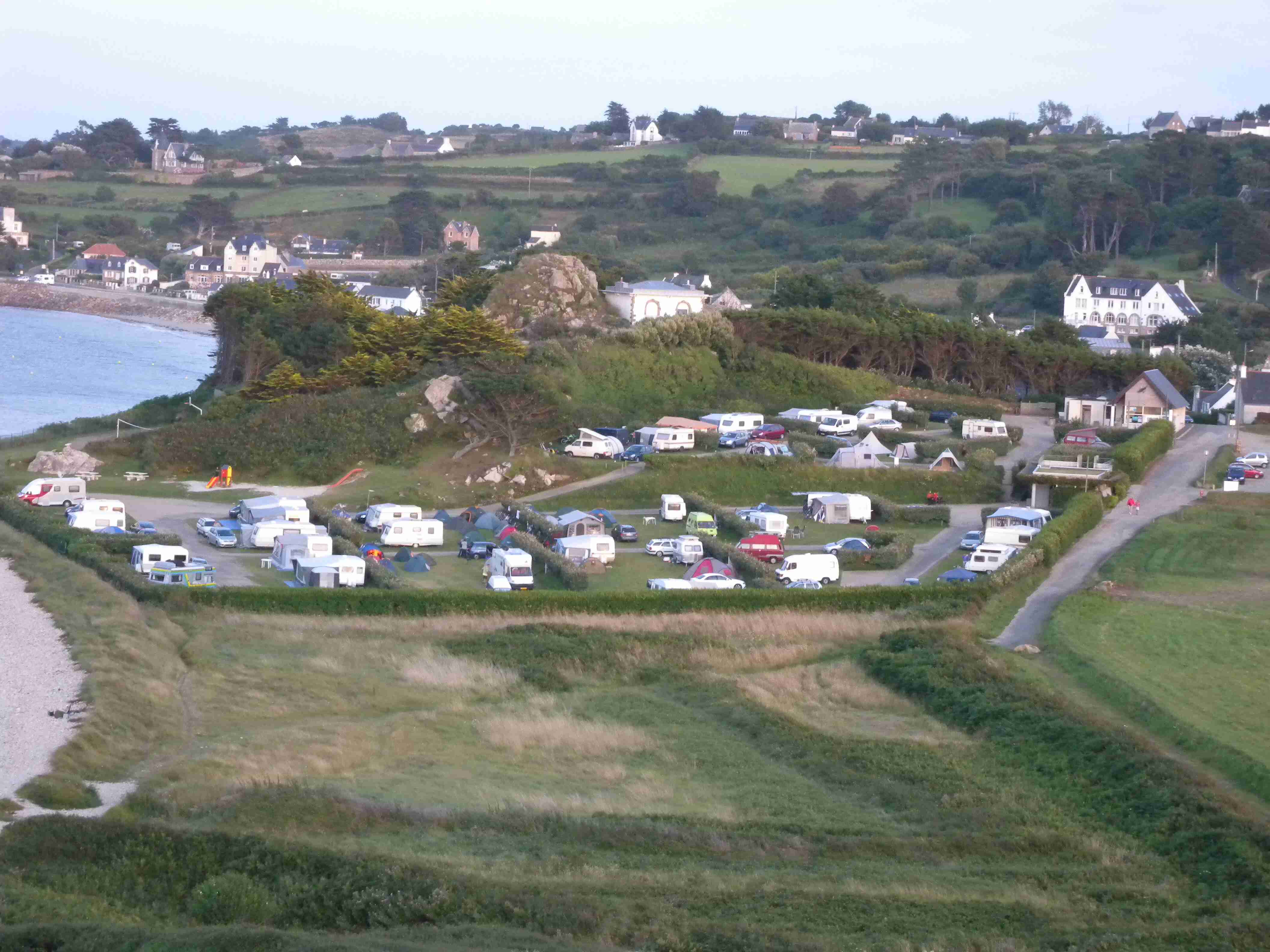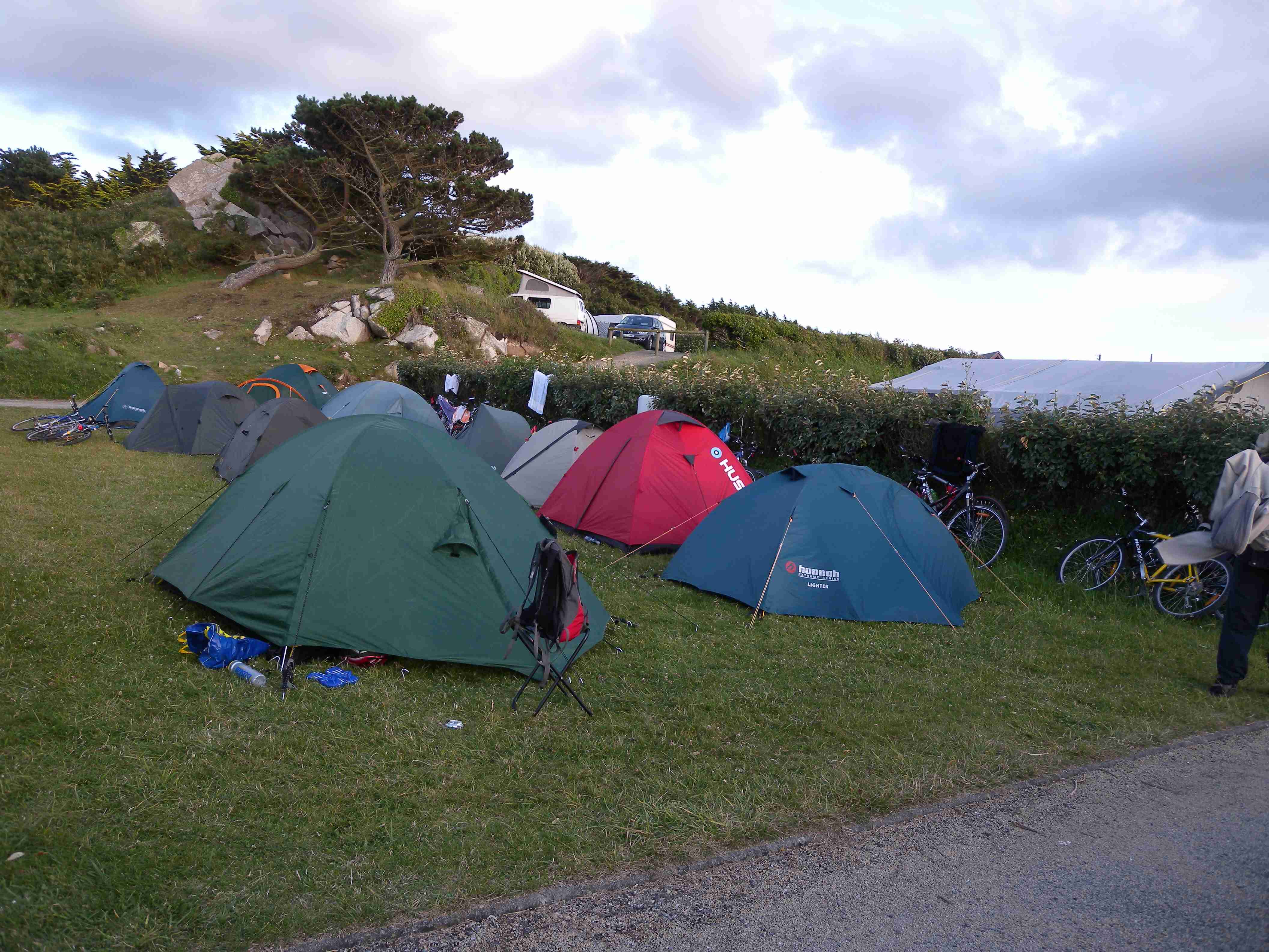 V noci vydatně pršelo, ráno už naštěstí ne, takže sice bylo všude mokro, ale to se dá přežít lépe, než déšť. Začátek snídaně se poněkud protáhl, francouzský socialismus se projevil opožděnou dodávkou baget, půl hodiny sem - půl hodiny tam, žádný problém. Nakonec jsme tedy vyrazili busem směr farní dvorce - konkrétně městečko Guimiliau, kde jsme prohlídkou strávili asi hodinu a pokračovali jsme do kempu u Primel-Tregastel. Kemp byl poměrně blízko u moře, my jsme se ubytovali a v cca 14.30 jsme vyrazili na kolo. Byli jsme s Ivou už poslední, tak jsme vyrazili sami, pomalounku, polehounku. Cesta byla již poněkud kopcovitější, než dole na jihu, brali jsme to po pobřeží a dojeli jsme do obce Cairn de Barnenez, kde jsme hned na začátku narazili na Marcelu se Zdeňkem v restauraci, takže jsme přisedli a poobědvali salát z darů moře - byl vynikající. Po obědě jsme se vypravili na druhý konec obce navštívit kamennou mohylu Cairn de Barnenez, kde měli letáček o mohyle dokonce i v češtině. Jedná se o největší náhrobní stavbu v Evropě o délce 75 metrů a šířce 28 metrů vybudovanou v letech 4500 až 3900 před naším letopočtem, která ukrývá 12 pohřebních komor. Celý areál jsme si prošli, nafotili a pomalu se vydali na zpáteční cestu. Byl to nějaký kritický den, trasu jsme si hodně přizpůsobili, odbočili jsme od kopcovitého pobřeží a vnitrozemím dojeli do městečka Plougasnou, kde jsme si dali pivo a kafe a sjeli jsme dolů k pobřeží do našeho kempu. Před večeří (kus-kus s kuřecím masem a omáčkou) jsem ještě stihl sprchu a po večeři jsme se odebrali na skálu nad kempem, kde jsme se kochali výhledem, fotili západ slunce, popíjeli donesené nápoje a poslouchali saxofon. Ještě za zbytků světla jsme ŕaději sestoupili dolů a podél moře šli nafotit menhir na pobřeží.. Měl jsme půjčenou redukci na elektřinu a tak jsem si přes noc v kempu nabil všechny potřebné přístroje.