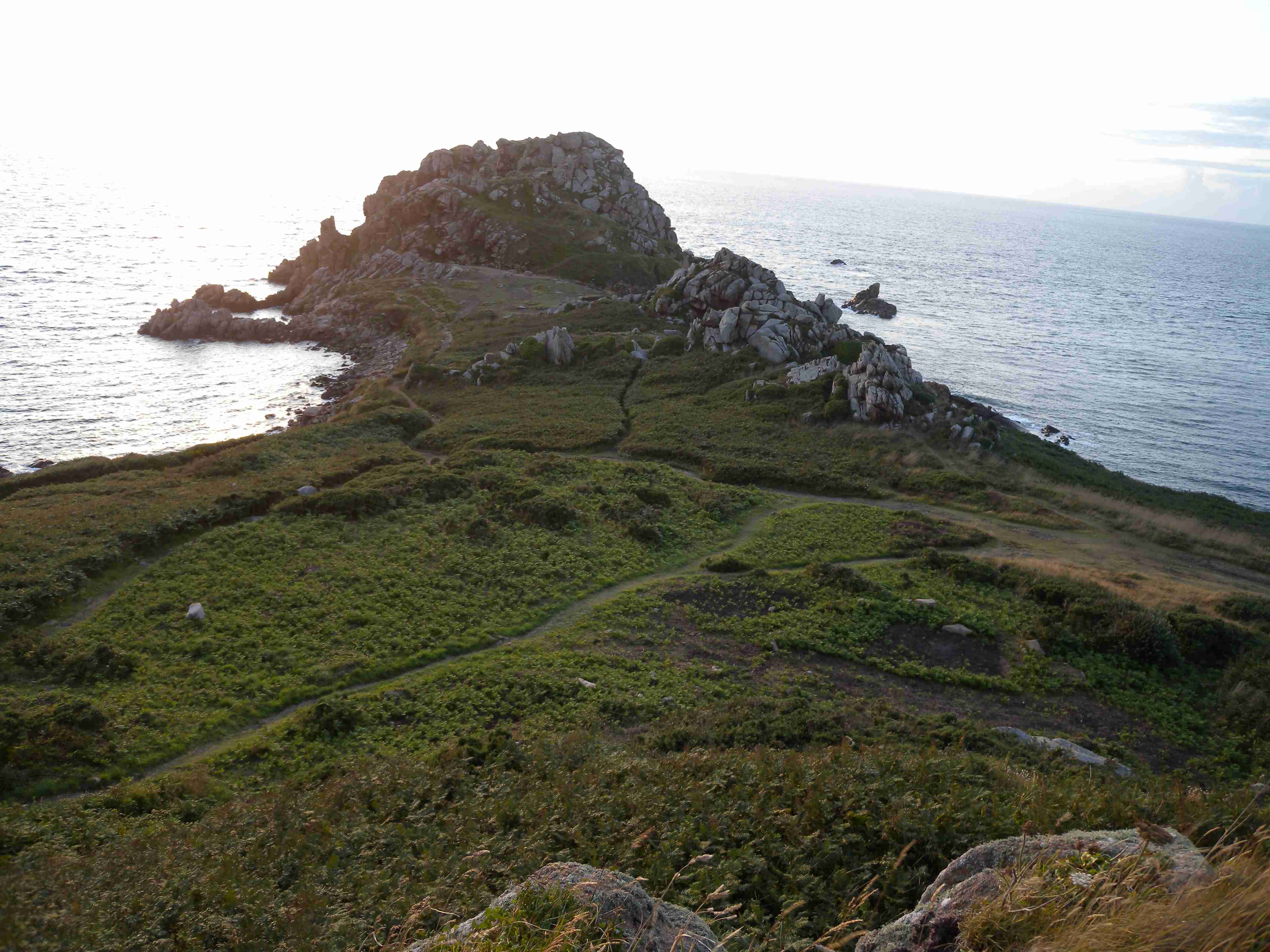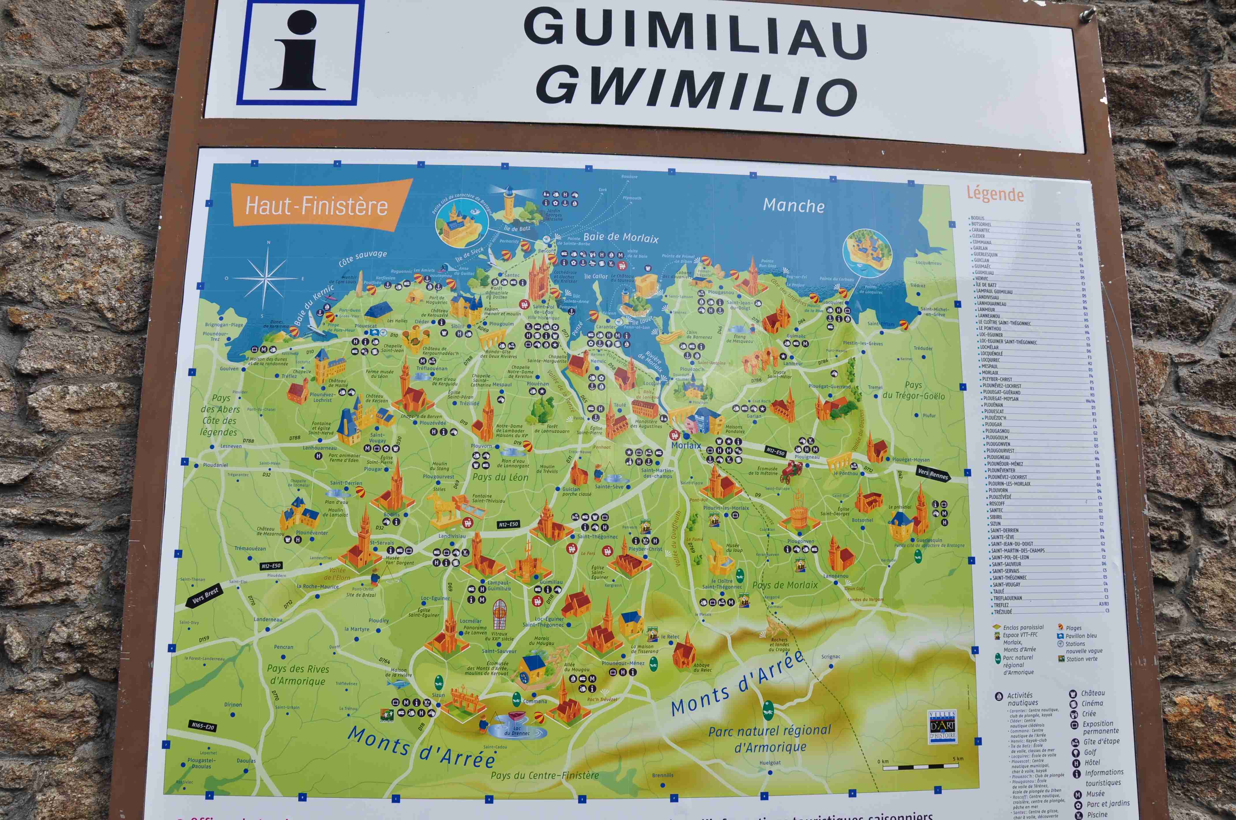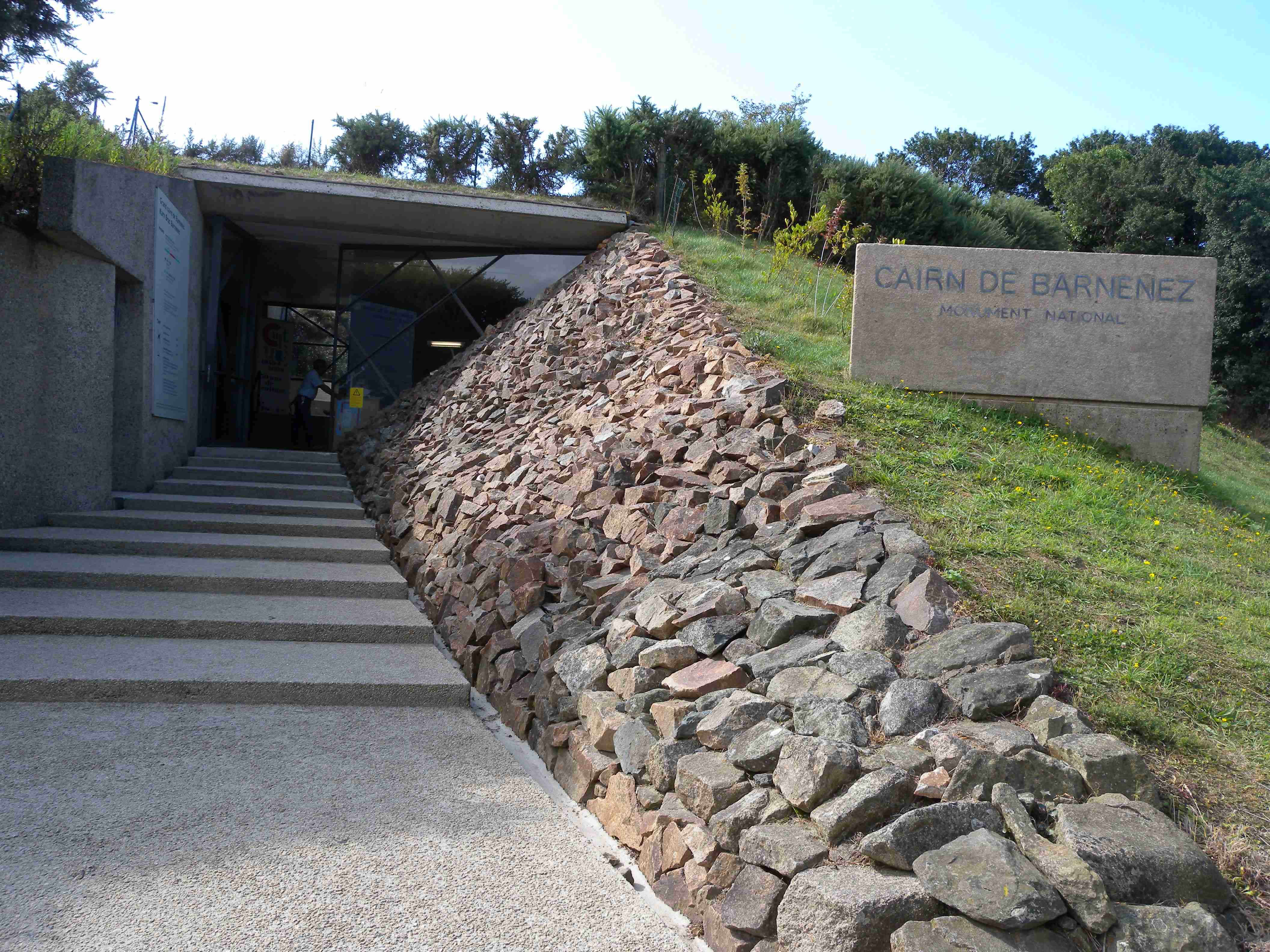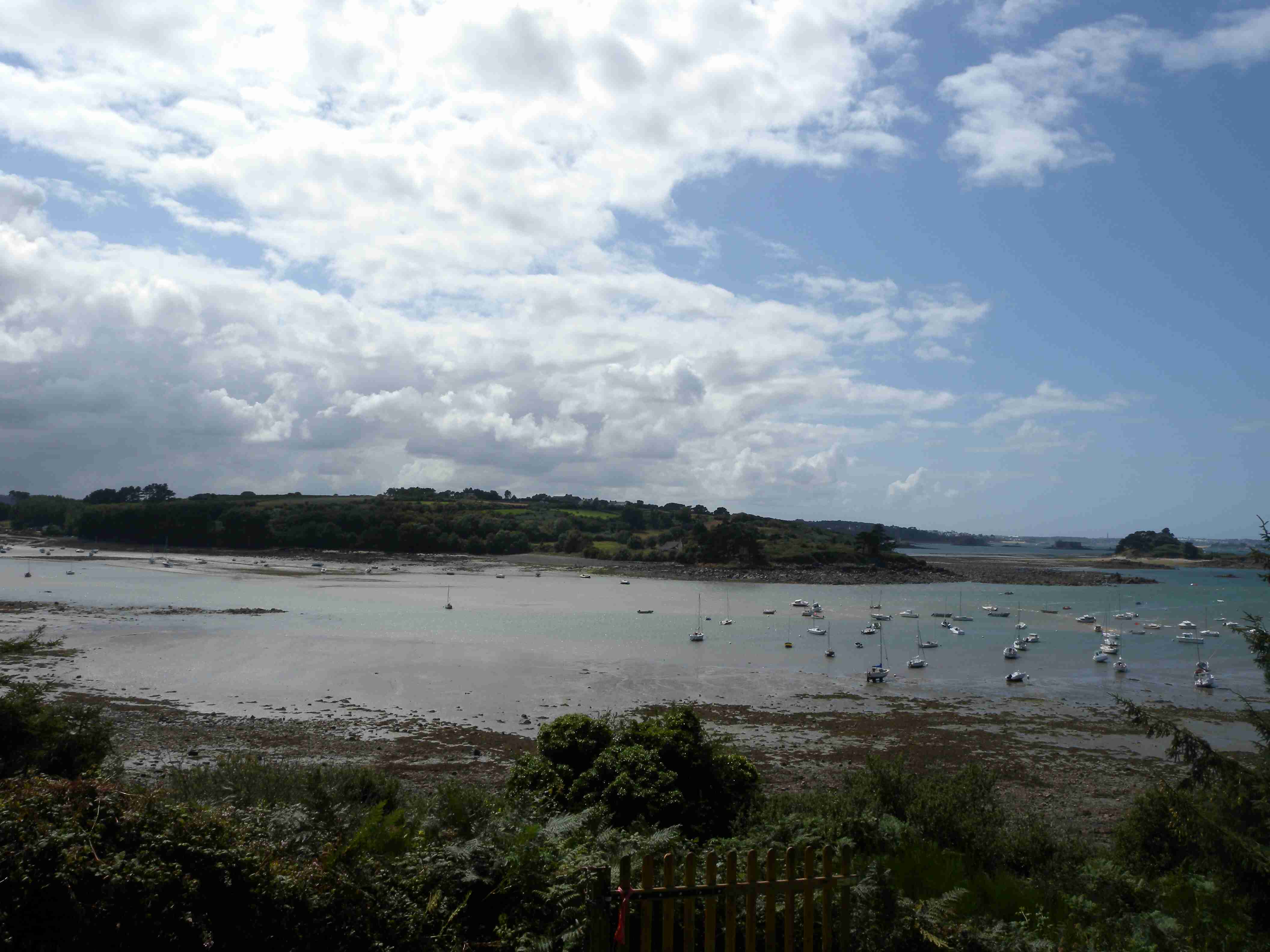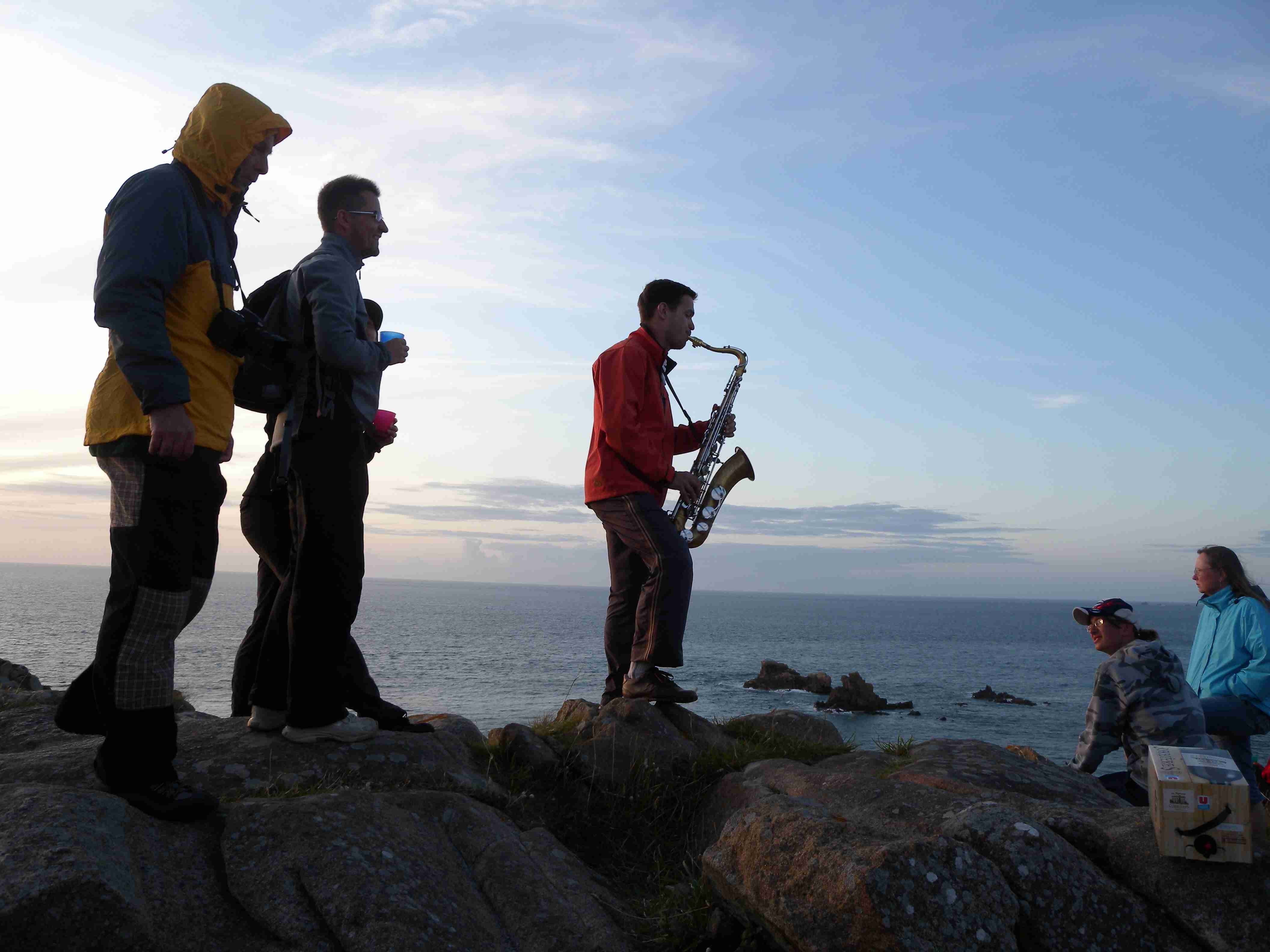 V noci vydatně pršelo, ráno už naštěstí ne, takže sice bylo všude mokro, ale to se dá přežít lépe, než déšť. Začátek snídaně se poněkud protáhl, francouzský socialismus se projevil opožděnou dodávkou baget, půl hodiny sem - půl hodiny tam, žádný problém. Nakonec jsme tedy vyrazili busem směr farní dvorce - konkrétně městečko Guimiliau, kde jsme prohlídkou strávili asi hodinu a pokračovali jsme do kempu u Primel-Tregastel. Kemp byl poměrně blízko u moře, my jsme se ubytovali a v cca 14.30 jsme vyrazili na kolo. Byli jsme s Ivou už poslední, tak jsme vyrazili sami, pomalounku, polehounku. Cesta byla již poněkud kopcovitější, než dole na jihu, brali jsme to po pobřeží a dojeli jsme do obce Cairn de Barnenez, kde jsme hned na začátku narazili na Marcelu se Zdeňkem v restauraci, takže jsme přisedli a poobědvali salát z darů moře - byl vynikající. Po obědě jsme se vypravili na druhý konec obce navštívit kamennou mohylu Cairn de Barnenez, kde měli letáček o mohyle dokonce i v češtině. Jedná se o největší náhrobní stavbu v Evropě o délce 75 metrů a šířce 28 metrů vybudovanou v letech 4500 až 3900 před naším letopočtem, která ukrývá 12 pohřebních komor. Celý areál jsme si prošli, nafotili a pomalu se vydali na zpáteční cestu. Byl to nějaký kritický den, trasu jsme si hodně přizpůsobili, odbočili jsme od kopcovitého pobřeží a vnitrozemím dojeli do městečka Plougasnou, kde jsme si dali pivo a kafe a sjeli jsme dolů k pobřeží do našeho kempu. Před večeří (kus-kus s kuřecím masem a omáčkou) jsem ještě stihl sprchu a po večeři jsme se odebrali na skálu nad kempem, kde jsme se kochali výhledem, fotili západ slunce, popíjeli donesené nápoje a poslouchali saxofon. Ještě za zbytků světla jsme ŕaději sestoupili dolů a podél moře šli nafotit menhir na pobřeží.. Měl jsme půjčenou redukci na elektřinu a tak jsem si přes noc v kempu nabil všechny potřebné přístroje.