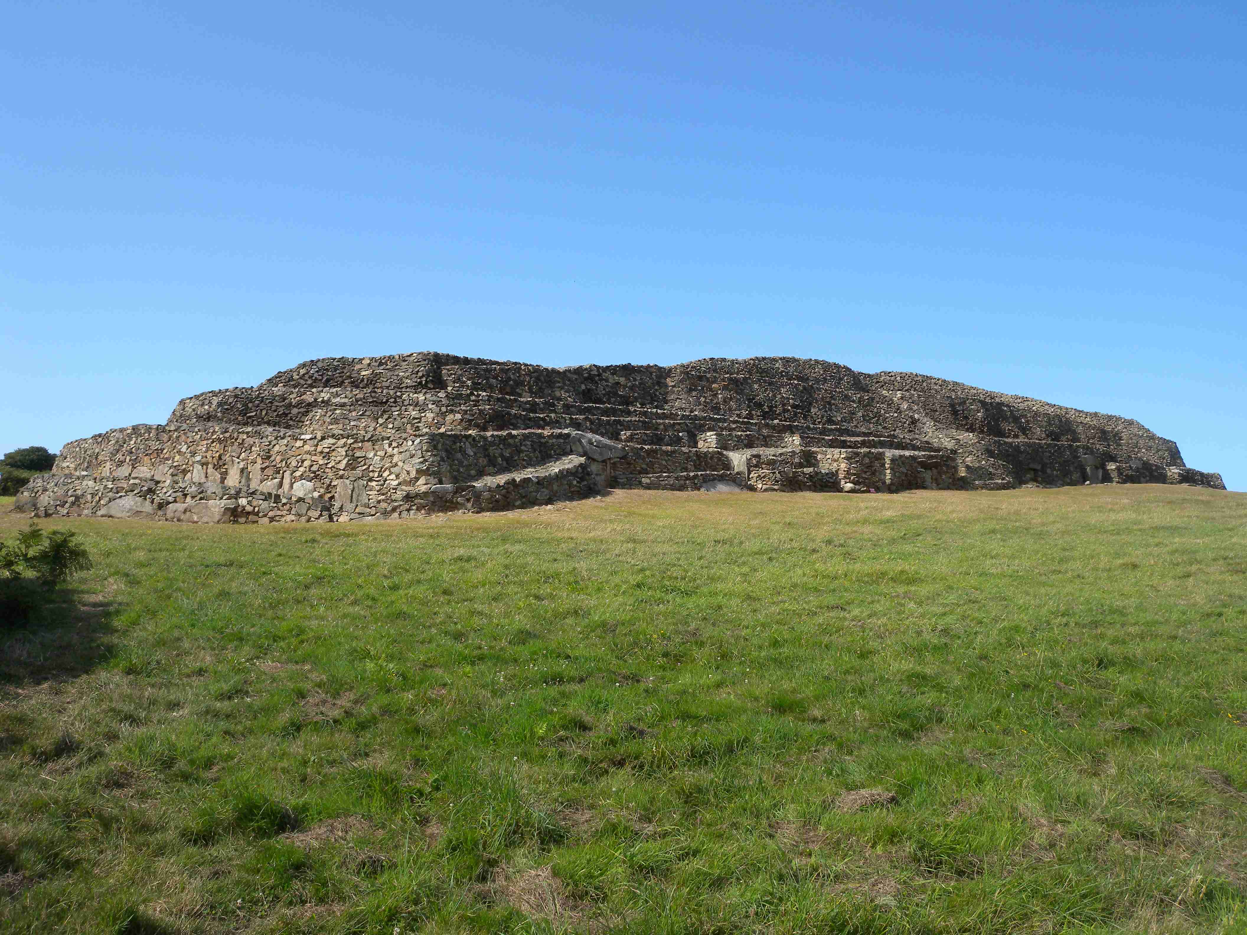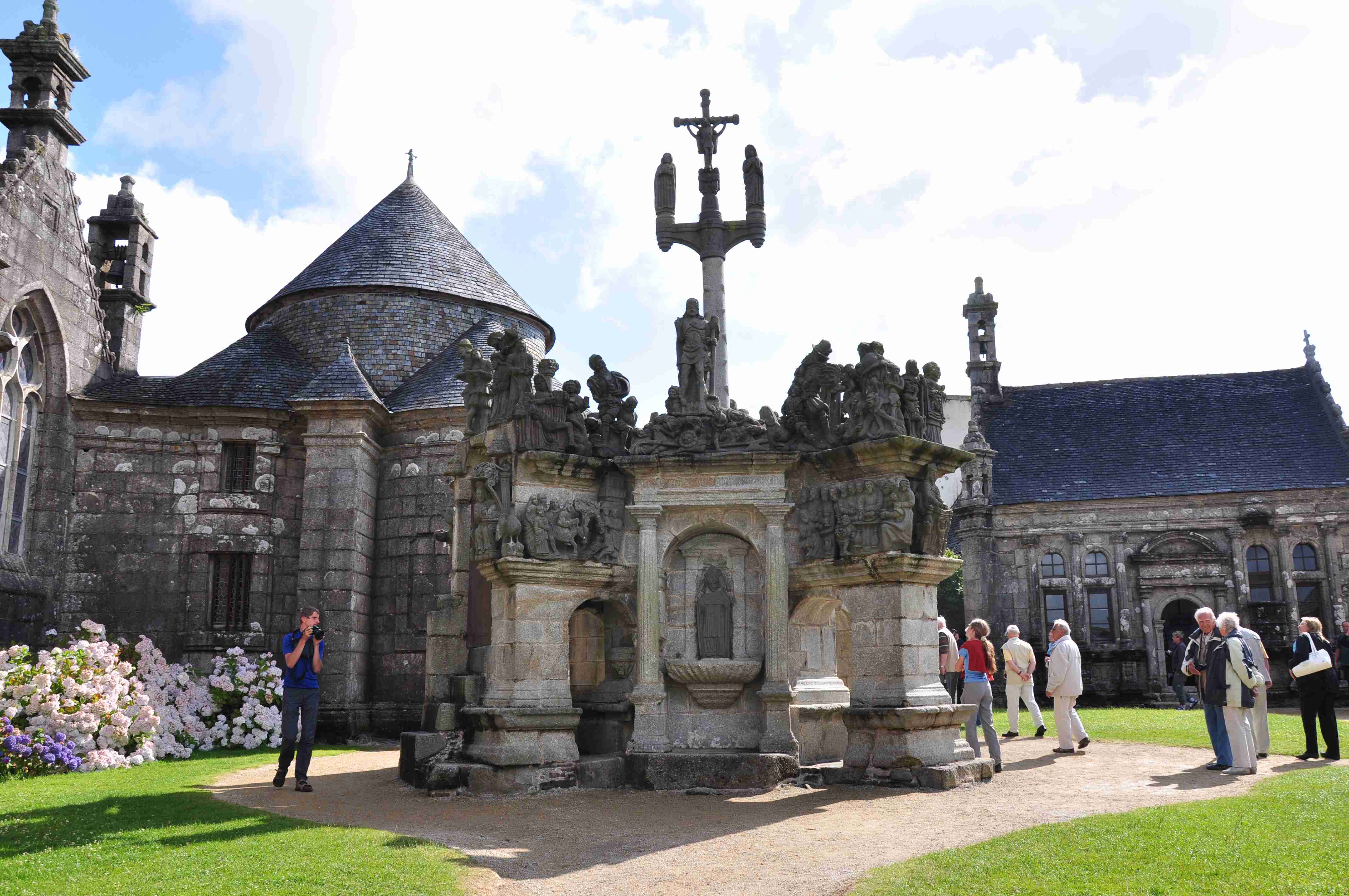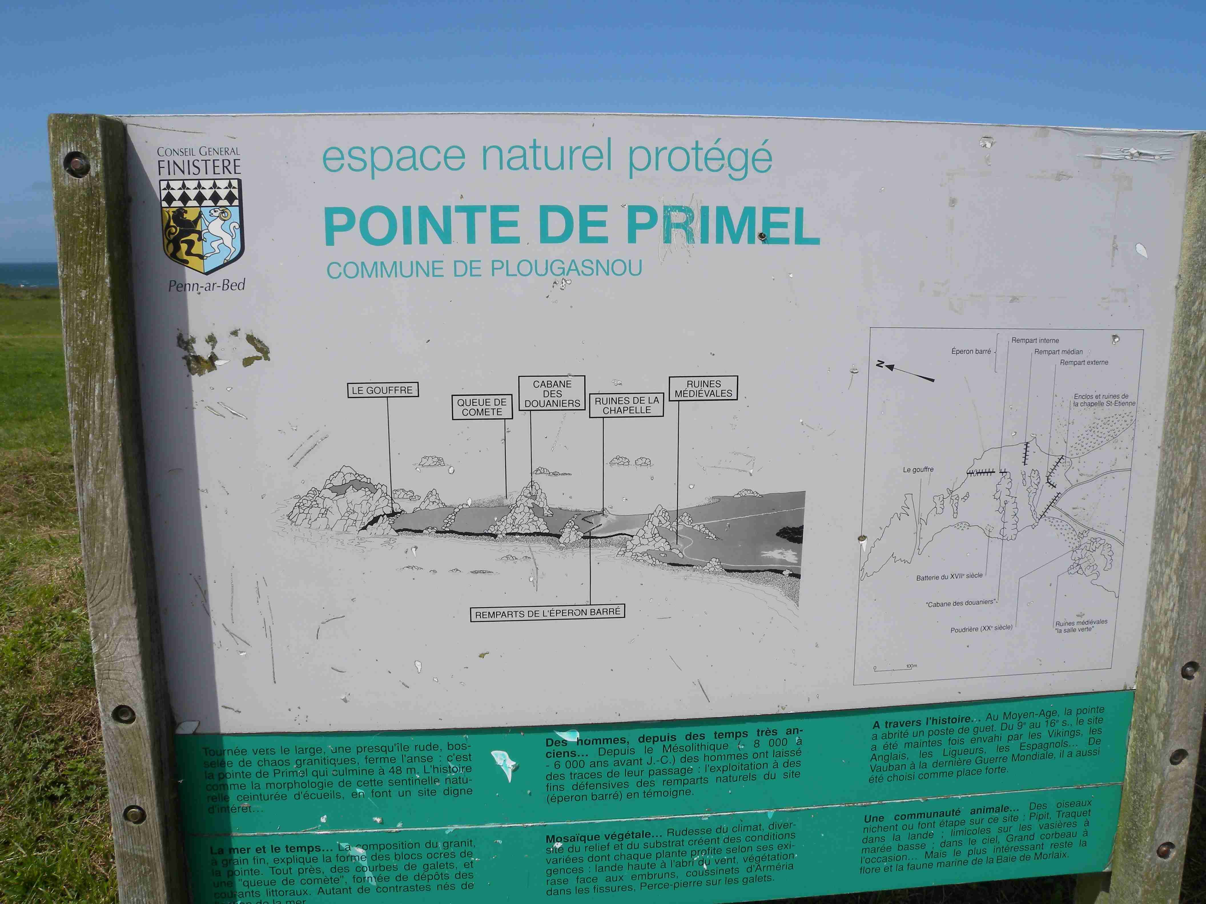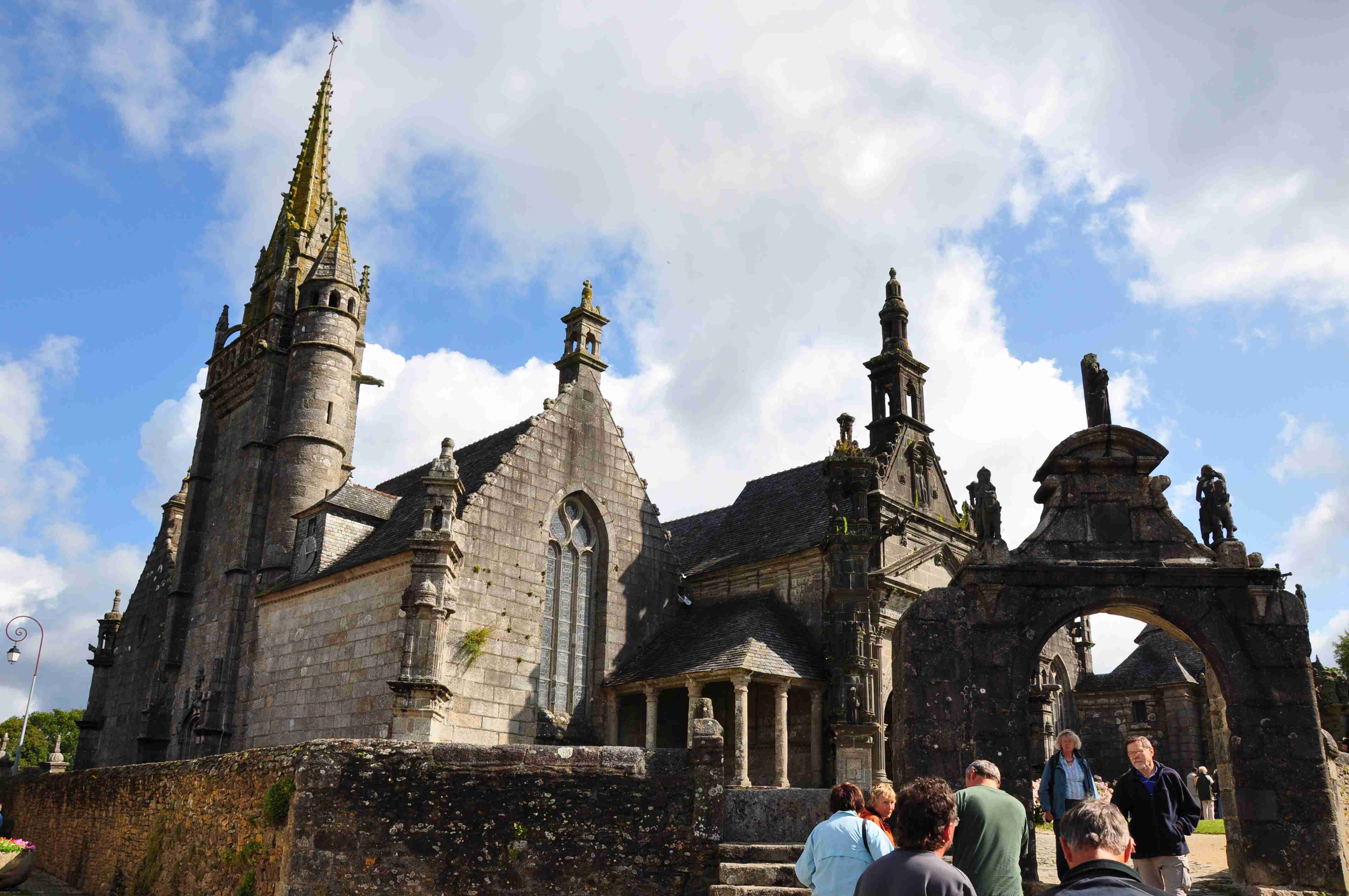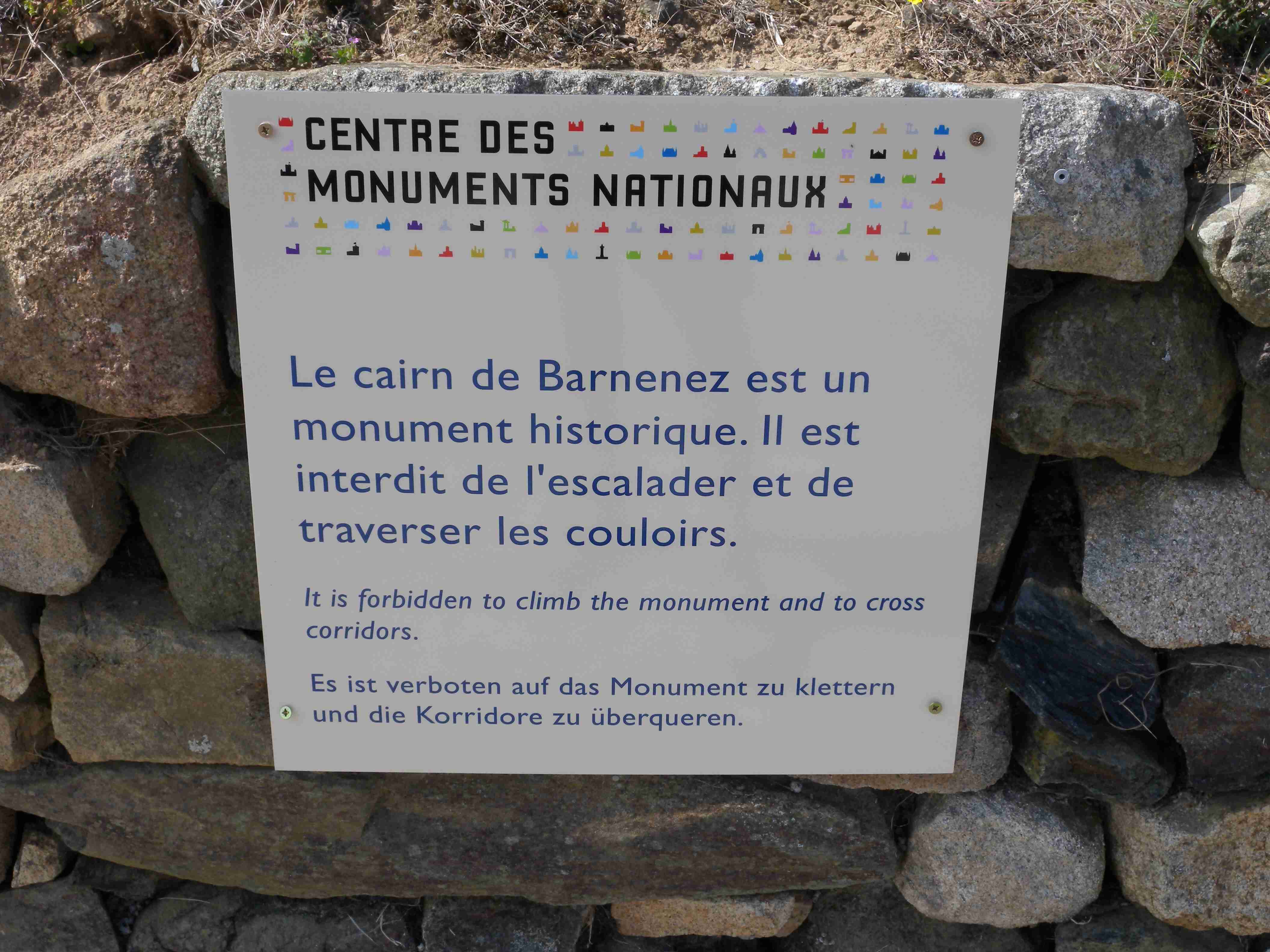 V noci vydatně pršelo, ráno už naštěstí ne, takže sice bylo všude mokro, ale to se dá přežít lépe, než déšť. Začátek snídaně se poněkud protáhl, francouzský socialismus se projevil opožděnou dodávkou baget, půl hodiny sem - půl hodiny tam, žádný problém. Nakonec jsme tedy vyrazili busem směr farní dvorce - konkrétně městečko Guimiliau, kde jsme prohlídkou strávili asi hodinu a pokračovali jsme do kempu u Primel-Tregastel. Kemp byl poměrně blízko u moře, my jsme se ubytovali a v cca 14.30 jsme vyrazili na kolo. Byli jsme s Ivou už poslední, tak jsme vyrazili sami, pomalounku, polehounku. Cesta byla již poněkud kopcovitější, než dole na jihu, brali jsme to po pobřeží a dojeli jsme do obce Cairn de Barnenez, kde jsme hned na začátku narazili na Marcelu se Zdeňkem v restauraci, takže jsme přisedli a poobědvali salát z darů moře - byl vynikající. Po obědě jsme se vypravili na druhý konec obce navštívit kamennou mohylu Cairn de Barnenez, kde měli letáček o mohyle dokonce i v češtině. Jedná se o největší náhrobní stavbu v Evropě o délce 75 metrů a šířce 28 metrů vybudovanou v letech 4500 až 3900 před naším letopočtem, která ukrývá 12 pohřebních komor. Celý areál jsme si prošli, nafotili a pomalu se vydali na zpáteční cestu. Byl to nějaký kritický den, trasu jsme si hodně přizpůsobili, odbočili jsme od kopcovitého pobřeží a vnitrozemím dojeli do městečka Plougasnou, kde jsme si dali pivo a kafe a sjeli jsme dolů k pobřeží do našeho kempu. Před večeří (kus-kus s kuřecím masem a omáčkou) jsem ještě stihl sprchu a po večeři jsme se odebrali na skálu nad kempem, kde jsme se kochali výhledem, fotili západ slunce, popíjeli donesené nápoje a poslouchali saxofon. Ještě za zbytků světla jsme ŕaději sestoupili dolů a podél moře šli nafotit menhir na pobřeží.. Měl jsme půjčenou redukci na elektřinu a tak jsem si přes noc v kempu nabil všechny potřebné přístroje.