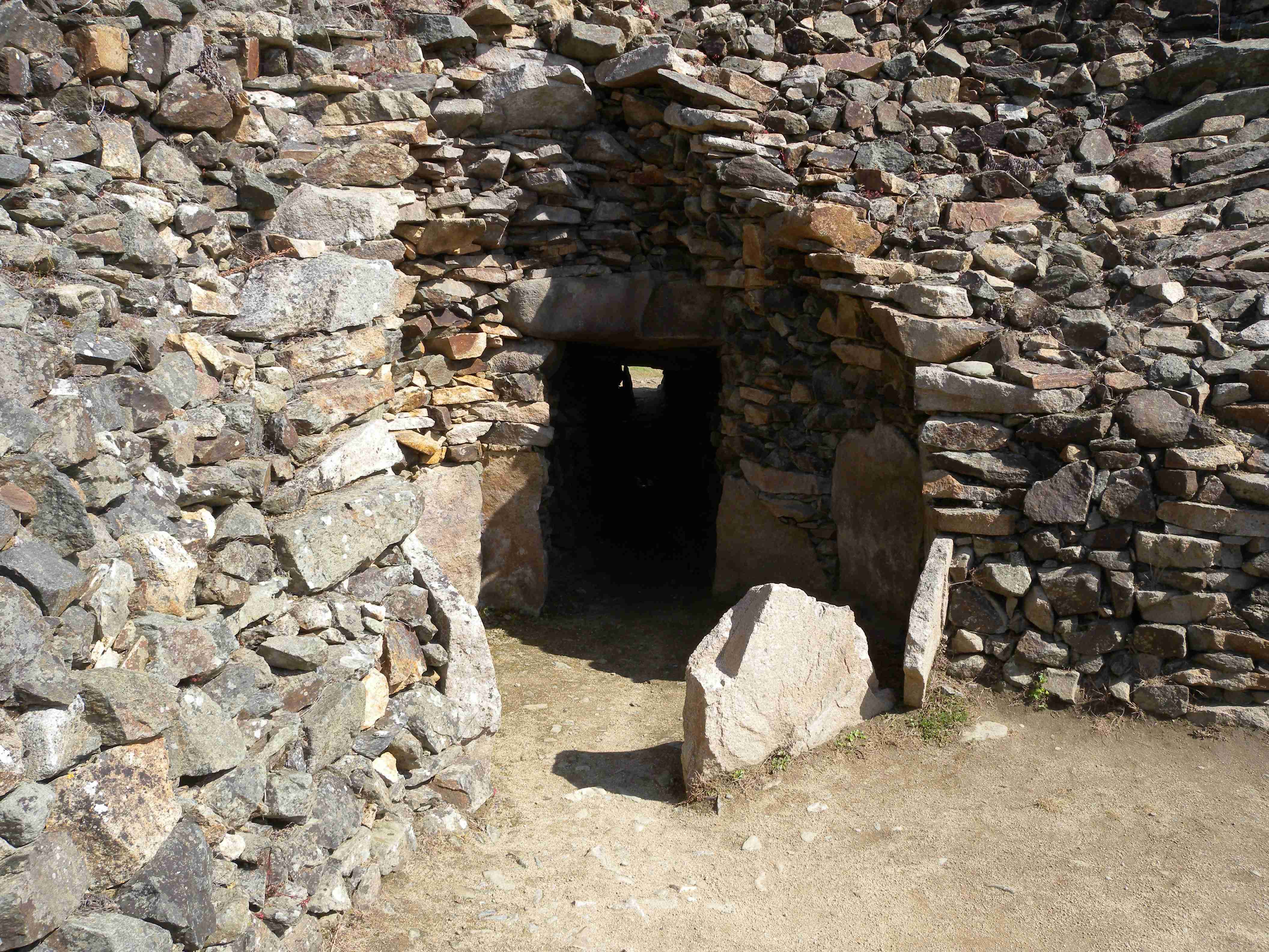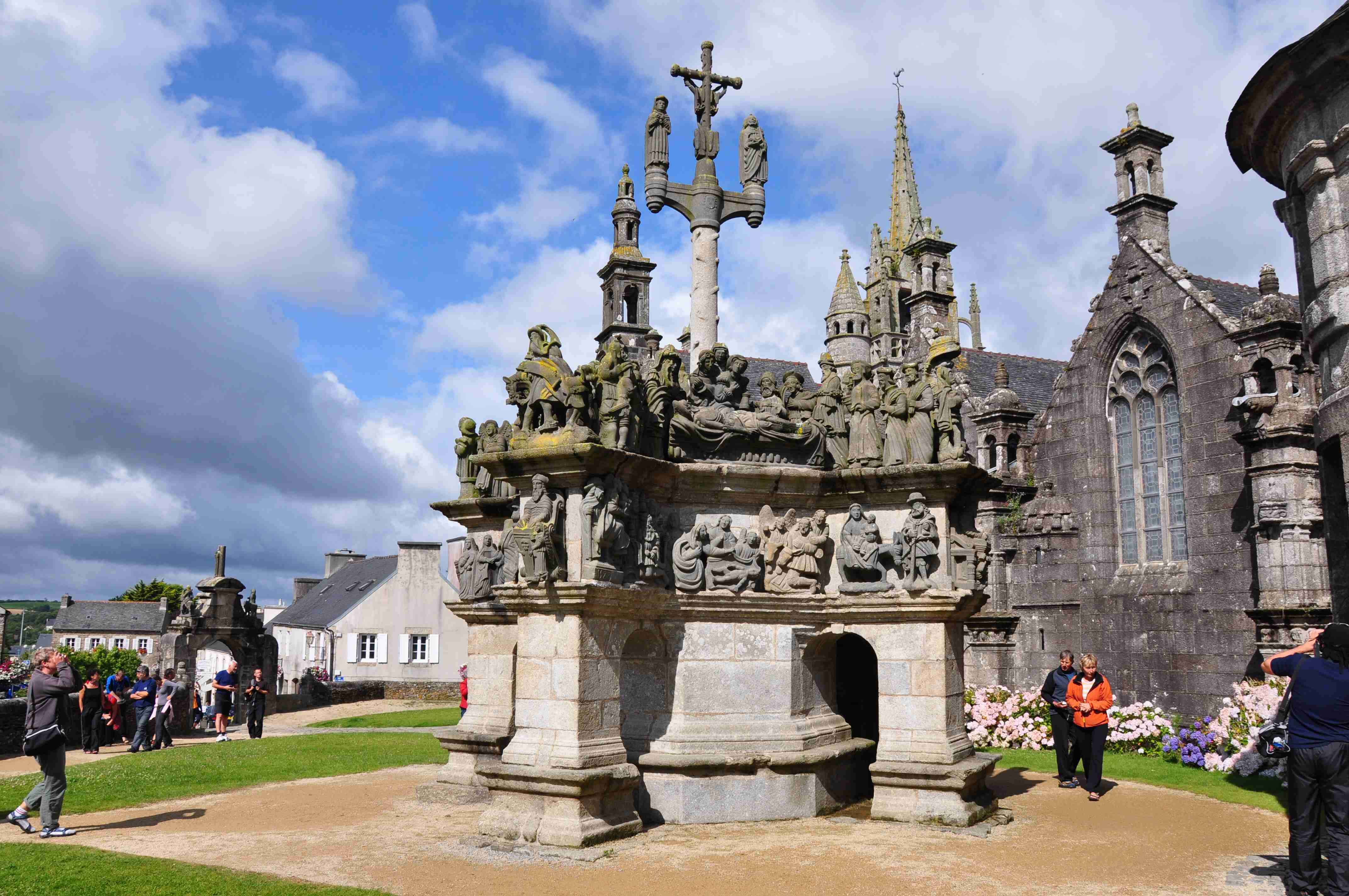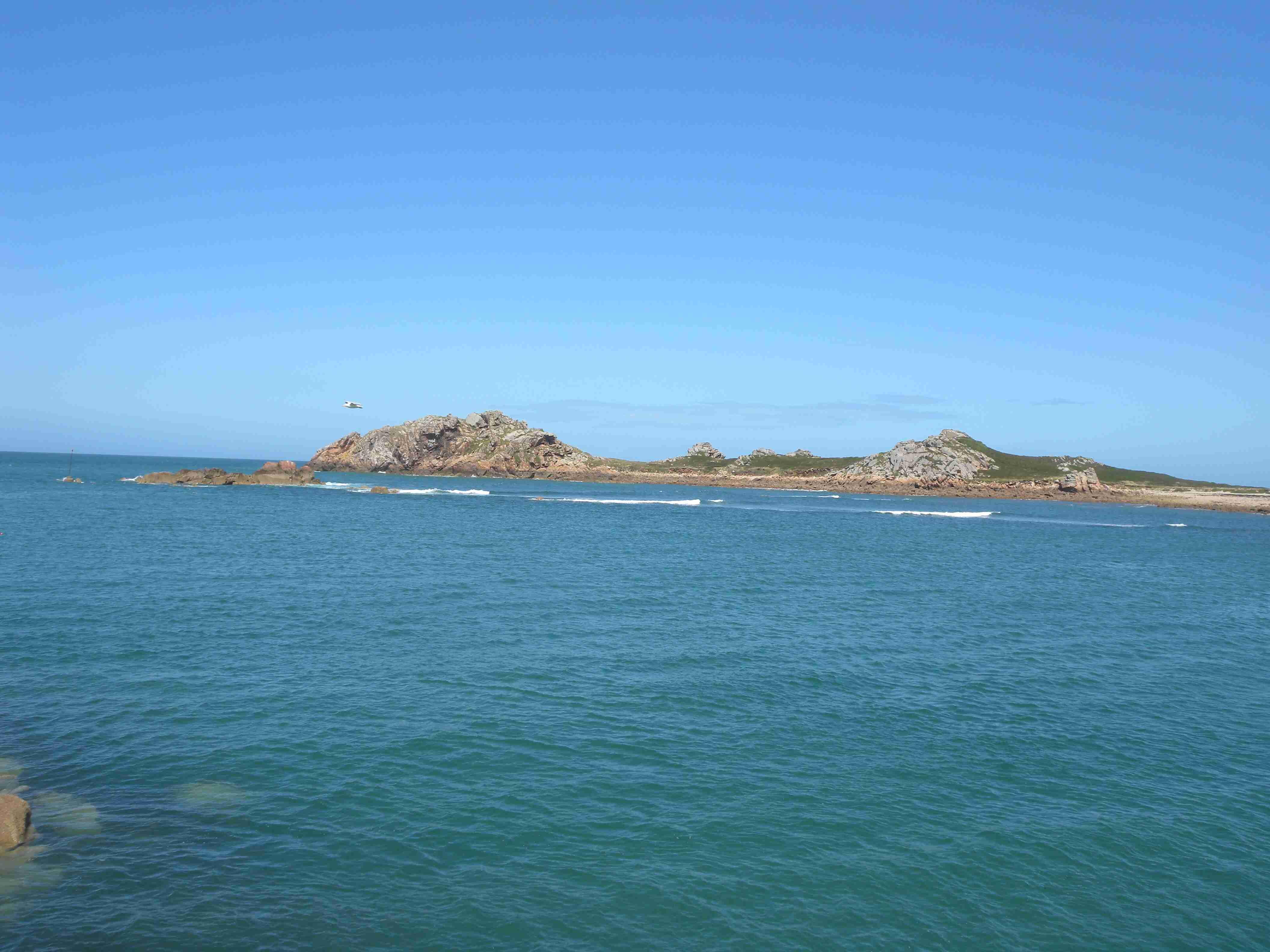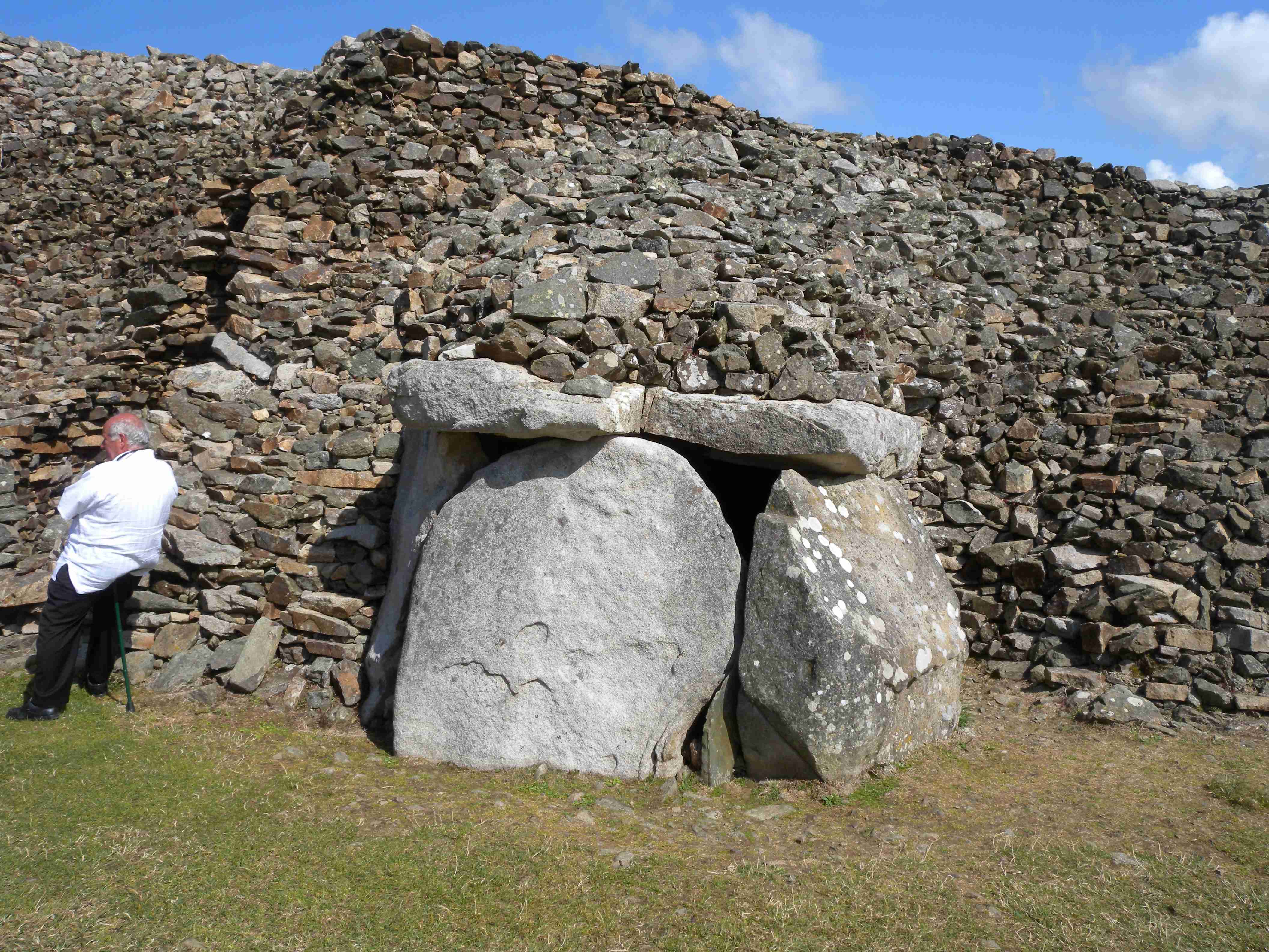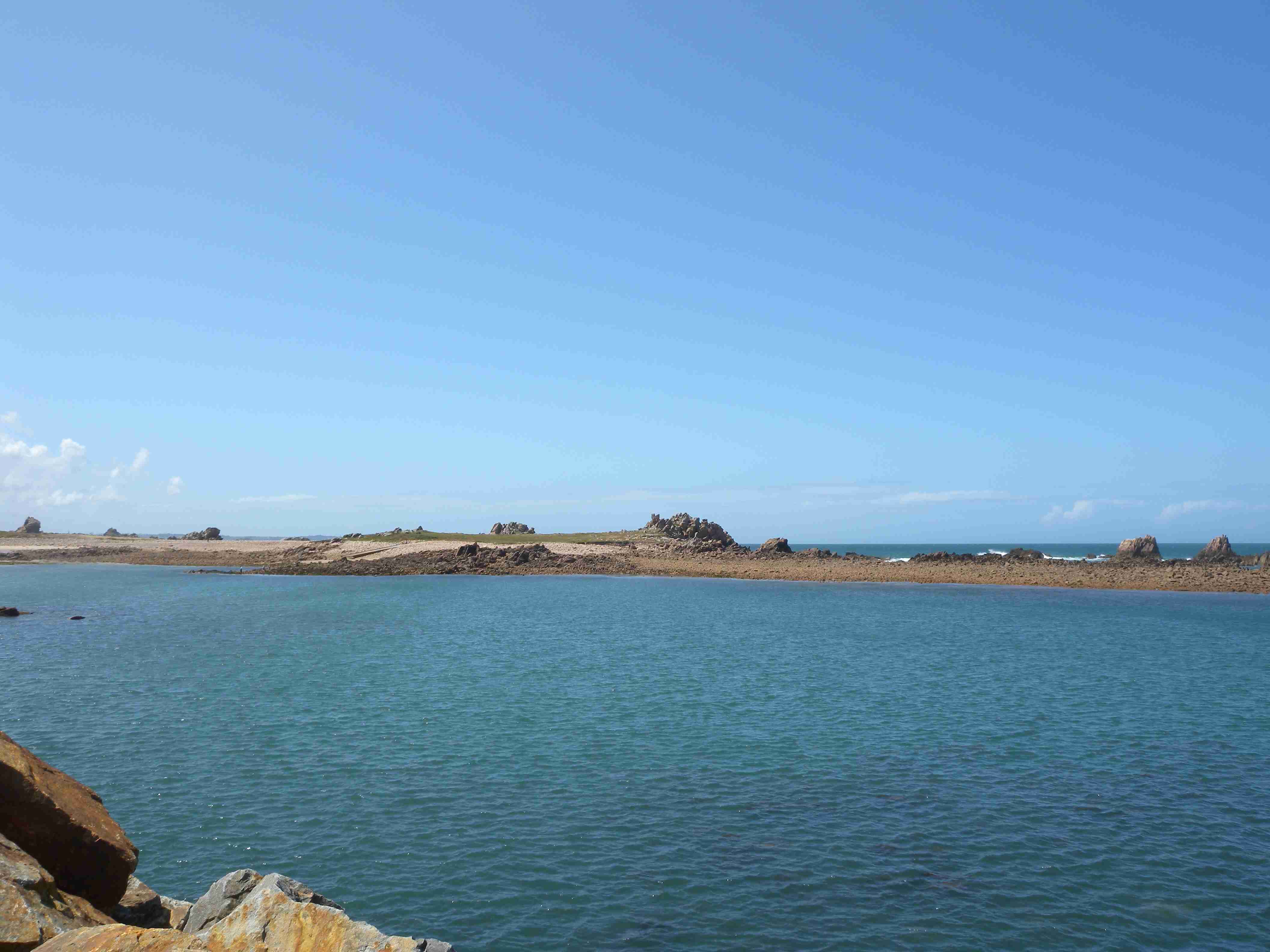 V noci vydatně pršelo, ráno už naštěstí ne, takže sice bylo všude mokro, ale to se dá přežít lépe, než déšť. Začátek snídaně se poněkud protáhl, francouzský socialismus se projevil opožděnou dodávkou baget, půl hodiny sem - půl hodiny tam, žádný problém. Nakonec jsme tedy vyrazili busem směr farní dvorce - konkrétně městečko Guimiliau, kde jsme prohlídkou strávili asi hodinu a pokračovali jsme do kempu u Primel-Tregastel. Kemp byl poměrně blízko u moře, my jsme se ubytovali a v cca 14.30 jsme vyrazili na kolo. Byli jsme s Ivou už poslední, tak jsme vyrazili sami, pomalounku, polehounku. Cesta byla již poněkud kopcovitější, než dole na jihu, brali jsme to po pobřeží a dojeli jsme do obce Cairn de Barnenez, kde jsme hned na začátku narazili na Marcelu se Zdeňkem v restauraci, takže jsme přisedli a poobědvali salát z darů moře - byl vynikající. Po obědě jsme se vypravili na druhý konec obce navštívit kamennou mohylu Cairn de Barnenez, kde měli letáček o mohyle dokonce i v češtině. Jedná se o největší náhrobní stavbu v Evropě o délce 75 metrů a šířce 28 metrů vybudovanou v letech 4500 až 3900 před naším letopočtem, která ukrývá 12 pohřebních komor. Celý areál jsme si prošli, nafotili a pomalu se vydali na zpáteční cestu. Byl to nějaký kritický den, trasu jsme si hodně přizpůsobili, odbočili jsme od kopcovitého pobřeží a vnitrozemím dojeli do městečka Plougasnou, kde jsme si dali pivo a kafe a sjeli jsme dolů k pobřeží do našeho kempu. Před večeří (kus-kus s kuřecím masem a omáčkou) jsem ještě stihl sprchu a po večeři jsme se odebrali na skálu nad kempem, kde jsme se kochali výhledem, fotili západ slunce, popíjeli donesené nápoje a poslouchali saxofon. Ještě za zbytků světla jsme ŕaději sestoupili dolů a podél moře šli nafotit menhir na pobřeží.. Měl jsme půjčenou redukci na elektřinu a tak jsem si přes noc v kempu nabil všechny potřebné přístroje.