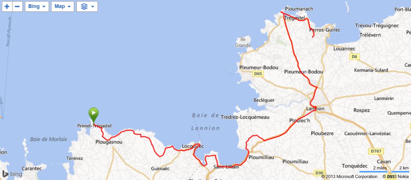 Dnes na nás čekala královká etapa - nejdelší, přesun z kempu do kempu po vlastní ose. Snídaně byla až v 9.00 kvůli nechopnosti francouzů dodat bagety dříve a tak jsme posnídali bagetu s pomazánkou v kelímku a vydali se na cestu. Hned na začátku bylo stoupání na Plougasnou a bylo vidět, že tu před chvílí pršelo. Naštěstí jsme s Ivou jeli tak pomalu, že déšť už byl někde jinde. Chvilku jsme se zdrželi v Plougasnou, kde byly trhy - spousta masa a mastných výrobků a pak jsme pokračovali střídavě podél pobřeží a vnitrozemím pořád nahoru a dolu, ale dalo se to ujet, nebyly ty kopce tak prudké, jako vloni v Anglii. Navštívili jsme cestou rybářské městečko Locquirec, jeli jsme podél pláže mezi St. Efflam a St Michel an Greve, kde jsme si odpočinuli u piva a kávy. Naštěstí jsme nic neobědvali, protože hned za městečkem byl kopec jako prase a to by případný oběd byl jistě mezi námi. Pokračovali jsme vnitrozemím, najeli jsme na hlavnější silnici po které jsme dojeli do docela velkého města Lannion, kde jsme hned na příjezdu narazili na Marcelu se Zdeňkem. Společně jsme potom poněkud pracně nalezli restauraci na pivo, a po nepříjemně frekventované silnici jsme vystoupali nad město a naštěstí opustili onu silnici a po poněkud klidnější jsme zamířili kolem letiště na Tregastel, kam jsme v pozdní odpoledne dojeli a na nábřeží si vychutnali pivánko a palačinky. Pak nás čekal již poslední úsek do kempu Claire Fontain v Perros Guirec, kde jsme strávili dvě noci. K večeři byla nejprve rybí polévka a potom kaše a kostky vepřového masa s dušenou zeleninou v omáčce. Po večeři jeden z účastníků dal do placu 12 lahví vína na oslavu zprávy, že bude dědečkem a tak jsme postávali kolem autobusu, popíjeli a vyprávěli vtipy do pozdního večera. Byla i kytara, někteří prý vydrželi hodně dlouho.