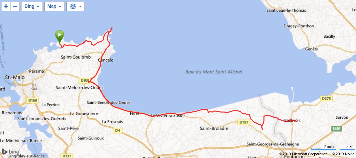 Nastal náš poslední cyklistický den, ráno jsme si sbalili věci a dali do busu a po snídaní jsme na kolech vyrazili do našeho posledního kempu. Na cestu jsme měli celý den a na štěstí byla věštinou po rovině, protože mně začalo píchat v koleni, přeci jenom únava se začínala projevovat. Z kempu jsme lemovali pobřeží směrem na Cancale, města proslulého chovem ustřic. Cestou nám Marcela se Zdeňkem poodjeli a pravděpodobně zahnuli do Cancale, které jsme my nepochopiteně minuli, ale vracet se nám již nechtělo. Tak jsme pokračovali podél pobřeží městečky, kde kvetl prodej mořských potvor. Až těsně před solisky jsme zastavili v městečku Cherrueix, kde jsme poobědvali - já si naposledy vychutnal mušle. Po obědě jsme pokračovali kousek po silnici ke kapličce Sv. Anny, kde jsme najeli na cyklostezku. Pouze jsem si na GPS kontroloval směr a ve chvíli, kdy se cyklostezka začala odklánět od naší trasy, kousek jsme se vrátili a po místních komunikacích jsme dojeli do našeho posledního kempu, který ležel hned vedle silnice vedoucí k Mont St. Michel. Camping Aux Pommiers byl vybaven i bazénem a někteří ho i využili. Po večeři nás ještě čekala noční návštěva opatství le Mont St. Michel, tam jsme dojeli autobusem, ale v noci jsme pak za svitu čelovek šlapali zpět cca 5 km po svých. Prohlídka byla pro mne utrpením, koleno jsem nemohl pořádně ohýbat a tak jsem pajdal po té spoustě schodů jako válečný veterán. Večer byl problém sehnat něco k pití, většina podniků již zavírala, ale nakonec se podařilo. Naše čtveřice nečekala na hodinu srazu po půlnoci, ale kolem jedenácté jsme sami vyrazili do kempu a po půlnoci jsme uléhali. Na spaní to moc nebylo, protože v sousedství výhrávala na ulici rocková kapela a to opravdu na plné pecky, ale nakonec jsem na chvíli přeci jenom usnul.