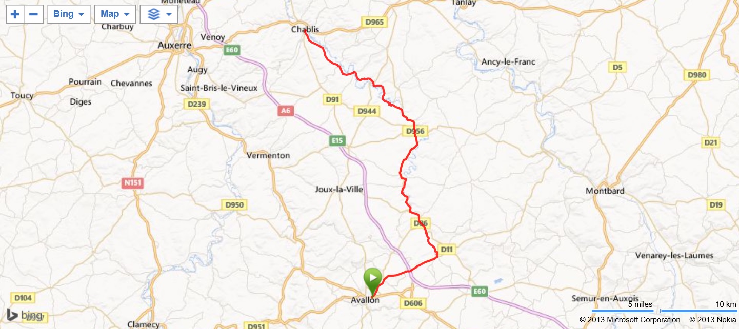 Snídaně byla v hotelu, hotelová klasika švédských stolů, bylo toho dost a bylo to dobré. Po čtvrt na deset jsme vyrazili, tentokrát od hotelu na druhou stranu směrem na severovýchod ven z města po silnici D957 a za necelou hodinku jsme dorazili do středověkého městečka Montréal, které leží klasicky na kopci. Na chvíli jsme zastavili u kostela, udělali pár fotek a sešli jsme prudkou kamenitou cestou dolů z kopce, kde jsme najeli na silničku v polích, po které jsme zamířili do údolí řeky Serein, kterým jsme se pohybovali až do konce dnešní etapy. Počasí bylo lehce slunečné, málo frekventované silničky se líně vlnily krajinou a cesta ubíhala v poklidu. Kolem půl jedné jsme dorazili do městečka Noyers, které se pyšní krásnými starými hrázděnými domy. Udělali jsme pár fotek, dali si společně se spoustou našich kolegů pivo v bistru v uličce u náměstí a po krátkém relaxu jsme pokračovali v cestě. Po druhé hodině odpolední jsme na výjezdu z obce Poilly-sur-Serein po přejetí mostu sjeli dolů na břeh řeky a u stolu s lavicemi jsme dojedli české zásoby. Chvilku jsme poseděli, resp. poleželi na lavici a pak již na poslední úsek dnešní etapy. Do cíle, městečka Chablis, jsme dorazili asi za hodinku, kolem čtvrt na čtyři, pomalu jsme projeli do centra, kde jsme měli sraz před informačním střediskem. Jelikož byl ještě čas, tak jsme si, jako spousta ostatních účastníků, dali pivečko v kavárně na rohu. V 16:00 jsme se pak vydali do sklípku na ochutnávku vín, protože Chablis je vyhlášené centrum bílého vína, město je obklopeno vinicemi všech úrovní kvality. Dostalo se nám popisu jednotlivých kvalitativních stupňů, malinko nám dali ochutnat, dvě lahvinky jsme si koupili a pak již najít autobus, naložit kola a tradá zpět do Avallonu. Na hotel jsme dorazili po půl šesté, rychle hygiena, briefing a opět na večeři k Bílému Koňovi. Předkrm si nepamatuji, jako hlavní byla ryba, desert nevím, ale všechno výborné. Domů jsme šli zhruba ve stejném čase jako předešlý den, na pokoji jsme ještě trochu pobalili věci, protože druhý den nás čekal den bez kol, jelikož jsme se přesouvali jednak do Dijonu a potom do Beaune.