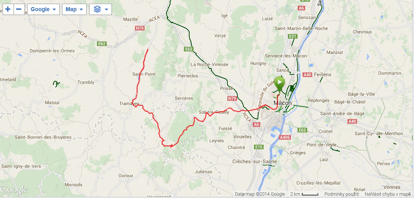 Snídaně byla poměrně skromná – bageta, šunka, sýr, juice a kafe. Pro milovníky sladkého toho tam bylo také dost a to včetně ovoce. Odjezd na kolech od hotelu v 9:00 byl společný, to aby nás vedoucí Zuzana vyvedla ven z města. Ještě než jsme dojeli do místa, kde začínala cyklostezka do Chalonu a kde končila společná jízda, dojeli mne Karel s Radkou a oznámili mně, že Iva stojí dva kruháky zpět s píchlým kolem a tak jsem to otočil a pelášil nazpět. Bohužel má Iva duše s galuskovým ventilkem a já měl náhradní duši s autoventilkem a stejně tak i pumpičku. Takže se pěšky vracela na hotel a já se vrátil zpět na trasu dne. Na začátek výše zmiňované cyklostezky jsem dorazil ve chvíli, kdy se spustil déšť a tak jsem se schoval pod stříškou bývalého nádraží. Přečkal jsem ten nejprudší nápor a vyrazil na trať – pořád do kopce až pod horu Solutre, kde mne zastihl druhý déšť. Vyndal jsem bundu z batohu a déšť přečkal pod stromy vedle parkoviště u samotné hory Solutre, na kterou jsem však nešplhal. Za drobného mrholení jsem pokračoval v cestě, co se týká stoupání, nebyl jsem ještě ani v polovině. Po celkově 12 km stoupání, kdy jsem nastoupal asi 500 m, jsem dosáhl nejvyššího bodu trasy (jednou jsem musel zastavit pod stromy, protože se opět silně rozpršelo) a začal sjíždět asi 4 km směrem k Cenves, kde opět začalo stoupání asi 4 km na Col du Carcan. Z tohoto sedla pak již z kopce jsem sjel do Tramayes, kde jsem zatočil doprava a po pár kilometrech jsem dojel k malé přehradě, kde jsem se zastavil a udělal pár fotek. Na koupání to nebylo, i když počasí se již umoudřilo a občas se ukázalo i sluníčko, cíl byl již ve vedlejší dědině St. Point a tak jsem vyrazil na poslední úsek. Autobus však nebyl na místě, protože vezl zraněného kolegu do Maconu do nemocnice, a tak jsem stanoviště minul a ještě asi 2 km pokračoval dál, než jsem usoudil, že se asi stala chyba. Vrátil jsem se a našel jednoho řidiče autobusu u přívěsu na kola. Postupně dojížděli ostatní cyklisté, nebylo jich však mnoho, více jak polovina celou trasu neabsolvovala, naopak Radka s Karlem na autobus nečekali a jeli po ose až do Maconu dalších cca 30 km. Takže namísto mých 40 km, měli kolem 70 km. Autobus dojel i s Ivou před šestou hodinou, zapojili jsme vlek a vyrazili zpět na hotel, kam jsme dorazili asi ve tři čtvrtě na sedm. Po dojezdu jsem se pustil do opravy píchlého kola, duši jsme neměli, tak jsme museli lepit a za vydatné pomoci řidičů autobusu se nám to podařilo tak rychle, že jsme stihli včas i večeři v půl osmé. Kolega, který se zranil při pádu z kola při sjíždění do Cenves, se vrátil z nemocnice až před jedenáctou (francouzské socialistické zdravotnictví!), naštěstí neměl nic zlomené, pouze silně zhmožděné, každopádně cyklistika pro něho na tomto zájezdu skončila. Ale ještě, že tak, já to měl téměř z první ruky, protože jsem jel před ním (aniž bych to věděl) a když jsem slyšel ránu, tak jsem zastavil a kousek šel nahoru za zatáčku, kde se tento kolega právě sbíral ze země. Nic příjemného.