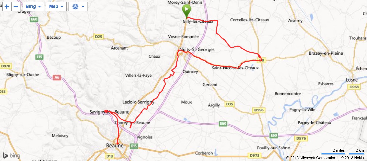 Na snídani jsme se trochu zdrželi, protože v hotelu byl i celý zájezd švédských důchodců a tak u snídaně bylo nabito. Iva měla stále zablokovaný krk a tak se rozhodla nejet na kole, pouze autobusem tam a zpět. Kolem půl desáté jsme nasedli do autobusu a odjeli směrem na sever do asi 30 km vzdálené obce Vougeot, kde jsme sundali kola a rozjeli jsme se do všech směrů. Já zajel do obce vyfotit si místní zámek uprostřed vinic a poté jsem se ten kousek vrátil zpět a pokračoval jsem na východ po klidných silničkách směrem na opatství Abbaye de Citeaux. Mírně pršelo a mně, jelikož jsem jel naboso pouze v sandálech, docela mrzly nohy. Zhruba po hodině jsem dorazil do opatství, zamknul jsem kolo pod střechou u parkoviště a vyrazil na prohlídku alespoň veřejně přístupné části dodnes fungujícího cisterciánského kláštera. Kousek pěšky a pak krátká prohlídka prostor, kde na panelech byl zobrazen postupně denní rozvrh činností mnichů. Cestou zpět na parkoviště jsem telefonoval s Martinem a náhle jsem zjistil, že nemám klíče od zamčeného kola. Vrátil jsem se tedy zpět do budovy s výstavou, cestou jsem kontroloval zem pod sebou, požádal jsem ostatní kolegy ze zájezdu o pomoc a zpět ke kolu jsem se vracel zase jinou cestou, tou kterou jsem šel původně. Nic, a rovněž nikdo z kolegů nic nenašel. Jiřina mi zapůjčila kousek plátku pilky na železo a za pomoci jednoho z řidičů našeho autobusu jsme se jali přeřezávat řetěz, respektive lanko zámku na kolo. Moc to nešlo a tak se někdo vydal do opatství půjčit si štípací kleště a v klášterní prodejně sýrů mu podali můj klíček od kola, který někdo našel. Takže jsem byl nakonec zachráněn, později jsem zjistil, že inkriminovaná kapsa nebyla z výroby dokončena – chyběla část švu a tou dírkou my klíček vypadl. Konec dobrý, všechno dobré a navíc přestalo pršet. Vyrazil jsem pomalu na další cestu a to směrem na Nuits-St-Georges, což bylo dalších cca 10 km. Do městečka jsem dorazil kolem půl druhé a tak jsem na Náměstí Republiky usedl v Café du Centre a dal jsem si norský salát, kde mimo zeleniny bylo i několik pěkných plátků uzeného lososa a kolečka opečených brambor, k tomu samozřejmě červené víno, no lahoda. Před půl třetí jsem se vydal opět na trasu, zvolil jsem cestu nejmenšího odporu a coural jsem se v pásu mez dálnicí, železnicí a hlavní silnicí po klidných silničkách mezi vinicemi a poli, kochačka, na pohodu. Vzhledem k tomu, že jsem měl dost času, rozhodl jsem se navštívit muzeum v městečku Savingy, které leželo kousek mimo moji trasu, U obce Chorey jsem si trochu zajel a tak jsem musel kousek zpět, překřižovat hlavní silnici a lehce do kopečka do Savigny-les-Beaune, kde se v zámeckém areálu, ale i v zámku samotném, nacházelo muzeum všemožné techniky. Nejprve v patře budovy byla sbírka závodních vozů Abarth , venku a v dalších halách se pak nacházely traktory, letadla, hasičské vozy a v zámku ještě spousta motorek a modelů všeho možného. No docela síla jak je trochu vidět z fotodokumentace. Po prohlídce jsem pak již zamířil přímo do hotelu Ibis v Beaune, kam jsem dorazil okolo páté hodiny odpolední jako jeden z posledních. Najeto necelých 60 km víceméně po rovině, pohoda. Večer po brífinku jsme opět nakráčeli na večeři, jako předkrm byl nějaký salát, hlavní jídlo krůtí kousky a zákusek barevně řešený pudink. A opět trochu vína, když jsme v tom Burgundsku.