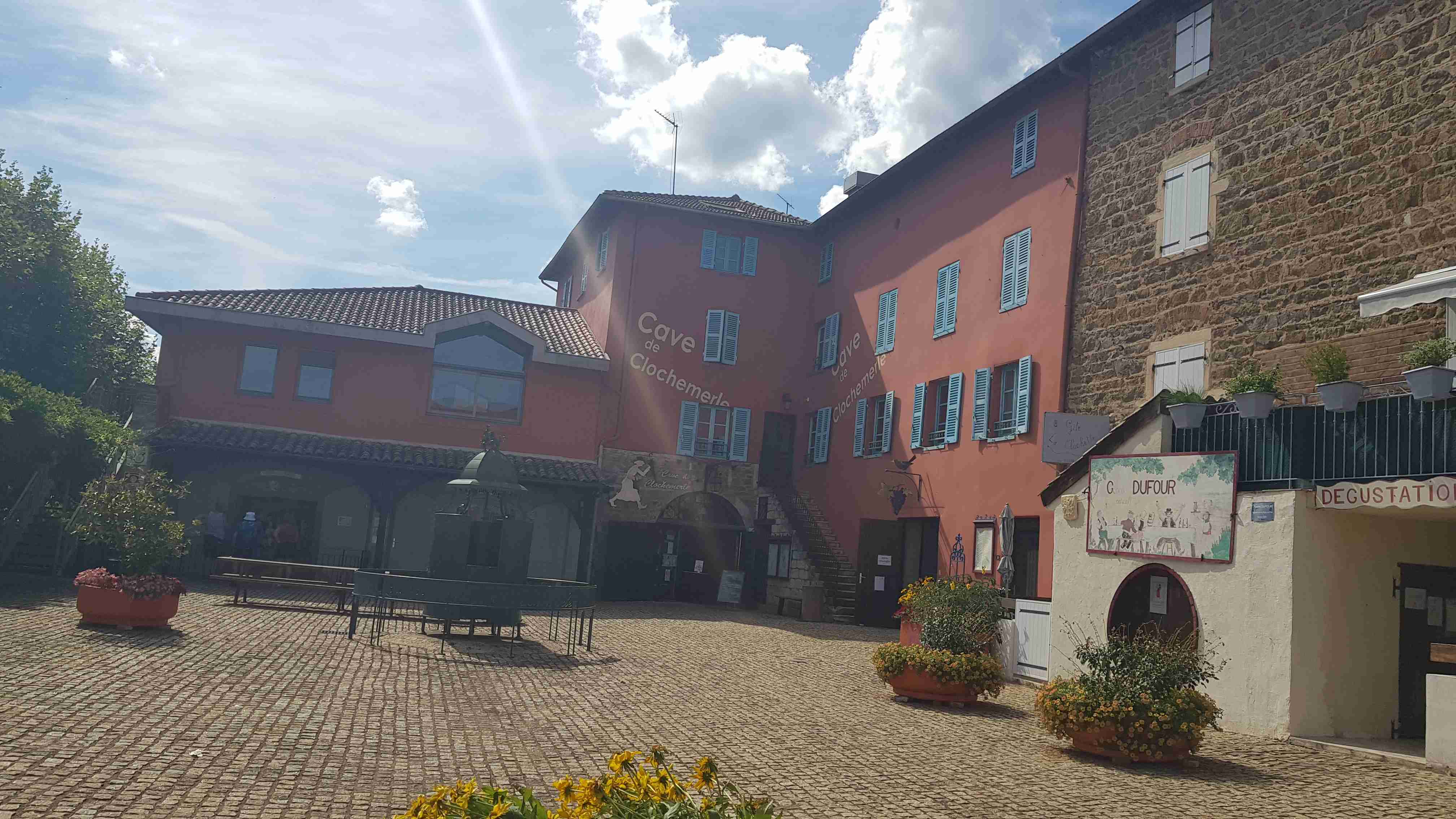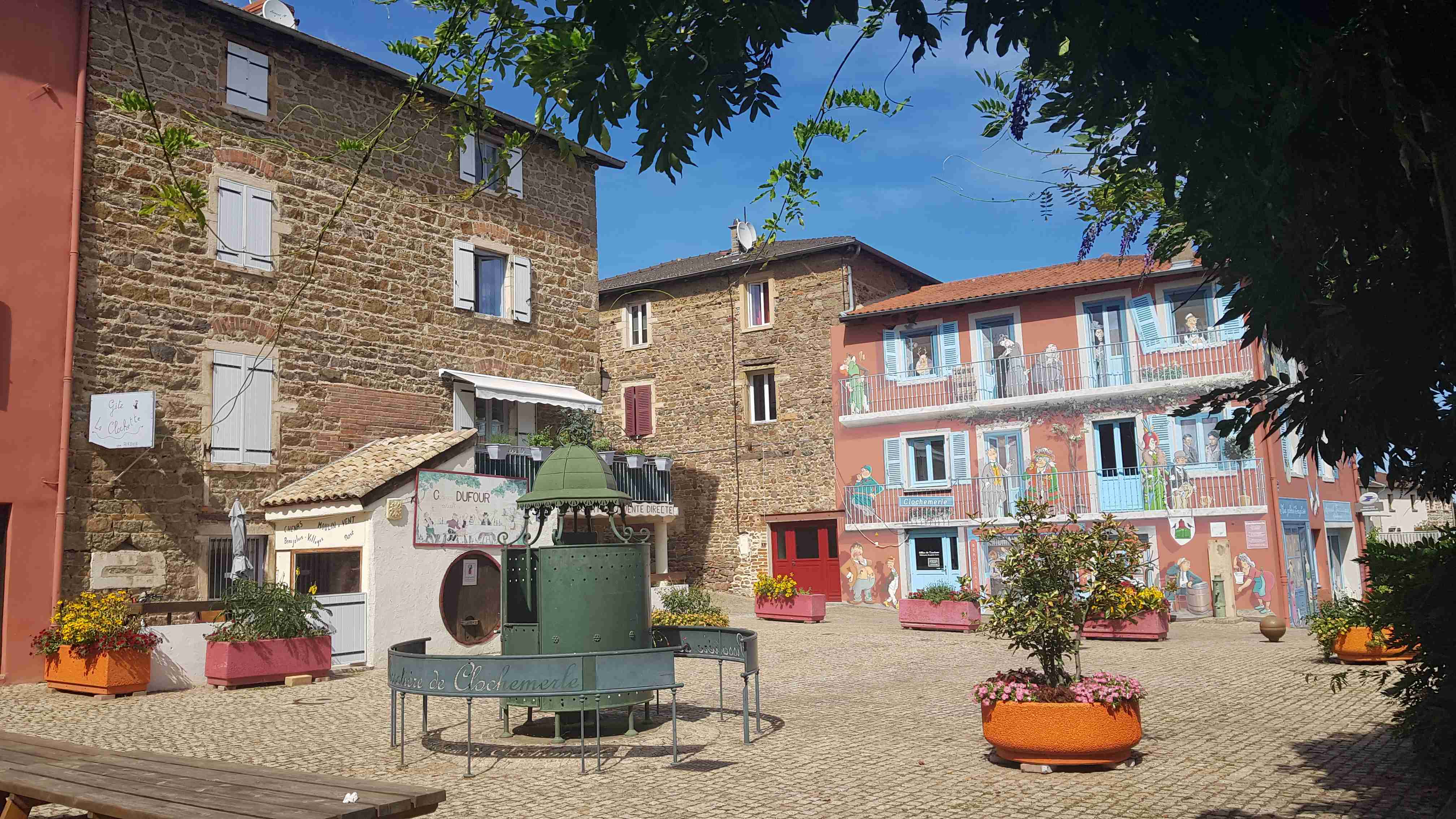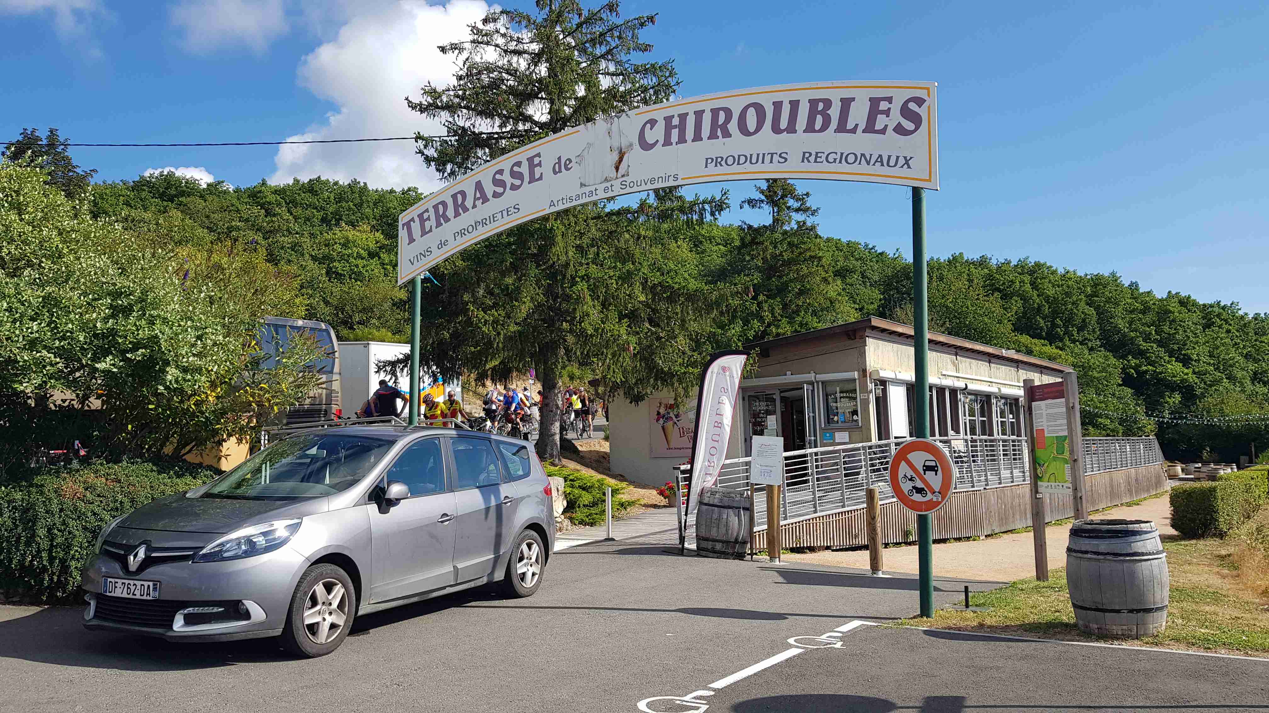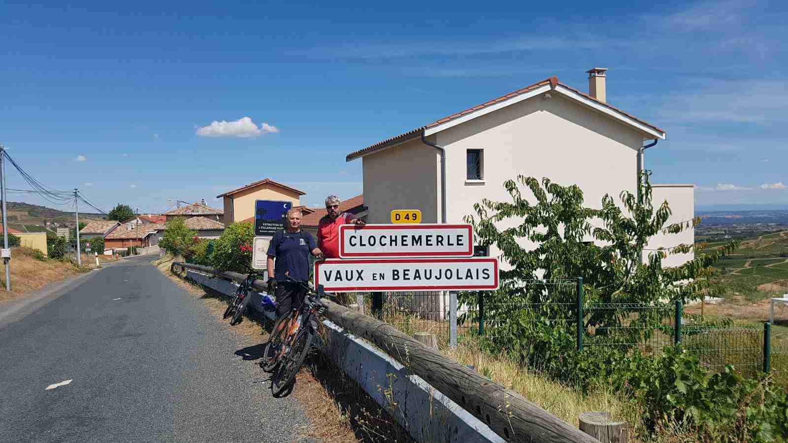 Na poslední etapu nás autobus odvezl opět mimo Burgundsko a to do oblasti Beaujolais, kde nás vysadil těsně pod vrcholem kopce v oblasti Chiroubles. Vyjeli jsme na kolech ten zbytek kopce, kousek po rovince a poté doleva na D 129 a klesání cca 7km do městečka Beaujeu, kde se naše trasa rozdělovala na dvě varianty: doleva kratší a téměř po rovince, doprava delší a kopcovitá. My jsme volili tu delší (i Honza!), ale ještě předtím jsme zajeli do centra města na pár fotek. Pak jsme již vyrazili do kopců, ten první byl cca 10 km stoupání a samozřejmě Honzovi došla baterka ještě před vrcholem tohoto prvního nejdelšího. Vytlačil na vrchol, my jsme mu pomohli od baterie, která má sama o sobě snad 10 kg, ale zbývající 3 vrcholy si musel stejně odtlačit. Cesta vedla vyprahlou krajinou přes tři sedla a z toho posledního pak již závěrečné klesání cca 7 km do obce Vaux-en-Beaujolais, neboli Clochemerle, česky Zvonokosy, kde čekal autobus. Museli jsme zabezpečit kola na přepravu do Čech, doplnit tekutiny a vyrazili jsme do mestečka do vinárny. Ale byl jsem tak utahaný a zmožený vedrem, že jsem si ani nic nedal a ani nic nekoupil sebou. Takže jenom pár fotek a posezení ve stínu. V 17 hodin jsme vyrazili k hotelu, tam se mi udělalo zle, pravděpodobně ze včerejších zbytků kuřete, a tak jsem se nezúčastnil večerního rozloučení s hotelem a ani jsem nevečeřel. Naštěstí jsem to vyležel a ráno bylo již vše O. K. Tak taková to byla neslavná tečka za jinak skvělým zájezdem