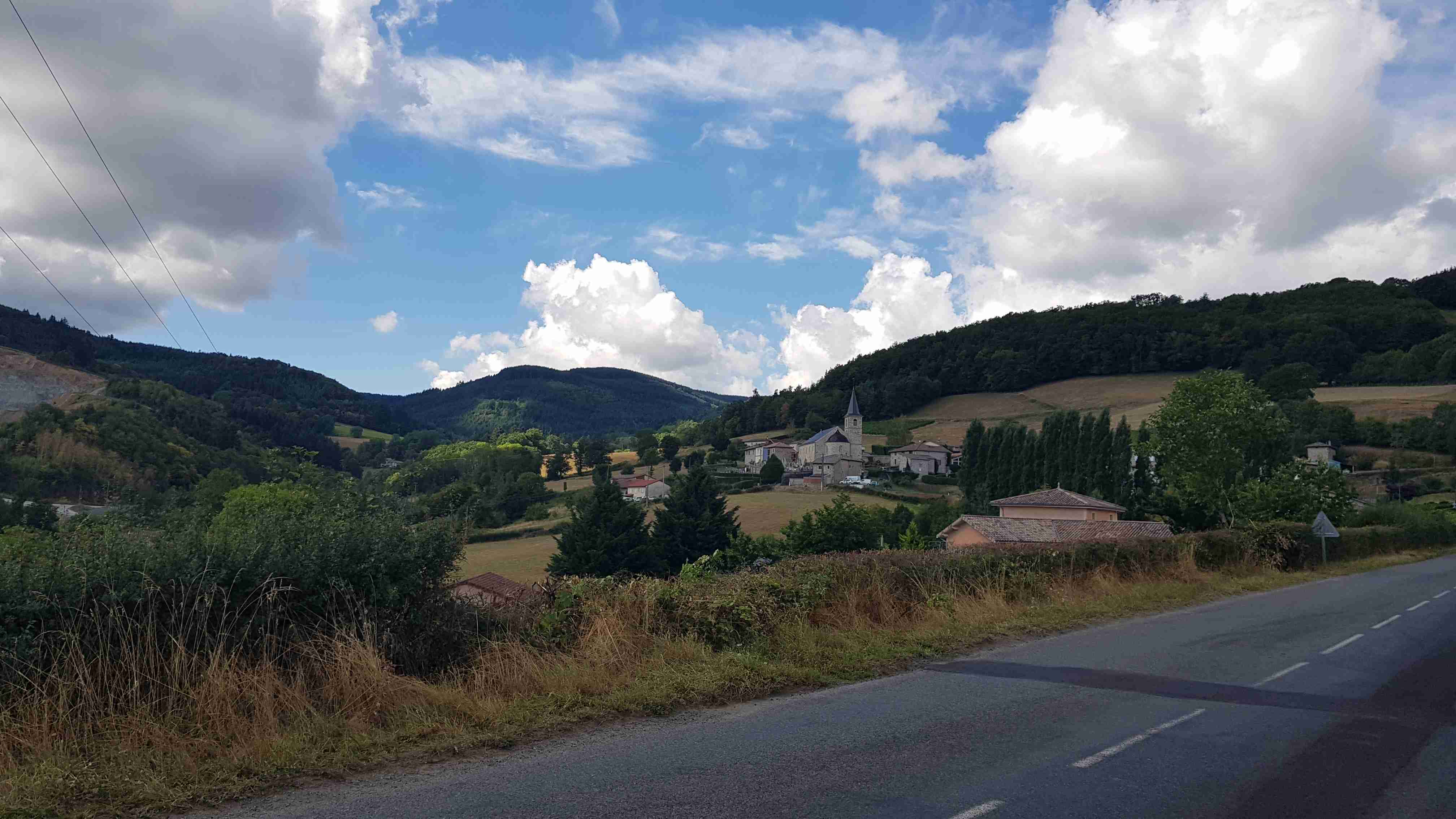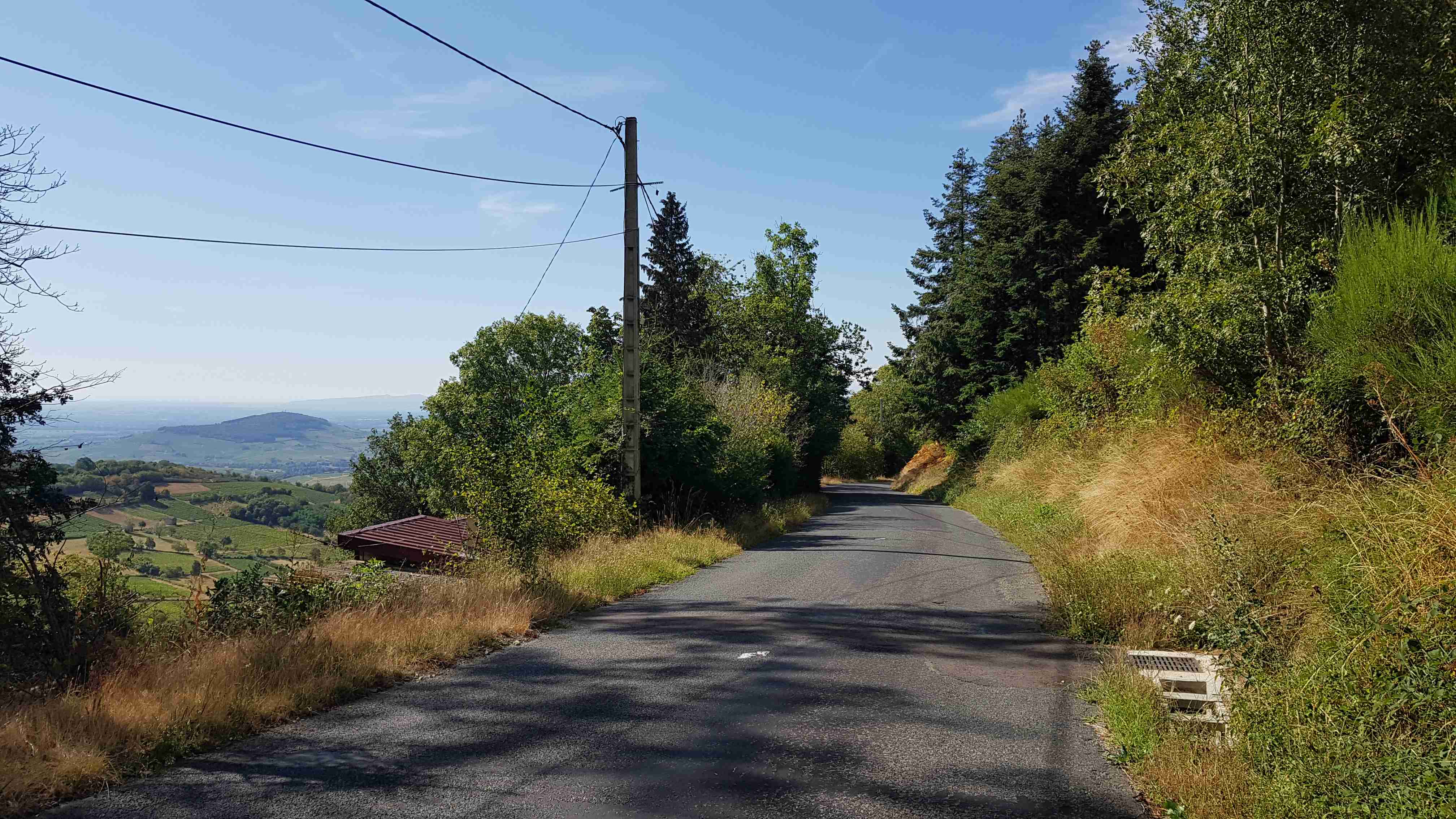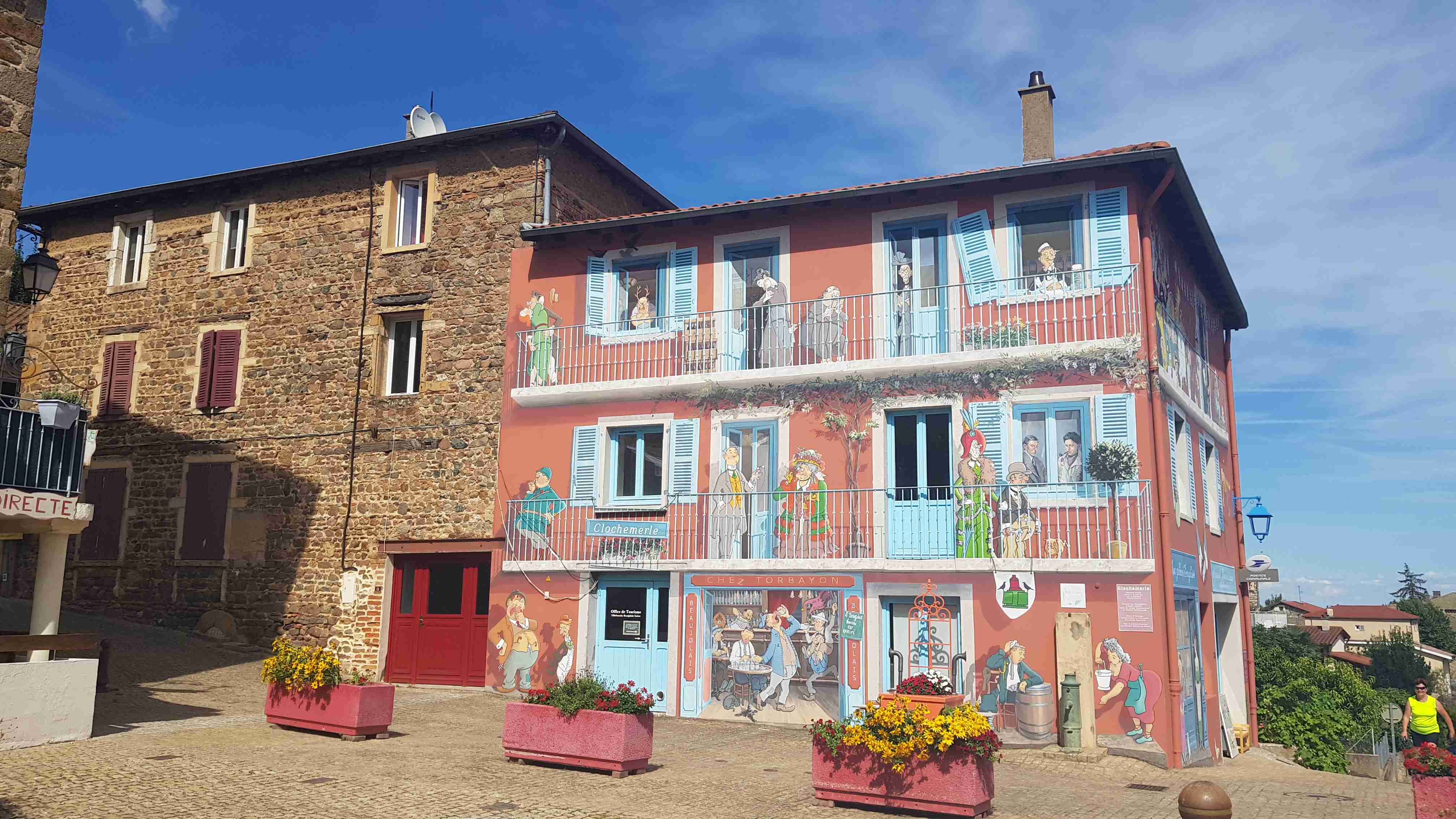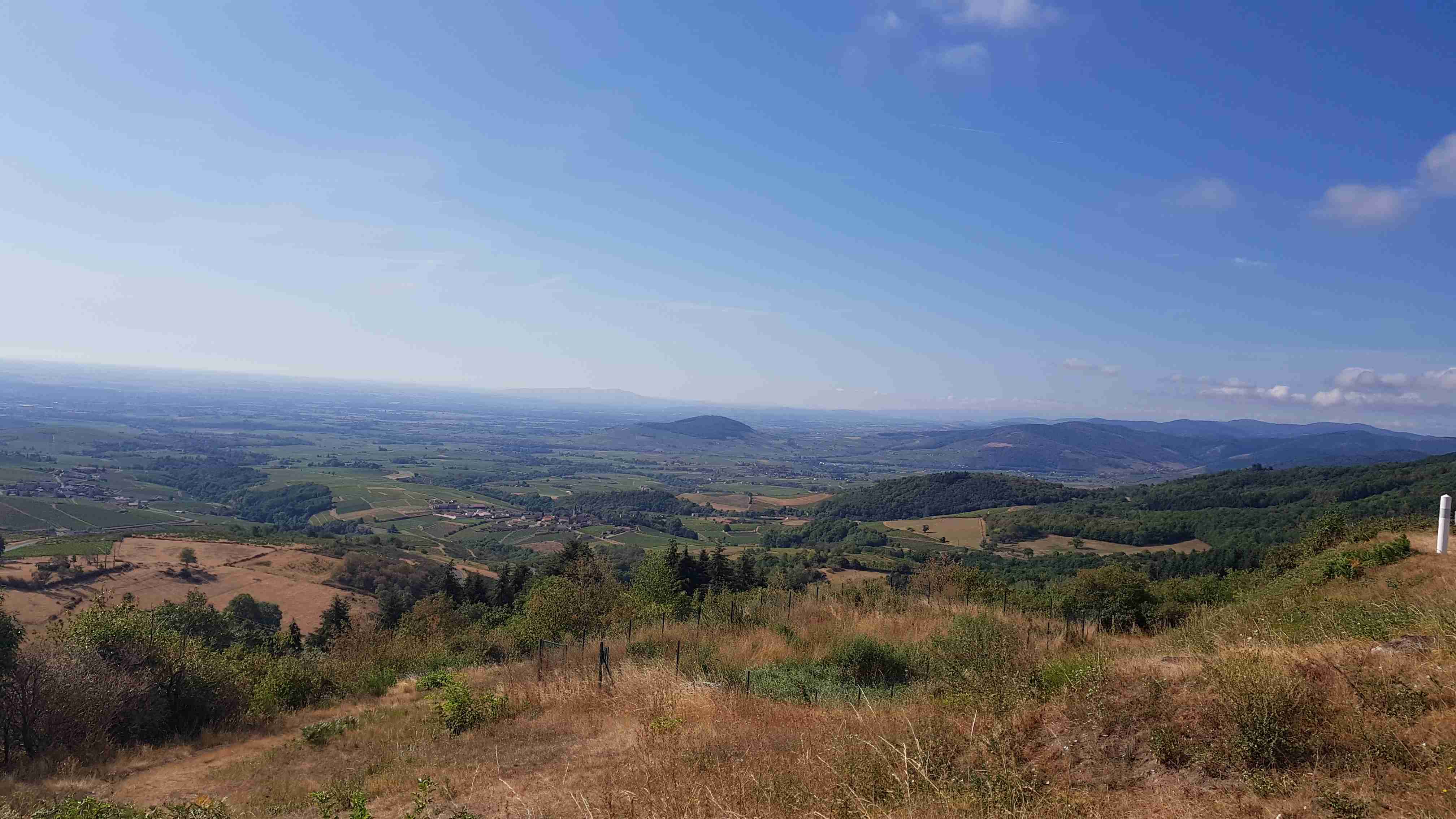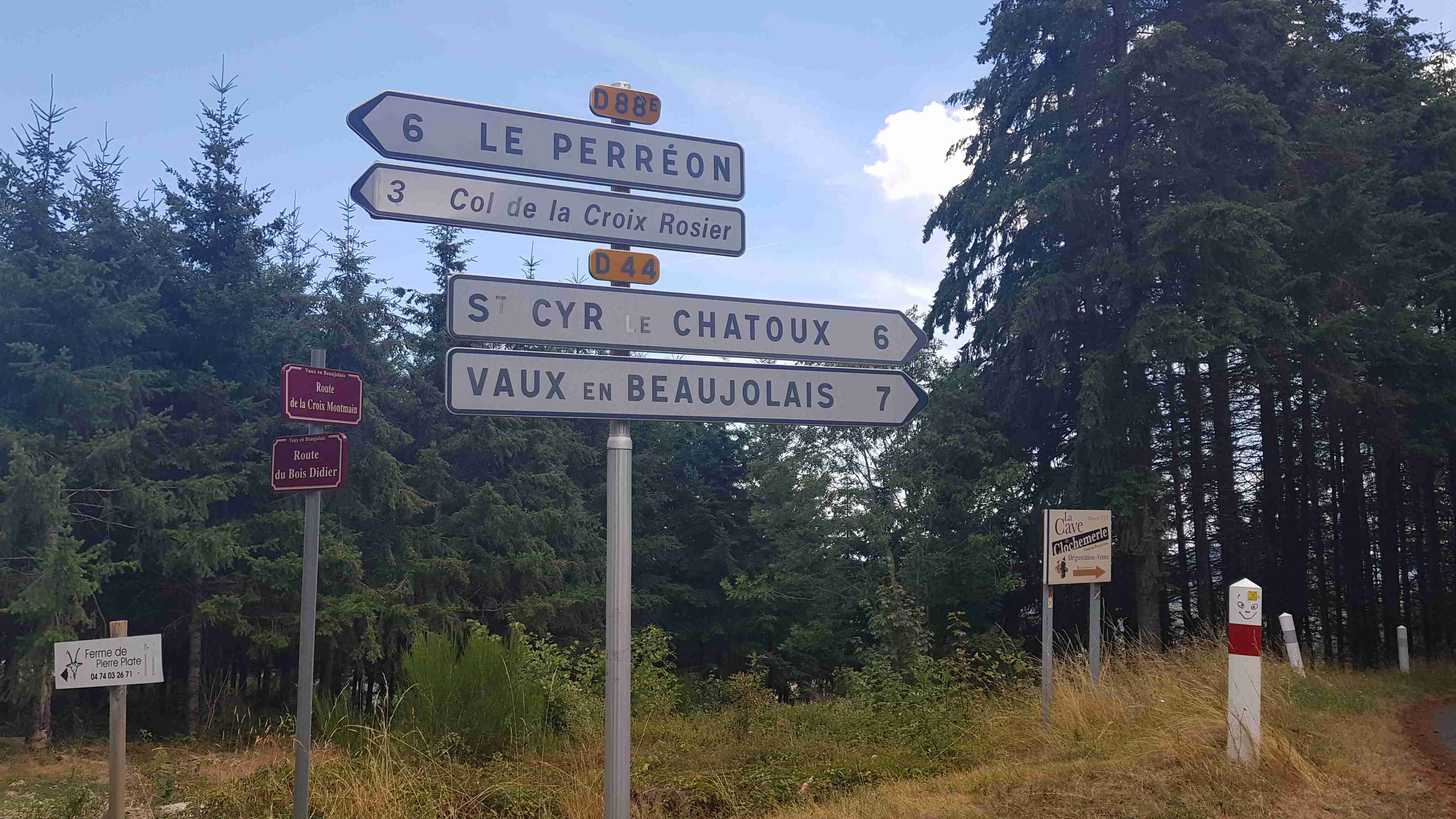 Na poslední etapu nás autobus odvezl opět mimo Burgundsko a to do oblasti Beaujolais, kde nás vysadil těsně pod vrcholem kopce v oblasti Chiroubles. Vyjeli jsme na kolech ten zbytek kopce, kousek po rovince a poté doleva na D 129 a klesání cca 7km do městečka Beaujeu, kde se naše trasa rozdělovala na dvě varianty: doleva kratší a téměř po rovince, doprava delší a kopcovitá. My jsme volili tu delší (i Honza!), ale ještě předtím jsme zajeli do centra města na pár fotek. Pak jsme již vyrazili do kopců, ten první byl cca 10 km stoupání a samozřejmě Honzovi došla baterka ještě před vrcholem tohoto prvního nejdelšího. Vytlačil na vrchol, my jsme mu pomohli od baterie, která má sama o sobě snad 10 kg, ale zbývající 3 vrcholy si musel stejně odtlačit. Cesta vedla vyprahlou krajinou přes tři sedla a z toho posledního pak již závěrečné klesání cca 7 km do obce Vaux-en-Beaujolais, neboli Clochemerle, česky Zvonokosy, kde čekal autobus. Museli jsme zabezpečit kola na přepravu do Čech, doplnit tekutiny a vyrazili jsme do mestečka do vinárny. Ale byl jsem tak utahaný a zmožený vedrem, že jsem si ani nic nedal a ani nic nekoupil sebou. Takže jenom pár fotek a posezení ve stínu. V 17 hodin jsme vyrazili k hotelu, tam se mi udělalo zle, pravděpodobně ze včerejších zbytků kuřete, a tak jsem se nezúčastnil večerního rozloučení s hotelem a ani jsem nevečeřel. Naštěstí jsem to vyležel a ráno bylo již vše O. K. Tak taková to byla neslavná tečka za jinak skvělým zájezdem