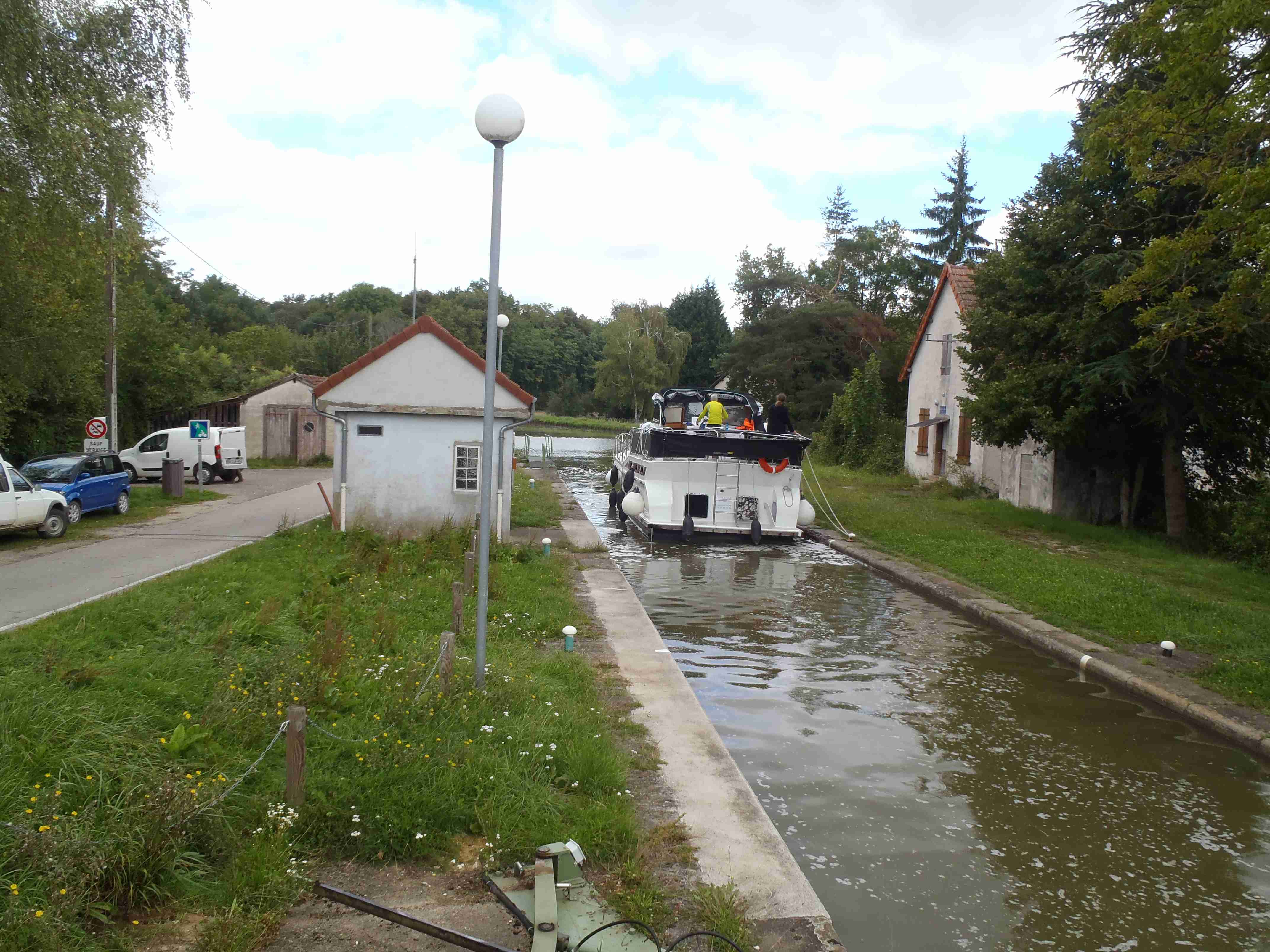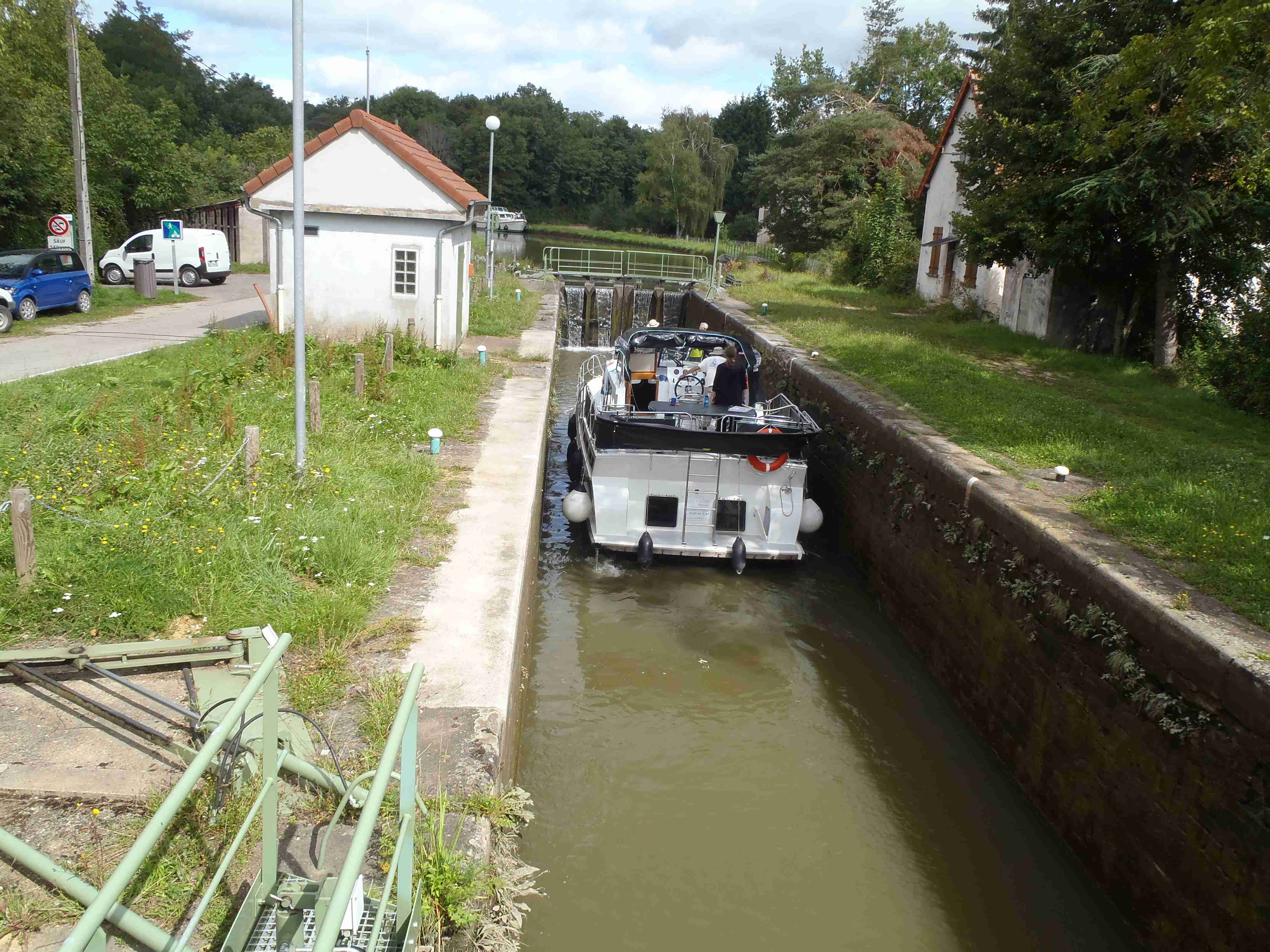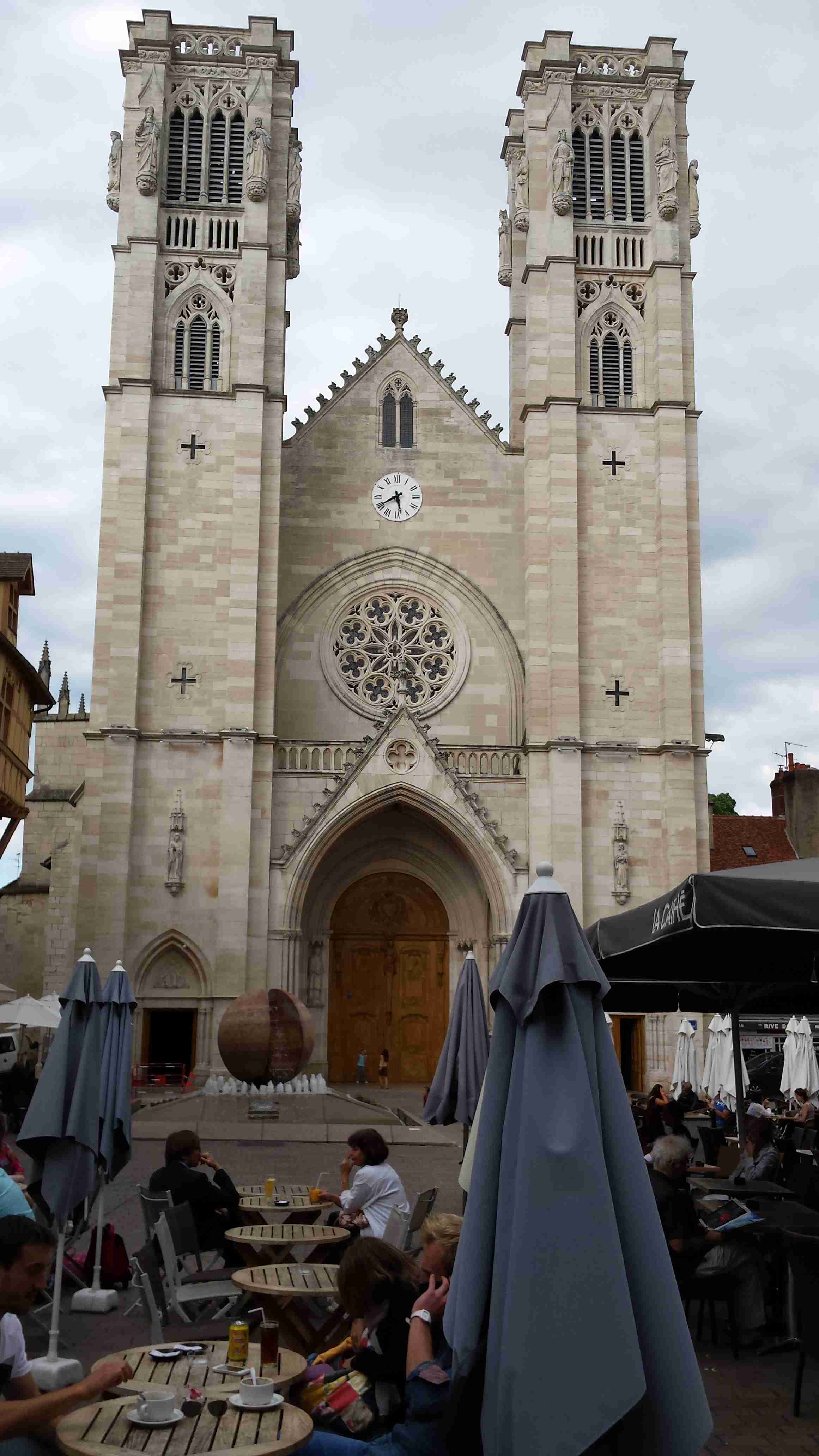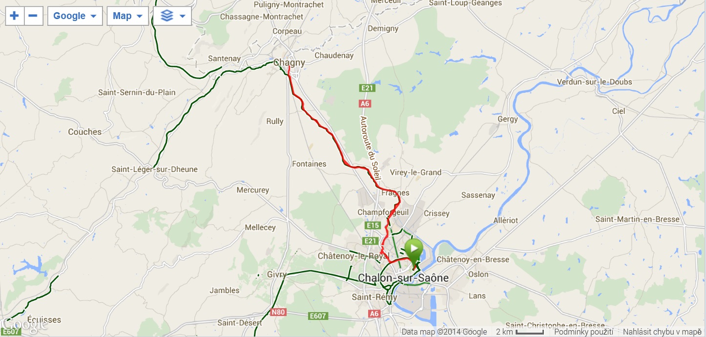 Po snídani všechno naložit a v 8:30 odjezd do Chalon sur Saone, města vzdáleného asi 50 km na sever od Maconu. Autobus zaparkoval po hodině jízdy nedaleko plaveckého stadionu a na 9 hodin musel být odstaven, což byl náš limit pro cyklistiku, popřípadě jiné aktivity. Někteří již kola nechali v přívěsu, někteří vyrazili přes kopce ke kanálu Canal du Centre, který spojuje řeky Loiru a Saonu, aby projeli okruh zpět k busu. My s Ivou jsme si udělali vlastní trasu, zamířili jsme ke kanálu nejkratším směrem a pohodovou jízdou podél vody jsme dojeli až do Chagny, městečka, kde jsem si vloni pochutnal na kohoutu na víně. Zajeli jsme do stejné restaurace, kohouta měli, ale vzhledem k tomu, že jsem ho měl letos již několikrát k večeři, zvolil jsem šneky – escargots, čímž jsem dokončil burgundský gastronomický kruh. Letos jsme měli na večeři rovněž žabí stehýnka, není to špatné, ale hrozná piplačka. Šneků jsem si dal 12, po nich se netloustne, pár jsem jich samozřejmě věnoval Ivě. Sotva jsem dojedl, objevili se Radka s Karlem, kteří již měli většinu okruhu přes kopce za sebou a dali si s námi víno. My jsme pak pokračovali cestou zpět do Chalonu, už jsme nedělali tolik fotek jako cestou do Chagny a tak jsme byli poměrně brzo zpět v Chalonu, zastavili jsme se ve velkém nákupním centru a koupili nějaké sýry domů. U obchodního střediska se k nám připojilo několik kolegů, kteří neznali cestu a já jsem ji měl, vzhledem k tomu, že jsme se vraceli po stejné trase, v navigaci, takže jsem všechny bez problémů dovedl k autobusu. Najeto pohodových 43 km. Převlékli jsme se do civilu, zašli ještě do nedalekého Lidlu dokoupit sýry, stavěli jsme se udělat pár fotek katedrály a v 18:35 jsme vyrazili na cestu domů. Do Prahy jsme dorazili v 5:45, chvíli jsme počkali na Martina a v Ústí jsme byli asi v 7:30. Podařený zájezd, plno zážitků jak sportovních tak i kulinářských.