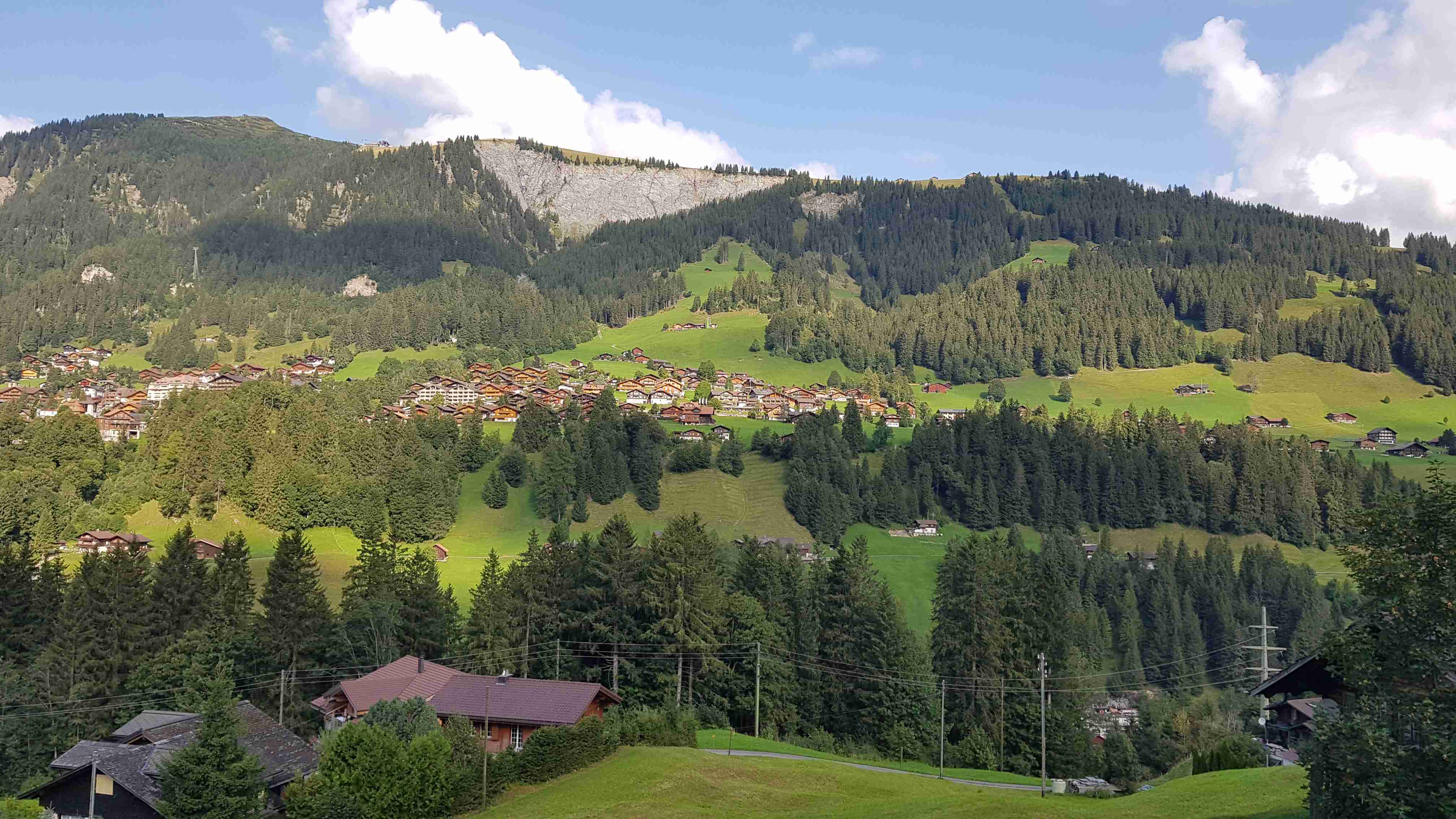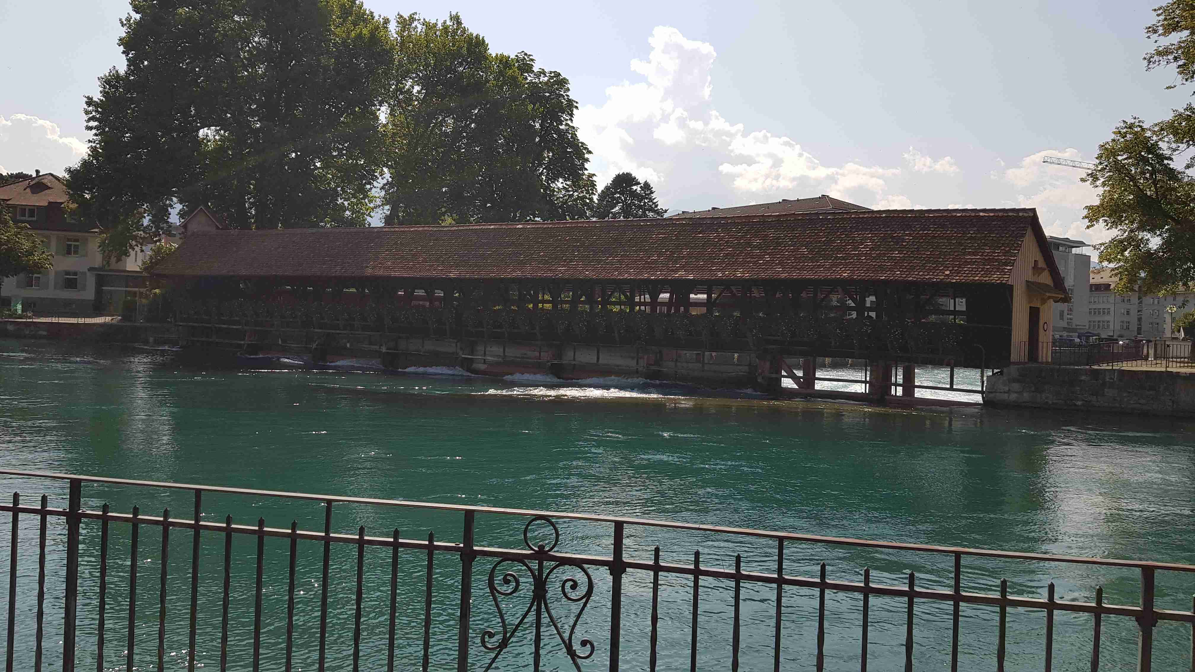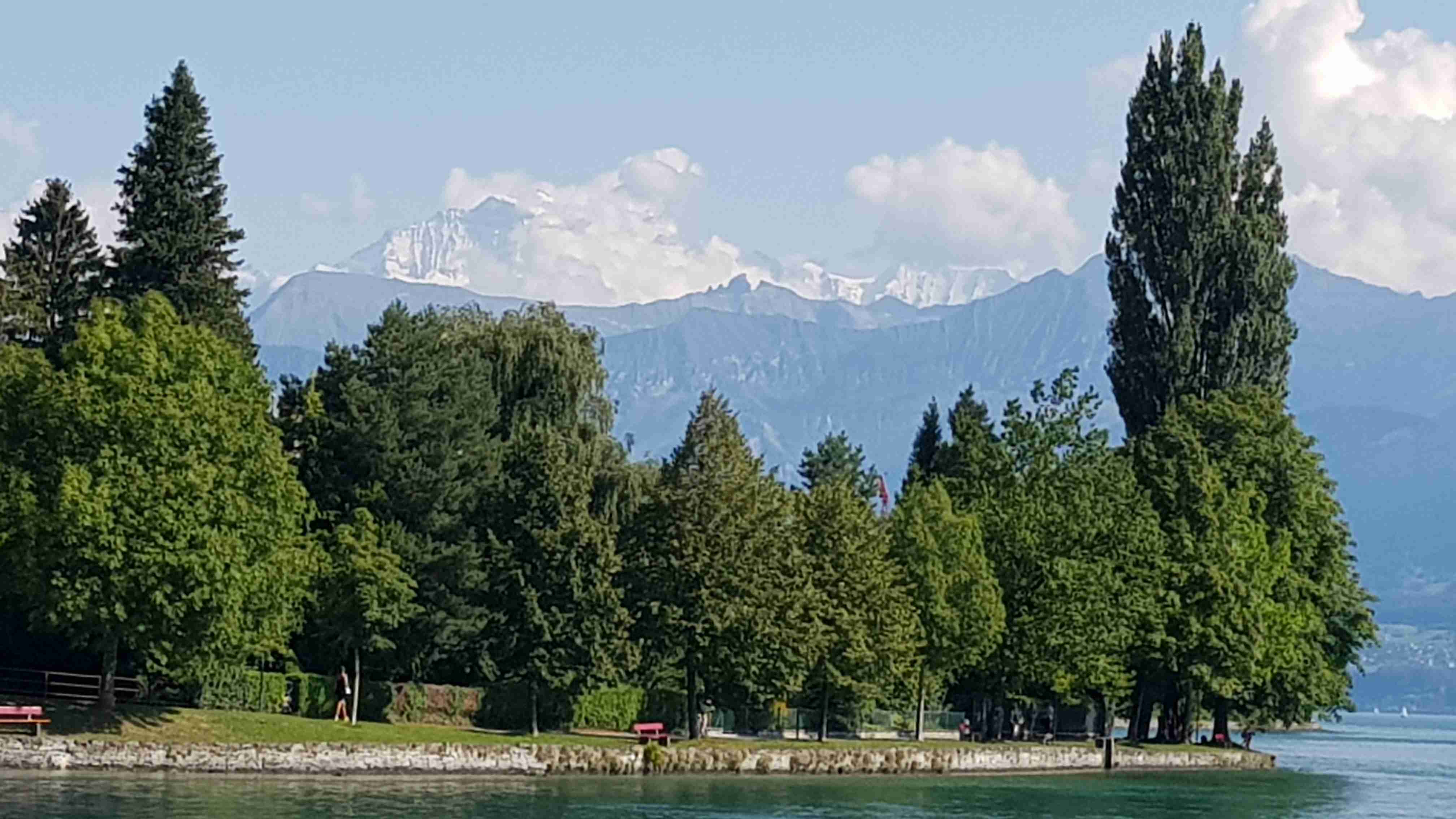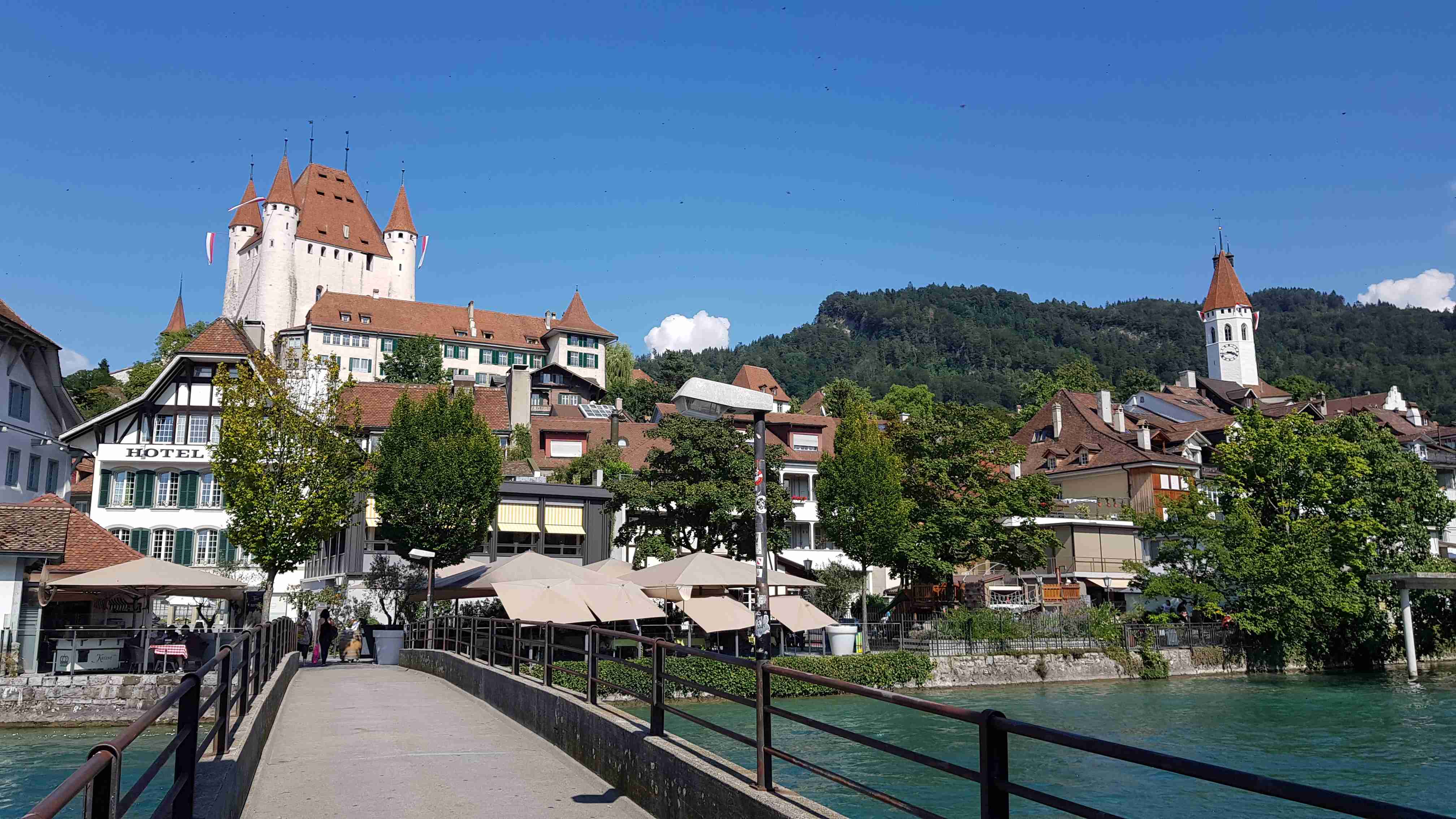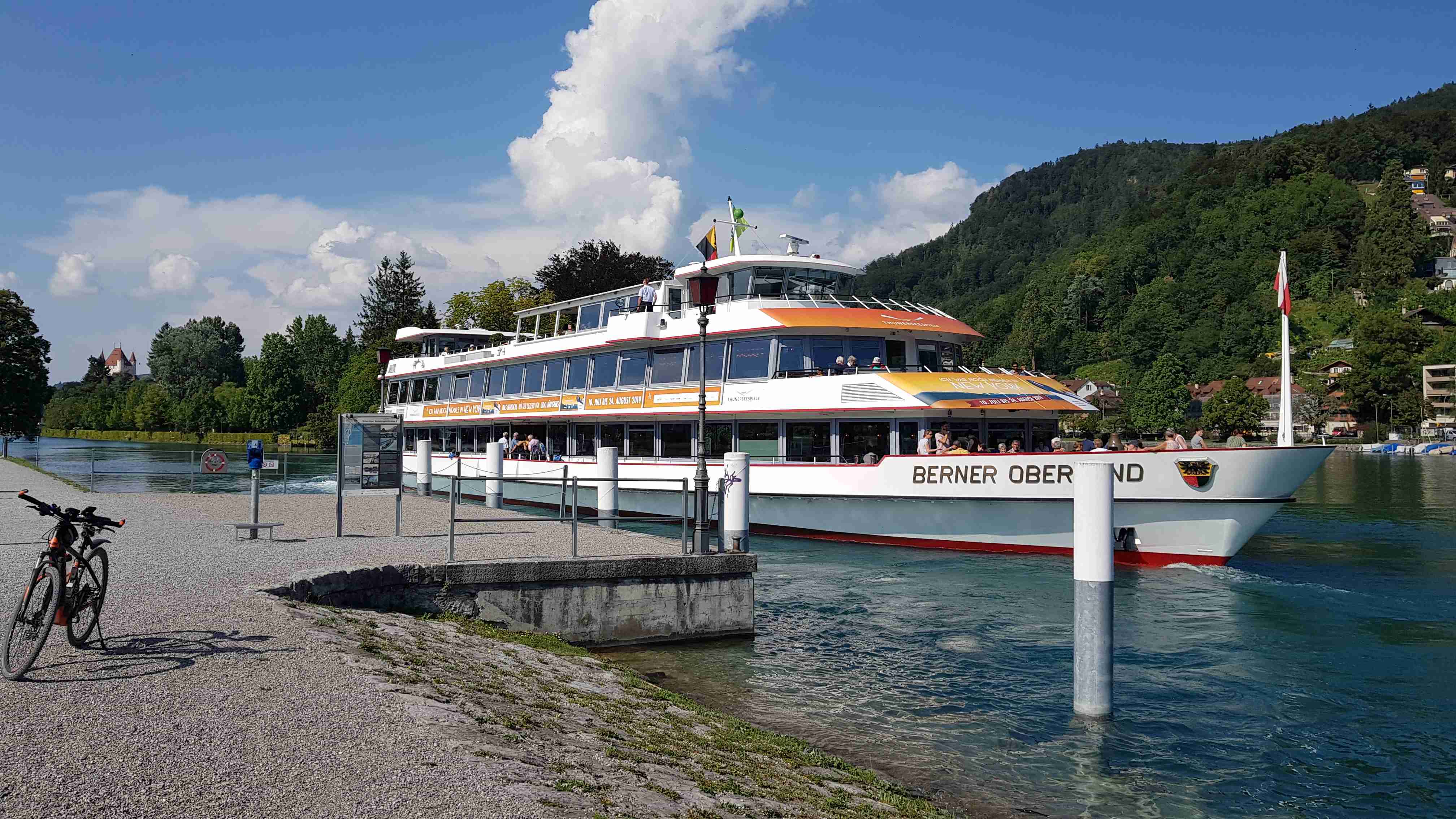 Dnes jsme vyrazili na kolech už od místa ubytování. V Adelbodenu jsme sjeli kousek dolů na kruhovou křižovatku, kde jsme vyjeli doprava, přejeli přes říčku Engstlige a vystoupali nahoru do kopce vysoko nad hlavní silnici. Drželi jsme se pořád cyklostezky č. 1 Alpine Bike, trasa předepsaná Eurocyklem však v jednom úseku vedla jinudy, a to jsme si nevšimli. Právě v tomto úseku jsme vystoupali nejvýše (cca 1500 m n. m.), cyklostezka se změnila v 50 cm širokou štěrkovou cestičku pěkně prudkou. Naštěstí to netrvalo dlouho a opět jsme jeli po horských silničkách a po pár kilometrech byla již cyklostezka od Herdegenu totožná s tou švýcarskou. Před Frutigenem jsme sjeli z kopců dolů k řece a hlavní silnici, kterou jsme posléze podjeli, minuli jsme spodní stanici lanovky Niesenbahn v Mülenenu a zamířili jsme na městečko Wimmis. Před ním jsme to stočili doprava na Spiez, kde čekal autobus. Dali jsme malé pivní občerstvení a vyrazili do Thunu, kam se mezitím přesunul i náš autobus. Ten jsme našli, ale vydali jsme se ještě na kolech do centra, nafotili pár zajímavostí a vrátili se k autobusu, který nás po naložení kol odvezl zpět na ubytovnu. Počasí nám, navzdory předpovědím, docela přálo, najeto cca 57 km.