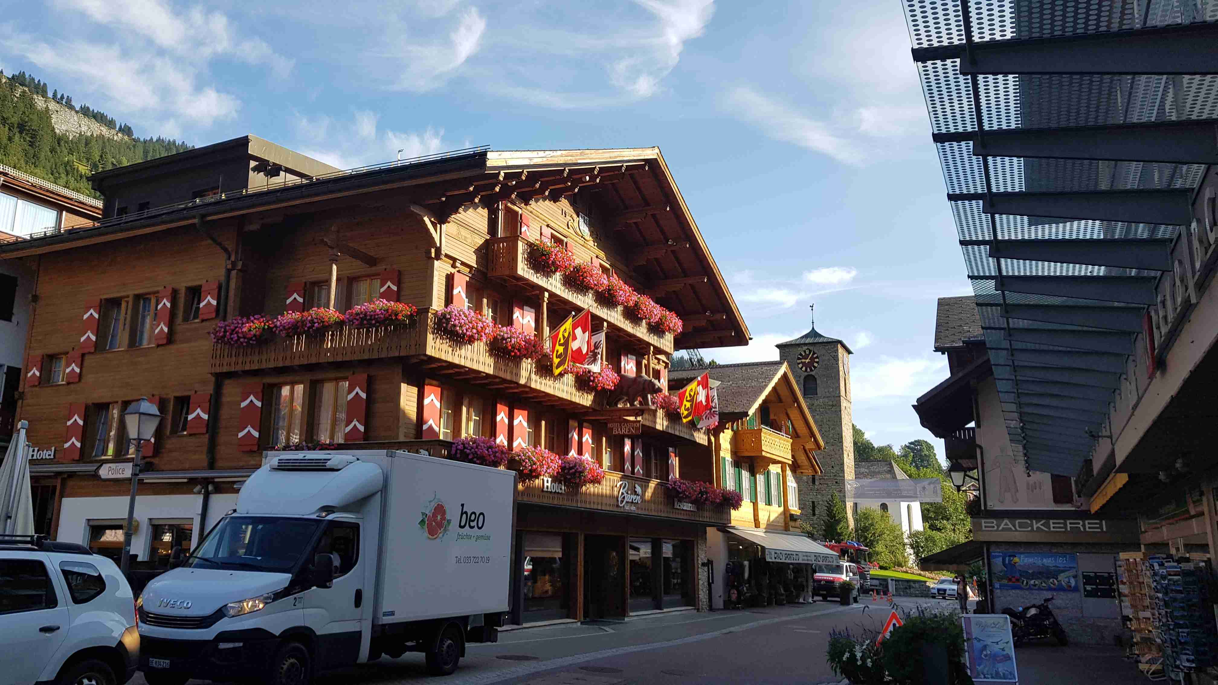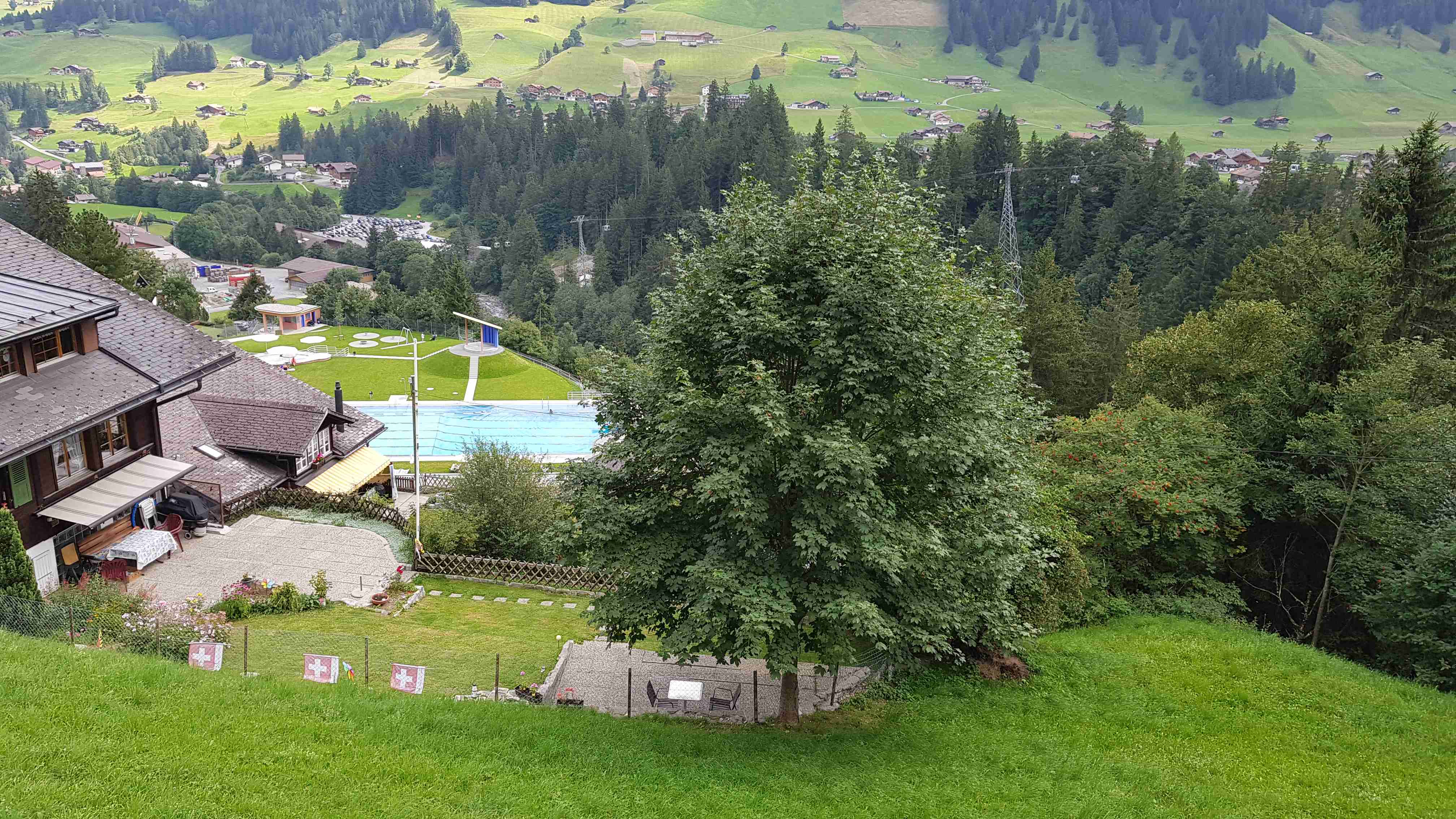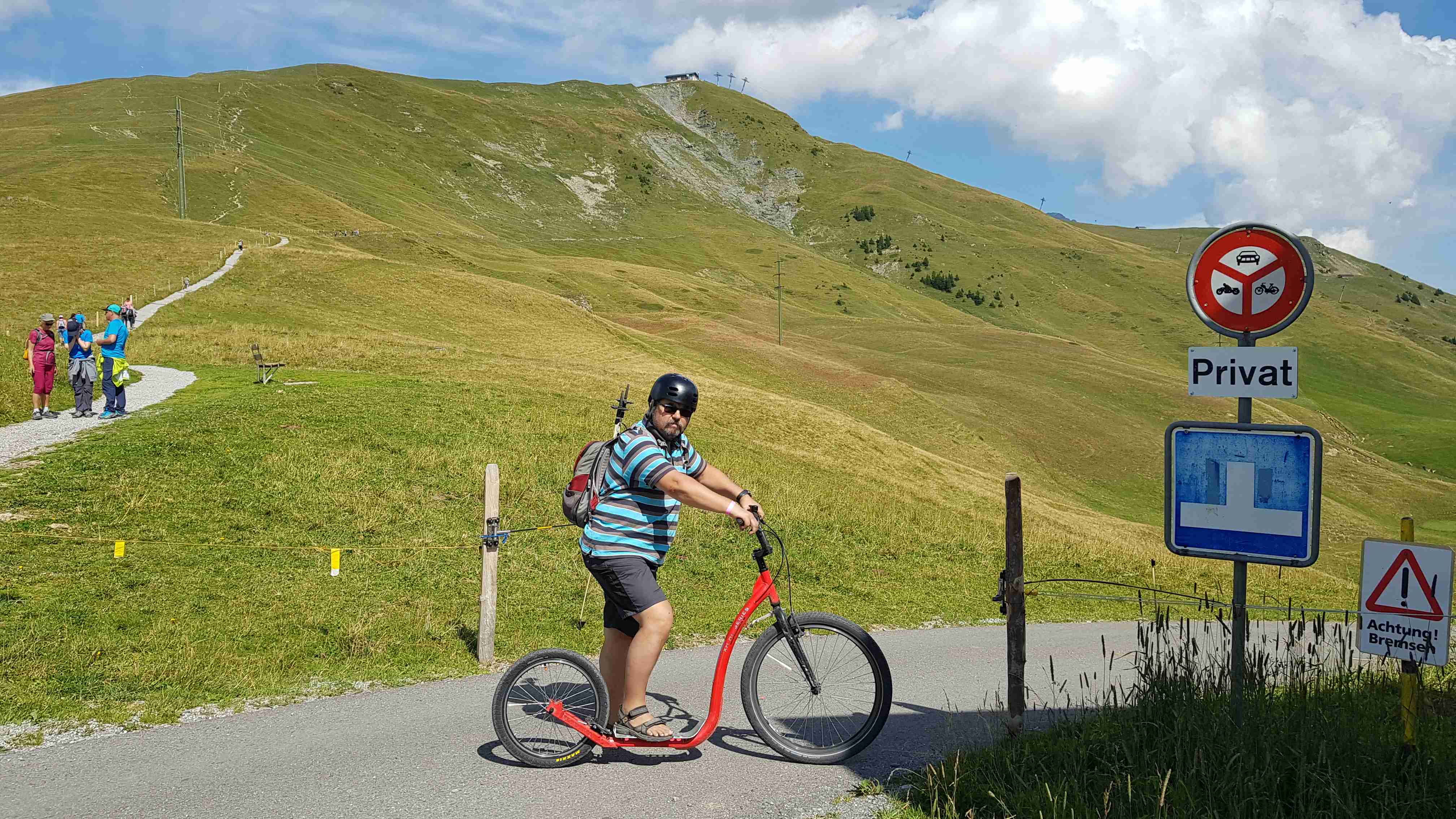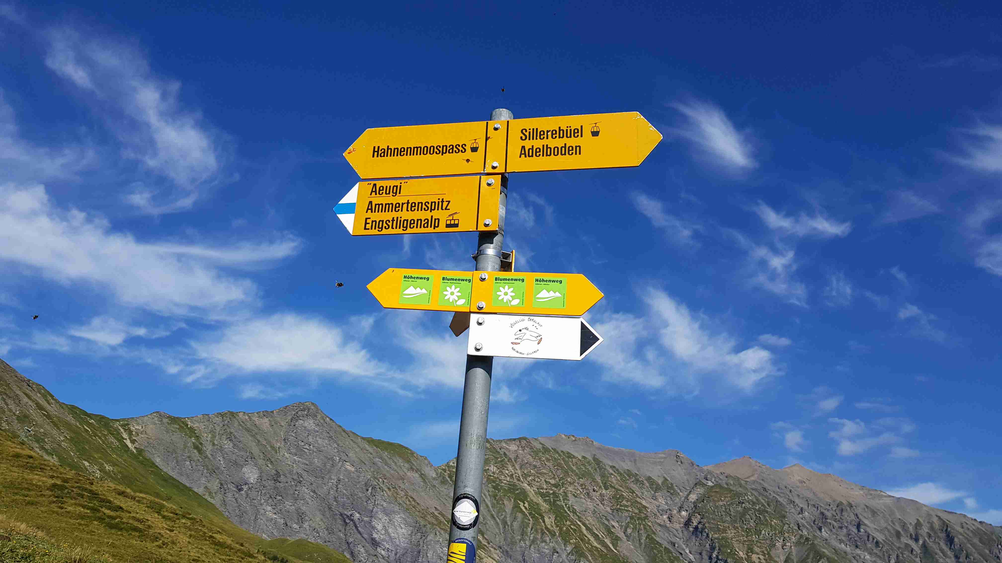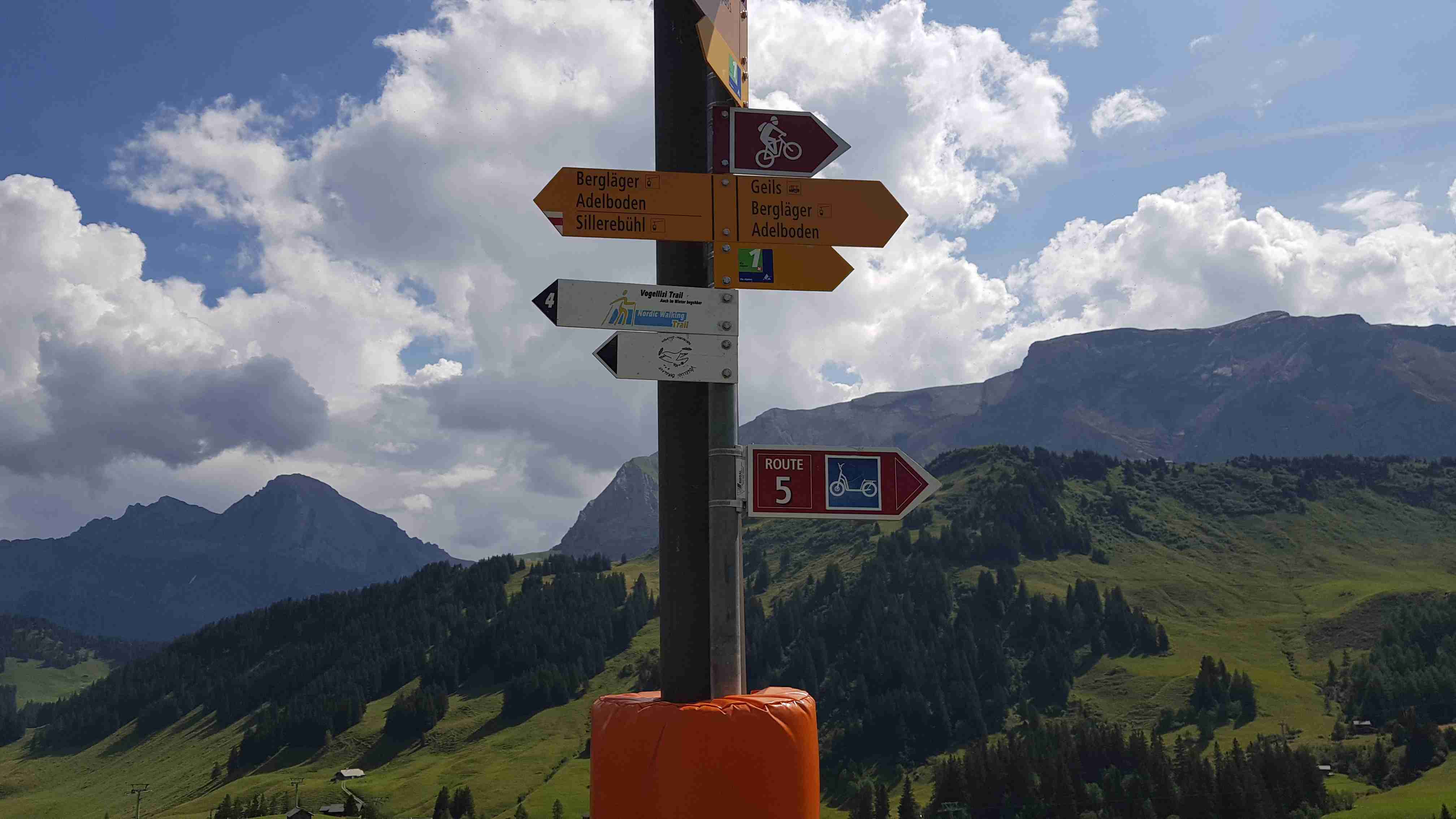 Dnešní den byl plánován bez kol jako turistický. Ráno jsme šli pěšky do města k horní stanici lanovky Dorfbahn a sjeli k dolní stanici lanovky Sillerebahn, kterou jsme vyjeli nahoru do Sillerenbühl do výšky 1974 m n.m. Odtud jsme pěšky vyrazili květinovou stezkou vedoucí po hřebeni a úbočí do cca 6 km vzdáleného sedla Hahnenmoos. Tady jsme po krátkém občerstvení vyfasovali koloběžky a sjížděli zpět dolů do Adelbodenu, kde jsme opětovně u horní stanice Dorfbahn odevzdali koloběžky i helmy a vydali se pěšky na ubytování. Po cestě nás zastihl déšť, ale dorazili jsme do Alpenflory ještě, než začalo bouřit a spustil se opravdový liják. Na mapce je dnešní trasa vyobrazena modrou barvou, bod A je horní stanice Sillerenbühl, tam jsme dojeli lanovkami z Adelbodenu. Do bodu B (Hahnenmoospass) jsme šli pěšky a odtud pak do bodu C na koloběžce zpět do Adelbodenu.