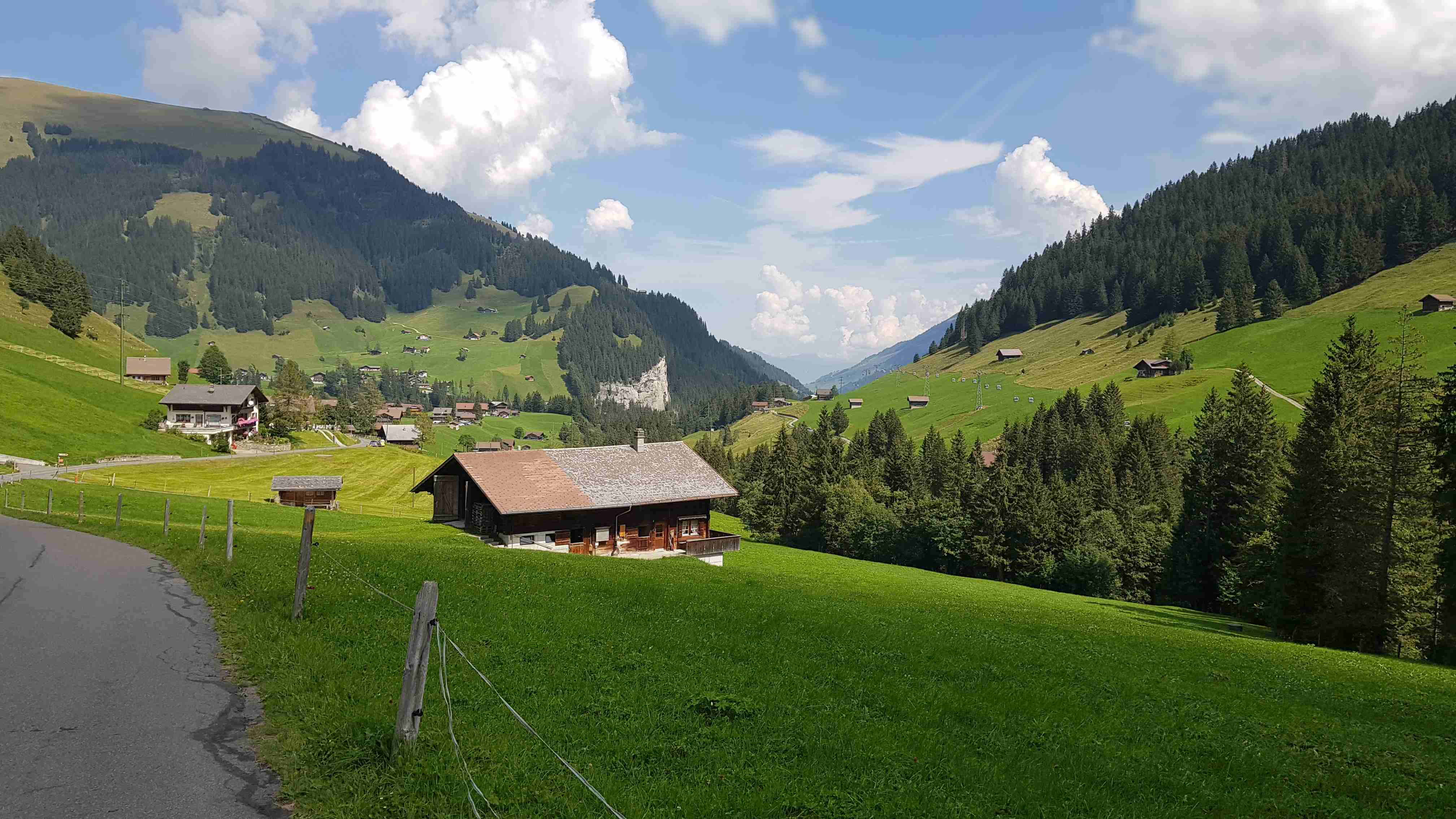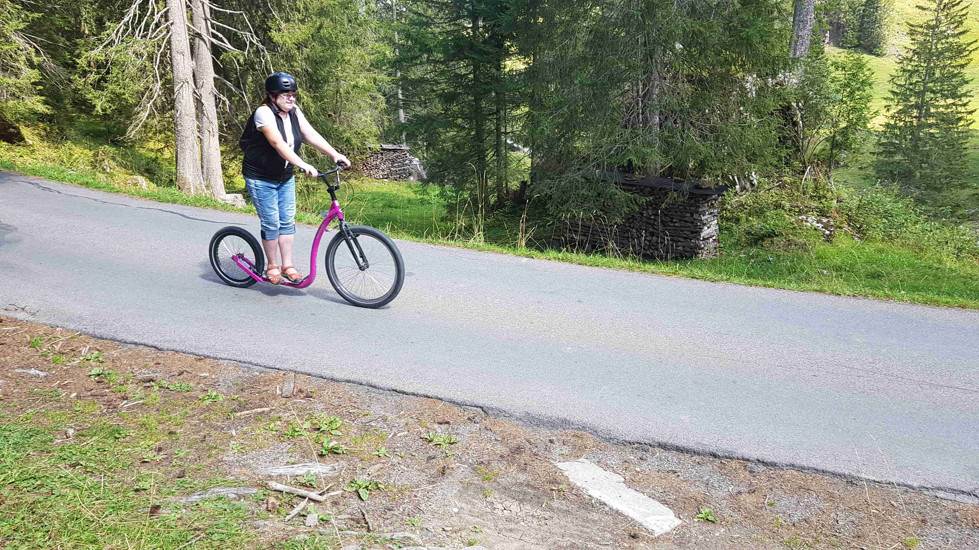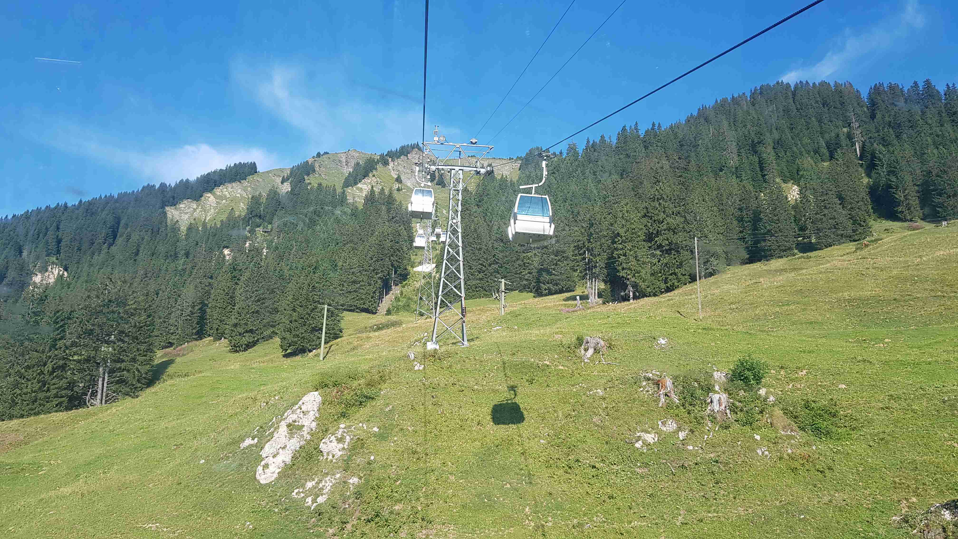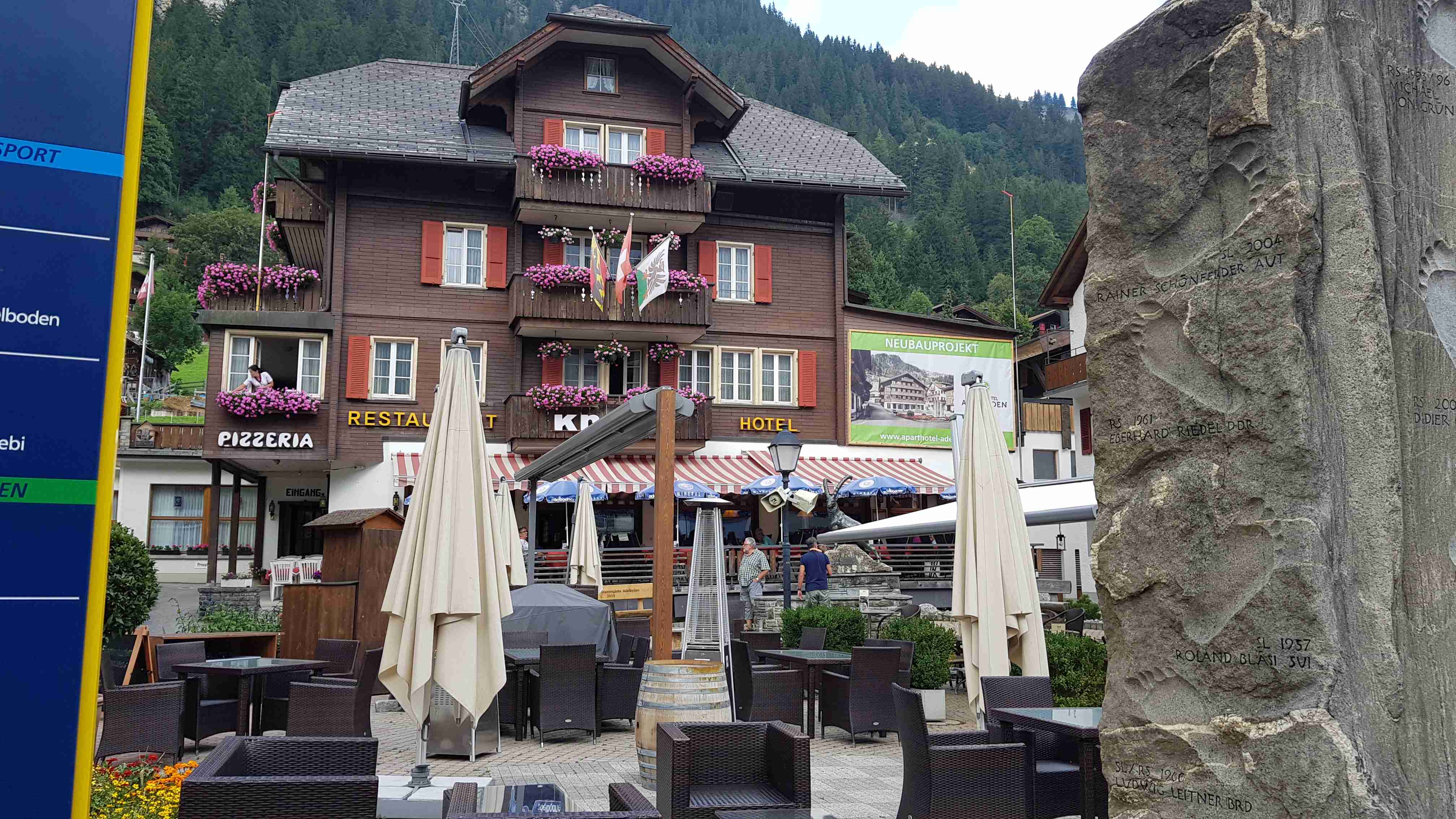 Dnešní den byl plánován bez kol jako turistický. Ráno jsme šli pěšky do města k horní stanici lanovky Dorfbahn a sjeli k dolní stanici lanovky Sillerebahn, kterou jsme vyjeli nahoru do Sillerenbühl do výšky 1974 m n.m. Odtud jsme pěšky vyrazili květinovou stezkou vedoucí po hřebeni a úbočí do cca 6 km vzdáleného sedla Hahnenmoos. Tady jsme po krátkém občerstvení vyfasovali koloběžky a sjížděli zpět dolů do Adelbodenu, kde jsme opětovně u horní stanice Dorfbahn odevzdali koloběžky i helmy a vydali se pěšky na ubytování. Po cestě nás zastihl déšť, ale dorazili jsme do Alpenflory ještě, než začalo bouřit a spustil se opravdový liják. Na mapce je dnešní trasa vyobrazena modrou barvou, bod A je horní stanice Sillerenbühl, tam jsme dojeli lanovkami z Adelbodenu. Do bodu B (Hahnenmoospass) jsme šli pěšky a odtud pak do bodu C na koloběžce zpět do Adelbodenu.