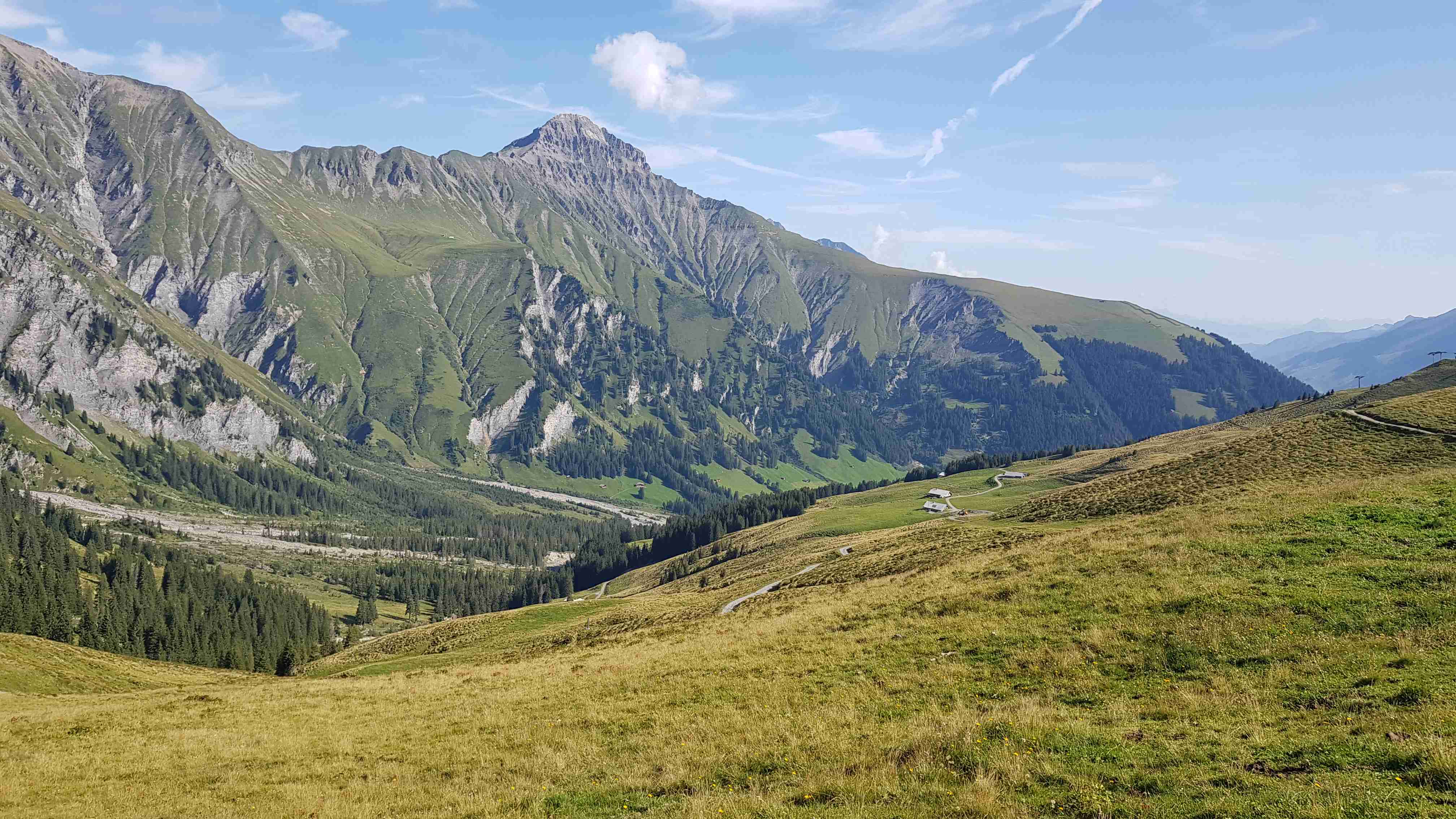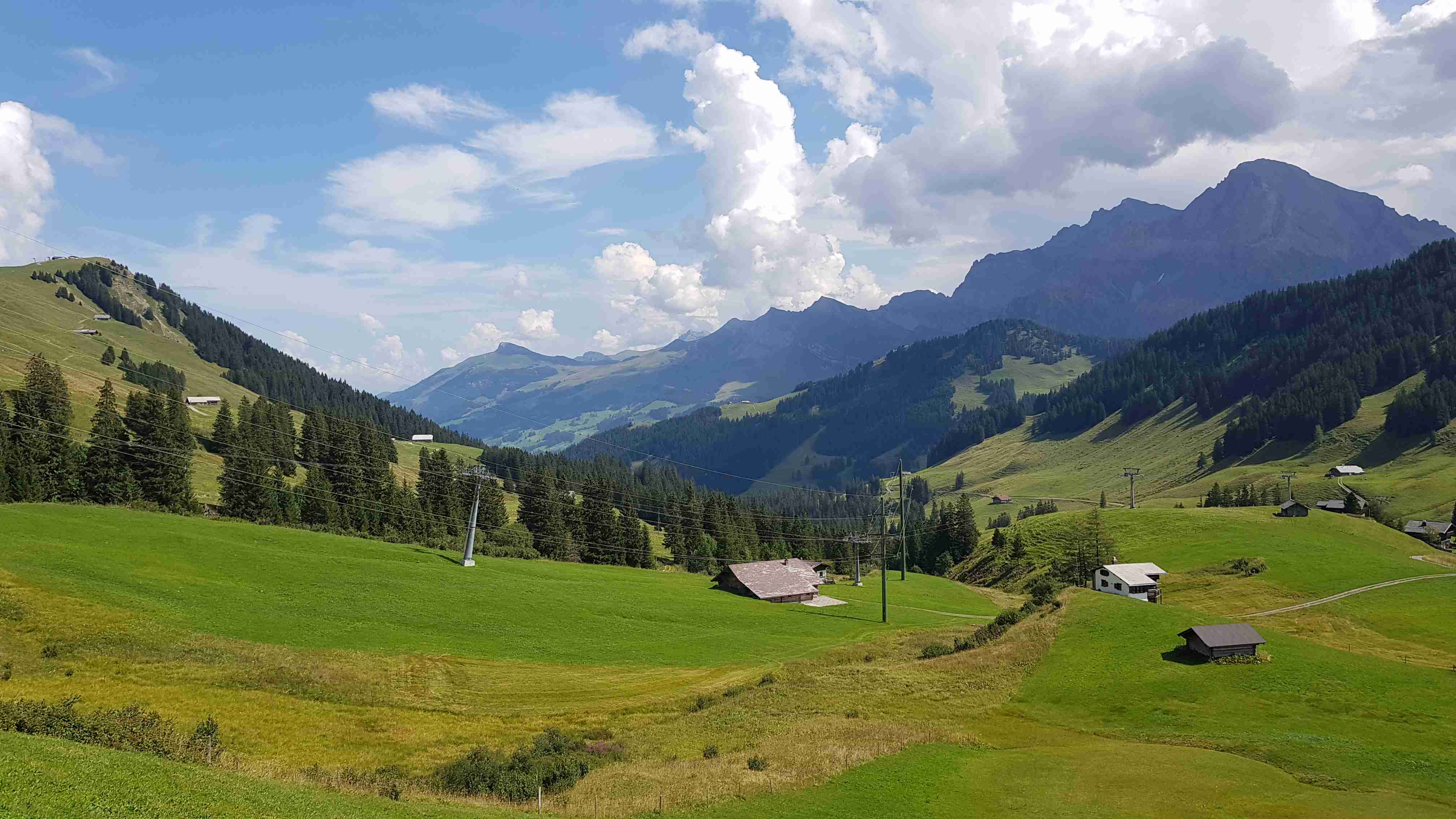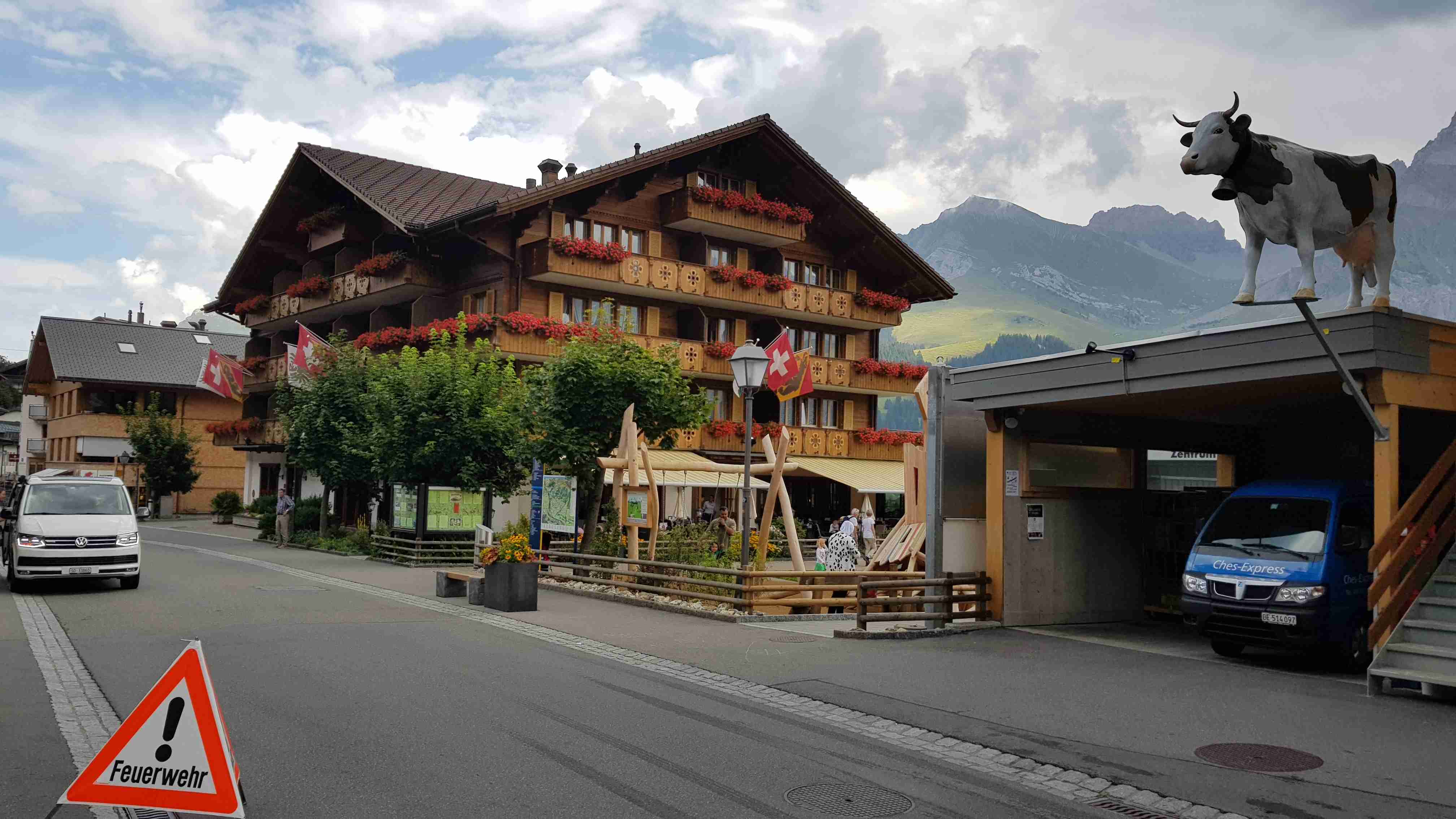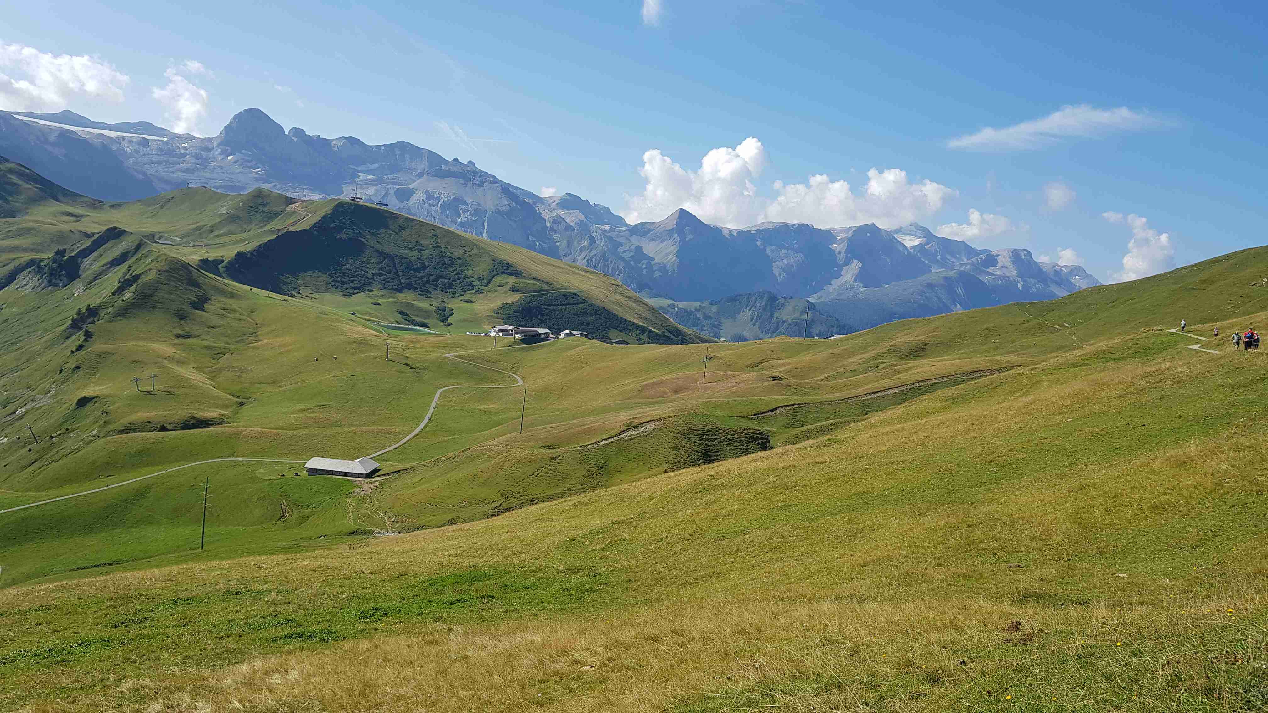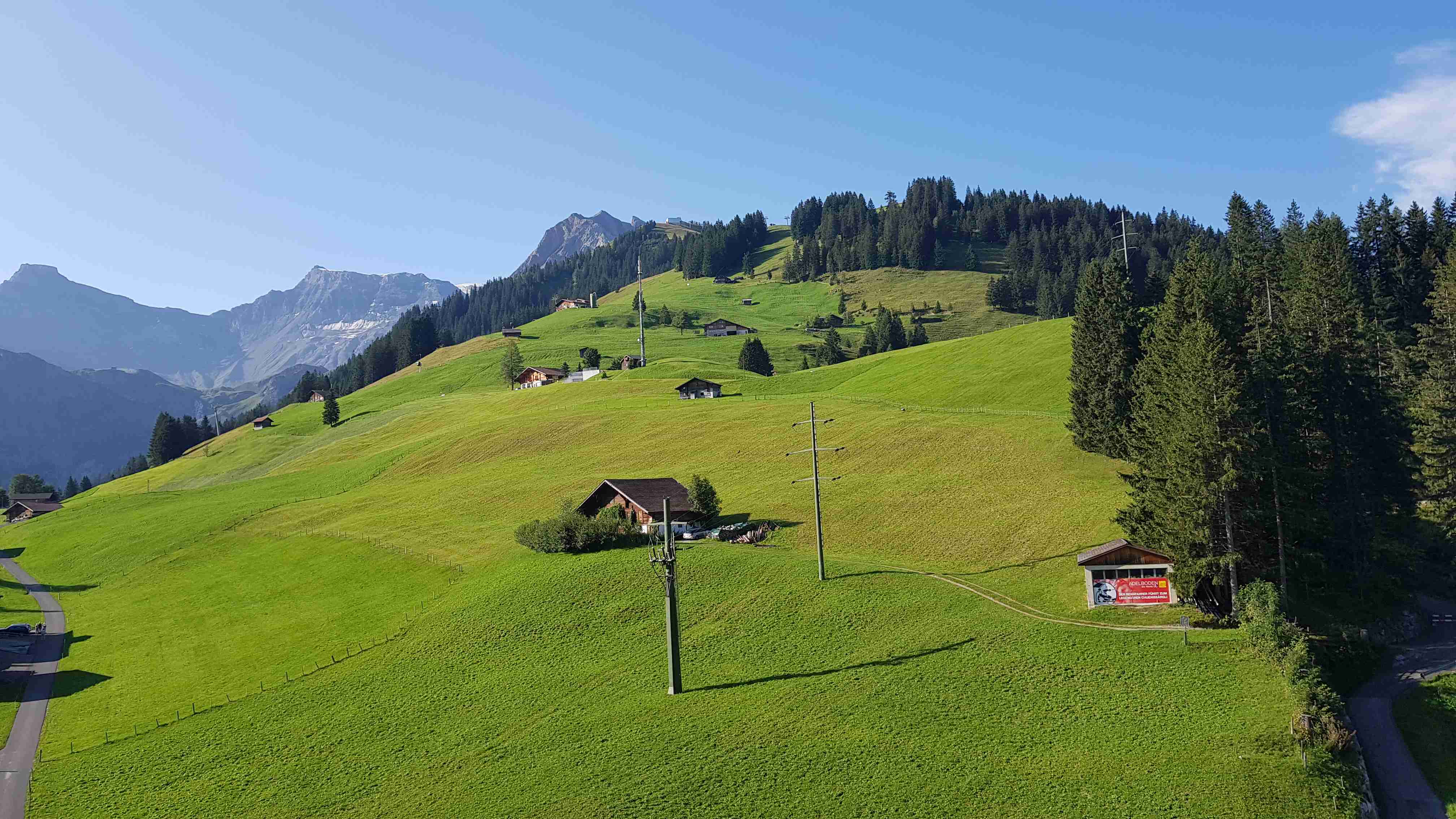 Dnešní den byl plánován bez kol jako turistický. Ráno jsme šli pěšky do města k horní stanici lanovky Dorfbahn a sjeli k dolní stanici lanovky Sillerebahn, kterou jsme vyjeli nahoru do Sillerenbühl do výšky 1974 m n.m. Odtud jsme pěšky vyrazili květinovou stezkou vedoucí po hřebeni a úbočí do cca 6 km vzdáleného sedla Hahnenmoos. Tady jsme po krátkém občerstvení vyfasovali koloběžky a sjížděli zpět dolů do Adelbodenu, kde jsme opětovně u horní stanice Dorfbahn odevzdali koloběžky i helmy a vydali se pěšky na ubytování. Po cestě nás zastihl déšť, ale dorazili jsme do Alpenflory ještě, než začalo bouřit a spustil se opravdový liják. Na mapce je dnešní trasa vyobrazena modrou barvou, bod A je horní stanice Sillerenbühl, tam jsme dojeli lanovkami z Adelbodenu. Do bodu B (Hahnenmoospass) jsme šli pěšky a odtud pak do bodu C na koloběžce zpět do Adelbodenu.