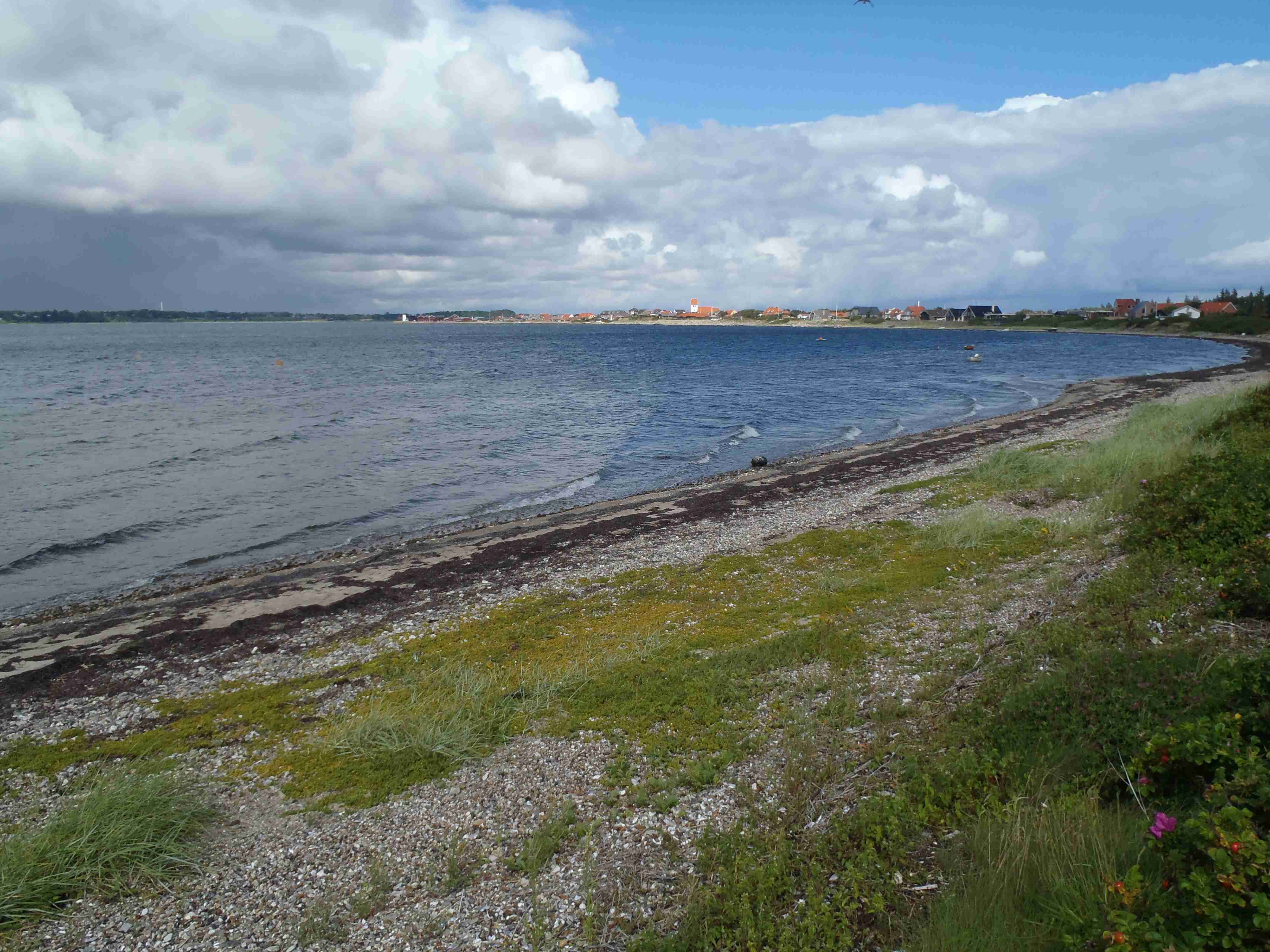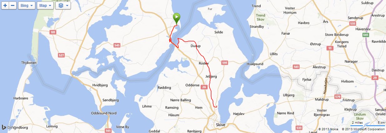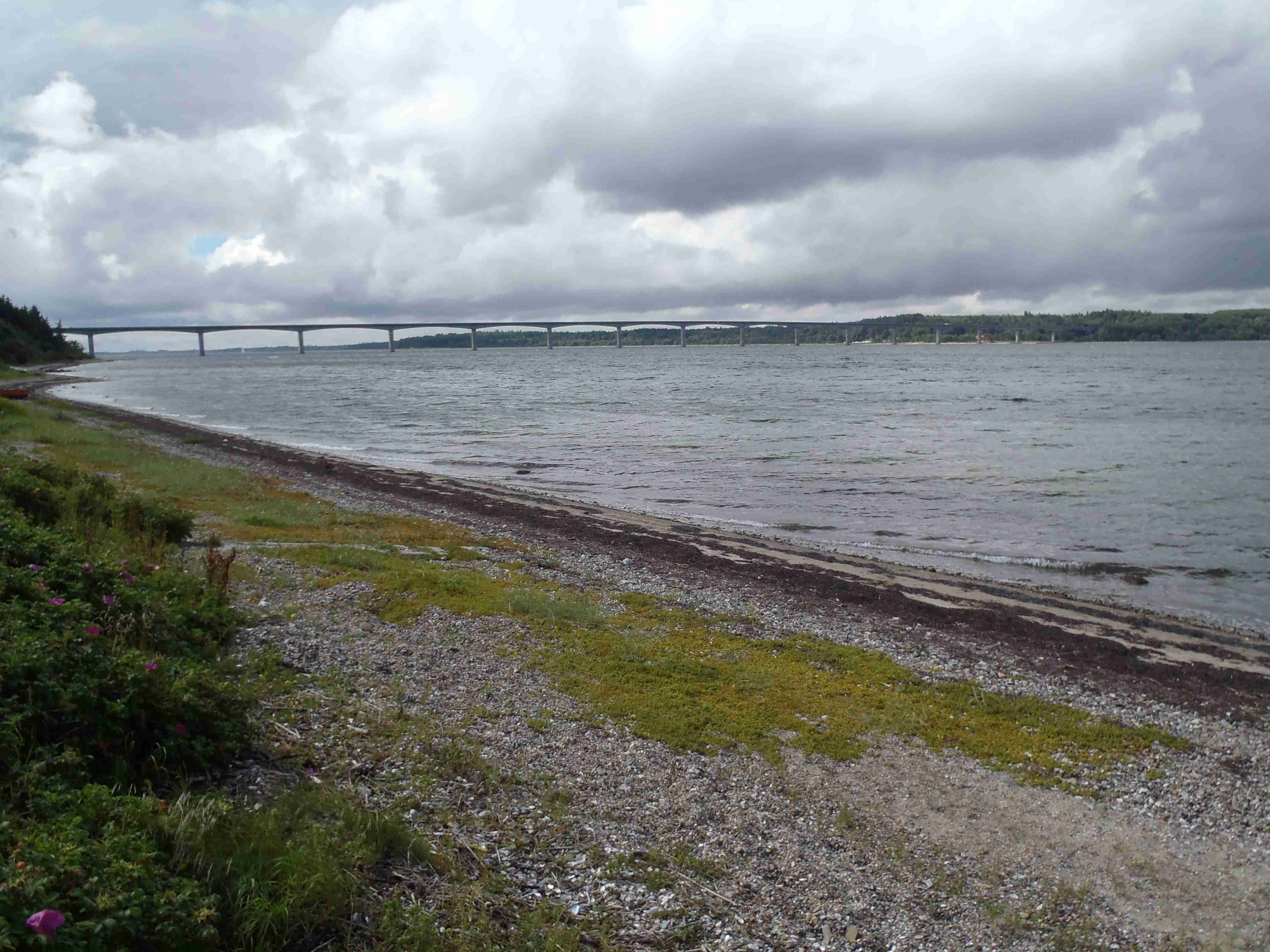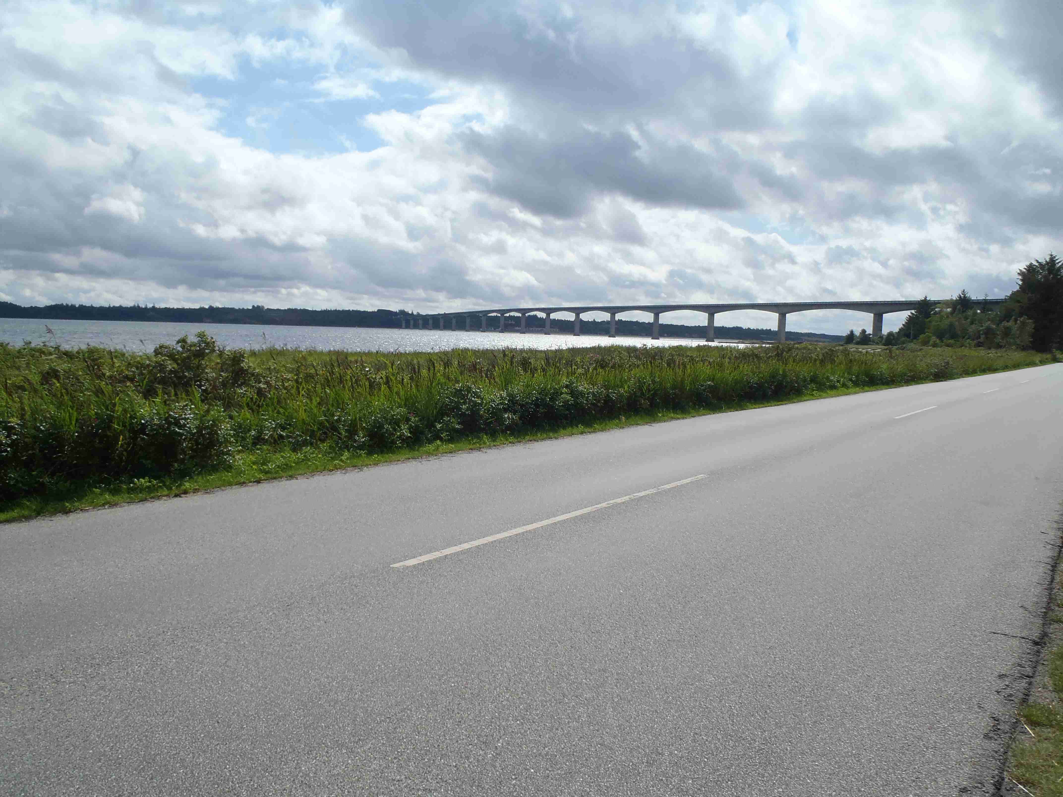 Ráno nás čekalo deštivé probuzení, lilo jako z konve a nepřestalo ani během snídaně a tak jsme v dešti balili stany. Nic příjemného, ale co naděláte. Bleskově sbaleno, a nasedat do busu. Vyrazili jsme směrem od západního pobřeží na jihovýchod, do vnitrozemí. Díky dešti došlo k upravení programu, busem jsme jeli kousek dál, než bychom jeli za pěkného počasí. Vyložil nás až v městečku Nykobing, které leží na ostrově Morse, jenž se nachází uvnitř fjordu Limfjorden. Naštěstí při dojezdu do Nykobingu přestalo pršet a tak jsme se chvíli pocourali městečkem, dali pivo a kafe a vyrazili. Někteří navštívili botanickou zahradu a od ní jeli opět busem do kempu, my jsme volili kolo a bez zahrady. Kousek za Nykobing jsme přejeli po mostě spojujícím ostrov Morse s pevninou, chvíli jsme bloudili, než jsme našli nájezd na most, který byl poměrně vysoký, dlouhý a dost to na něm foukalo. Na druhé straně mostu jsme to vzali doleva na Glyngore, kde jsme si nakoupili něco k jídlu (šunku a pečivo) a snědli jsme to o kousek dál na lavičce na břehu fjordu. Počasí nic moc, ale hlavně, že nepršelo. V Glyngore cyklostezka najela na trasu bývalé železnice, takže žádná prudká klesání či stoupání. Minuli jsme městečka Durup, Roslev, Jebjerg. Kousek za Lyby jsme měli odbočit doleva na náš kemp, ale nějak jsme to přejeli. Zjistili jsme to okamžitě, neboť jsem cestu dle mapy kontroloval na každé křižovatce; našel jsem tedy náhradní cestu a skutečně jsme po pár kilometrech dorazili do Skive Fjord Camping. Kemp byl na kopečku, měli jsme sociálky hned u nosu, ale nějak tam nefungovalo u některých zamykání. Jinak v pohodě. Najeto cca 40 km.