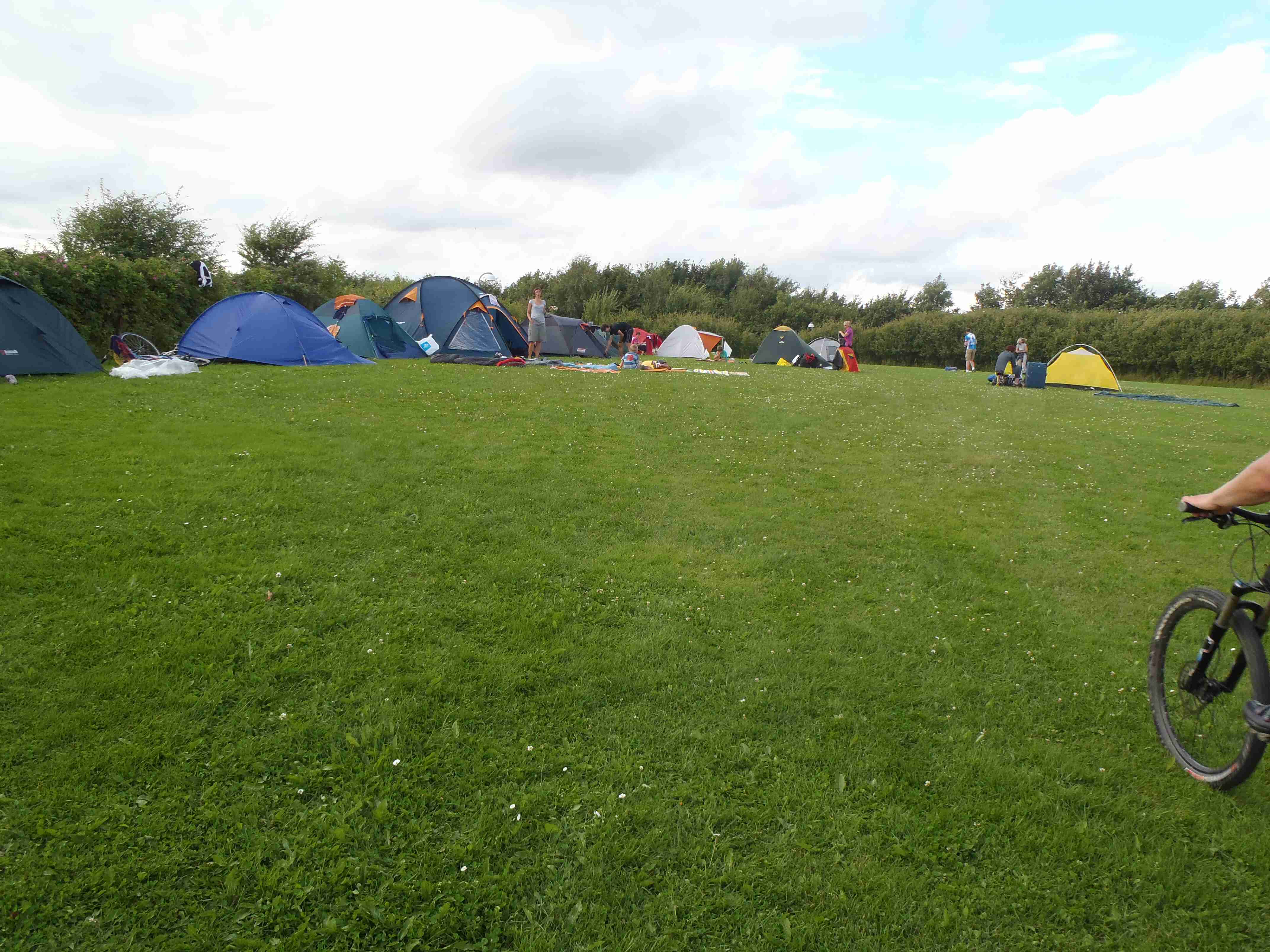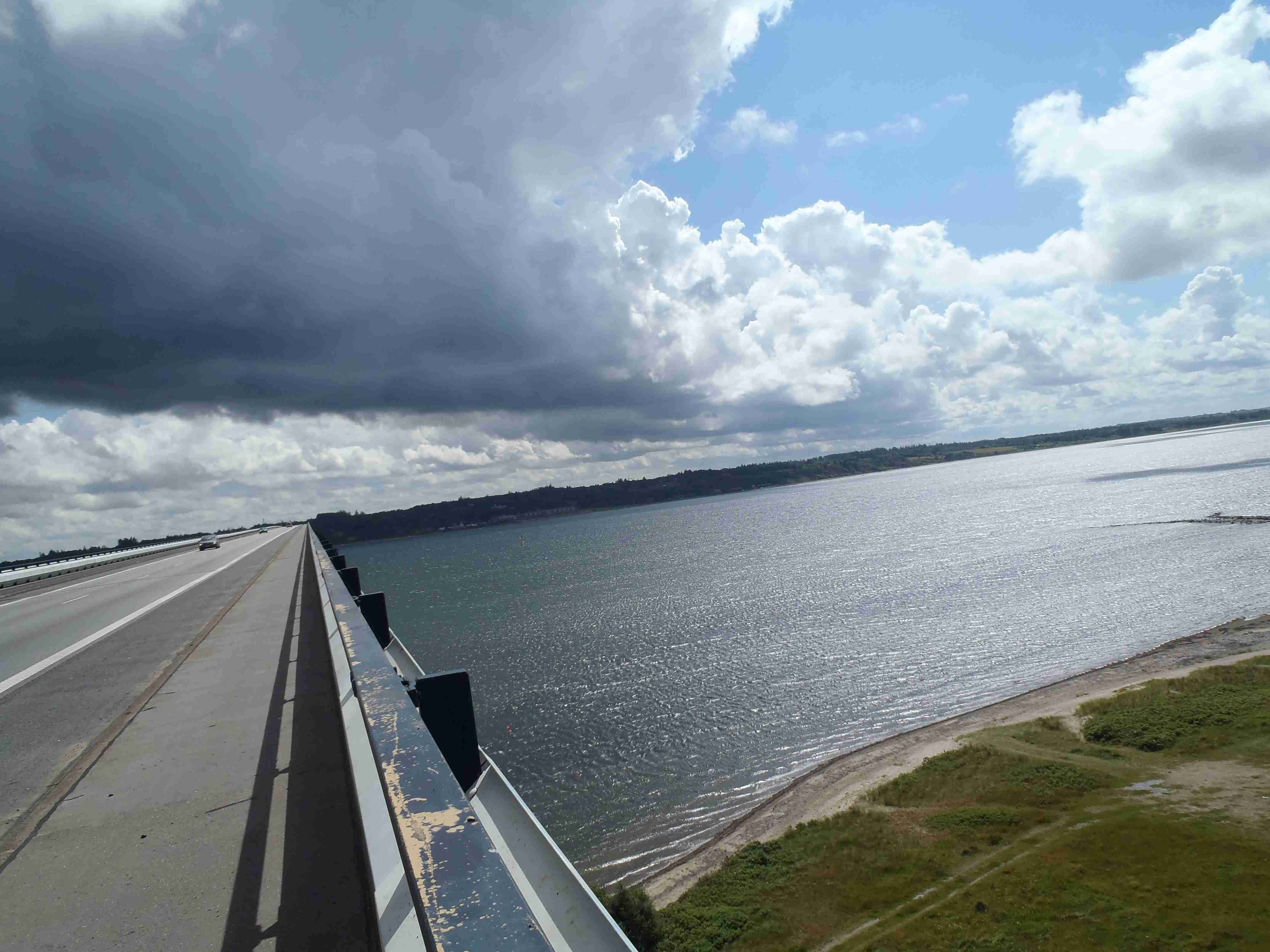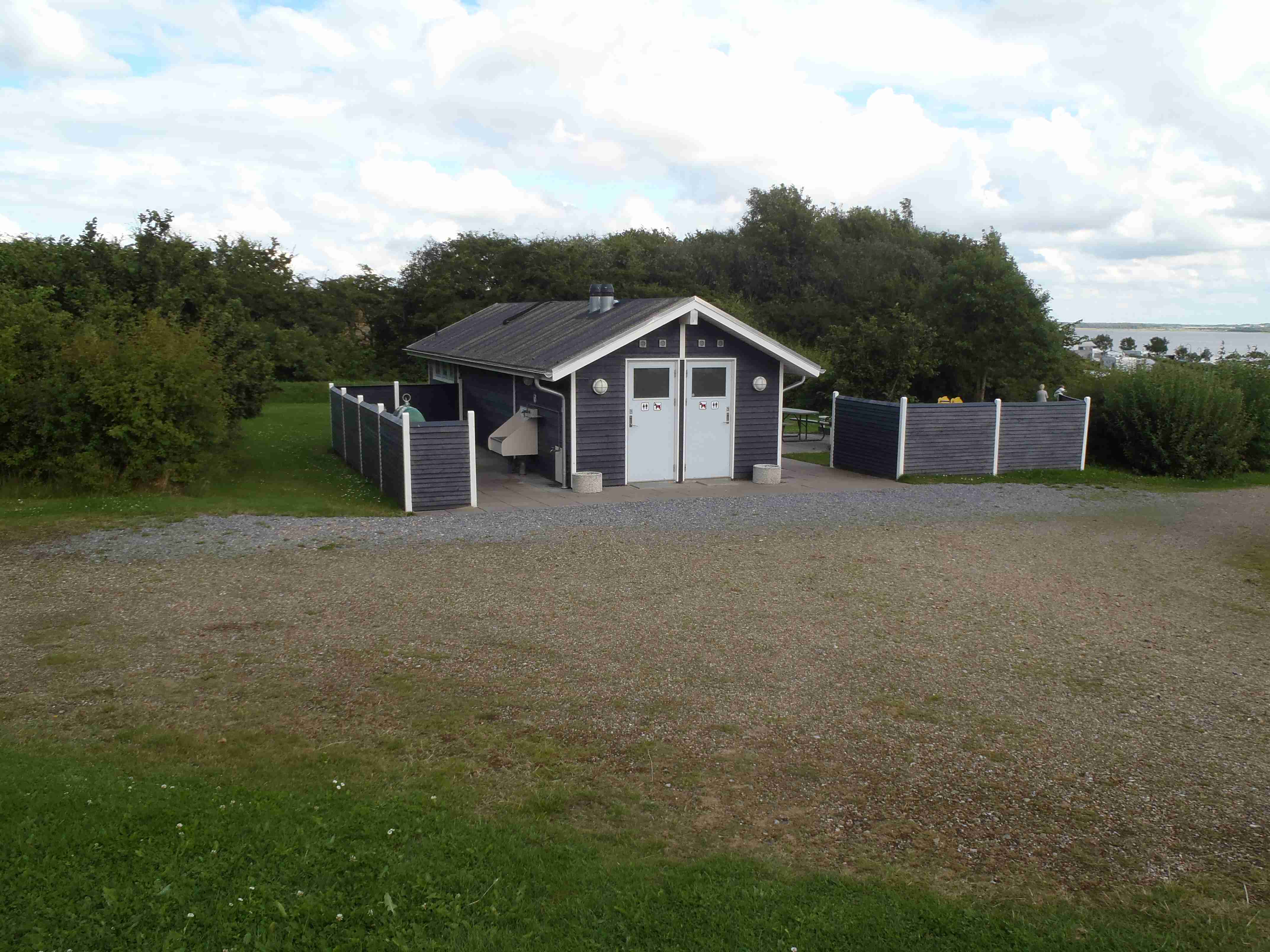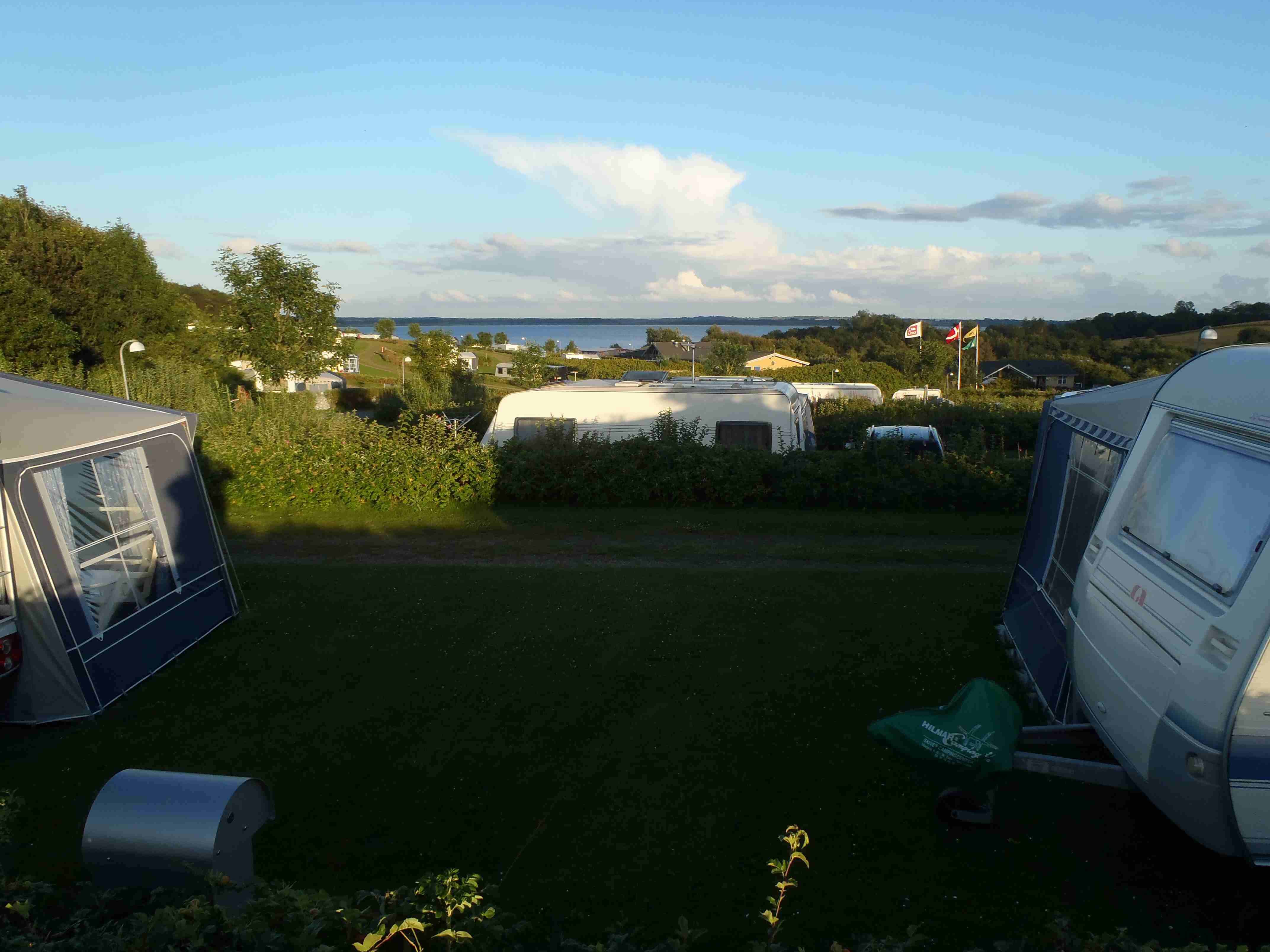 Ráno nás čekalo deštivé probuzení, lilo jako z konve a nepřestalo ani během snídaně a tak jsme v dešti balili stany. Nic příjemného, ale co naděláte. Bleskově sbaleno, a nasedat do busu. Vyrazili jsme směrem od západního pobřeží na jihovýchod, do vnitrozemí. Díky dešti došlo k upravení programu, busem jsme jeli kousek dál, než bychom jeli za pěkného počasí. Vyložil nás až v městečku Nykobing, které leží na ostrově Morse, jenž se nachází uvnitř fjordu Limfjorden. Naštěstí při dojezdu do Nykobingu přestalo pršet a tak jsme se chvíli pocourali městečkem, dali pivo a kafe a vyrazili. Někteří navštívili botanickou zahradu a od ní jeli opět busem do kempu, my jsme volili kolo a bez zahrady. Kousek za Nykobing jsme přejeli po mostě spojujícím ostrov Morse s pevninou, chvíli jsme bloudili, než jsme našli nájezd na most, který byl poměrně vysoký, dlouhý a dost to na něm foukalo. Na druhé straně mostu jsme to vzali doleva na Glyngore, kde jsme si nakoupili něco k jídlu (šunku a pečivo) a snědli jsme to o kousek dál na lavičce na břehu fjordu. Počasí nic moc, ale hlavně, že nepršelo. V Glyngore cyklostezka najela na trasu bývalé železnice, takže žádná prudká klesání či stoupání. Minuli jsme městečka Durup, Roslev, Jebjerg. Kousek za Lyby jsme měli odbočit doleva na náš kemp, ale nějak jsme to přejeli. Zjistili jsme to okamžitě, neboť jsem cestu dle mapy kontroloval na každé křižovatce; našel jsem tedy náhradní cestu a skutečně jsme po pár kilometrech dorazili do Skive Fjord Camping. Kemp byl na kopečku, měli jsme sociálky hned u nosu, ale nějak tam nefungovalo u některých zamykání. Jinak v pohodě. Najeto cca 40 km.