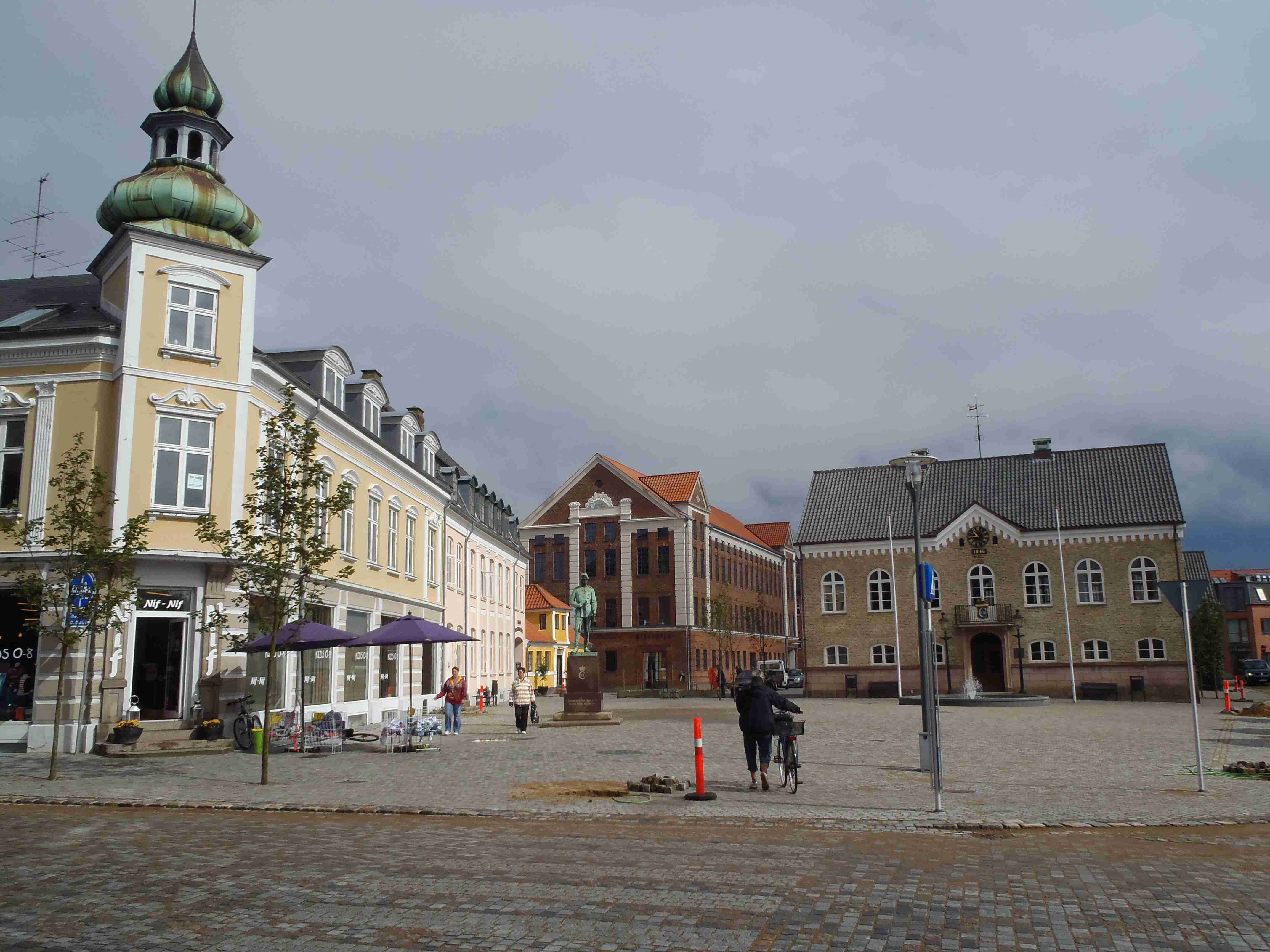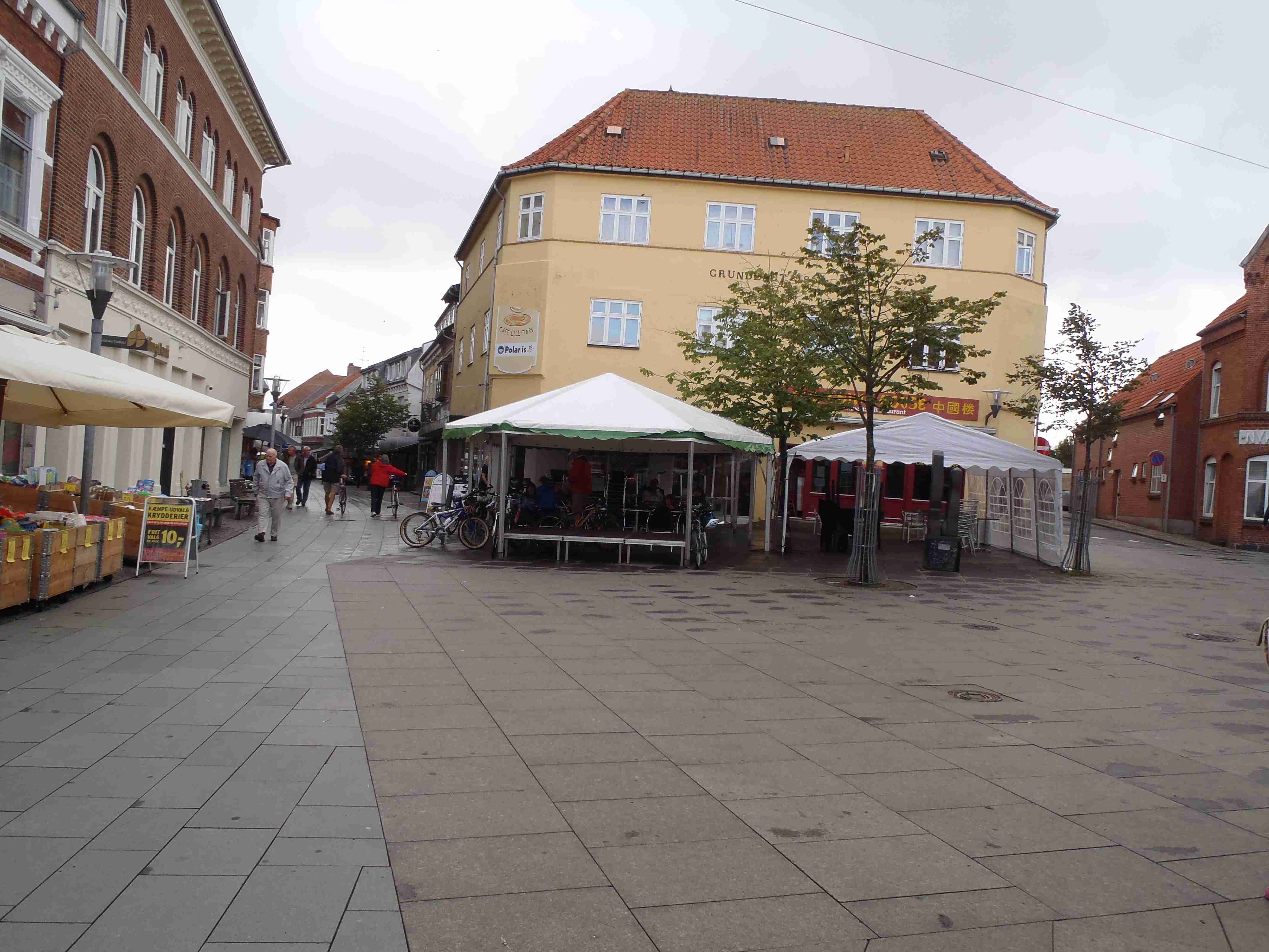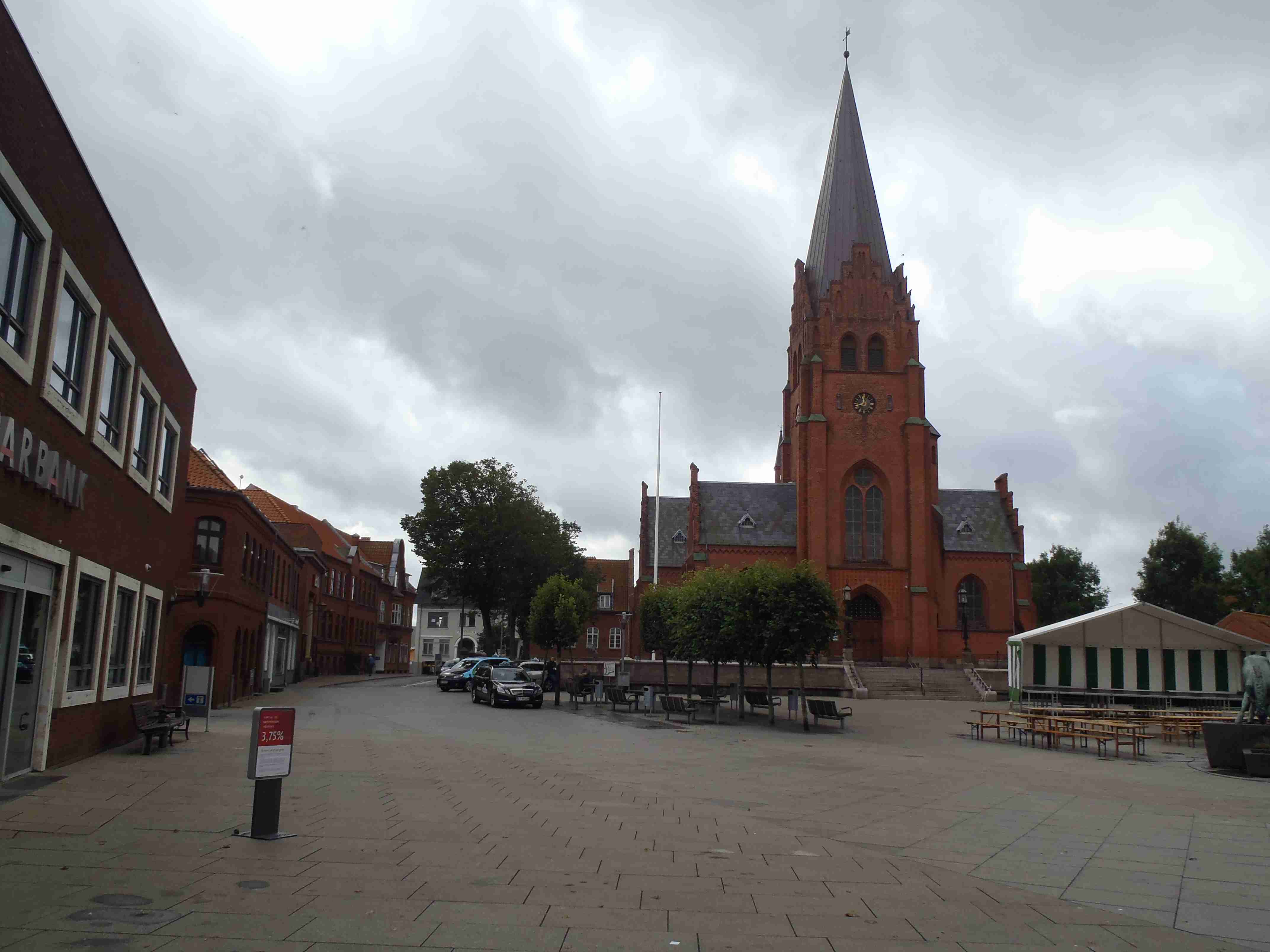 Ráno nás čekalo deštivé probuzení, lilo jako z konve a nepřestalo ani během snídaně a tak jsme v dešti balili stany. Nic příjemného, ale co naděláte. Bleskově sbaleno, a nasedat do busu. Vyrazili jsme směrem od západního pobřeží na jihovýchod, do vnitrozemí. Díky dešti došlo k upravení programu, busem jsme jeli kousek dál, než bychom jeli za pěkného počasí. Vyložil nás až v městečku Nykobing, které leží na ostrově Morse, jenž se nachází uvnitř fjordu Limfjorden. Naštěstí při dojezdu do Nykobingu přestalo pršet a tak jsme se chvíli pocourali městečkem, dali pivo a kafe a vyrazili. Někteří navštívili botanickou zahradu a od ní jeli opět busem do kempu, my jsme volili kolo a bez zahrady. Kousek za Nykobing jsme přejeli po mostě spojujícím ostrov Morse s pevninou, chvíli jsme bloudili, než jsme našli nájezd na most, který byl poměrně vysoký, dlouhý a dost to na něm foukalo. Na druhé straně mostu jsme to vzali doleva na Glyngore, kde jsme si nakoupili něco k jídlu (šunku a pečivo) a snědli jsme to o kousek dál na lavičce na břehu fjordu. Počasí nic moc, ale hlavně, že nepršelo. V Glyngore cyklostezka najela na trasu bývalé železnice, takže žádná prudká klesání či stoupání. Minuli jsme městečka Durup, Roslev, Jebjerg. Kousek za Lyby jsme měli odbočit doleva na náš kemp, ale nějak jsme to přejeli. Zjistili jsme to okamžitě, neboť jsem cestu dle mapy kontroloval na každé křižovatce; našel jsem tedy náhradní cestu a skutečně jsme po pár kilometrech dorazili do Skive Fjord Camping. Kemp byl na kopečku, měli jsme sociálky hned u nosu, ale nějak tam nefungovalo u některých zamykání. Jinak v pohodě. Najeto cca 40 km.