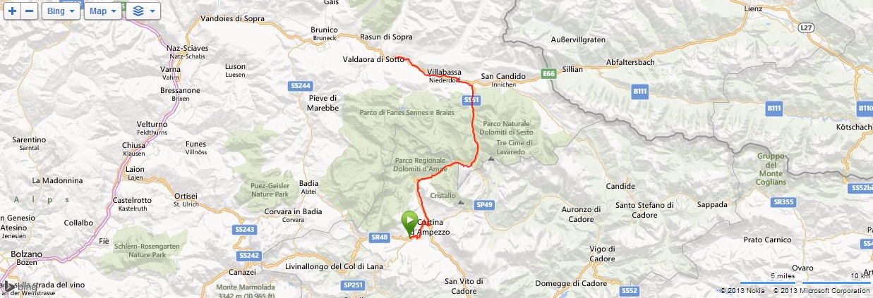 Snídaně v 7:30, odjezd v 8:30 směr Cortina d’Ampezzo. Cesta byla zpočátku stejná jako včera a to až k obci Schluderbach, kde jsme tentokrát odbočili doprava na Cortinu, kterou jsme pouze projeli a pokračovali jsme dále na Passo Falzarego, kde byl cíl dnešní cesty. Lanovkou jsme vyjeli nahoru na Rifugio Lagazuoi, zdatnější jedinci vystoupali nahoru štolou, která je památkou na těžké boje během 1. světové války, jež v této oblasti probíhaly. Nahoře jsme sledovali stavební práce za pomoci vrtulníku a hlavně jsme udělali spoustu fotek, protože výhled byl úžasný. Když jsme se dost nakochali, sjeli jsme zpět dolů a vyčkali jsme odjezdu autobusu, Bohužel, někteří značně přetáhli čas předpokládaného odjezdu, čekali jsme skoro hodinu. Část zájezdu jela již odtud na kole (zase jenom prudké sjezdy), část nás se vrátila autobusem kousek nad Cortinu na kopec Pocol, kde jsme sundali zbytek kol a pokračovali dál již na kolech. Sjeli jsme dolů do Cortiny, chvilku jsme pocourali centrem, u autobusového nádraží si Iva dala k jídlu nějakou bagetu a já mezitím našel cyklostezku E1 vedoucí až z Calalzo di Cadore přes Cortinu nahoru do Passo Cimabanche, což bylo nejvyšší místo na trase vzdálené cca 15 km od Cortiny. Jeli jsme opět po trase bývalé železnice, takže stoupání nebylo až tak prudké. Před třetí jsme vyrazili na cestu a kolem čtvrté jsme dorazili do sedla, chvilku jsme zastavili na pár fotek a pak jsme pokračovali dál, do Schluderbachu to bylo již kousek a pak to byla cesta stejná, jako včera. Autobus opět čekal u Dürrensee, tentokrát jsme si dali pivo a pak jsme frčeli dál. Na hotel jsme dorazili po 55 km kolem 18. hodiny a byli jsme rádi, že jsme to stihli, neboť začalo bouřit.