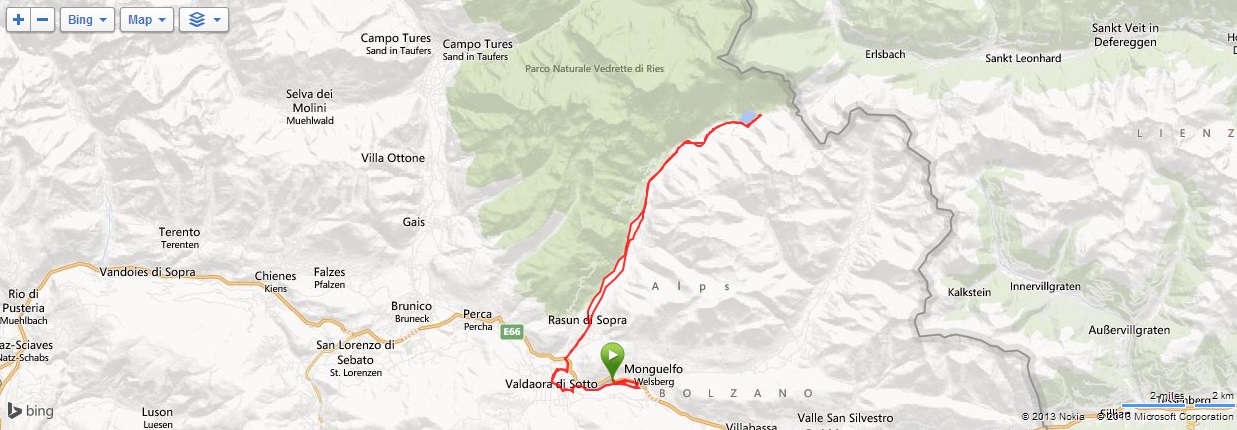 Tentokrát jsme na kole odjížděli po půl deváté přímo od hotelu a zamířili jsme na druhou stranu směrem na Bruneck. Než jsme však mohli jet kolem jezera na Olang, museli jsme opět na kruhový objezd ve směru na Toblach, protože pouze tady se dalo najet na cyklostezku vedoucí podíl jezera do Olangu. Prokličkovali jsme Olangem (Valdaora), podjeli jsme hlavní silnici E66 vedoucí z Brunecku do Toblachu a zamířili jsme na sever. Cestou pořád do kopečka jsme projeli všemi částmi městečka Rassen, za kterým byla pro cyklisty určena cesta podél potoka v polích. Ve chvíli, kdy jsme před Antholz sjeli na místní komunikaci procházející vesnicí, začalo nechutné stoupání až k místu, kde se silnička napojovala na hlavní silnici. Následoval Střední a Horní Antholz, kde to ještě šlo, ale po opuštění obce se silnice šplhala pěkně do kopce a zdolával jsem ji s velkými obtížemi po velice krátkých úsecích. Iva bohužel celou cestu tlačila, bylo to asi 6 km, celkově jsme na cca 12 km vystoupali 600 m. Když jsem dorazil ke Sporthotelu Wildgall měl jsem vyhráno – k jezeru Antholz zbývalo pár kilometrů po rovině. Než přišla Iva, podařilo se mi vniknout do hotelu a načepovat si vodu, která mi již došla. Byl to docela záhul. Iva dorazila na pokraji vyčerpání, ale podařilo se mi jí umluvit, že jezero a tudíž i náš cíl je již na dohled, což byla také pravda. Jezero jsme objeli na druhý konec a v Seerestaurantu na břehu jezera jsem si dal salát a pivo, Iva pouze kafe. Po půlhodinové pauze jsme krátce po půl třetí vyrazili na zpáteční cestu, ale ještě na silnici kolem jezera začalo pršet, chvíli jsme se schovávali po můstkem vedoucím přes silnici, a když se nám zdálo, že déšť ustává, pokračovali jsme dál. Samozřejmě, že se rozpršelo poměrně vydatně, ale jeli jsme dolů z kopce tak jsme nezastavovali. Ani se mi nechtělo věřit, že jsme takový kopec zdolali! Po hlavní silnici jsme jeli až do Oberrasen, kde jsme se vrátili do původní trasy. Tady už bylo naprosto sucho, vůbec tu nepršelo! Pomalu jsme zpětně prokličkovali Olangy a podél jezera jsme před půl pátou dorazili do hotelu. Najeto jsme měli 60 km, ale bylo toho dost.