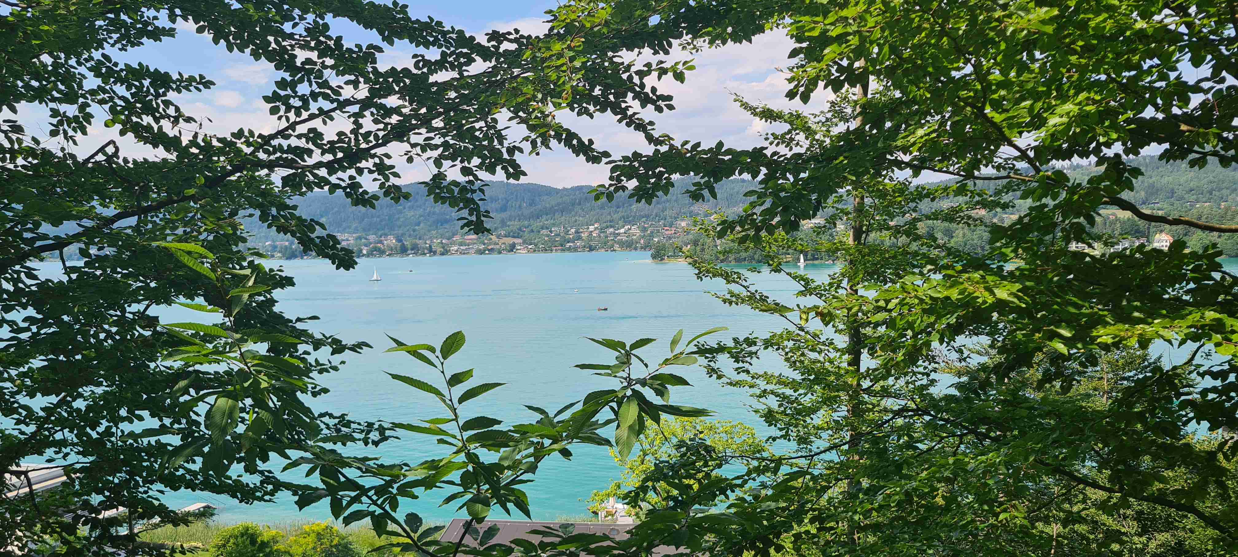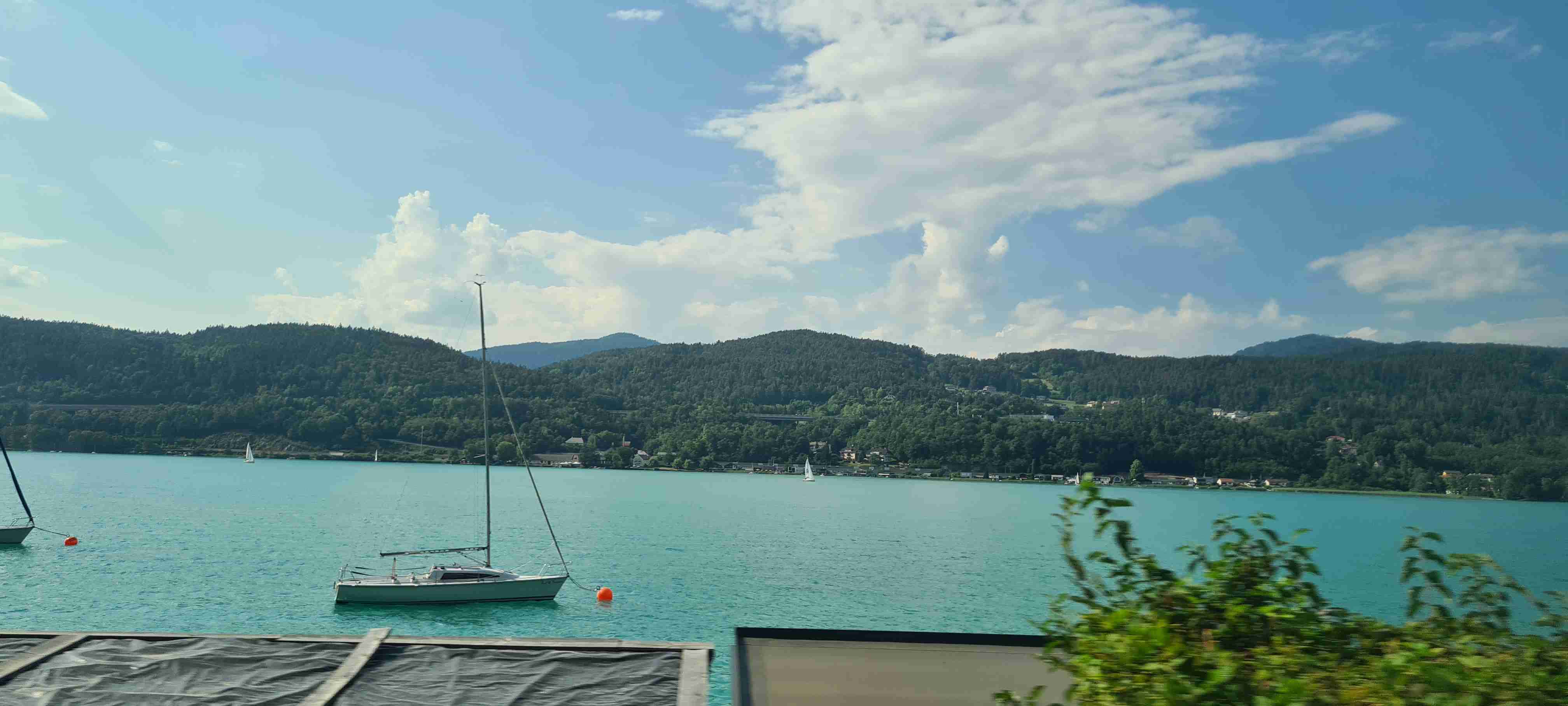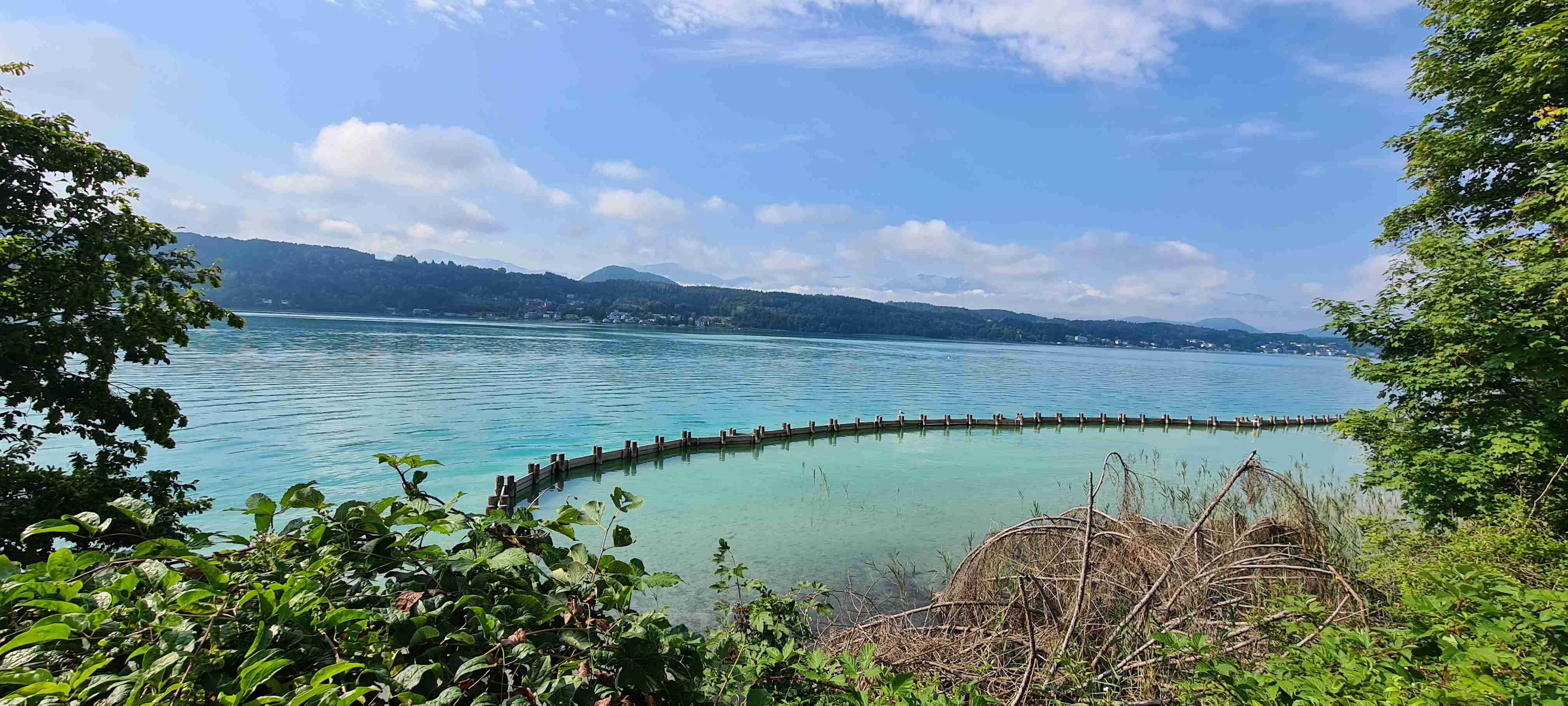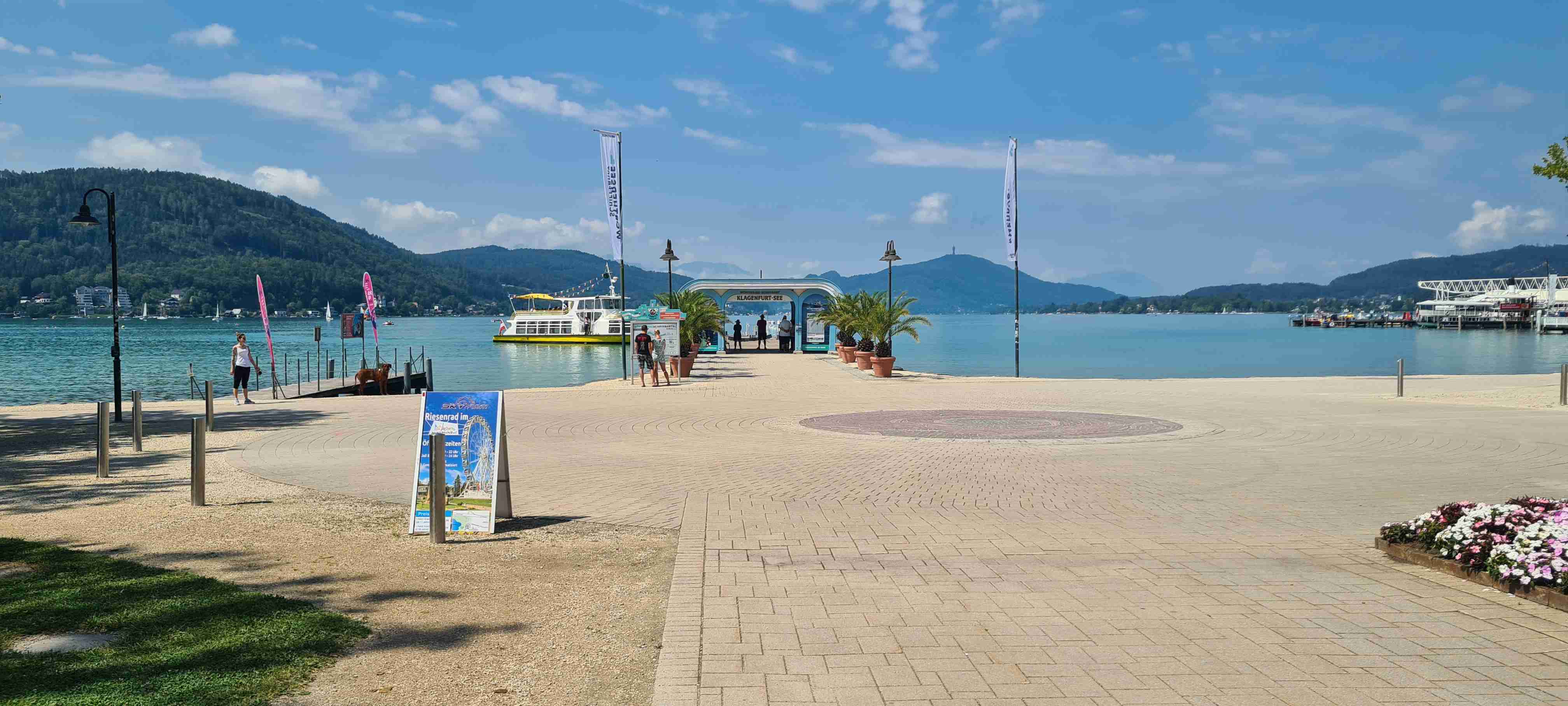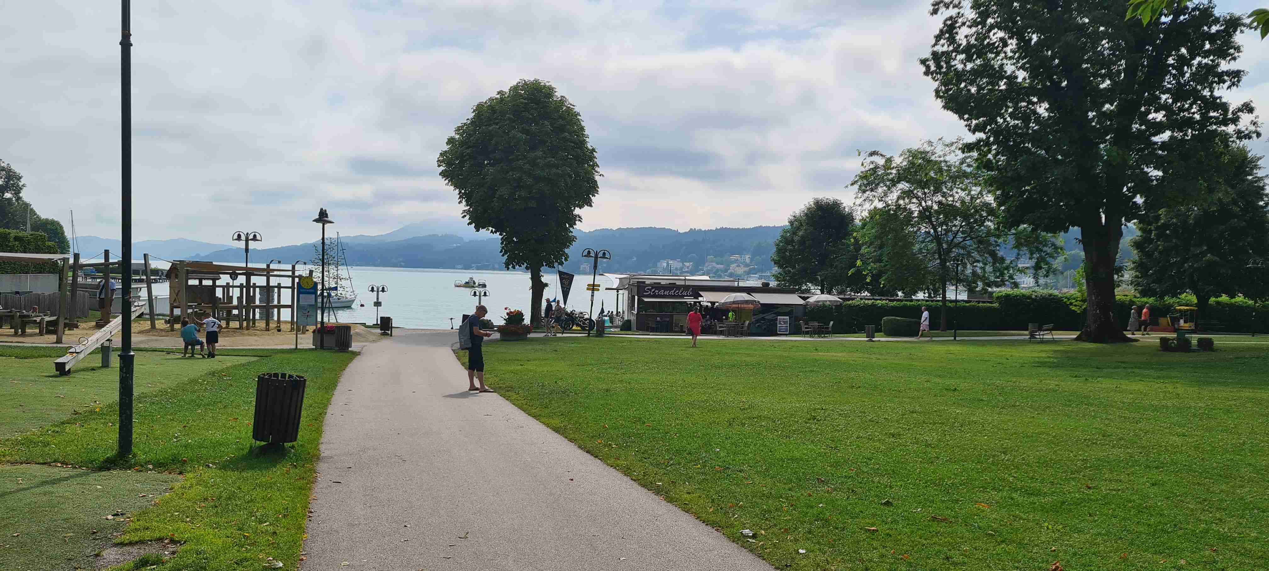 Ráno jsme od hotelu zamířili opět k Wörthersee, tentokrát na druhou stranu, jako včera – abychom se vyhnuli tunelu Karavanka vzali jsme to přes italské Tarvisio, je to jen o pár km delší, ale jistota je jistota. A tak jsme po necelé hodině jízdy dorazili do městečka Velden am Wörthersee na západním okraji jezera, kde nás autobus vyložil u haly a krytého kluziště. Nasedli jsme na kola a jali se jezero objíždět po severním břehu. Koupači měli tentokrát problém, břehy jezera byly buď zastavěny domy, hotely anebo tam byly placené plovárny, a tak najít volný přístup k vodě byl problém. Nás to ale netrápilo, a tak jsme v poklidu dojeli na druhý konec jezera do Klagenfurtu. Tady, po focení v přístavišti výletních lodí, začala Ivě blbnout na kole elektrika tak jsme se trochu zdrželi. Když se to uklidnilo, vyrazili jsme parkem do centra, minuli jsme areál Minimundus, kde je cca 150 zmenšenin významných světových staveb v měřítku 1:25 a alejí podél kanálu jsme dojeli až téměř do samotného centra. Na Novém náměstí jsme zase řešili problémy s elektrikou a po vyřešení jsme si dali zasloužené pivečko v jedné z přilehlých kaváren. Po odpočinku jsme se podél kanálu vrátili zpět k jezeru, kterého jsme se pouze dotkli a hned jsme zamířili do kopečků nad jižním břehem jezera. Nachází se tam několik meších jezer, která jsme minuli a až u toho posledního a největšího, Keutschacher See, jsme opět na lavičce v klidném stinném háji poobědvali stále stejnou českou sekanou, kousek chleba a teplou vodu. Tady odbočím, většinou nic moc v poledne nejíme, protože jak snídaně, tak i večeře jsou natolik výživné, že ještě obědvat v restauraci, tak se vrátíme o 10 kg těžší. Navíc v tom horku není ani chuť k jídlu, tak to řešíme tou sekanou, ta hodně vydrží.