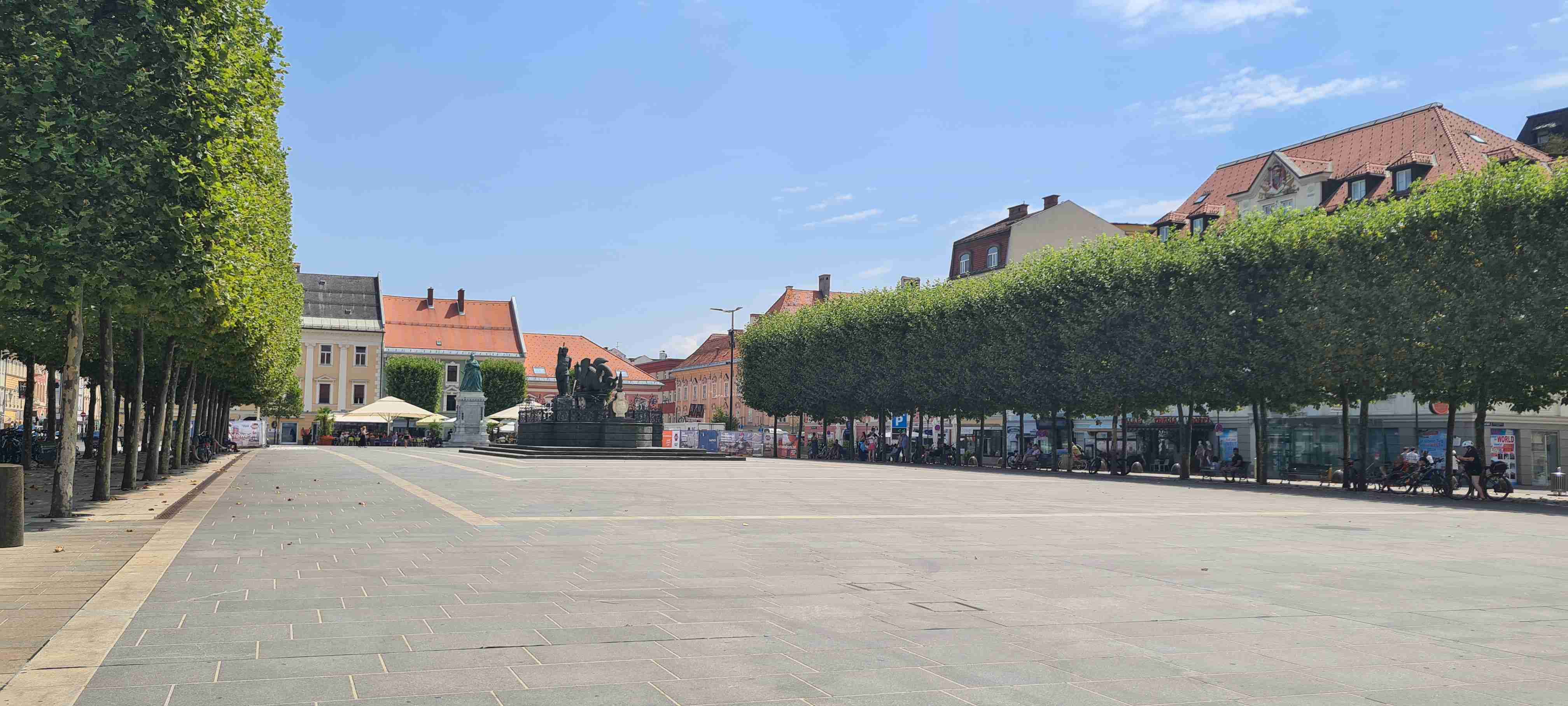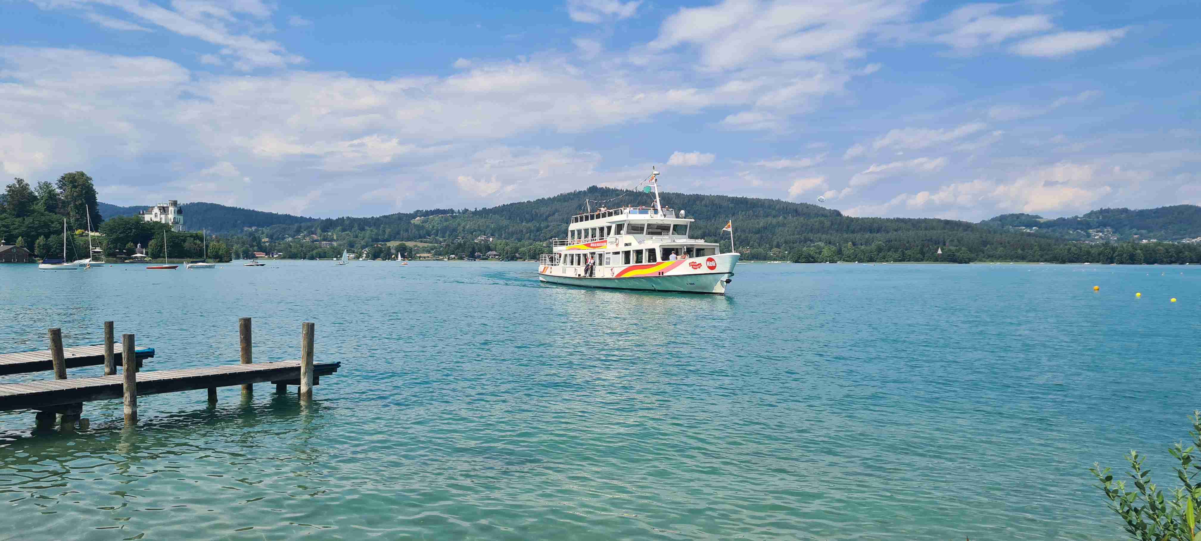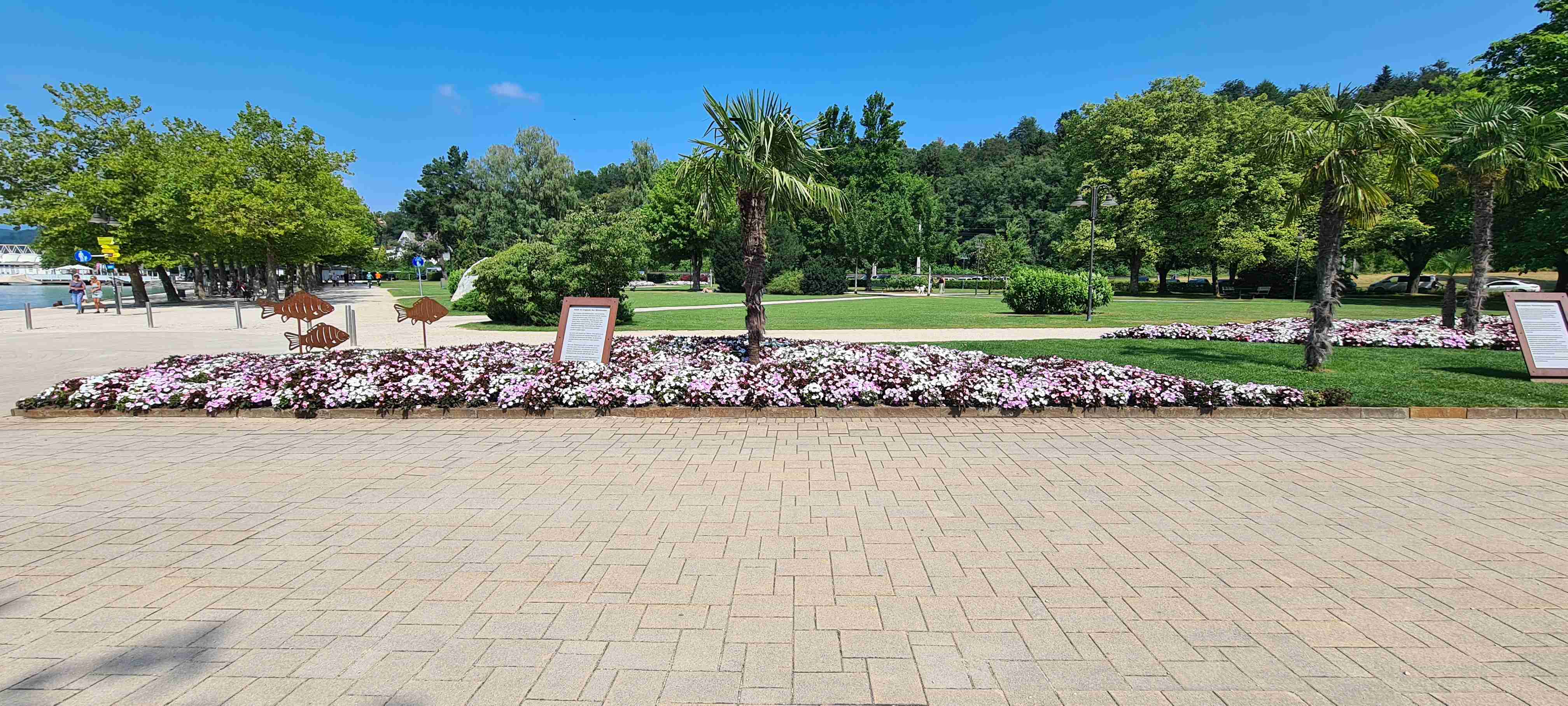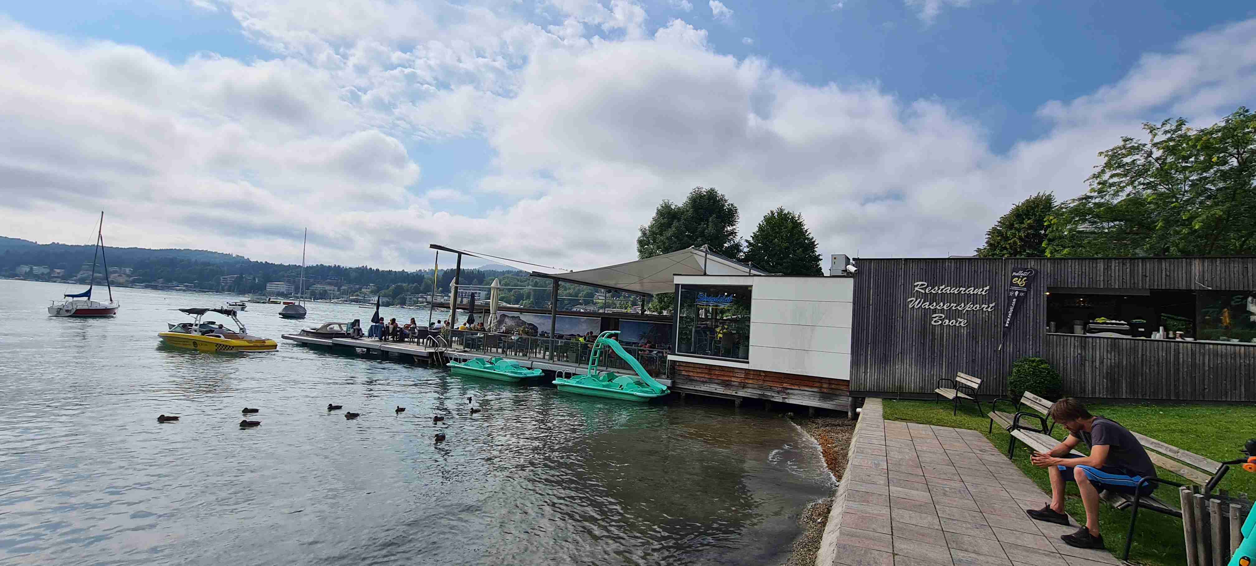 Ráno jsme od hotelu zamířili opět k Wörthersee, tentokrát na druhou stranu, jako včera – abychom se vyhnuli tunelu Karavanka vzali jsme to přes italské Tarvisio, je to jen o pár km delší, ale jistota je jistota. A tak jsme po necelé hodině jízdy dorazili do městečka Velden am Wörthersee na západním okraji jezera, kde nás autobus vyložil u haly a krytého kluziště. Nasedli jsme na kola a jali se jezero objíždět po severním břehu. Koupači měli tentokrát problém, břehy jezera byly buď zastavěny domy, hotely anebo tam byly placené plovárny, a tak najít volný přístup k vodě byl problém. Nás to ale netrápilo, a tak jsme v poklidu dojeli na druhý konec jezera do Klagenfurtu. Tady, po focení v přístavišti výletních lodí, začala Ivě blbnout na kole elektrika tak jsme se trochu zdrželi. Když se to uklidnilo, vyrazili jsme parkem do centra, minuli jsme areál Minimundus, kde je cca 150 zmenšenin významných světových staveb v měřítku 1:25 a alejí podél kanálu jsme dojeli až téměř do samotného centra. Na Novém náměstí jsme zase řešili problémy s elektrikou a po vyřešení jsme si dali zasloužené pivečko v jedné z přilehlých kaváren. Po odpočinku jsme se podél kanálu vrátili zpět k jezeru, kterého jsme se pouze dotkli a hned jsme zamířili do kopečků nad jižním břehem jezera. Nachází se tam několik meších jezer, která jsme minuli a až u toho posledního a největšího, Keutschacher See, jsme opět na lavičce v klidném stinném háji poobědvali stále stejnou českou sekanou, kousek chleba a teplou vodu. Tady odbočím, většinou nic moc v poledne nejíme, protože jak snídaně, tak i večeře jsou natolik výživné, že ještě obědvat v restauraci, tak se vrátíme o 10 kg těžší. Navíc v tom horku není ani chuť k jídlu, tak to řešíme tou sekanou, ta hodně vydrží.