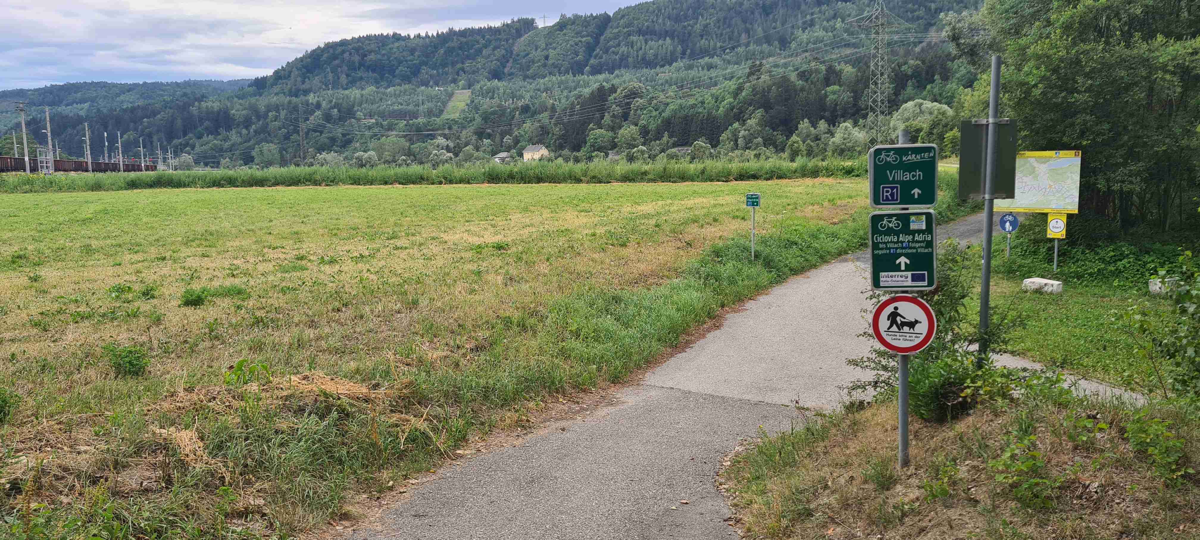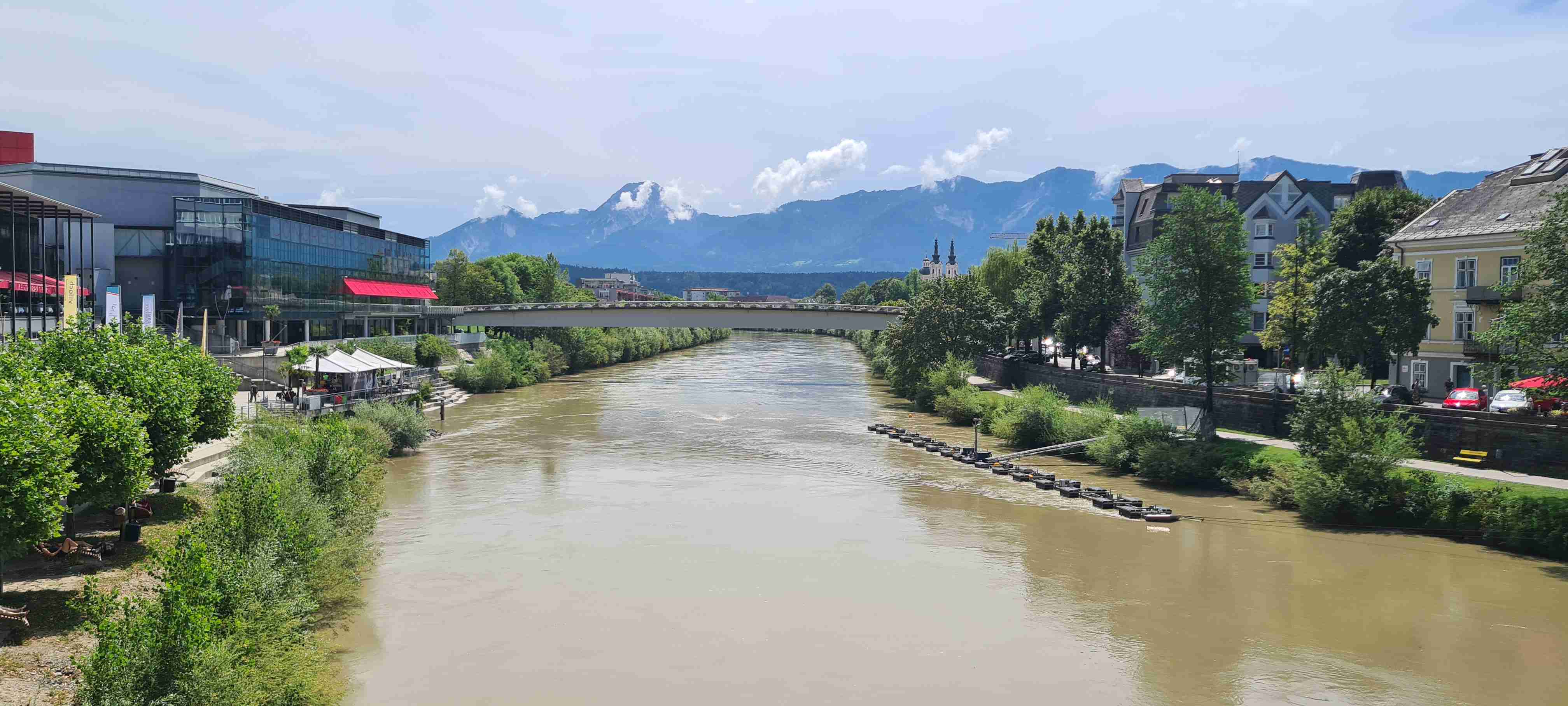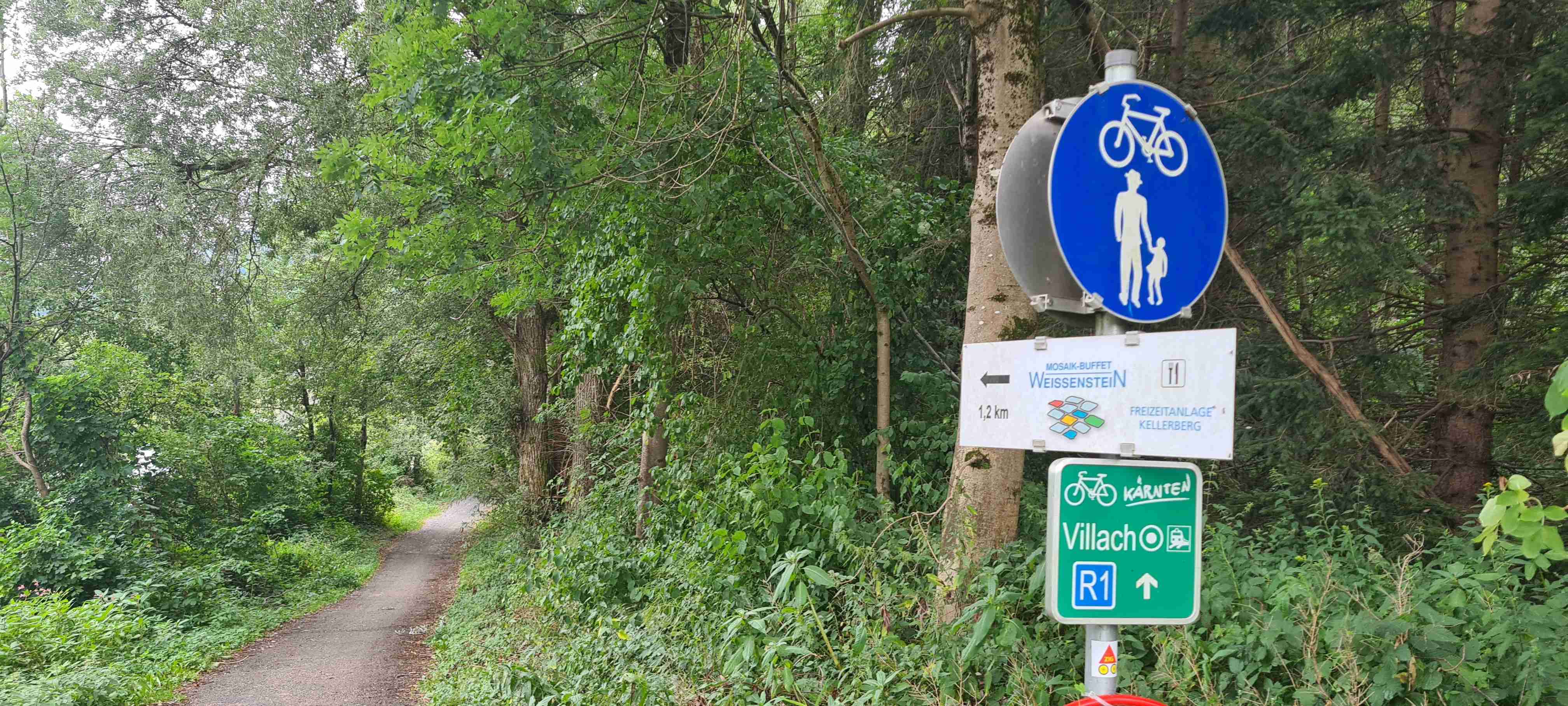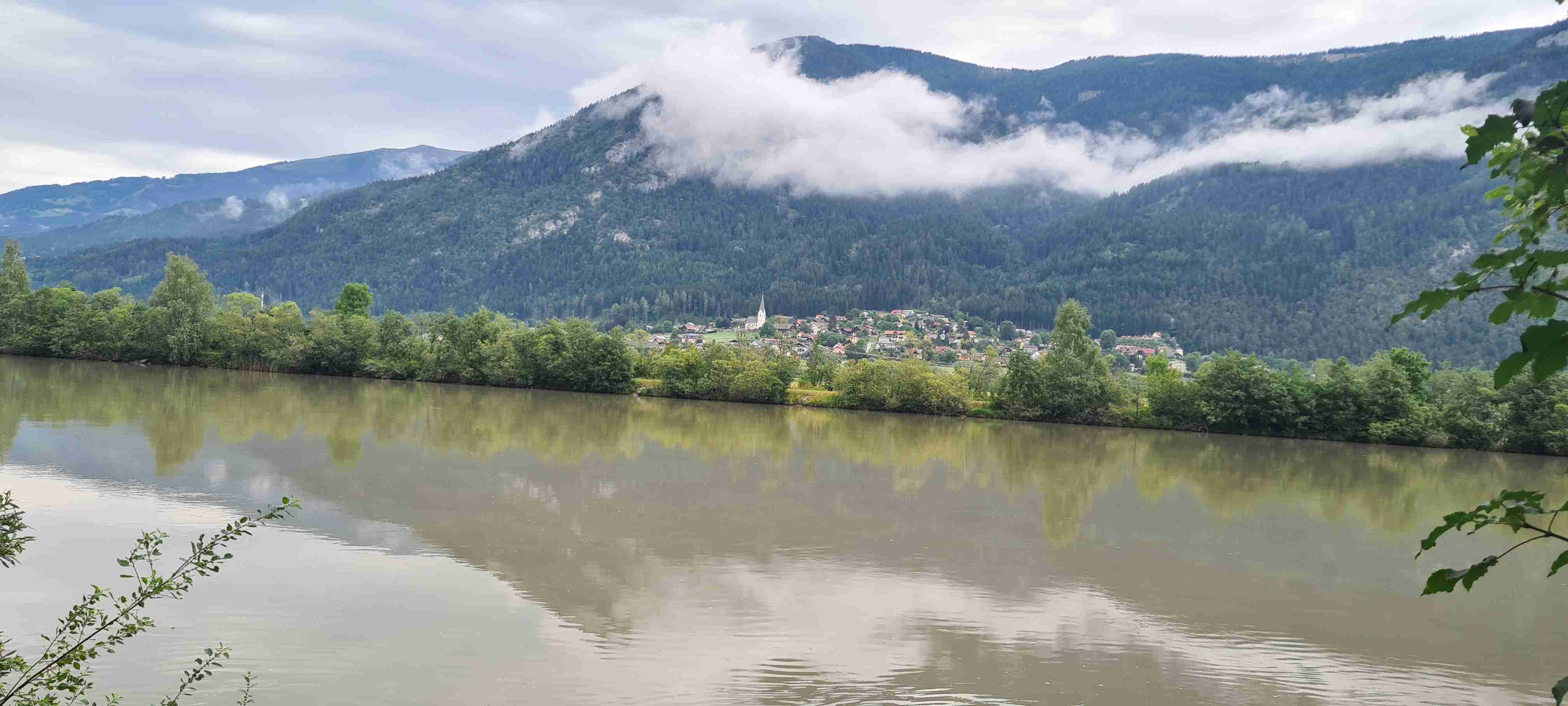 Nás poslední den měl být chladný a deštivý a dopoledne tomu vše nasvědčovalo. Začínali jsme tam, kde jsme skočili hned první den- v obci Paternion, kousek od řeky Drávy. Sjeli jsme k řece na cyklostezku a po ní jsme jeli až do Villachu. Cestou začalo i krápat, ale to rychle ustalo, a i mraky se roztrhaly a slunce se vrátilo ke svému standardu uplynulých dní. Na začátku Villachu měl být na parkovišti autobus, ale ještě tam nebyl, tak jsme i s panem vedoucím na něj počkali, dali si u řidiče pivo a vyrazili jsme na náš poslední úsek. Zajeli jsme přes most do centra Villachu, všude byla spousta lidí, tak pár obligátních fotek, vrátili jsme se na náš levý břeh a po cyklostezce jsme frčeli dál až do míst, kde byla odbočka k Wernbergskému koupališti z vybagrované pískovny, u kterého čekal autobus. Zajeli jsme k autobusu a ukončili cyklistiku po drávské cyklostezce, dnes najeto pohodových 37 km za přijatelného počasí. Já vzal plavky a ručník a šel se vykoupat, žádné vstupné se neplatilo, voda byla parádní, škoda, že bylo málo času, odjížděli jsme o dvě hodiny dříve než obvykle. Tak jsem se po návratu na hotel poprvé a naposledy vydal ještě do hotelového bazénu, ale tam se mi špatně dýchalo, asi vysoká vlhkost, odpoledne venku to bylo lepší. Vzal jsem si z pokoje župan, až později jsem zjistil, že se za jeho použití platí 5 €, tak jsem to před večeří raději hned srovnal, aby z toho nebyla ostuda. Člověk se má pořád co učit.