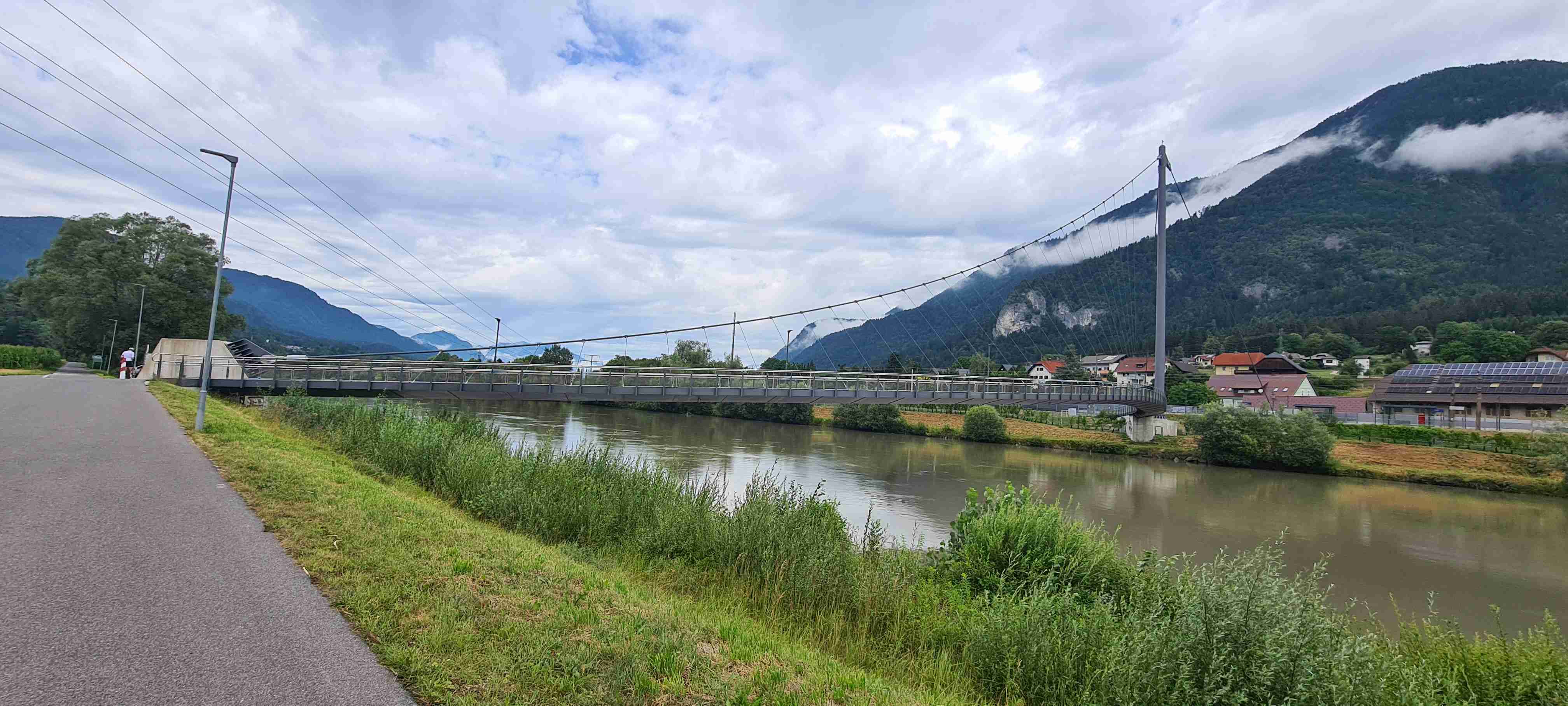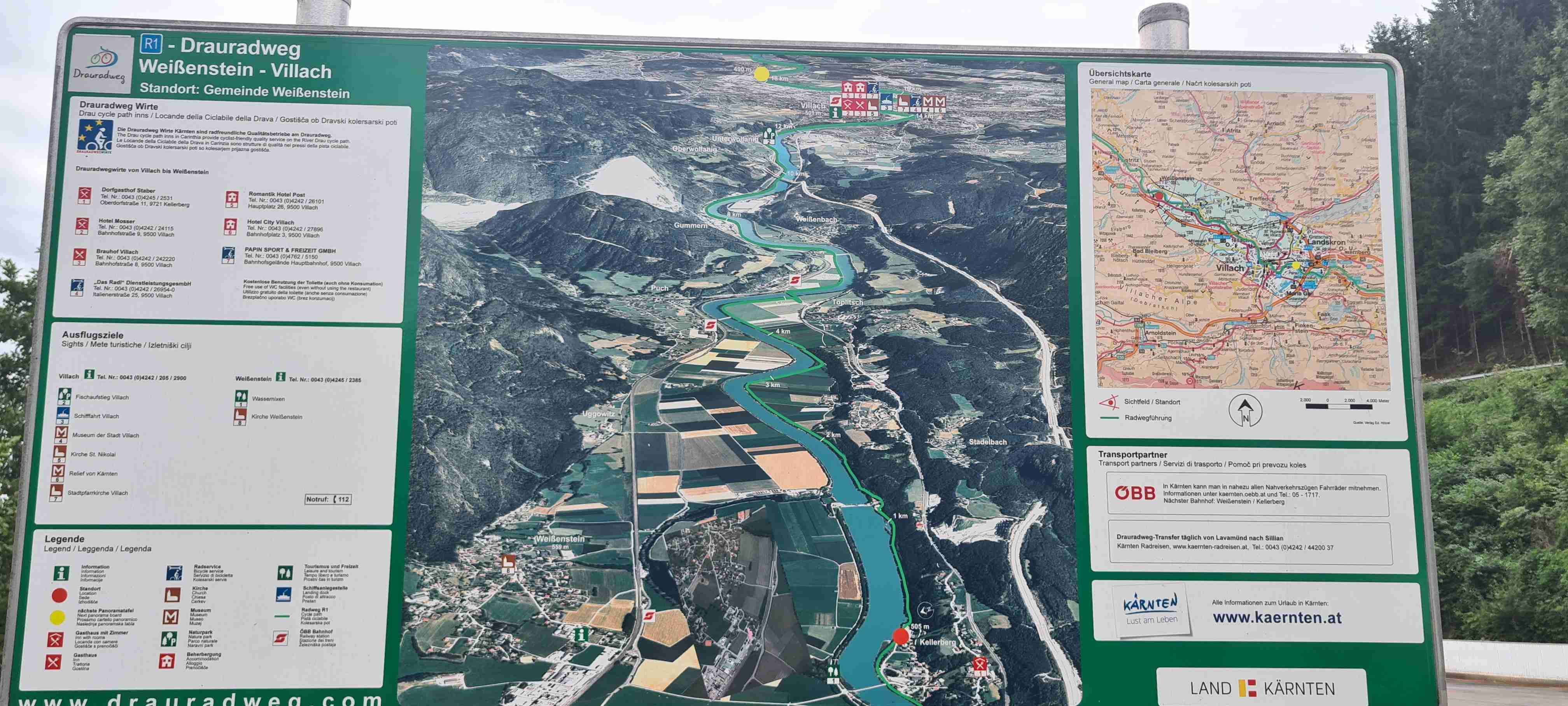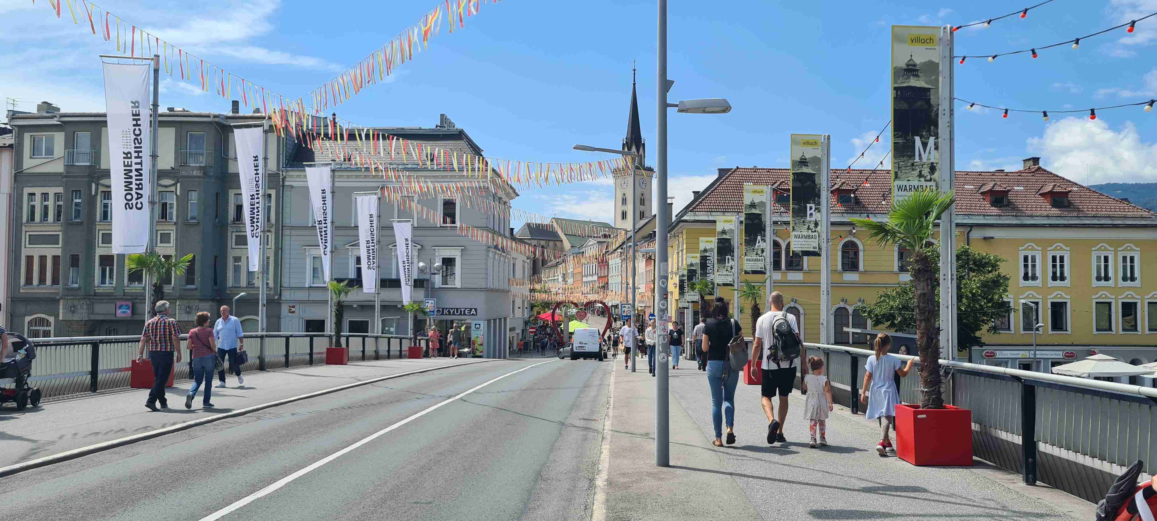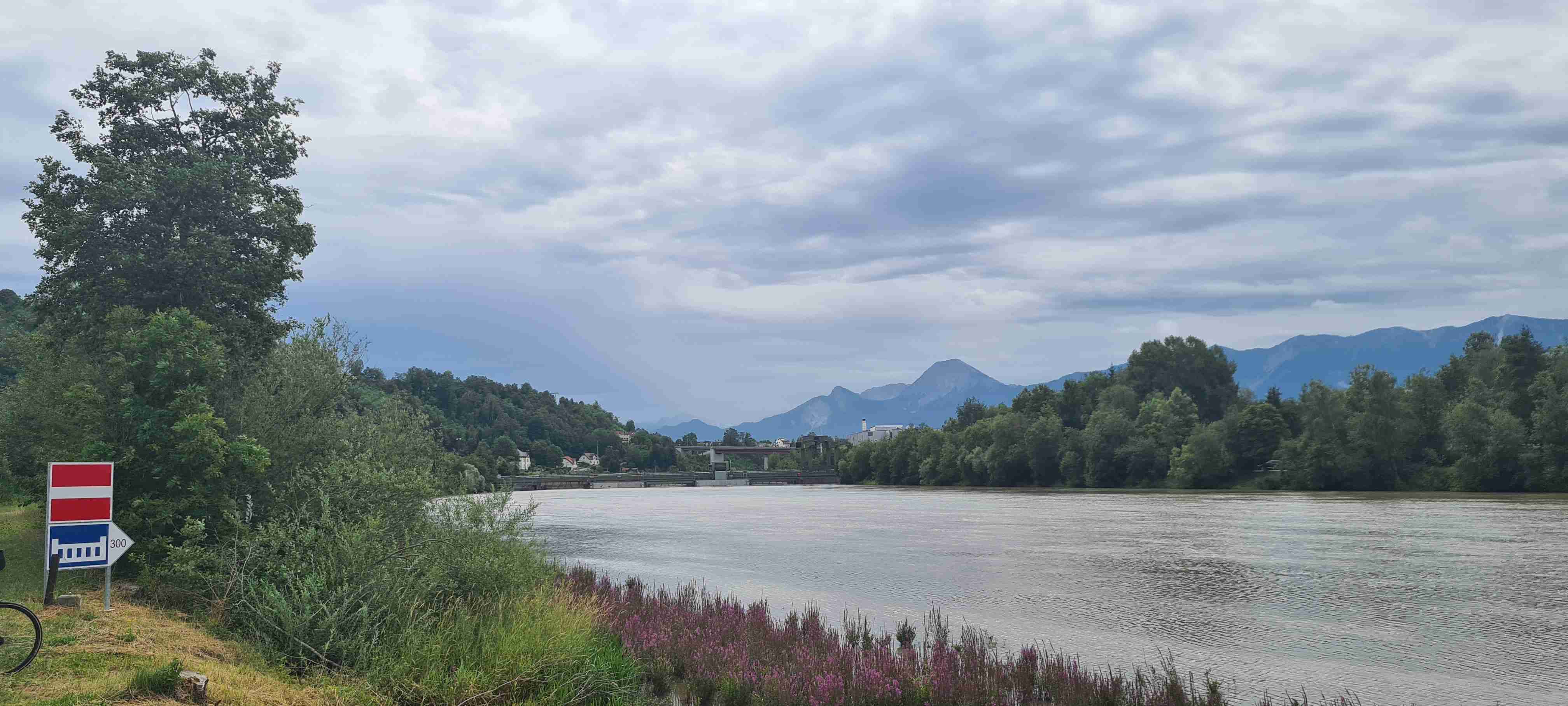 Nás poslední den měl být chladný a deštivý a dopoledne tomu vše nasvědčovalo. Začínali jsme tam, kde jsme skočili hned první den- v obci Paternion, kousek od řeky Drávy. Sjeli jsme k řece na cyklostezku a po ní jsme jeli až do Villachu. Cestou začalo i krápat, ale to rychle ustalo, a i mraky se roztrhaly a slunce se vrátilo ke svému standardu uplynulých dní. Na začátku Villachu měl být na parkovišti autobus, ale ještě tam nebyl, tak jsme i s panem vedoucím na něj počkali, dali si u řidiče pivo a vyrazili jsme na náš poslední úsek. Zajeli jsme přes most do centra Villachu, všude byla spousta lidí, tak pár obligátních fotek, vrátili jsme se na náš levý břeh a po cyklostezce jsme frčeli dál až do míst, kde byla odbočka k Wernbergskému koupališti z vybagrované pískovny, u kterého čekal autobus. Zajeli jsme k autobusu a ukončili cyklistiku po drávské cyklostezce, dnes najeto pohodových 37 km za přijatelného počasí. Já vzal plavky a ručník a šel se vykoupat, žádné vstupné se neplatilo, voda byla parádní, škoda, že bylo málo času, odjížděli jsme o dvě hodiny dříve než obvykle. Tak jsem se po návratu na hotel poprvé a naposledy vydal ještě do hotelového bazénu, ale tam se mi špatně dýchalo, asi vysoká vlhkost, odpoledne venku to bylo lepší. Vzal jsem si z pokoje župan, až později jsem zjistil, že se za jeho použití platí 5 €, tak jsem to před večeří raději hned srovnal, aby z toho nebyla ostuda. Člověk se má pořád co učit.