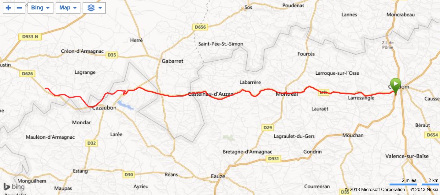 V noci několikrát a vydatně pršelo, poprvé mě vzbudil déšť ve 2:18 a podruhé v 5:30, ráno to však vypadalo nadějně a tak jsme již v 8:45 vyrazili na možná poslední etapu. Měli jsme tentokrát nějaký časový limit a tak jsme se nechtěli zdržovat. Jen co jsme opustili území města Condom, začaly kopce a zároveň i pršet. Šlapali jsme v dešti po D 15 nejkratší cestou do Montrealu, kde jsme si dopřáli v kavárně na náměstí pivo a kafe, ale žádné vysedávání a stále dál. Kopce byly pořádné, dlouhé, táhlé, a kolem 12:30 jsme dorazili do Barbotan-les-Thermes, lázeňského městečka. Čas jsme měli dobrý, do cíle mělo zbývat cca 12 km a tak jsme se rozhodli, že se naobědváme. Dali jsme si oba salát, každý jiný, oba dobré, ačkoliv toho bylo až dost. Mezitím každou chvilku lilo, než jsme odešli z restaurace, narazili jsme na Veroniku, které nás dovedla na cyklostezku. Byla to pravděpodobně bývalá železnice, která vedla převážně lesem, povrch byla šotolina a tráva se spoustou louží. Veronika již dávno zmizela vpředu a my pomalu ukrajovali poslední kilometry, když se spustil nebývale silný liják. Za chvilku jsem byl skrz na skrz i když jsme se snažili ukrýt pod stromy. Když déšť trochu polevil, vyrazili jsme dál, ale netrvalo dlouho a přišel druhý díl. Ale to jsme již viděli vlevo na kopci náš autobus a tak jsme k němu zamířili přes pole. Tady nám Veronika pomocí lahví omyla trochu kola, převlékli jsme se do suchého, já zjistil, že jsem v tom lijáku přišel o dioptrické cyklistické brýle, ale co naplat. Prohlédli jsme si kapli zasvěcenou paní Marii cyklistické, mezitím nám naložili kola a vyrazili jsme autobusem k Atlantiku. Cesta trvala skoro tři hodiny, v kempu u duny byl takový vichr, že většina nebyla schopna postavit stany na nám přidělených místech a postavila si je různě v závětří. Nám se to nějakým zázrakem povedlo, i když jsme kolíky zasouvali do písku a vítr nám je vytahoval. Když jsme dostavěli, pomáhali jsme ještě ostatním v nejbližším okolí, potom studená večeře a kolem 22. hodiny spát. Měli jsme v nohách 50 km, ale nastoupáno přes 800 m. Ach jo, ty kopce.
