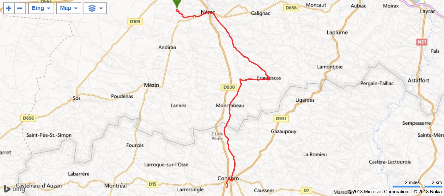 Pršelo ještě i během snídaně a tak jsme jedli pod oním přístřeškem z večera, ještě mokré stany jsme sbalili a kolem 9. hodiny jsme již byli na cestě. Ještě, než jsme vyrazili, tak jsem si za porady Veroniky upravil výšku sedla, trochu to pomohlo, ale přesto kopce zůstávají mojí noční můrou. Z lanového centra jsme nejprve zamířili na Nérac, kterým jsme pouze projeli, udělali pár fotek a pokračovali dál pořád nahoru-dolů. Zastavili jsme se až ve Francescas, kde jsme si v hospůdce na náměstí dali pivo a kafe a za chvíli se k nám připojilo i několik našich kolegů. Pokračovali jsme na Lassere a kousek před najetí na hlavní jsme odbočili doleva a jeli souběžně s hlavní silnicí po klidných silničkách. Do našeho cíle, města Condom, jsme dorazili kolem 13. hodiny a protože jsme měli dost času do srazu u katedrály, dali jsme si poprvé za celou dobu oběd. Já nějaký steak, Iva konfitovanou kachnu, ta se pak stala standardem pro spoustu ostatních účastníků až již v poledne či večer. S chutí jsme se najedli a na půl třetí jsme vyrazili ke katedrále, kde byl sraz. Odtud jsme společně jeli kousek do palírny Armagnacu, kde jsme absolvovali prohlídku a na závěr jsme dostali i ochutnat. Pro své synky jsem zakoupil po jednom Armagnacu, na mne již nezbylo v batohu místo. Po prohlídce jsme kousek projeli městem, hned za mostem jsme sjeli pod most a podél řeku jsme za chvilku dorazili do kempu. Najeto necelých 40 km, nastoupáno zhruba 400 m. Postavit stan, hygiena, v 18:30 briefing a poté většina odjela na večeři do města, my jsme rychle jeli do nedalekého Carefouru dokoupit zásoby a najedli jsme se až potom v kempu.