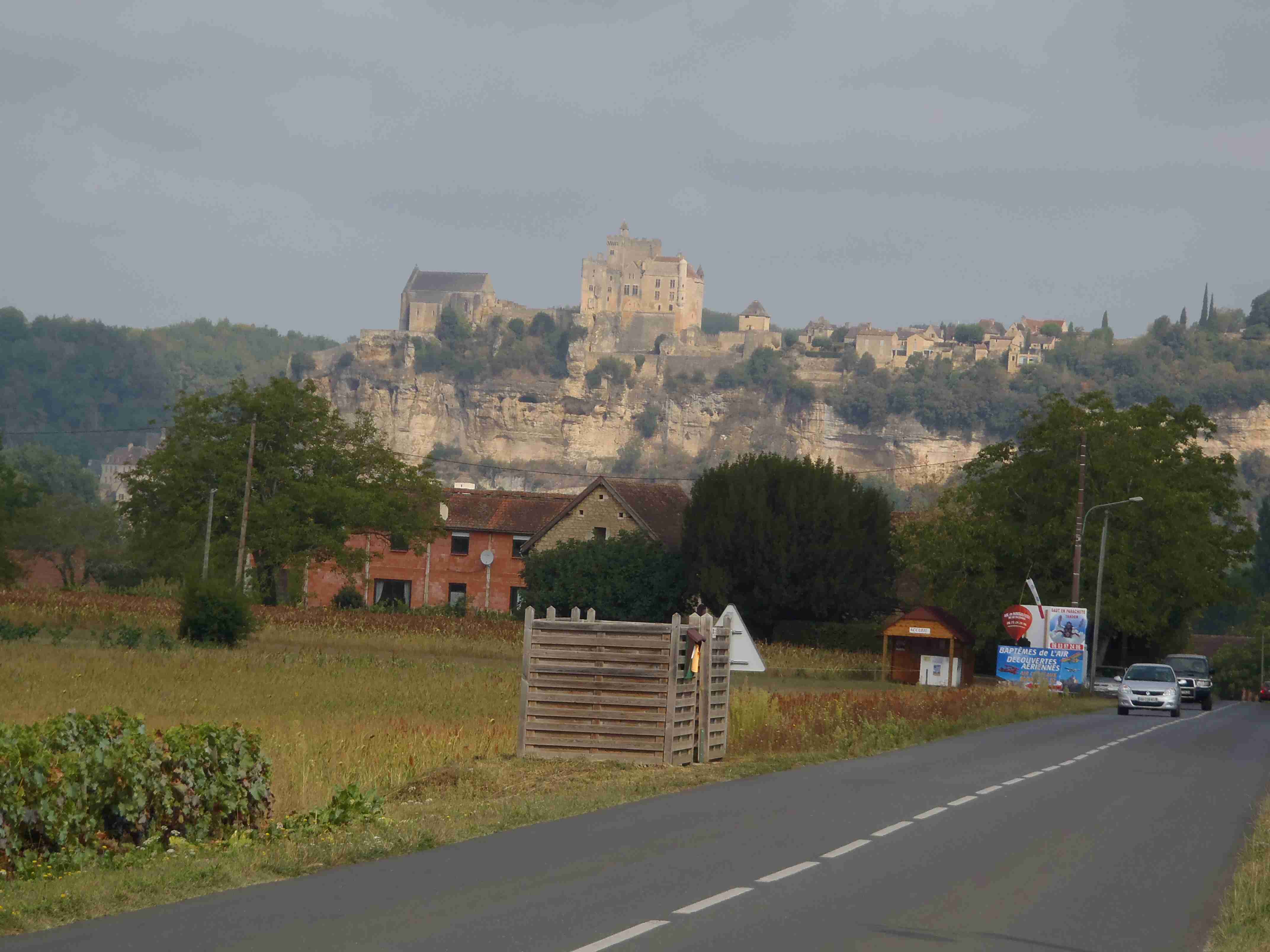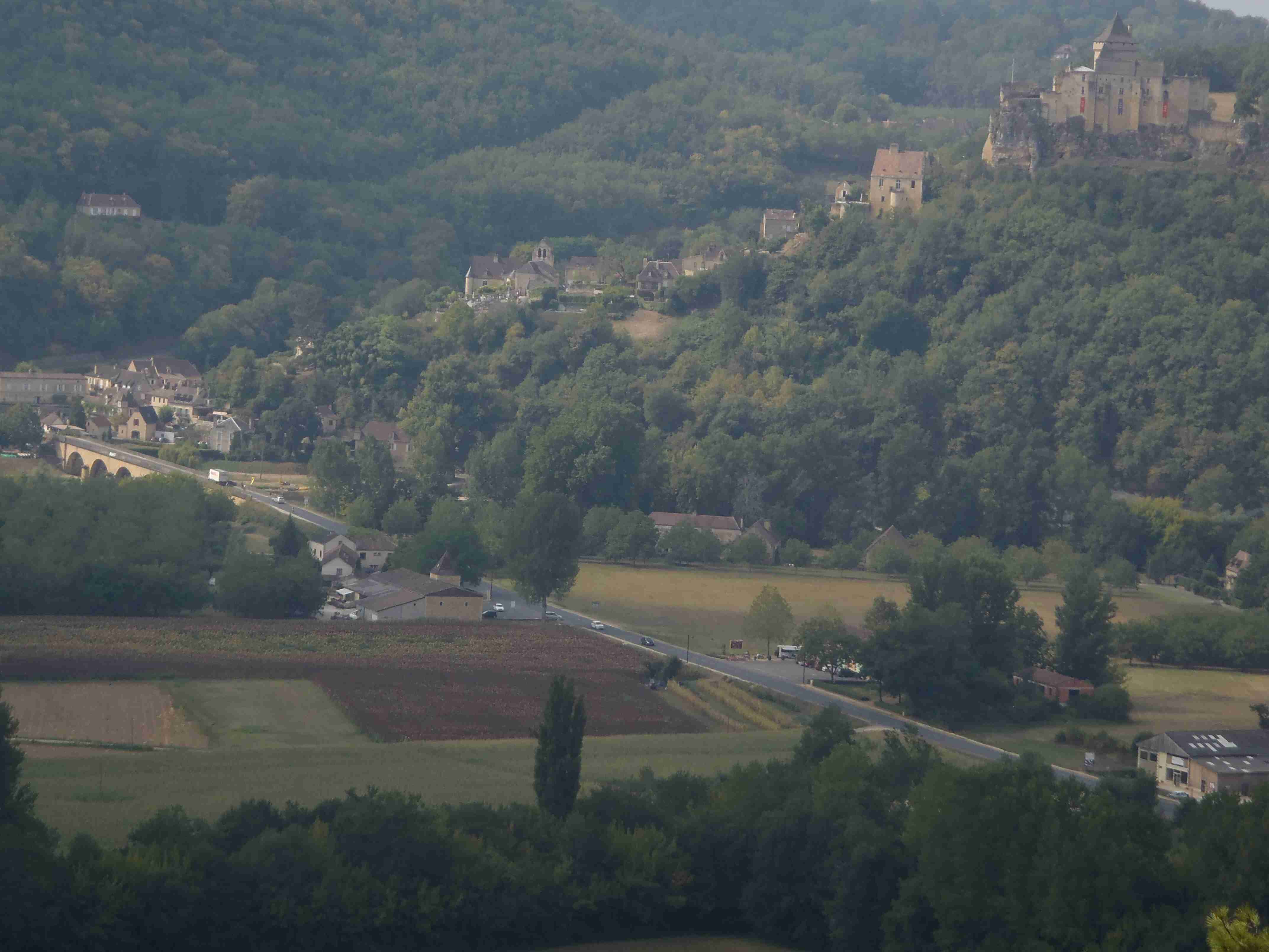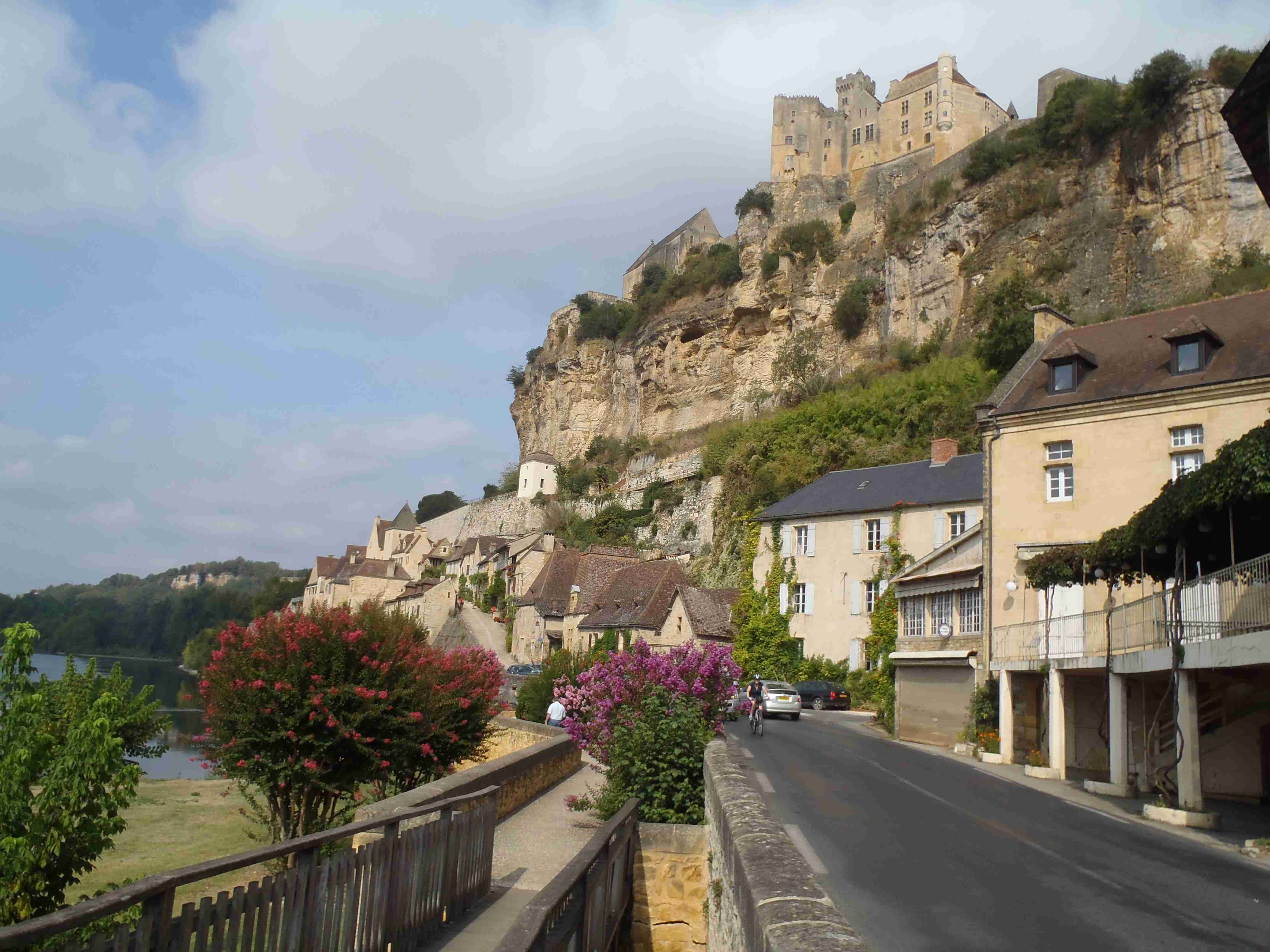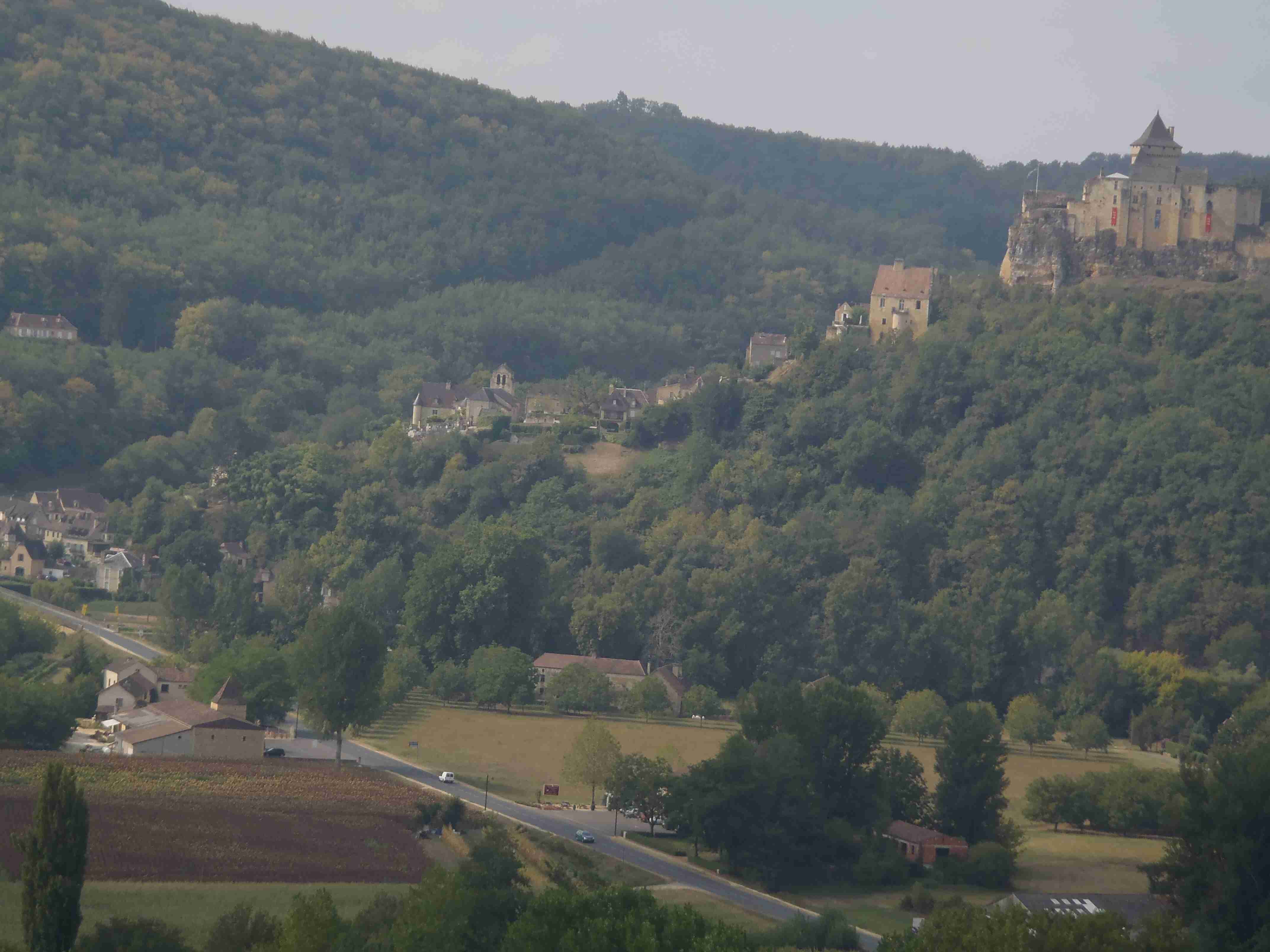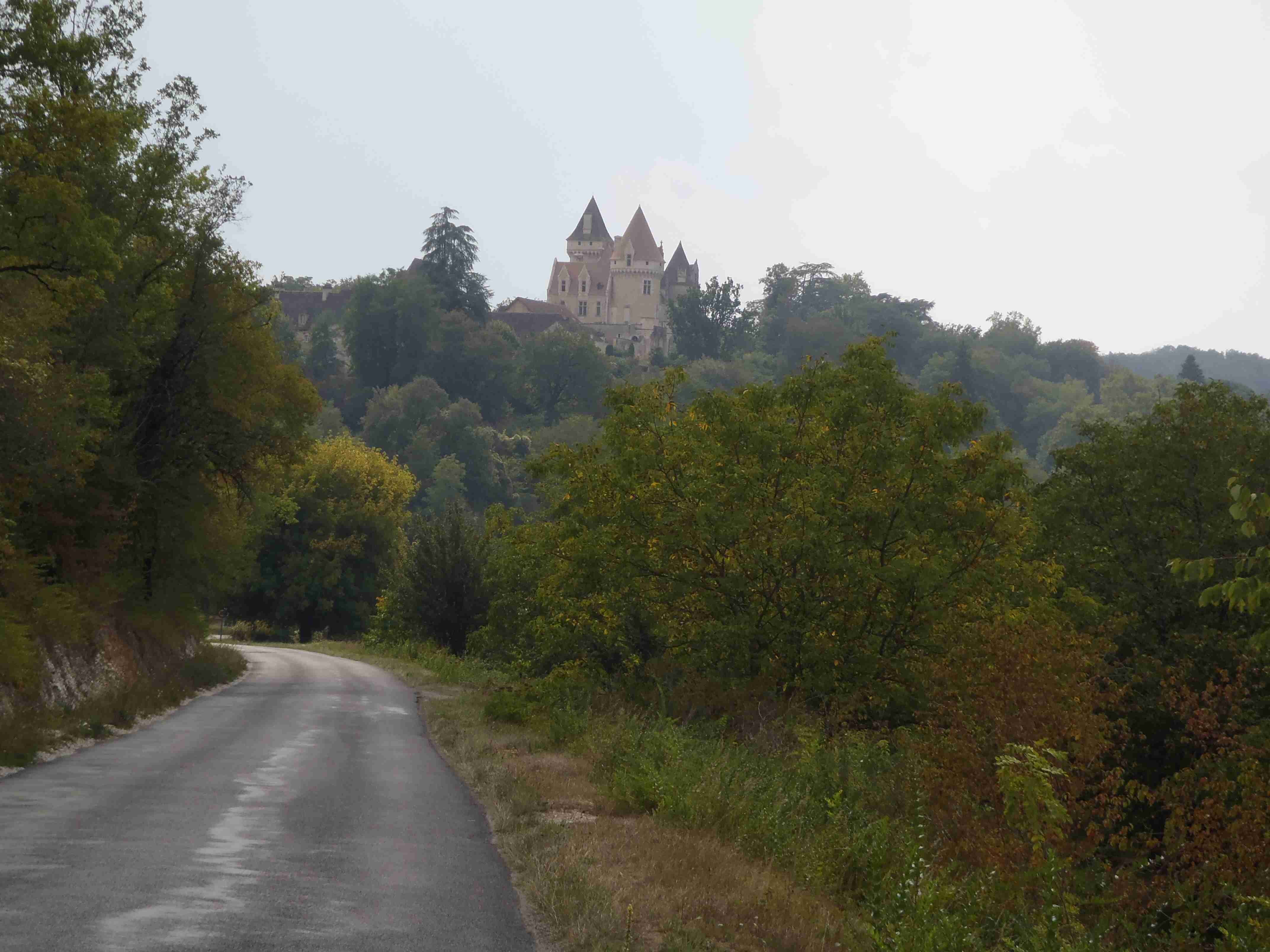 Dnešní etapa se částečně překrývala s jednou naší loňskou a tak jsme zkušeně radili ostatním, co kde je. Kolem půl desáté jsme vyrazili na kolech od hotelu směrem na Vitrac, sjeli jsme k řece a stočili se doprava na Roque Gageac. Kousek za Vitracem jsme se zastavili v prodejně místních specialit, kde jsme si koupili kuchařku francouzských salátů a pokochali jsme se pohledem na spoustu dobrůtek. Pokračovali jsme až do Roque Gageac, kde jsme si v restauraci na začátku města dali kafe a pivo a po občerstvení jeli dál. Minuli jsme odbočku na most, po které jsme jeli vloni, a pokračovali jsme rovně až do Beynac et Cazenac, kde jsme se v půli městečka obrátili zpět, protože stoupat několik kilometrů do prudkého kopce na hrad se mi rozhodně nechtělo. Za městem jsme odbočili doleva po hlavní vedoucí na Sarlat a za chvíli jsme sjeli na silničku vedoucí k zámku Marqueyssac, kde jsou rozsáhlé zahrady. Jejich návštěvě jsem se již nemohl vyhnout a tak jsme vyfuněli kopec k zámku, tam jsme si zamkli kola a prošli jsme si zahrady, nafotili a především se pokochali pohledem na údolí řeky Dordogne lemované hrady. Od zámku jsme sjeli opět dolů k řece a vrátili se k odbočce na most. Minuli jsme muzeum krystalů a tak jako vloni jsme zastavili u prodejny místních specialit. Ihned jsme dostali ochutnat kousek foie gras a trochu vína, ale letos jsme nic nekupovali. Po chvíli jsme pokračovali, přejeli jsme po mostě do Castelnaud a chtěli jsme se naobědvat hned v restauraci navazující na most. Číšník nás ale odháněl kvůli kolům, tak jsme na něj udělali dlouhý nos a pokračovali ještě kousek za most, kde byla vlevo u silnice zahradní restaurace i s volnými stoly. Jeden jsme si vybrali a shodou okolností hned vedle seděli naši kolegové ze zájezdu, kteří měli obdobnou nepříjemnou zkušenost s pikolíkem od restaurace u mostu. Objednali jsme si s Ivou saláty, protože nás přeci jenom čekala ještě nějaká cesta, ale i ty saláty byly poměrně výživné. K pití jsme si dali každý malý džbánek (0,25 l) vína, Iva růžové, já červené. Naši kolegové, Ivana a Jiří, měli jídla masitá, tak jsme je okukovali (ta jídla), protože vypadala moc pěkně. V poklidu a v družném hovoru se sousedy jsme poobědvali a vychutnávali si dovolenou. Ivana s Jiřím odjeli chvíli před námi, a po zaplacení jsme je následovali. Cestu jsme znali z loňska, bylo to po rovince podél řeky, minuli jsme soukromý hrad Fayrac , jenž se nachází výjimečně dole kousek od vody a jako vloni jsme odbočili doleva do kopce směrem na Belvez. Naštěstí jsme jeli tímto směrem jenom chvíli a odbočili jsme doprava na zámek Milandes, protože rovně na Belvez je kopec jako blázen, loni jsme tlačili asi 3 km. Na Chateau Milandes to sice bylo také do kopce, ale dalo se. Na zámku svého času pobývala Josephine Baker i se svými adoptovanými dětmi a vnitřní expozice je zcela věnována jejímu pohnutému životu. Venku se pak nachází spousta voliér s dravými ptáky a v pravidelných intervalech pořádají i ukázky jejich výcviku. Strávili jsme na zámku asi dvě hodiny a nakonec jsme vyrazili na poslední úsek naší etapy. Sjeli jsme opět k řece a podél vody dojeli do Allas les Mines, kde jsme přejeli na pravý břeh, kousek jsme jeli mezi poli a poté po nepříjemně frekventované silnici do městečka St. Cyprien, kde na nás na opačném okraji města u Carefouru čekal autobus. Kdo chtěl, mohl pokračovat ještě asi 15 km do Sarlatu přes kopečky, ale nám již těch cca 40 km stačilo a tak jsme volili autobus. Po návratu jsme opět skončili v marketu, trochu jsem měl velké oči a přehnal jsem to s nákupem a jedli jsme to ještě tři dny.