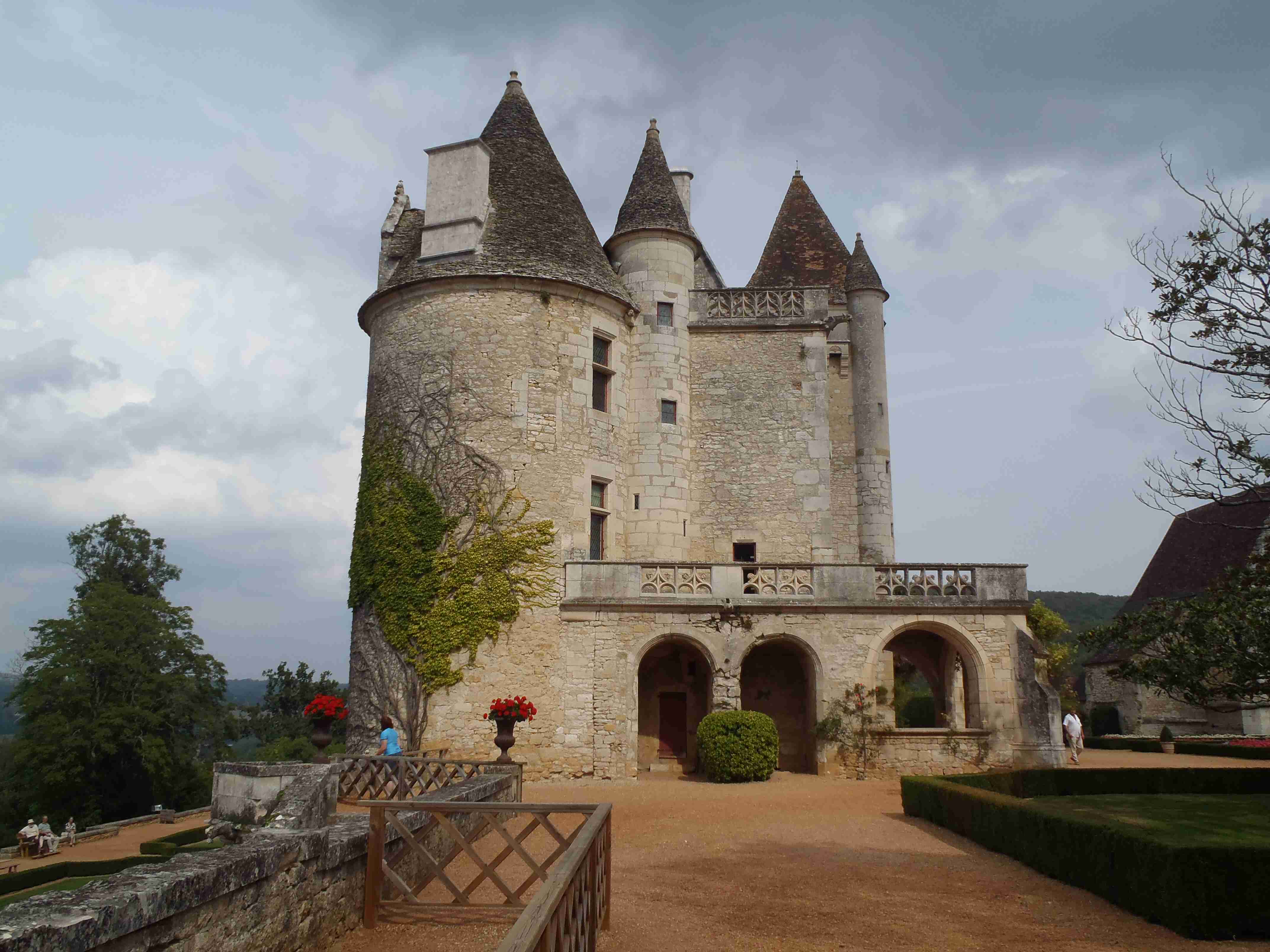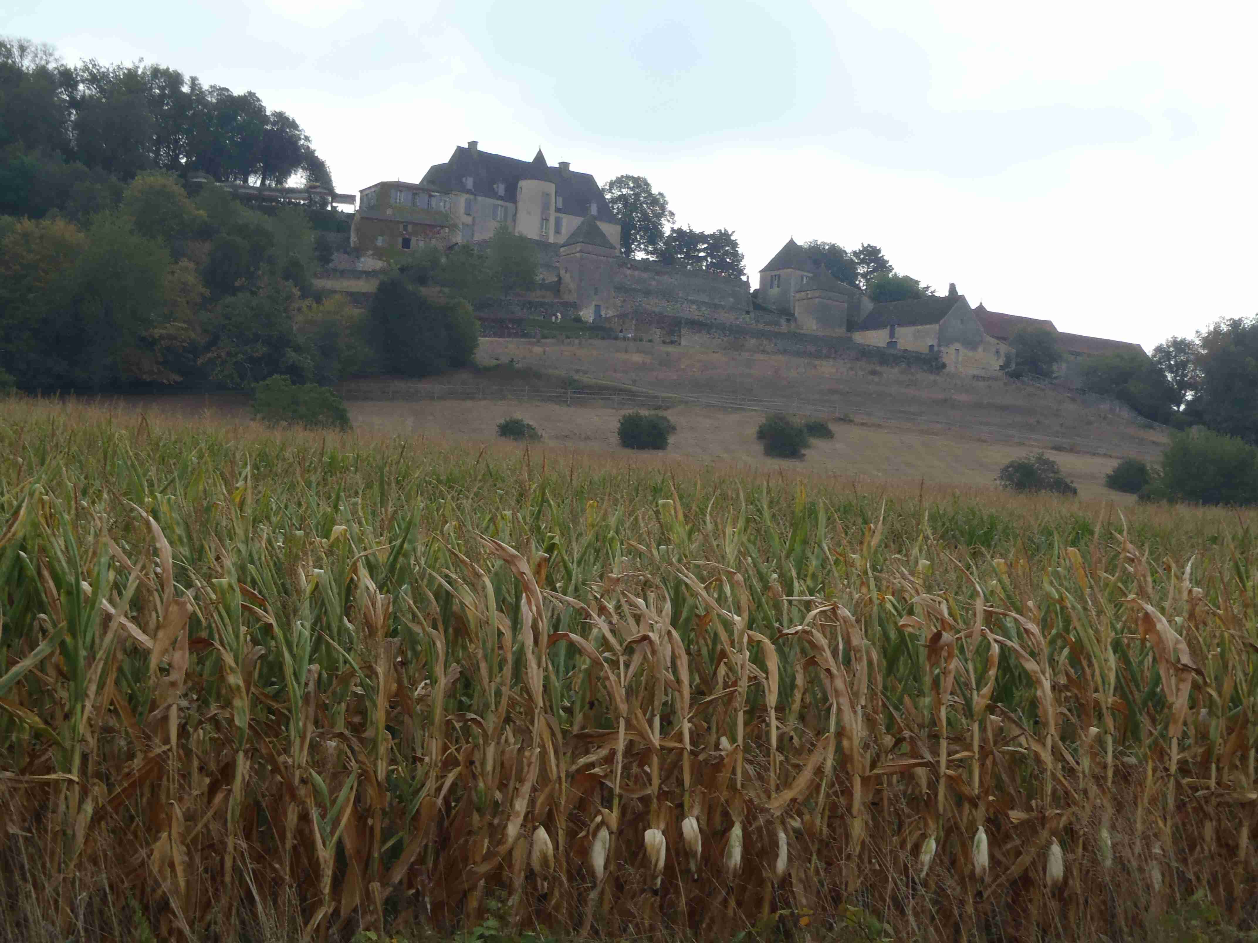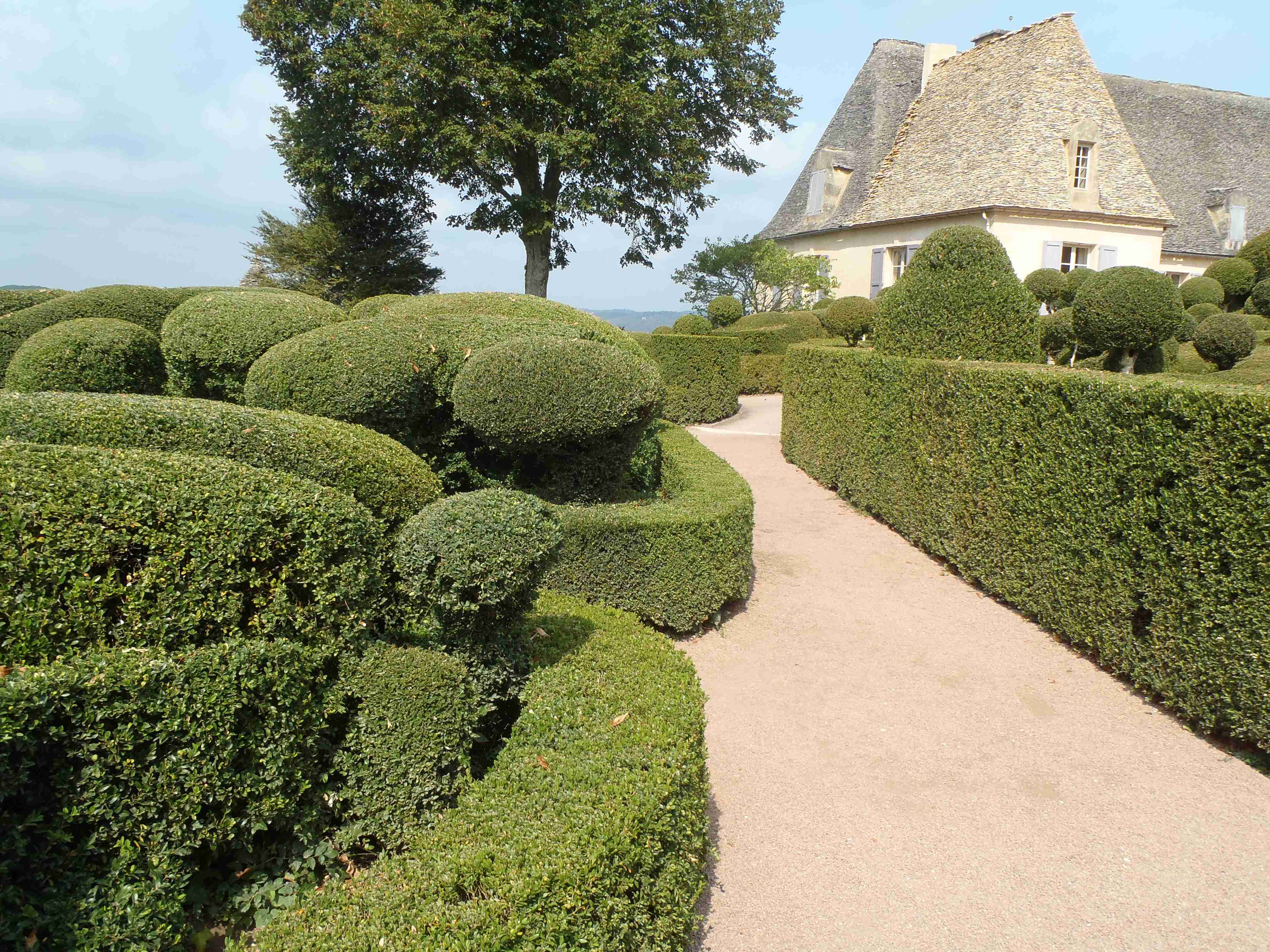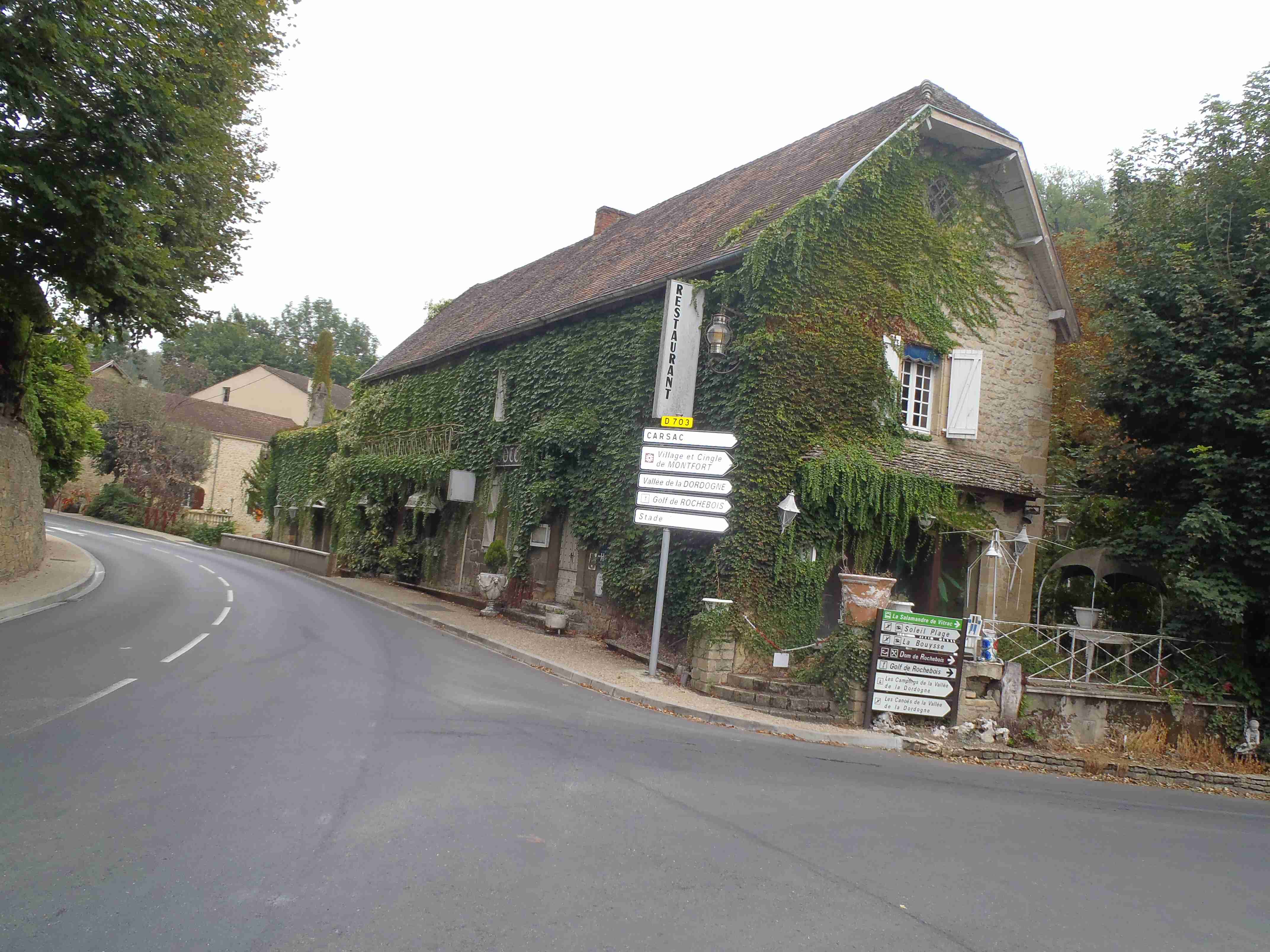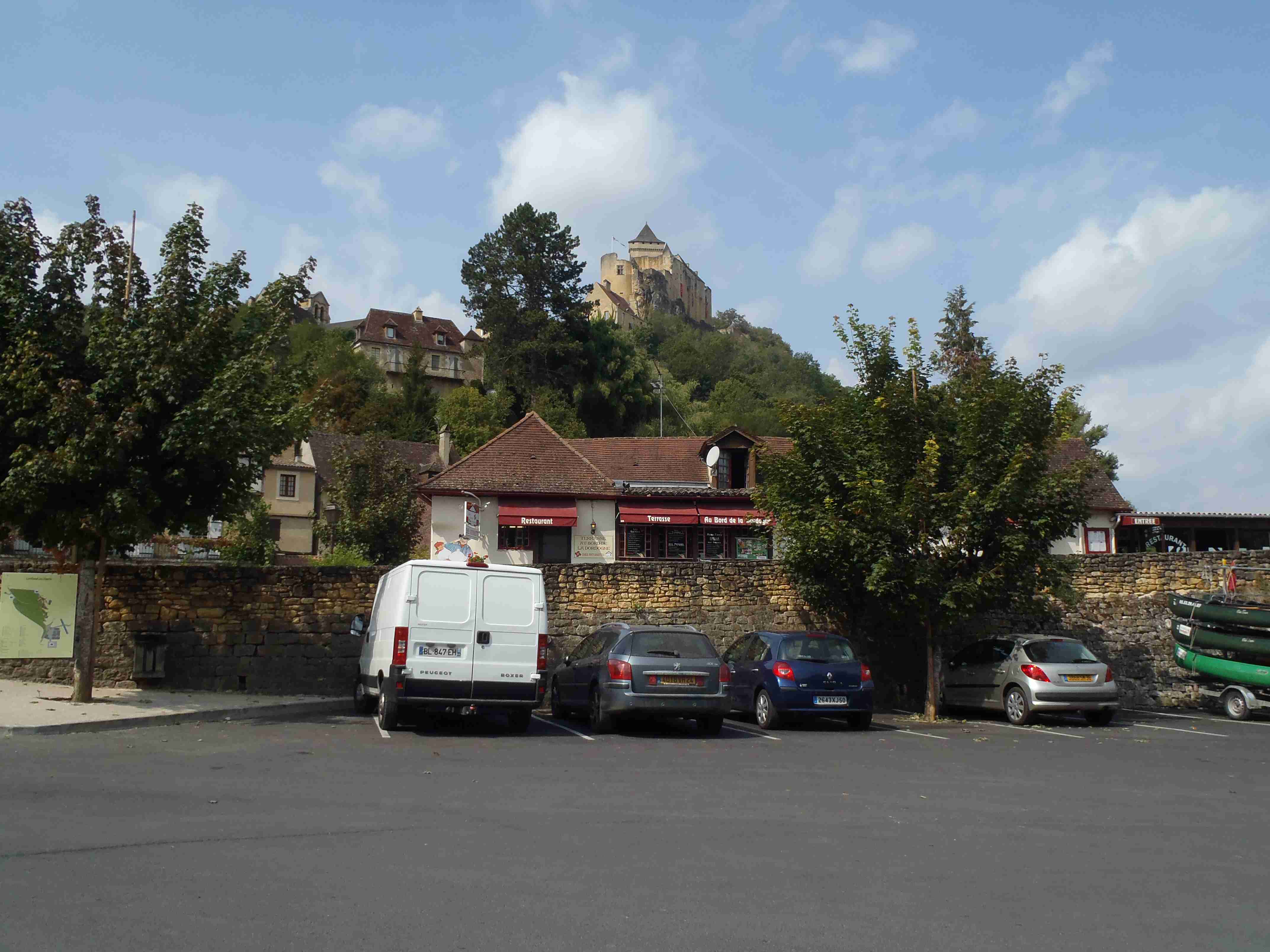 Dnešní etapa se částečně překrývala s jednou naší loňskou a tak jsme zkušeně radili ostatním, co kde je. Kolem půl desáté jsme vyrazili na kolech od hotelu směrem na Vitrac, sjeli jsme k řece a stočili se doprava na Roque Gageac. Kousek za Vitracem jsme se zastavili v prodejně místních specialit, kde jsme si koupili kuchařku francouzských salátů a pokochali jsme se pohledem na spoustu dobrůtek. Pokračovali jsme až do Roque Gageac, kde jsme si v restauraci na začátku města dali kafe a pivo a po občerstvení jeli dál. Minuli jsme odbočku na most, po které jsme jeli vloni, a pokračovali jsme rovně až do Beynac et Cazenac, kde jsme se v půli městečka obrátili zpět, protože stoupat několik kilometrů do prudkého kopce na hrad se mi rozhodně nechtělo. Za městem jsme odbočili doleva po hlavní vedoucí na Sarlat a za chvíli jsme sjeli na silničku vedoucí k zámku Marqueyssac, kde jsou rozsáhlé zahrady. Jejich návštěvě jsem se již nemohl vyhnout a tak jsme vyfuněli kopec k zámku, tam jsme si zamkli kola a prošli jsme si zahrady, nafotili a především se pokochali pohledem na údolí řeky Dordogne lemované hrady. Od zámku jsme sjeli opět dolů k řece a vrátili se k odbočce na most. Minuli jsme muzeum krystalů a tak jako vloni jsme zastavili u prodejny místních specialit. Ihned jsme dostali ochutnat kousek foie gras a trochu vína, ale letos jsme nic nekupovali. Po chvíli jsme pokračovali, přejeli jsme po mostě do Castelnaud a chtěli jsme se naobědvat hned v restauraci navazující na most. Číšník nás ale odháněl kvůli kolům, tak jsme na něj udělali dlouhý nos a pokračovali ještě kousek za most, kde byla vlevo u silnice zahradní restaurace i s volnými stoly. Jeden jsme si vybrali a shodou okolností hned vedle seděli naši kolegové ze zájezdu, kteří měli obdobnou nepříjemnou zkušenost s pikolíkem od restaurace u mostu. Objednali jsme si s Ivou saláty, protože nás přeci jenom čekala ještě nějaká cesta, ale i ty saláty byly poměrně výživné. K pití jsme si dali každý malý džbánek (0,25 l) vína, Iva růžové, já červené. Naši kolegové, Ivana a Jiří, měli jídla masitá, tak jsme je okukovali (ta jídla), protože vypadala moc pěkně. V poklidu a v družném hovoru se sousedy jsme poobědvali a vychutnávali si dovolenou. Ivana s Jiřím odjeli chvíli před námi, a po zaplacení jsme je následovali. Cestu jsme znali z loňska, bylo to po rovince podél řeky, minuli jsme soukromý hrad Fayrac , jenž se nachází výjimečně dole kousek od vody a jako vloni jsme odbočili doleva do kopce směrem na Belvez. Naštěstí jsme jeli tímto směrem jenom chvíli a odbočili jsme doprava na zámek Milandes, protože rovně na Belvez je kopec jako blázen, loni jsme tlačili asi 3 km. Na Chateau Milandes to sice bylo také do kopce, ale dalo se. Na zámku svého času pobývala Josephine Baker i se svými adoptovanými dětmi a vnitřní expozice je zcela věnována jejímu pohnutému životu. Venku se pak nachází spousta voliér s dravými ptáky a v pravidelných intervalech pořádají i ukázky jejich výcviku. Strávili jsme na zámku asi dvě hodiny a nakonec jsme vyrazili na poslední úsek naší etapy. Sjeli jsme opět k řece a podél vody dojeli do Allas les Mines, kde jsme přejeli na pravý břeh, kousek jsme jeli mezi poli a poté po nepříjemně frekventované silnici do městečka St. Cyprien, kde na nás na opačném okraji města u Carefouru čekal autobus. Kdo chtěl, mohl pokračovat ještě asi 15 km do Sarlatu přes kopečky, ale nám již těch cca 40 km stačilo a tak jsme volili autobus. Po návratu jsme opět skončili v marketu, trochu jsem měl velké oči a přehnal jsem to s nákupem a jedli jsme to ještě tři dny.