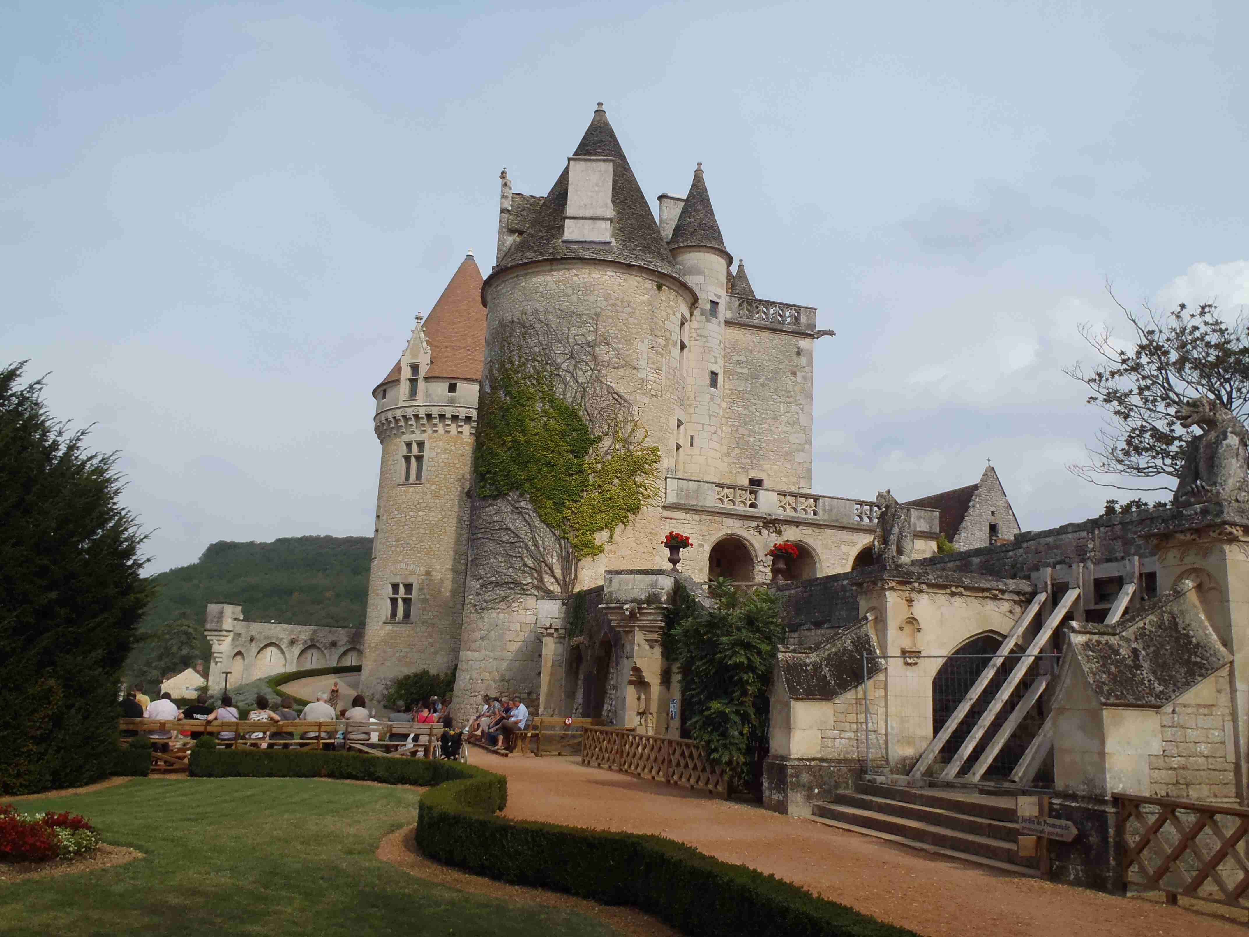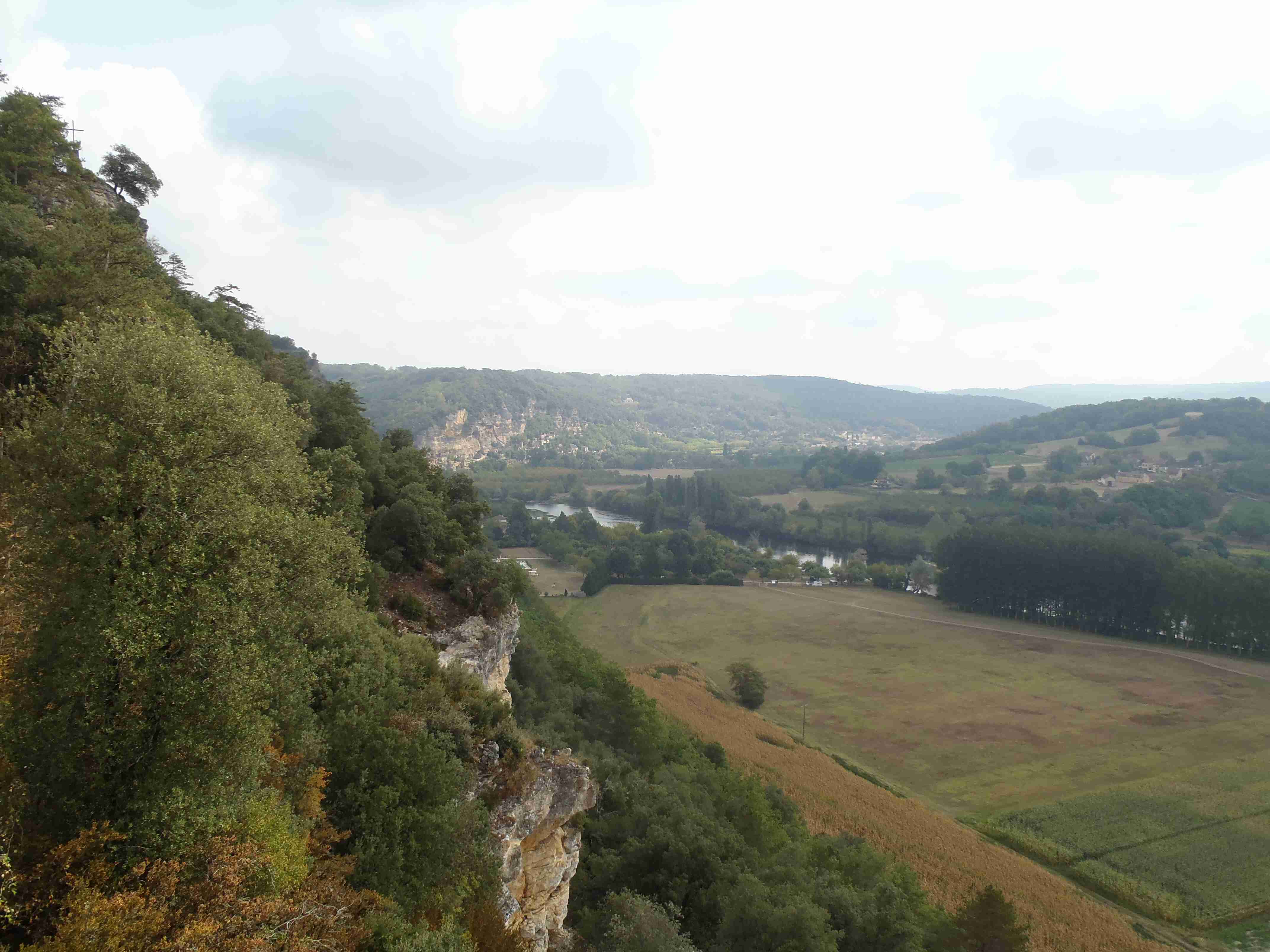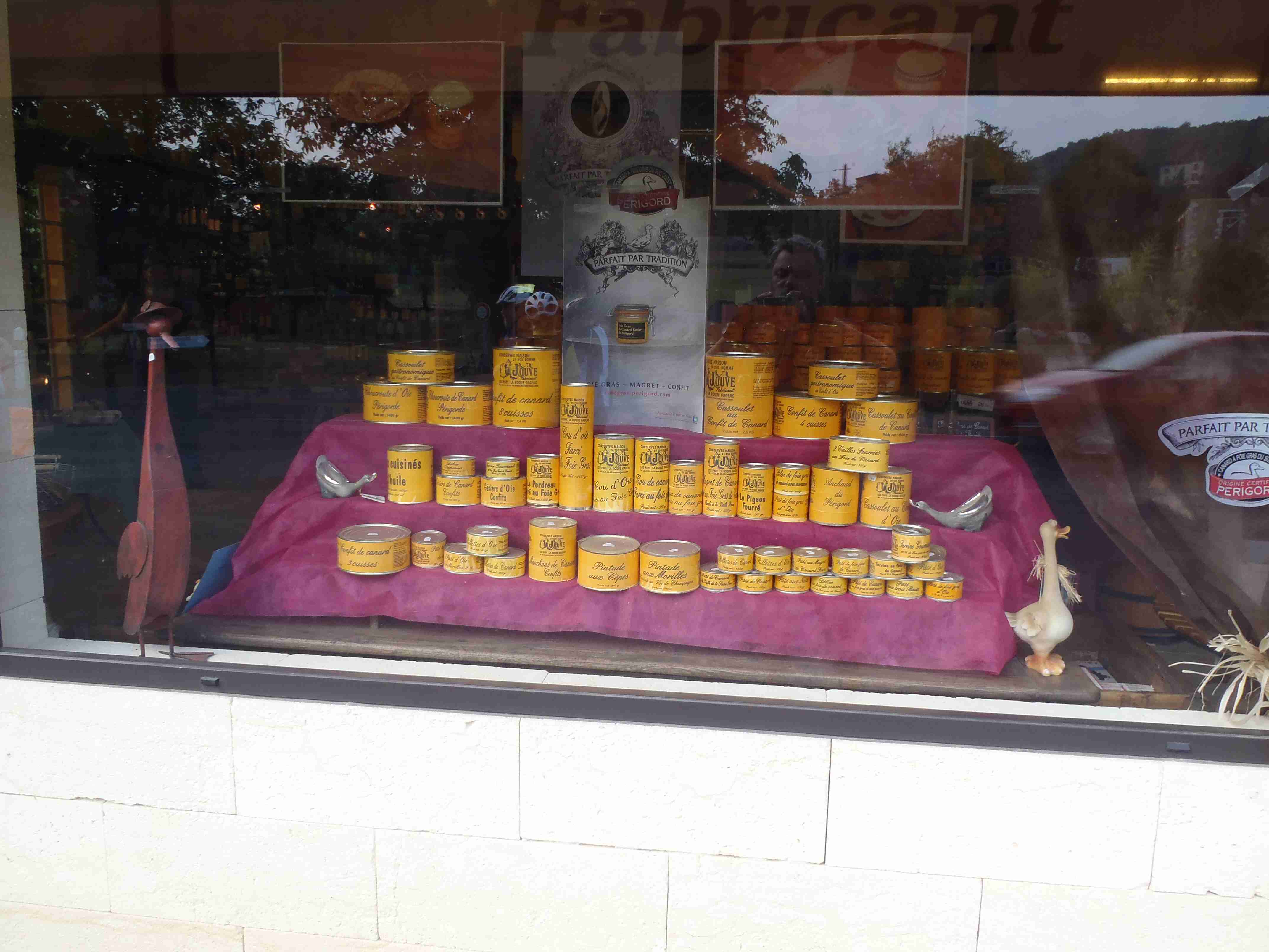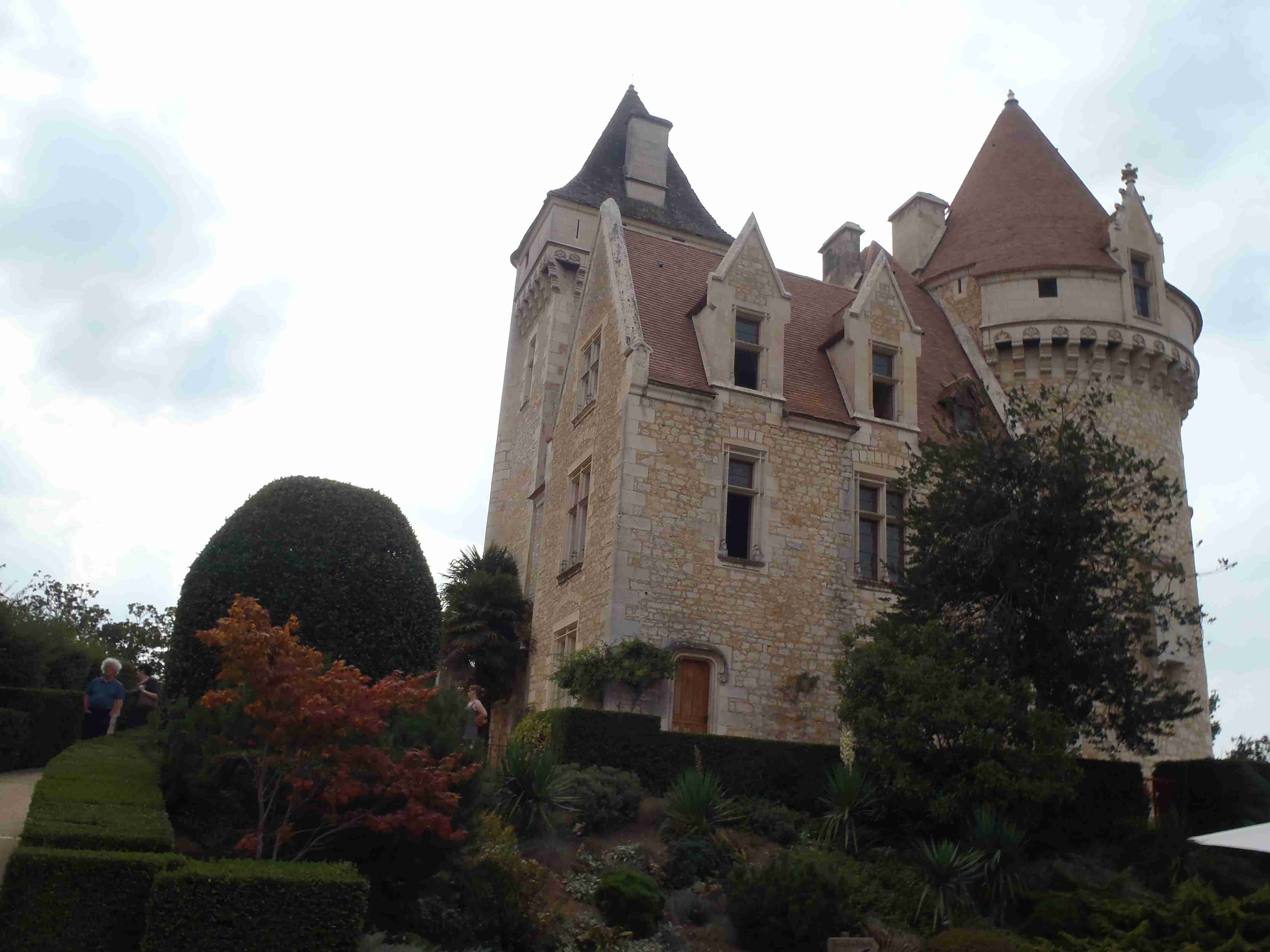 Dnešní etapa se částečně překrývala s jednou naší loňskou a tak jsme zkušeně radili ostatním, co kde je. Kolem půl desáté jsme vyrazili na kolech od hotelu směrem na Vitrac, sjeli jsme k řece a stočili se doprava na Roque Gageac. Kousek za Vitracem jsme se zastavili v prodejně místních specialit, kde jsme si koupili kuchařku francouzských salátů a pokochali jsme se pohledem na spoustu dobrůtek. Pokračovali jsme až do Roque Gageac, kde jsme si v restauraci na začátku města dali kafe a pivo a po občerstvení jeli dál. Minuli jsme odbočku na most, po které jsme jeli vloni, a pokračovali jsme rovně až do Beynac et Cazenac, kde jsme se v půli městečka obrátili zpět, protože stoupat několik kilometrů do prudkého kopce na hrad se mi rozhodně nechtělo. Za městem jsme odbočili doleva po hlavní vedoucí na Sarlat a za chvíli jsme sjeli na silničku vedoucí k zámku Marqueyssac, kde jsou rozsáhlé zahrady. Jejich návštěvě jsem se již nemohl vyhnout a tak jsme vyfuněli kopec k zámku, tam jsme si zamkli kola a prošli jsme si zahrady, nafotili a především se pokochali pohledem na údolí řeky Dordogne lemované hrady. Od zámku jsme sjeli opět dolů k řece a vrátili se k odbočce na most. Minuli jsme muzeum krystalů a tak jako vloni jsme zastavili u prodejny místních specialit. Ihned jsme dostali ochutnat kousek foie gras a trochu vína, ale letos jsme nic nekupovali. Po chvíli jsme pokračovali, přejeli jsme po mostě do Castelnaud a chtěli jsme se naobědvat hned v restauraci navazující na most. Číšník nás ale odháněl kvůli kolům, tak jsme na něj udělali dlouhý nos a pokračovali ještě kousek za most, kde byla vlevo u silnice zahradní restaurace i s volnými stoly. Jeden jsme si vybrali a shodou okolností hned vedle seděli naši kolegové ze zájezdu, kteří měli obdobnou nepříjemnou zkušenost s pikolíkem od restaurace u mostu. Objednali jsme si s Ivou saláty, protože nás přeci jenom čekala ještě nějaká cesta, ale i ty saláty byly poměrně výživné. K pití jsme si dali každý malý džbánek (0,25 l) vína, Iva růžové, já červené. Naši kolegové, Ivana a Jiří, měli jídla masitá, tak jsme je okukovali (ta jídla), protože vypadala moc pěkně. V poklidu a v družném hovoru se sousedy jsme poobědvali a vychutnávali si dovolenou. Ivana s Jiřím odjeli chvíli před námi, a po zaplacení jsme je následovali. Cestu jsme znali z loňska, bylo to po rovince podél řeky, minuli jsme soukromý hrad Fayrac , jenž se nachází výjimečně dole kousek od vody a jako vloni jsme odbočili doleva do kopce směrem na Belvez. Naštěstí jsme jeli tímto směrem jenom chvíli a odbočili jsme doprava na zámek Milandes, protože rovně na Belvez je kopec jako blázen, loni jsme tlačili asi 3 km. Na Chateau Milandes to sice bylo také do kopce, ale dalo se. Na zámku svého času pobývala Josephine Baker i se svými adoptovanými dětmi a vnitřní expozice je zcela věnována jejímu pohnutému životu. Venku se pak nachází spousta voliér s dravými ptáky a v pravidelných intervalech pořádají i ukázky jejich výcviku. Strávili jsme na zámku asi dvě hodiny a nakonec jsme vyrazili na poslední úsek naší etapy. Sjeli jsme opět k řece a podél vody dojeli do Allas les Mines, kde jsme přejeli na pravý břeh, kousek jsme jeli mezi poli a poté po nepříjemně frekventované silnici do městečka St. Cyprien, kde na nás na opačném okraji města u Carefouru čekal autobus. Kdo chtěl, mohl pokračovat ještě asi 15 km do Sarlatu přes kopečky, ale nám již těch cca 40 km stačilo a tak jsme volili autobus. Po návratu jsme opět skončili v marketu, trochu jsem měl velké oči a přehnal jsem to s nákupem a jedli jsme to ještě tři dny.