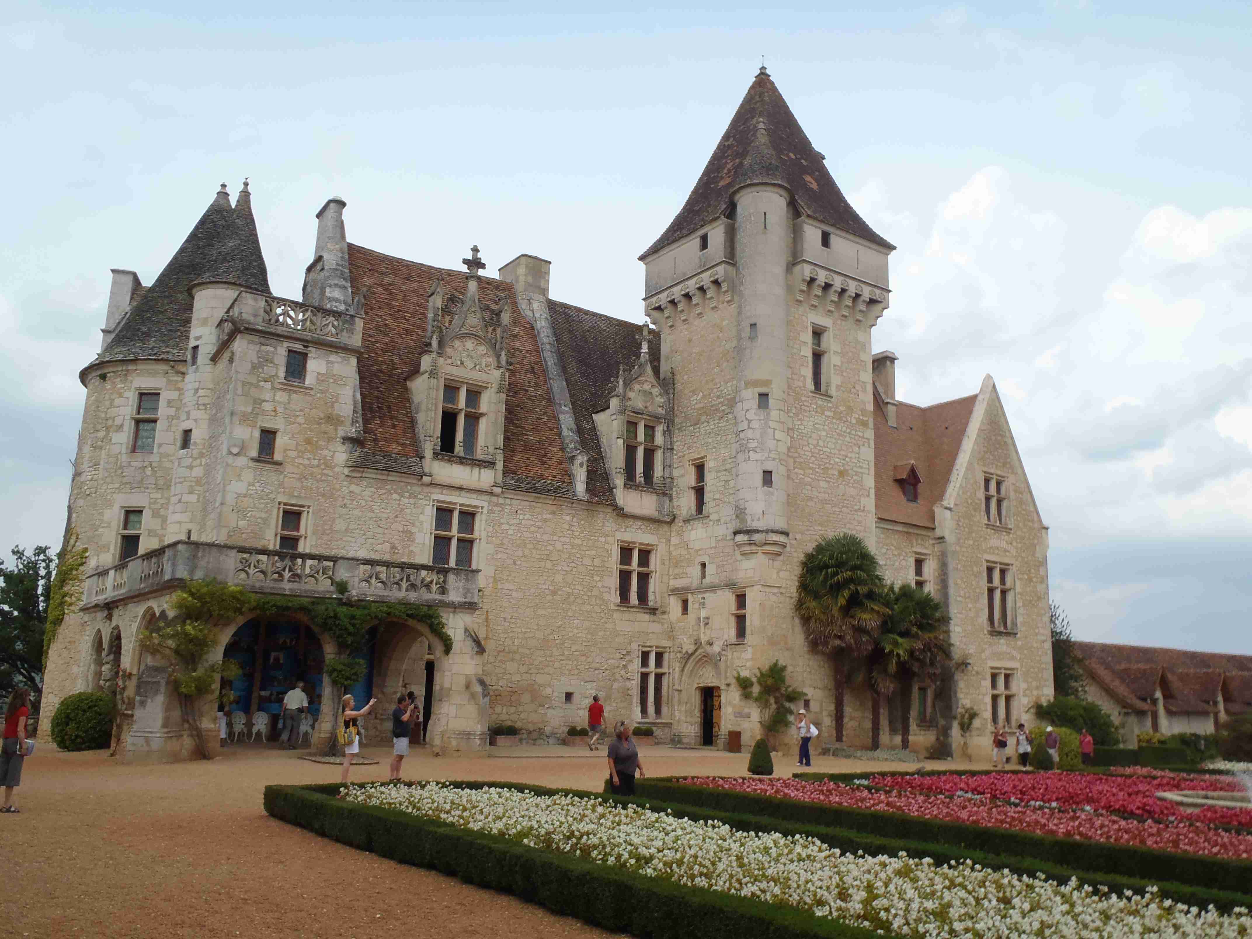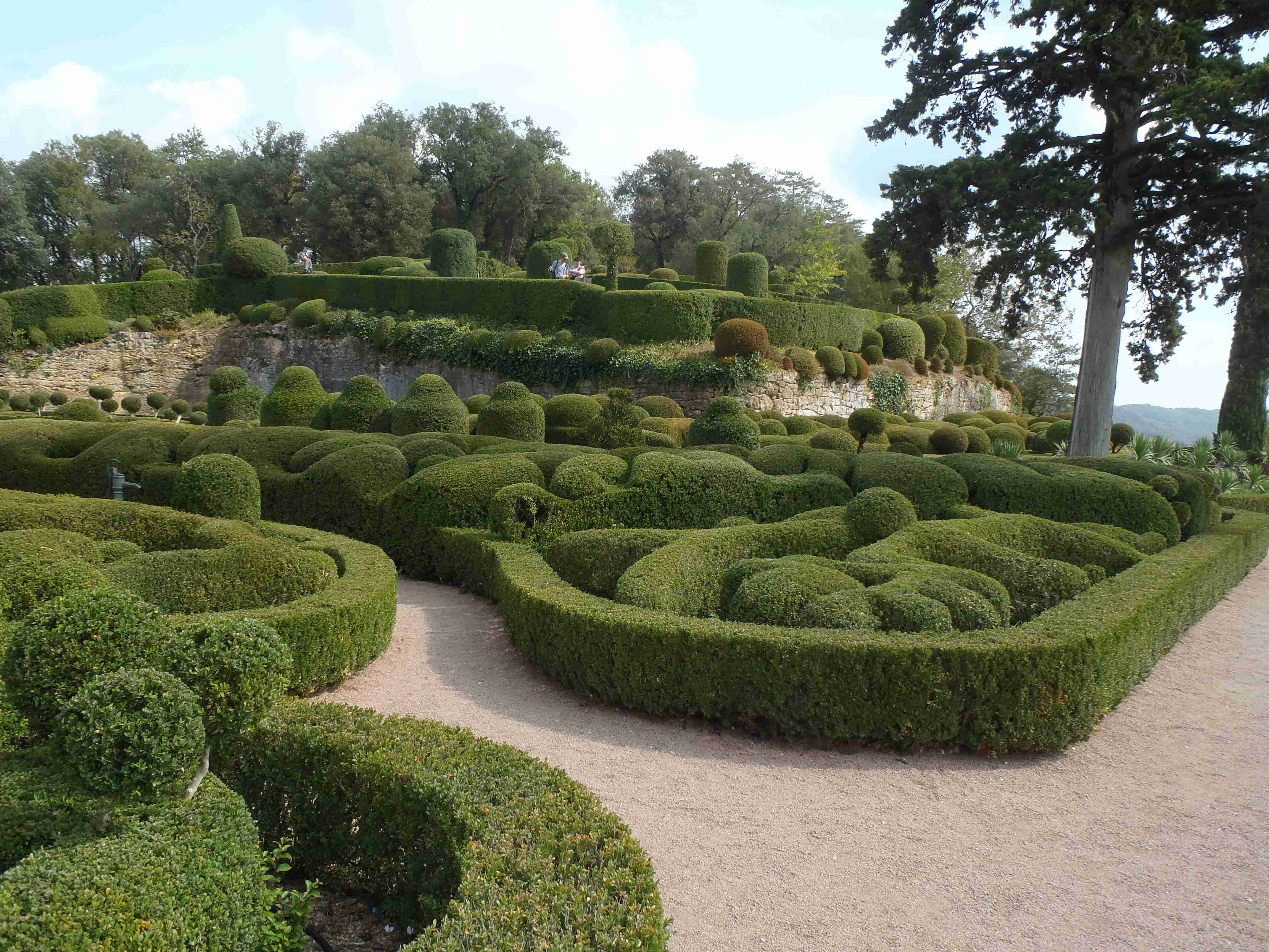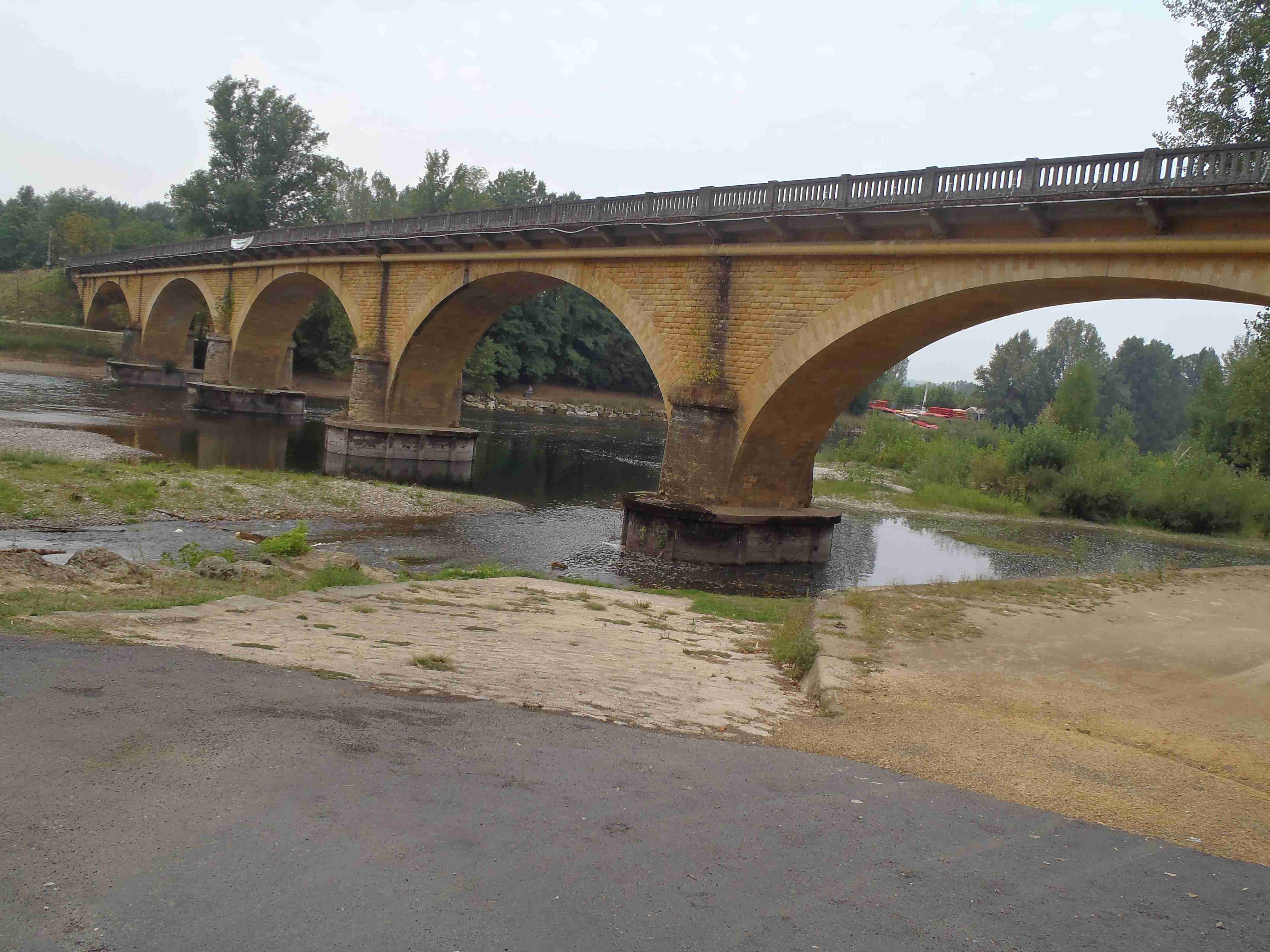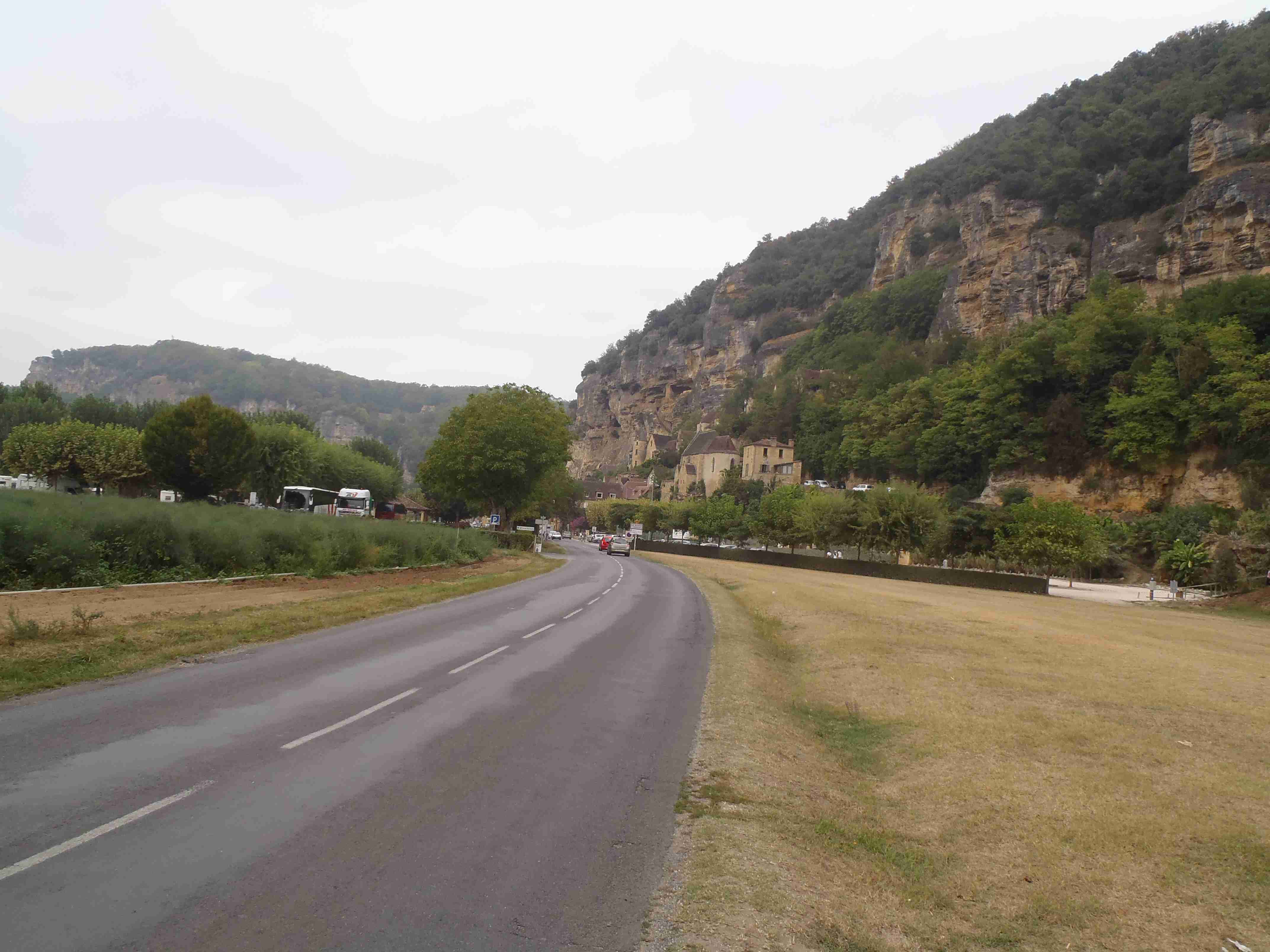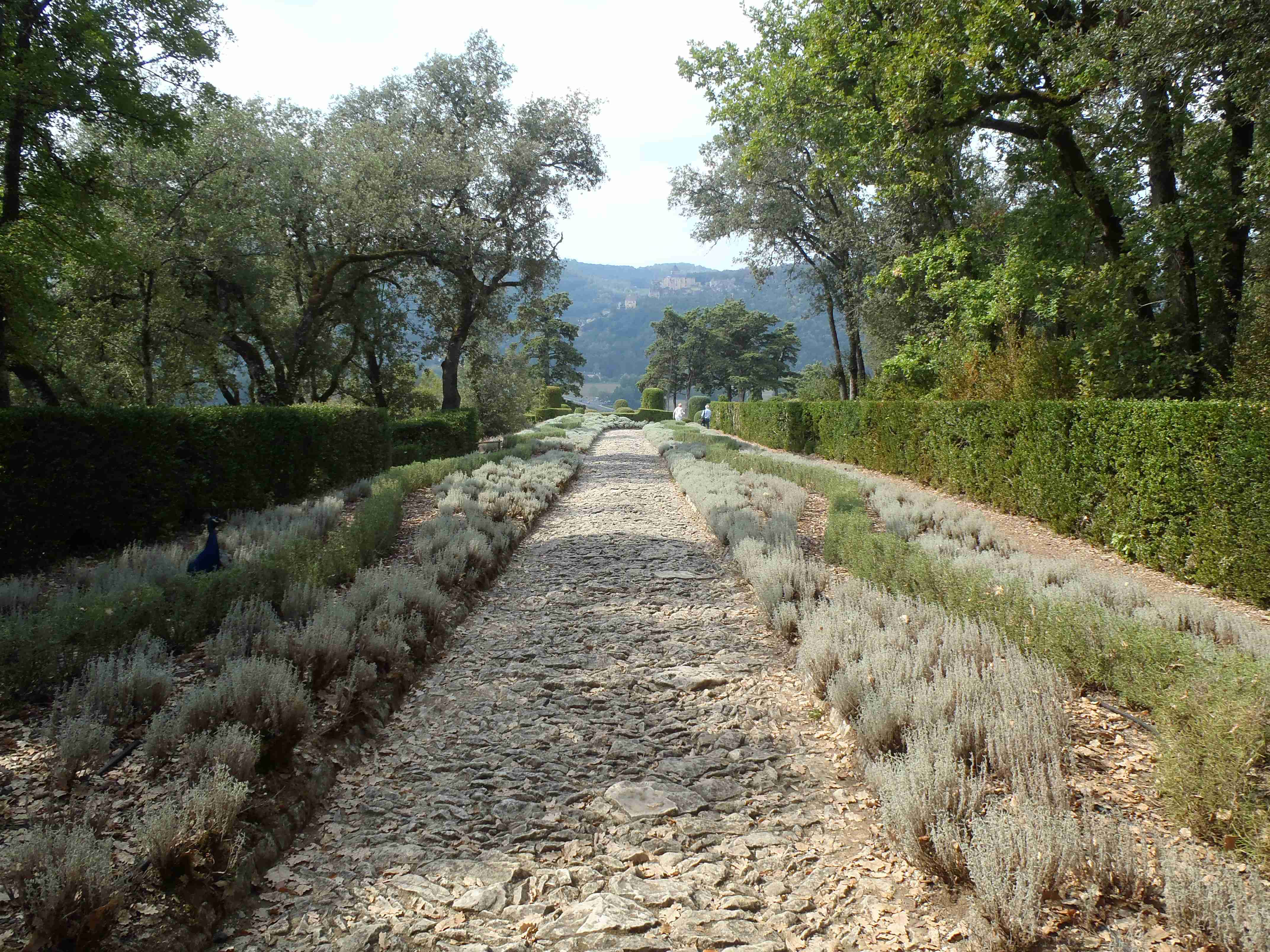 Dnešní etapa se částečně překrývala s jednou naší loňskou a tak jsme zkušeně radili ostatním, co kde je. Kolem půl desáté jsme vyrazili na kolech od hotelu směrem na Vitrac, sjeli jsme k řece a stočili se doprava na Roque Gageac. Kousek za Vitracem jsme se zastavili v prodejně místních specialit, kde jsme si koupili kuchařku francouzských salátů a pokochali jsme se pohledem na spoustu dobrůtek. Pokračovali jsme až do Roque Gageac, kde jsme si v restauraci na začátku města dali kafe a pivo a po občerstvení jeli dál. Minuli jsme odbočku na most, po které jsme jeli vloni, a pokračovali jsme rovně až do Beynac et Cazenac, kde jsme se v půli městečka obrátili zpět, protože stoupat několik kilometrů do prudkého kopce na hrad se mi rozhodně nechtělo. Za městem jsme odbočili doleva po hlavní vedoucí na Sarlat a za chvíli jsme sjeli na silničku vedoucí k zámku Marqueyssac, kde jsou rozsáhlé zahrady. Jejich návštěvě jsem se již nemohl vyhnout a tak jsme vyfuněli kopec k zámku, tam jsme si zamkli kola a prošli jsme si zahrady, nafotili a především se pokochali pohledem na údolí řeky Dordogne lemované hrady. Od zámku jsme sjeli opět dolů k řece a vrátili se k odbočce na most. Minuli jsme muzeum krystalů a tak jako vloni jsme zastavili u prodejny místních specialit. Ihned jsme dostali ochutnat kousek foie gras a trochu vína, ale letos jsme nic nekupovali. Po chvíli jsme pokračovali, přejeli jsme po mostě do Castelnaud a chtěli jsme se naobědvat hned v restauraci navazující na most. Číšník nás ale odháněl kvůli kolům, tak jsme na něj udělali dlouhý nos a pokračovali ještě kousek za most, kde byla vlevo u silnice zahradní restaurace i s volnými stoly. Jeden jsme si vybrali a shodou okolností hned vedle seděli naši kolegové ze zájezdu, kteří měli obdobnou nepříjemnou zkušenost s pikolíkem od restaurace u mostu. Objednali jsme si s Ivou saláty, protože nás přeci jenom čekala ještě nějaká cesta, ale i ty saláty byly poměrně výživné. K pití jsme si dali každý malý džbánek (0,25 l) vína, Iva růžové, já červené. Naši kolegové, Ivana a Jiří, měli jídla masitá, tak jsme je okukovali (ta jídla), protože vypadala moc pěkně. V poklidu a v družném hovoru se sousedy jsme poobědvali a vychutnávali si dovolenou. Ivana s Jiřím odjeli chvíli před námi, a po zaplacení jsme je následovali. Cestu jsme znali z loňska, bylo to po rovince podél řeky, minuli jsme soukromý hrad Fayrac , jenž se nachází výjimečně dole kousek od vody a jako vloni jsme odbočili doleva do kopce směrem na Belvez. Naštěstí jsme jeli tímto směrem jenom chvíli a odbočili jsme doprava na zámek Milandes, protože rovně na Belvez je kopec jako blázen, loni jsme tlačili asi 3 km. Na Chateau Milandes to sice bylo také do kopce, ale dalo se. Na zámku svého času pobývala Josephine Baker i se svými adoptovanými dětmi a vnitřní expozice je zcela věnována jejímu pohnutému životu. Venku se pak nachází spousta voliér s dravými ptáky a v pravidelných intervalech pořádají i ukázky jejich výcviku. Strávili jsme na zámku asi dvě hodiny a nakonec jsme vyrazili na poslední úsek naší etapy. Sjeli jsme opět k řece a podél vody dojeli do Allas les Mines, kde jsme přejeli na pravý břeh, kousek jsme jeli mezi poli a poté po nepříjemně frekventované silnici do městečka St. Cyprien, kde na nás na opačném okraji města u Carefouru čekal autobus. Kdo chtěl, mohl pokračovat ještě asi 15 km do Sarlatu přes kopečky, ale nám již těch cca 40 km stačilo a tak jsme volili autobus. Po návratu jsme opět skončili v marketu, trochu jsem měl velké oči a přehnal jsem to s nákupem a jedli jsme to ještě tři dny.