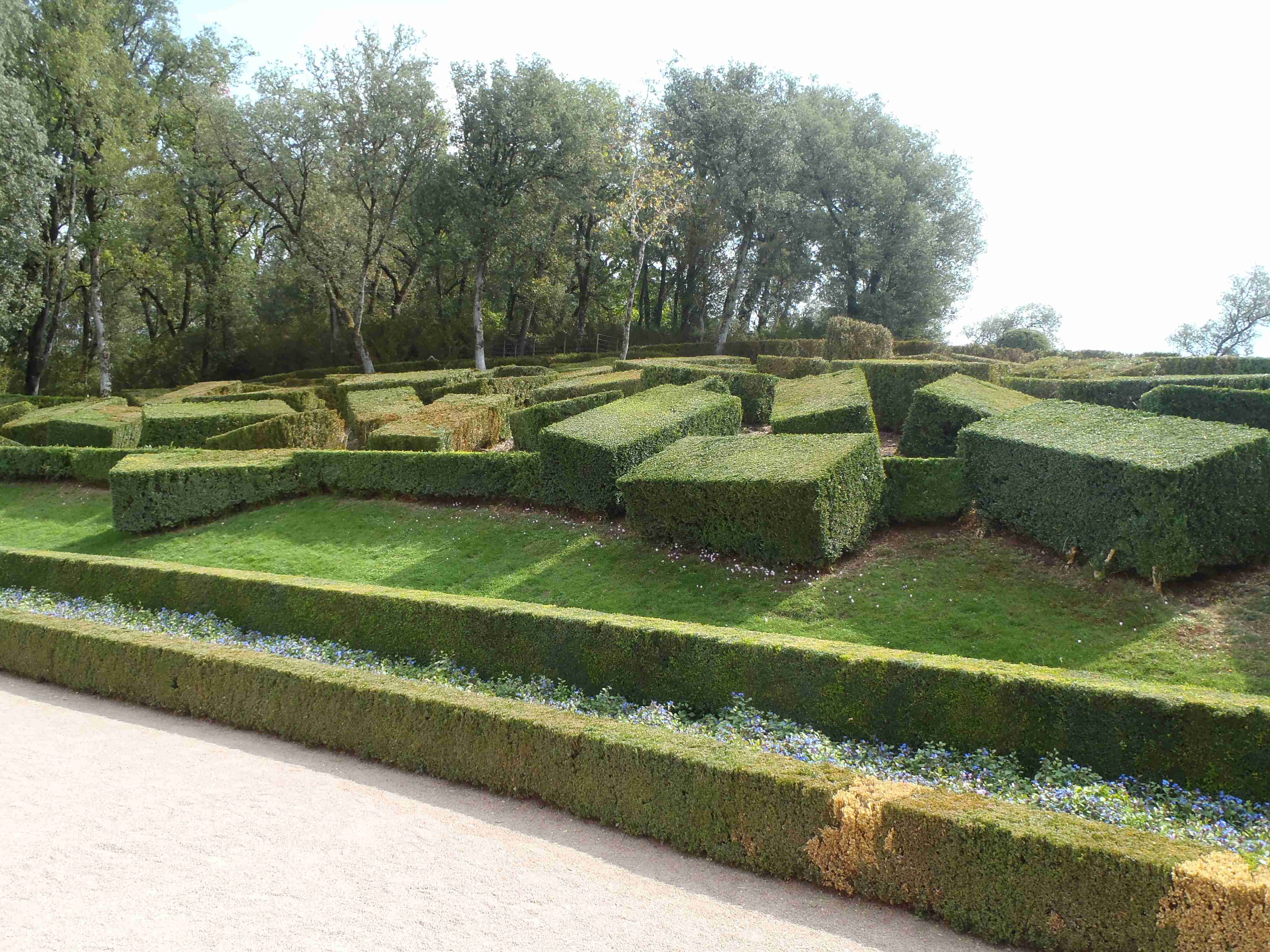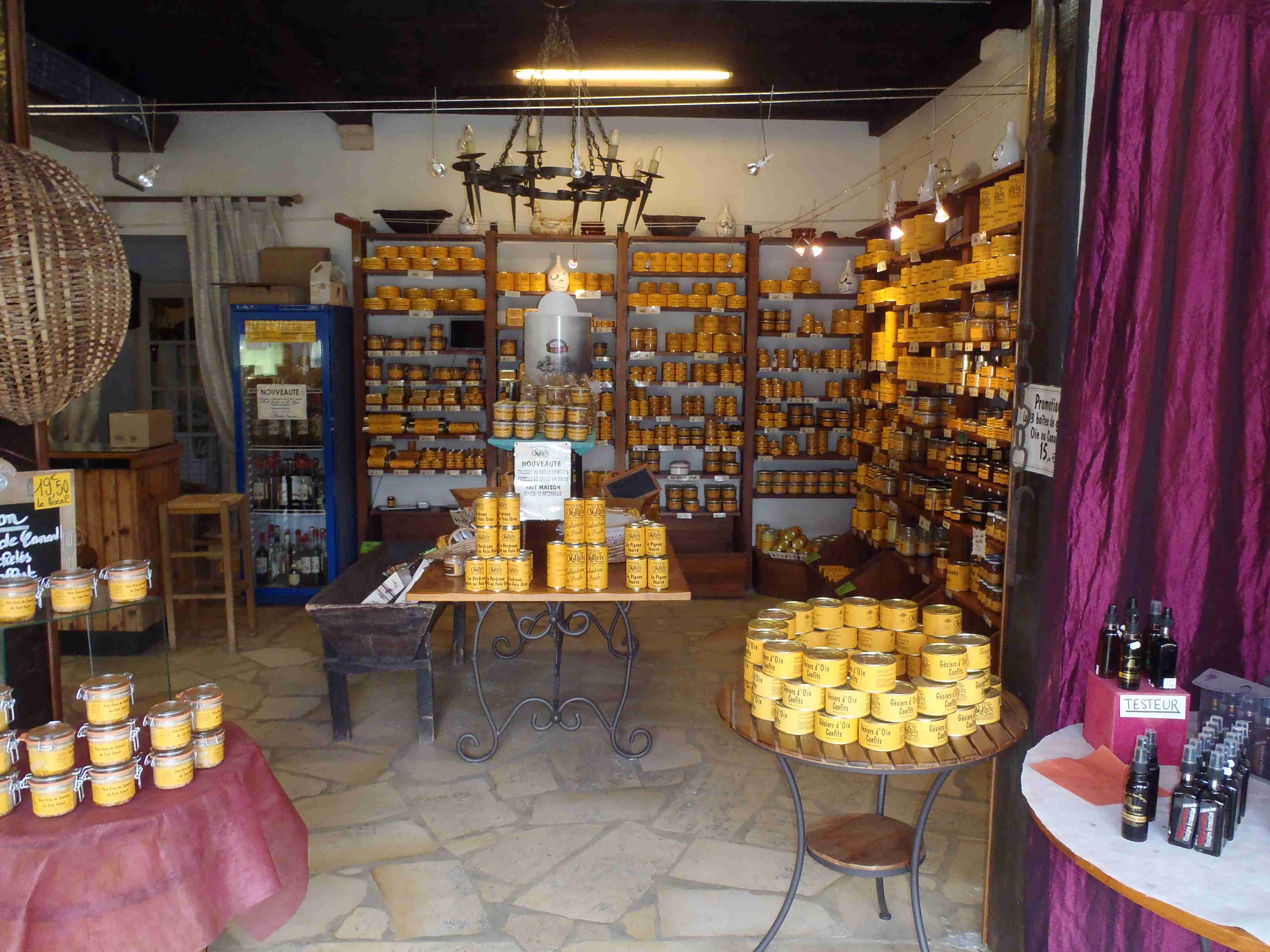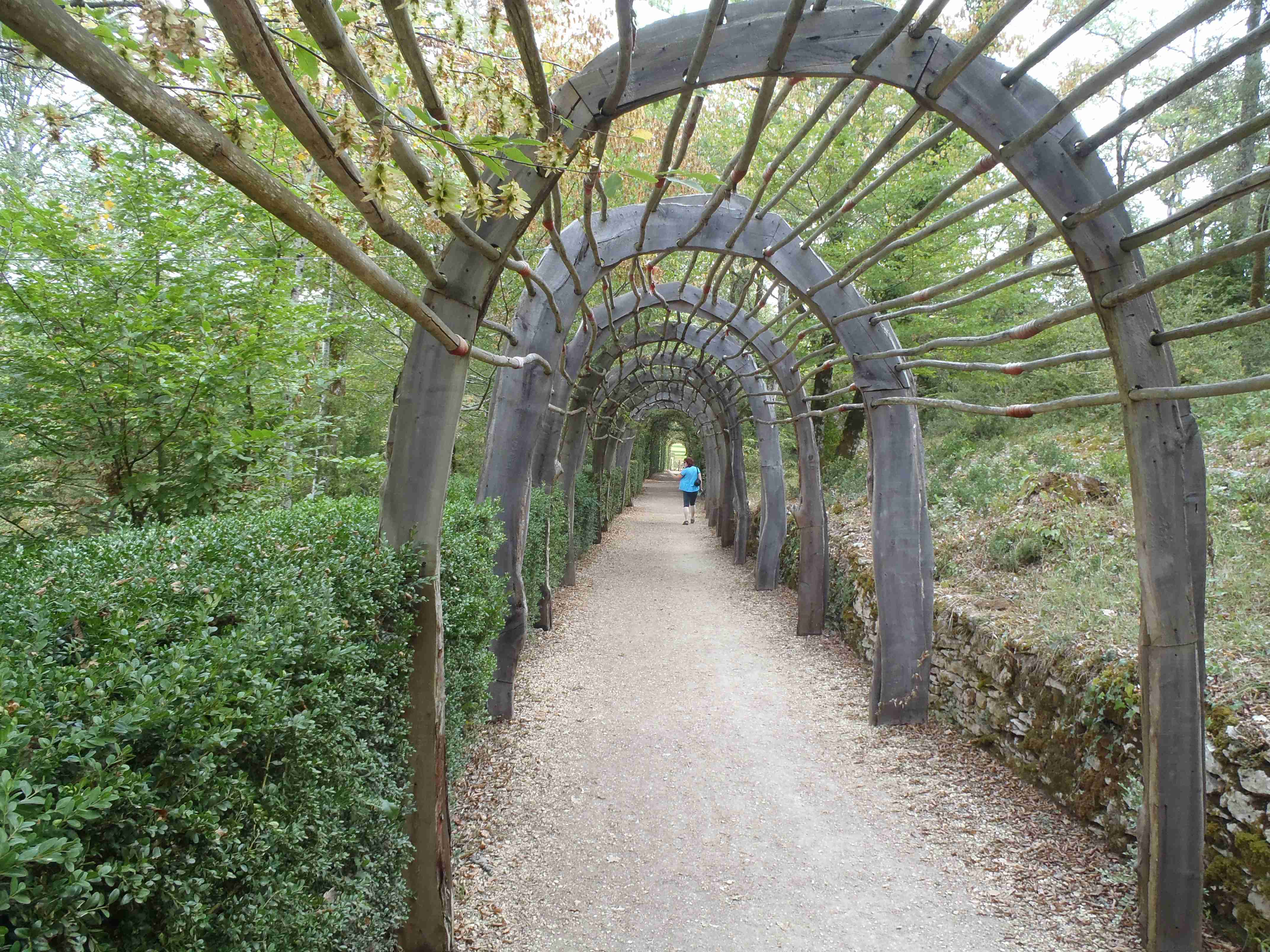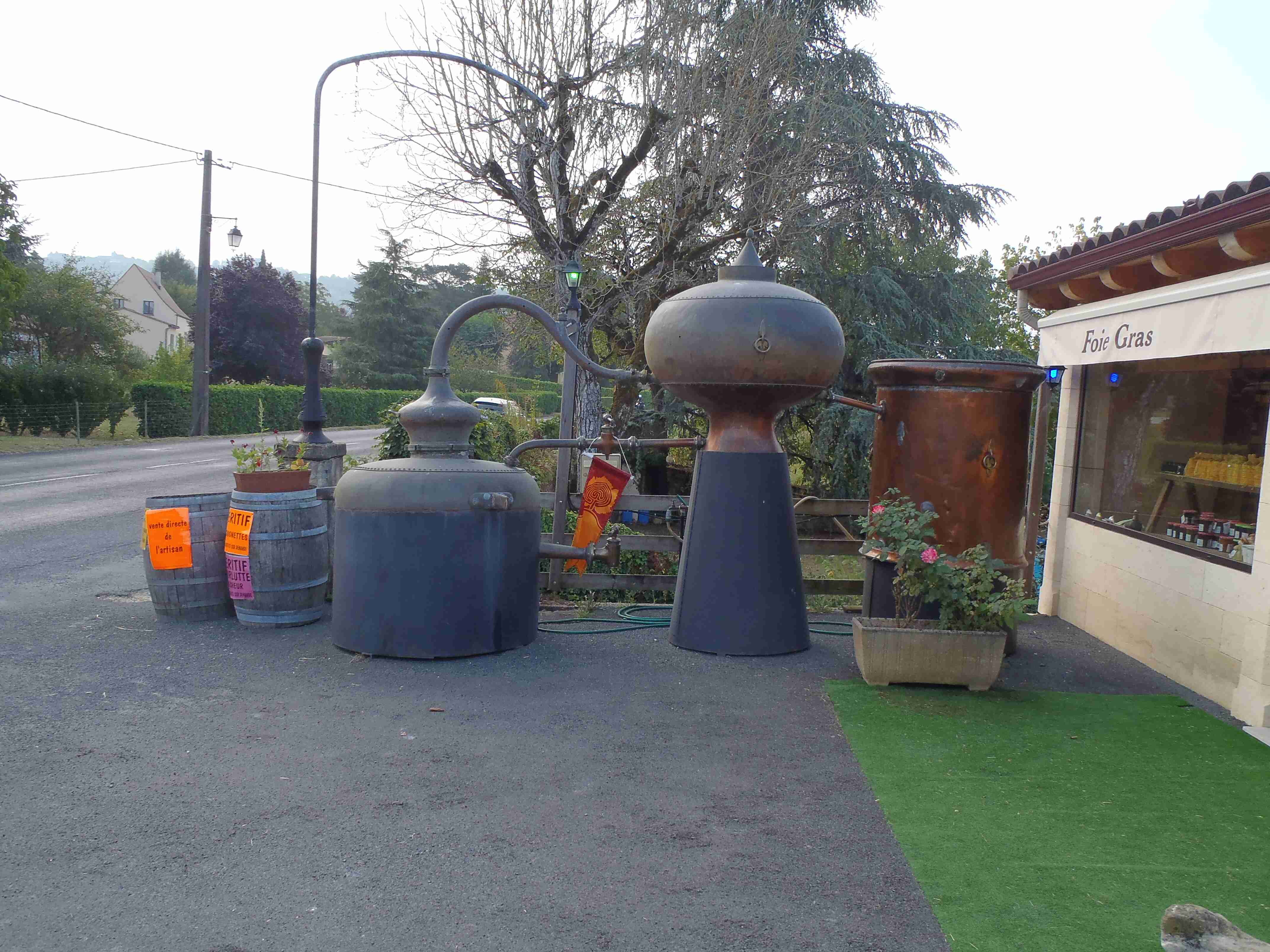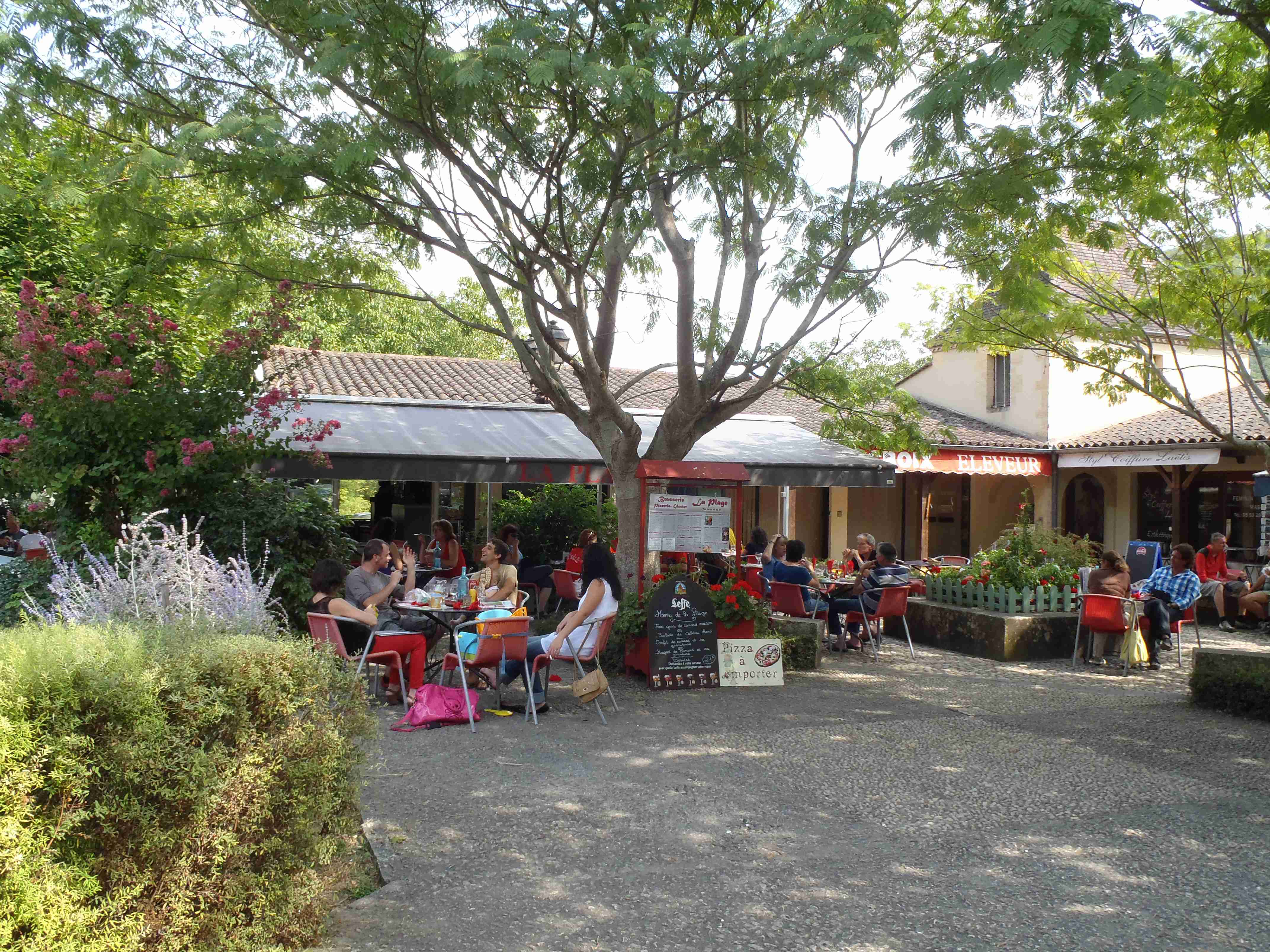 Dnešní etapa se částečně překrývala s jednou naší loňskou a tak jsme zkušeně radili ostatním, co kde je. Kolem půl desáté jsme vyrazili na kolech od hotelu směrem na Vitrac, sjeli jsme k řece a stočili se doprava na Roque Gageac. Kousek za Vitracem jsme se zastavili v prodejně místních specialit, kde jsme si koupili kuchařku francouzských salátů a pokochali jsme se pohledem na spoustu dobrůtek. Pokračovali jsme až do Roque Gageac, kde jsme si v restauraci na začátku města dali kafe a pivo a po občerstvení jeli dál. Minuli jsme odbočku na most, po které jsme jeli vloni, a pokračovali jsme rovně až do Beynac et Cazenac, kde jsme se v půli městečka obrátili zpět, protože stoupat několik kilometrů do prudkého kopce na hrad se mi rozhodně nechtělo. Za městem jsme odbočili doleva po hlavní vedoucí na Sarlat a za chvíli jsme sjeli na silničku vedoucí k zámku Marqueyssac, kde jsou rozsáhlé zahrady. Jejich návštěvě jsem se již nemohl vyhnout a tak jsme vyfuněli kopec k zámku, tam jsme si zamkli kola a prošli jsme si zahrady, nafotili a především se pokochali pohledem na údolí řeky Dordogne lemované hrady. Od zámku jsme sjeli opět dolů k řece a vrátili se k odbočce na most. Minuli jsme muzeum krystalů a tak jako vloni jsme zastavili u prodejny místních specialit. Ihned jsme dostali ochutnat kousek foie gras a trochu vína, ale letos jsme nic nekupovali. Po chvíli jsme pokračovali, přejeli jsme po mostě do Castelnaud a chtěli jsme se naobědvat hned v restauraci navazující na most. Číšník nás ale odháněl kvůli kolům, tak jsme na něj udělali dlouhý nos a pokračovali ještě kousek za most, kde byla vlevo u silnice zahradní restaurace i s volnými stoly. Jeden jsme si vybrali a shodou okolností hned vedle seděli naši kolegové ze zájezdu, kteří měli obdobnou nepříjemnou zkušenost s pikolíkem od restaurace u mostu. Objednali jsme si s Ivou saláty, protože nás přeci jenom čekala ještě nějaká cesta, ale i ty saláty byly poměrně výživné. K pití jsme si dali každý malý džbánek (0,25 l) vína, Iva růžové, já červené. Naši kolegové, Ivana a Jiří, měli jídla masitá, tak jsme je okukovali (ta jídla), protože vypadala moc pěkně. V poklidu a v družném hovoru se sousedy jsme poobědvali a vychutnávali si dovolenou. Ivana s Jiřím odjeli chvíli před námi, a po zaplacení jsme je následovali. Cestu jsme znali z loňska, bylo to po rovince podél řeky, minuli jsme soukromý hrad Fayrac , jenž se nachází výjimečně dole kousek od vody a jako vloni jsme odbočili doleva do kopce směrem na Belvez. Naštěstí jsme jeli tímto směrem jenom chvíli a odbočili jsme doprava na zámek Milandes, protože rovně na Belvez je kopec jako blázen, loni jsme tlačili asi 3 km. Na Chateau Milandes to sice bylo také do kopce, ale dalo se. Na zámku svého času pobývala Josephine Baker i se svými adoptovanými dětmi a vnitřní expozice je zcela věnována jejímu pohnutému životu. Venku se pak nachází spousta voliér s dravými ptáky a v pravidelných intervalech pořádají i ukázky jejich výcviku. Strávili jsme na zámku asi dvě hodiny a nakonec jsme vyrazili na poslední úsek naší etapy. Sjeli jsme opět k řece a podél vody dojeli do Allas les Mines, kde jsme přejeli na pravý břeh, kousek jsme jeli mezi poli a poté po nepříjemně frekventované silnici do městečka St. Cyprien, kde na nás na opačném okraji města u Carefouru čekal autobus. Kdo chtěl, mohl pokračovat ještě asi 15 km do Sarlatu přes kopečky, ale nám již těch cca 40 km stačilo a tak jsme volili autobus. Po návratu jsme opět skončili v marketu, trochu jsem měl velké oči a přehnal jsem to s nákupem a jedli jsme to ještě tři dny.