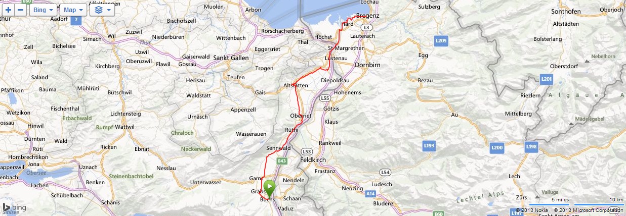 Snídaně byla již od půl osmé, šli jsme ještě dříve a nebyli jsme ani zdaleka první. Průvodce Pavel nás seznámil s možnostmi programu, podle předpovědi mělo začít v devět pršet, ale nikdo nezvolil cestu autobusem a tak jsme již kolem půl deváté vyráželi na závěrečnou etapu. Měli jsme co dělat, protože nás čekalo 60 km a měli jsme na to 4 hodiny, abychom se stihli ještě naobědvat před odjezdem autobusu. Takhle rychle jsme však ještě nikdy nejeli, náš průměr se pohybuje kolem 10 km/hod. V devět hodin opravdu začalo pršet a to docela vydatně. Za první dvě hodiny jsme skutečně dosáhli kýženého průměru 15 km/hod, ale třetí hodinu jsme začali ztrácet. Především v Altstättenu jsme trochu bloudili a nakonec jsme jeli trochu jinou cestou, než radily mapové podklady. Ve Widnau jsme najeli pak na správnou stezku, ale v tu chvíli jsme již věděli, že časově nestíháme a oběd budeme muset oželet. Kousek za Lustenau jsme vjeli do Rakouska, ve Fussachu jsme přejeli Rýn do Hardu a lesoparkem na břehu Bodamského jezera jsme dojeli do Bregenz, kde na parkovišti u vodního divadla čekal autobus. Najeto jsme měli cca 62 km a téměř všechno v dešti. Převlékli jsme se do suchého, pojedli jsme ovadlé zbytky a jenom jsme se těšili, že autobus brzy zastaví v Německu na pumpě a nadlábnem se, což se nakonec také stalo. Do Prahy jsme dorazili kolem 21. hodiny, Martin již čekal a před jedenáctou jsme byli doma. Počasí se tentokrát ale vůbec nevydařilo, přesto to byl docela pěkný zájezd.