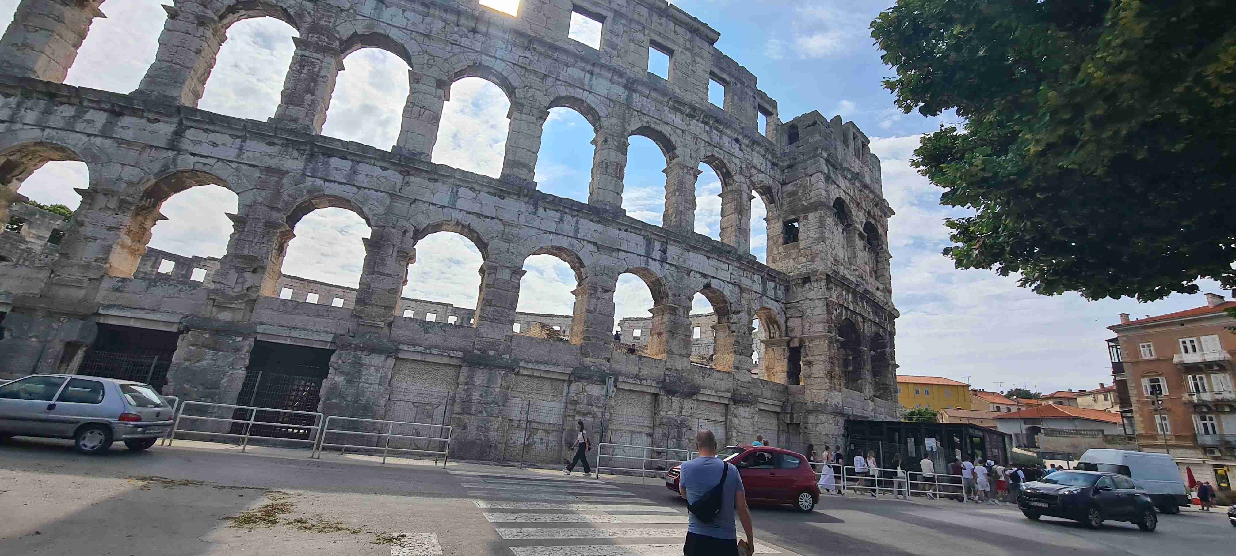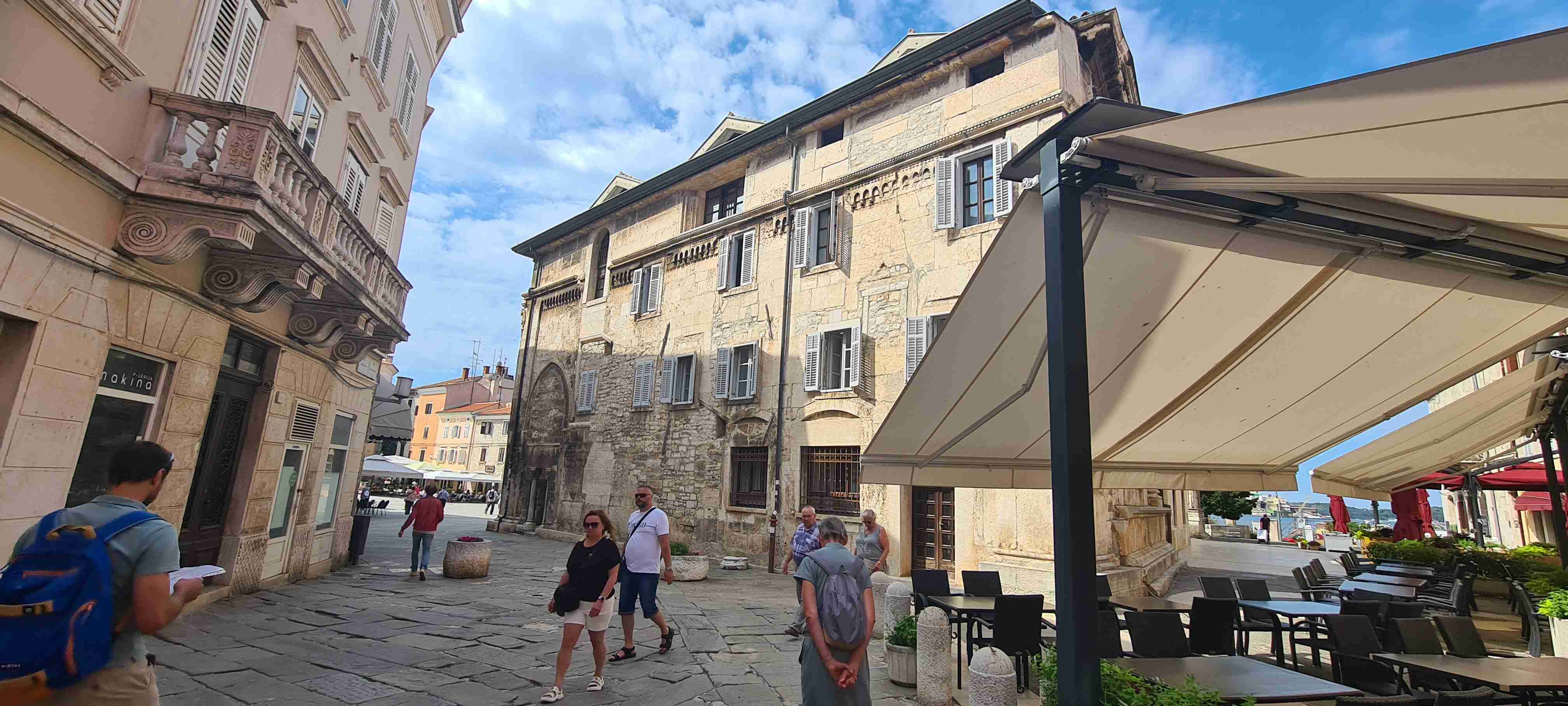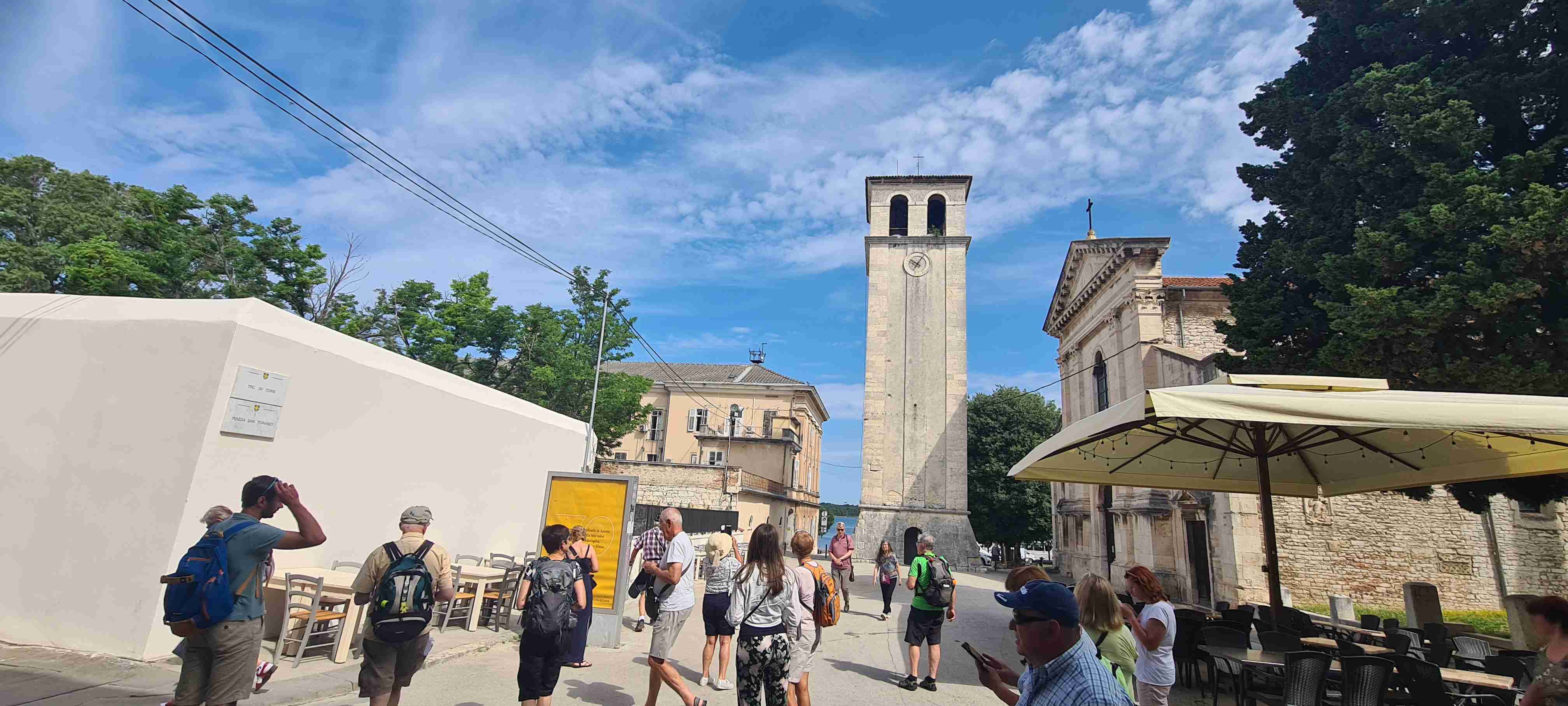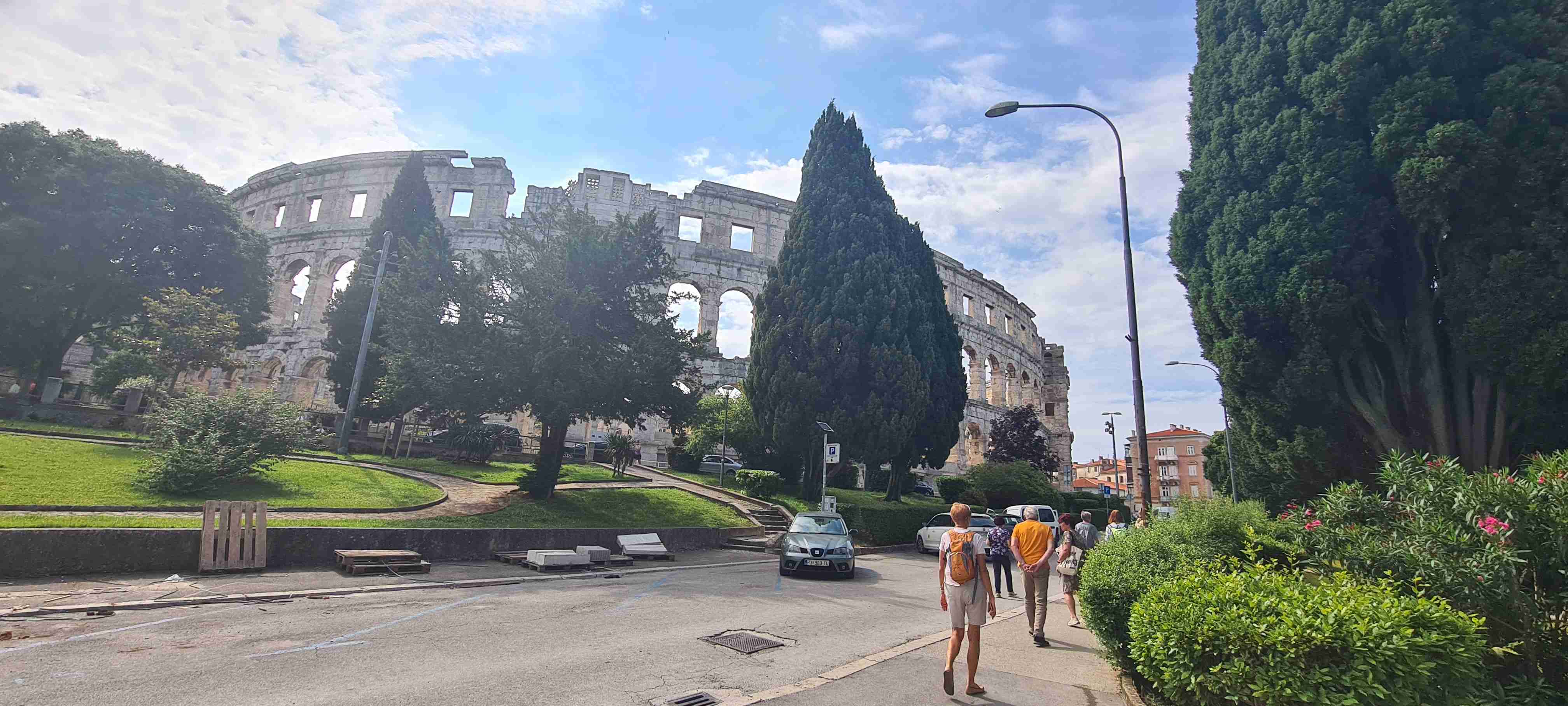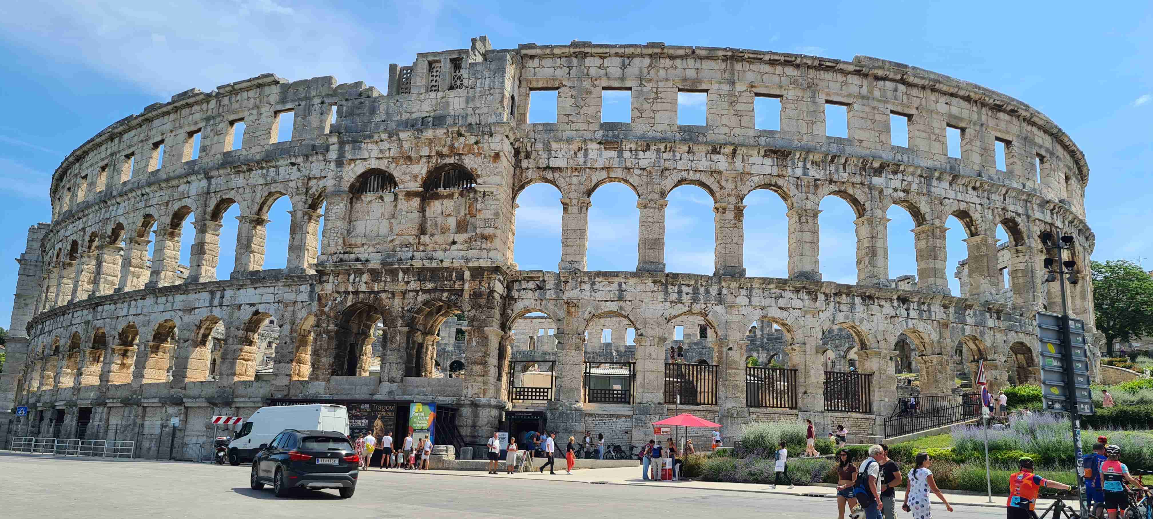 Středa byl den bez kol, ráno jsme vyrazili autobusem od hotelu dříve než obvykle, a to nejprve do Puly. Společně jsme se prošli od parkoviště kolem římské arény až k římské mozaice staré cca 2 000 let. Cestou nám pan průvodce ukázal ještě spoustu jiných pamětihodností, od mozaiky jsme pak pokračovali již každý sám, já podle mapky od CK, došel jsem k vítěznému oblouku a dále až k tržnici. Poté jsem se pomalu vracel k autobusu, kousek od parkoviště jsem našel Ivu v restauraci, a tak jsem si dal také pivo. Autobus dorazil na čas, nasedli jsme a vyrazili do Rovinj. Cesta trvala zhruba hodinu, autobus nás opět vysypal co nejblíže centra a my individuálně vyrazili na prohlídku. Moc jsme tomu nedali, zapadli jsme do jedné restaurace a dali si kalamári na grilu za celkem slušné peníze. Po jídle jsme se pomalu courali městečkem zpět na místo srazu s autobusem, který opět dorazil včas a my se přesunuli do Poreče. I tady jsme se pocourali městem, bylo poměrně vedro, a tak jsme ve stínu na benzínové stanici počkali na náš autobus a kolem půl sedmé jsme se vrátili na hotel. Byl jsem splavený, a tak jsem upaloval do moře. Na večeři jsme díky mému ráchání se ve vodě dorazili o hodinu později, o nic jsme samozřejmě nepřišli, jídla bylo pořád dost.