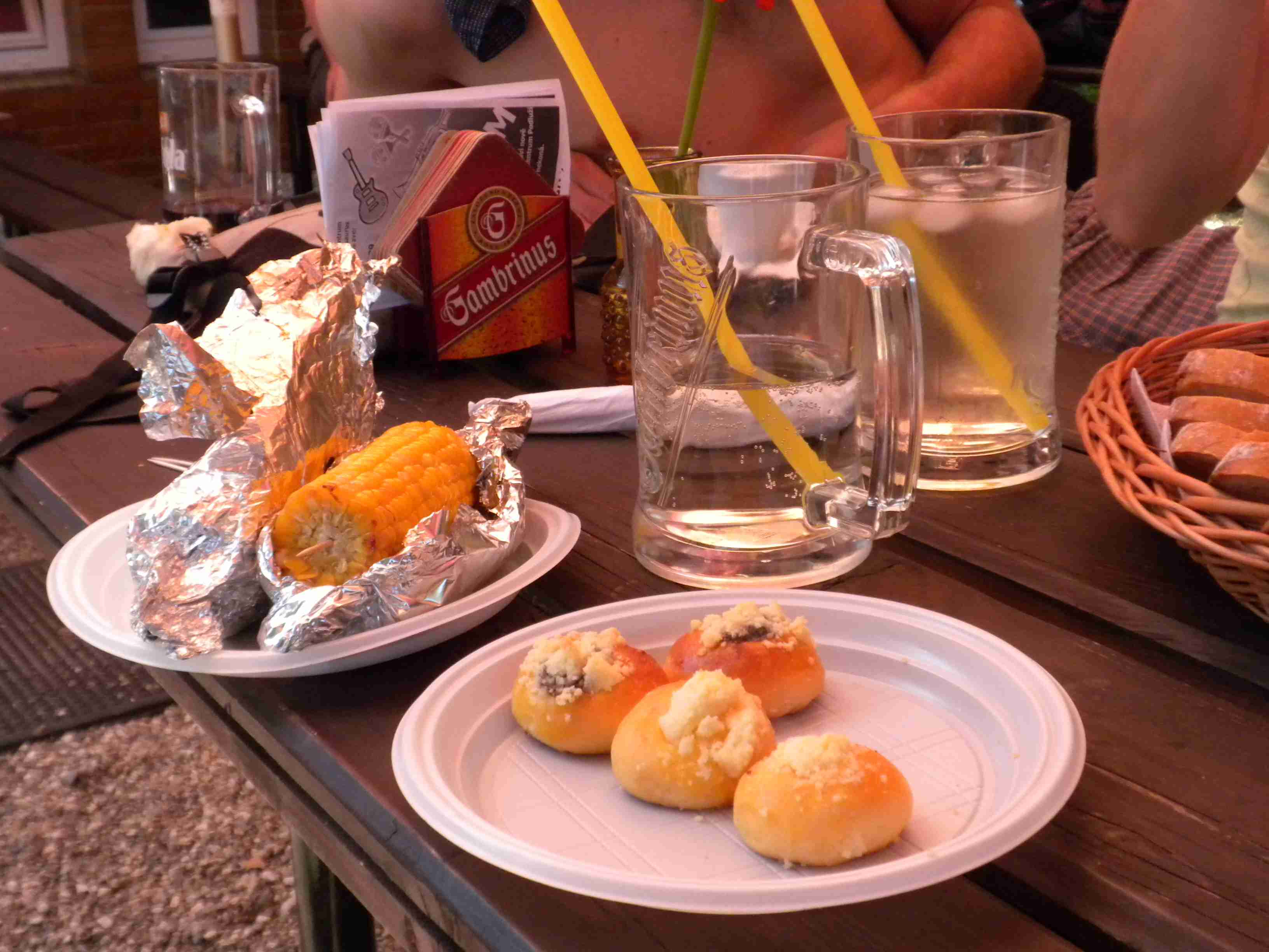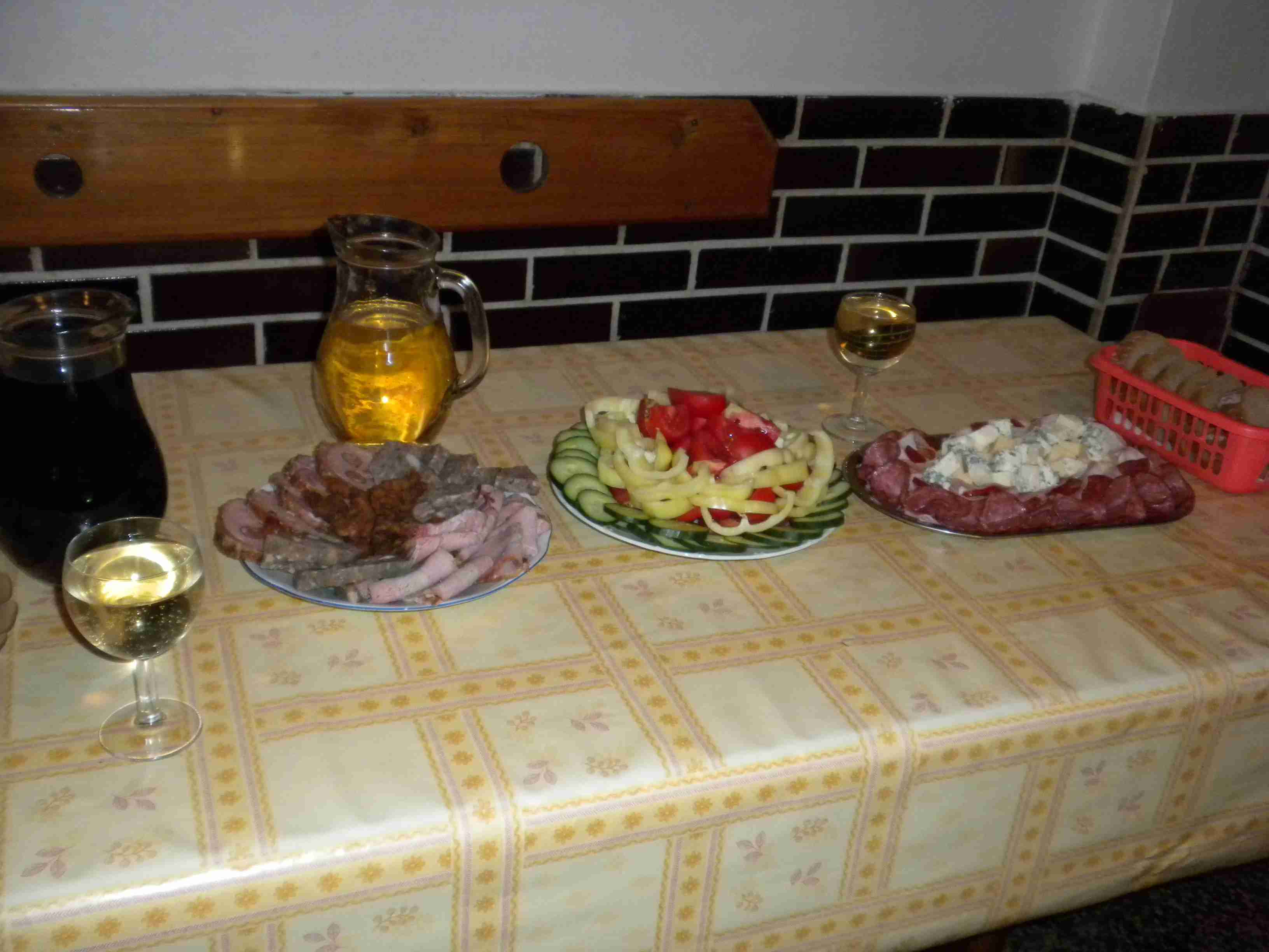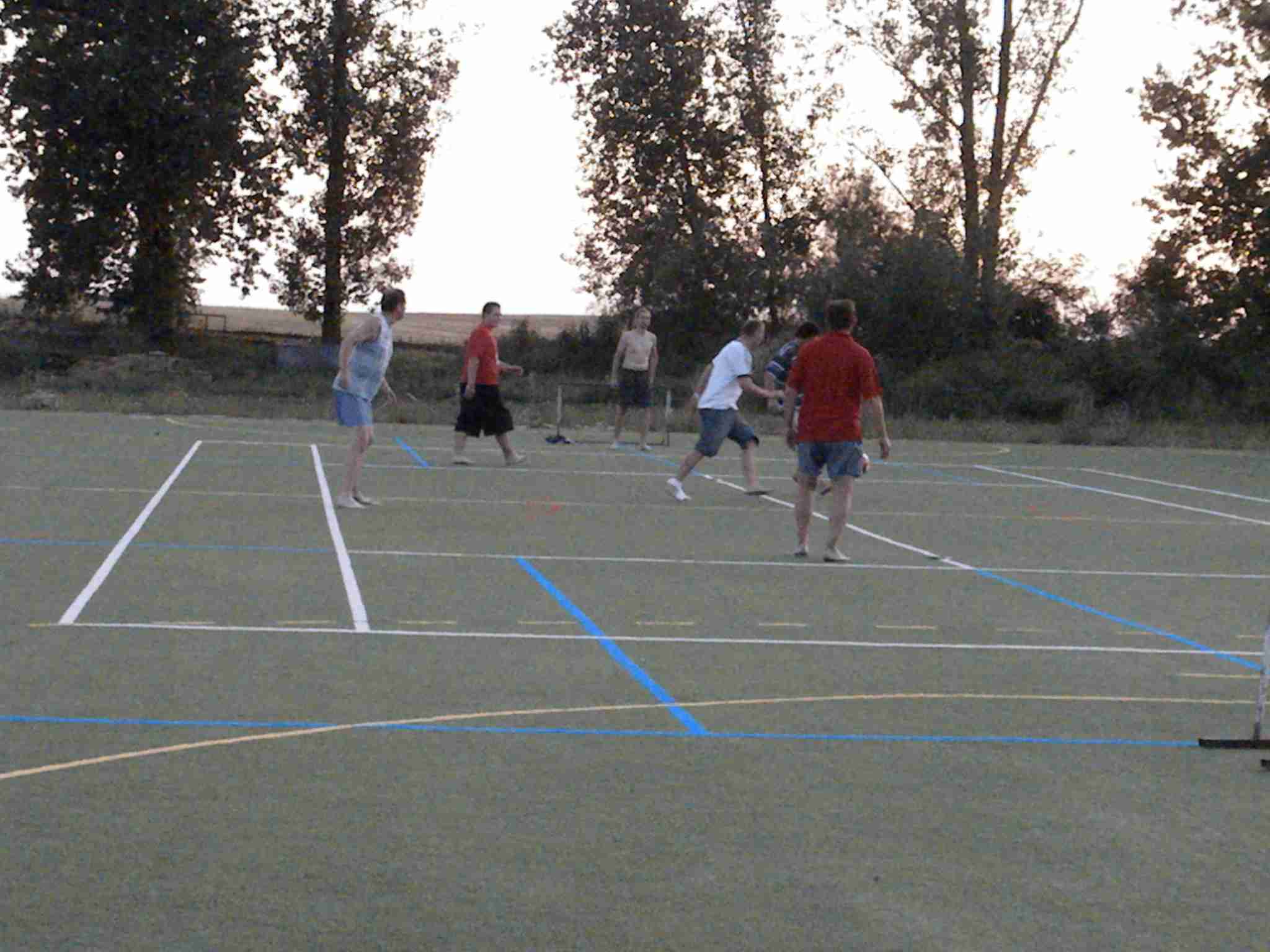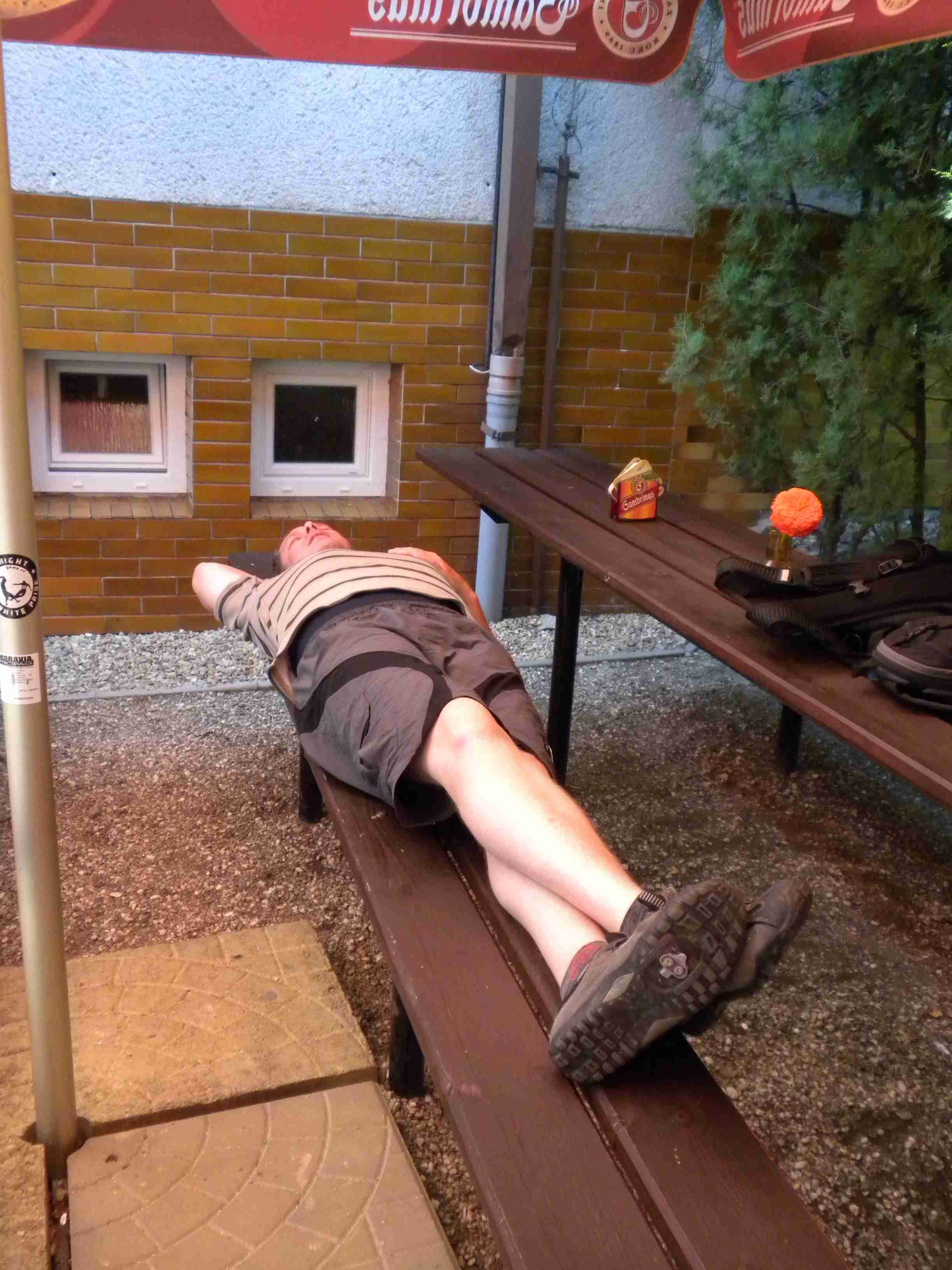 V sobotu ráno bylo jasné, že na kolo už nesednu. Po snídani, stejně vydatné jako včera, jsem i s Pavlem zůstal na baráku, ostatní se vypravili na projižďku směrem Moravská Nová Ves - Mikulčice, před polednem nám Markéta nabídla svezení autem na oběd s ostatními do Mikulčic, my jsme nabídku využili pouze částečně a nechali jsme se vyložit v Moravské Nové Vsi, kde jsme chutně a poměrně levně pooběvali v pohostinství u Sečkářů. Po obědě jsme se vydali pěky zpět do Hrušek, což reprezentovalo cca 4 km, ale v plném slunci. Cesta nám trvala zhruba hodinu, vedro jsme přežili a odpoledne jsme odpočívali u bazénu. K večeři bylo kuře s bramborovým salátem, vše důkladně zalité červeným André, žaludek již protestoval a když se pak objevily i obložené mísy, tak už jsme pauzíroval. Ještě za světla si mladší kolegové zahráli fotbálek proti dalším Laďovým hostům a kupodivu jsme prohráli, přestože ti hosté se blížili mému věku i tělesným proporcím. Vráťa si stihl ukopnout kus palce, protože hráli naboso na umělém povrchu. Sportem k trvalé invaliditě.