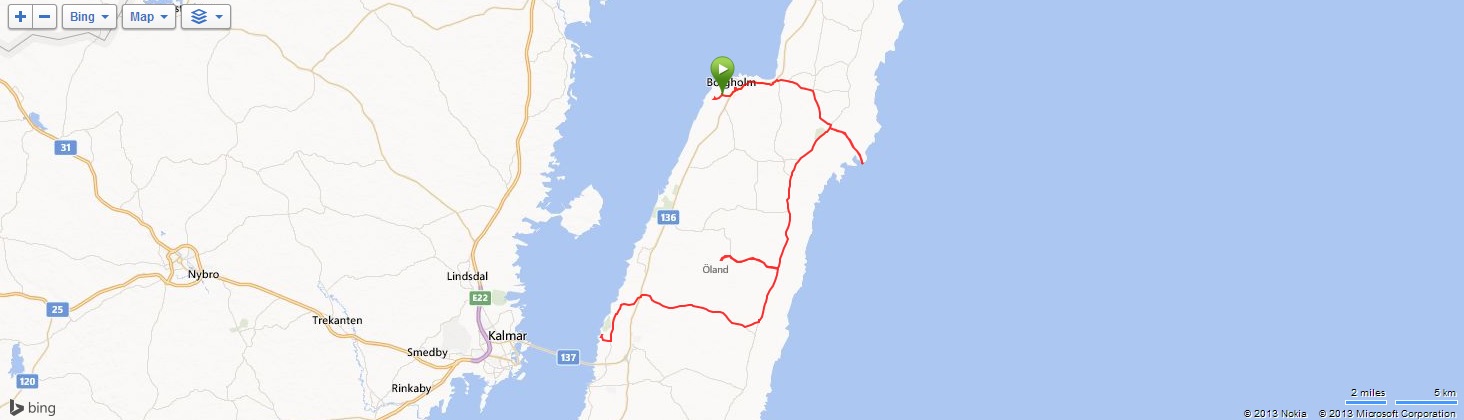 Vráťa v noci přišel a svoji vydatnou snídani - misku se zbytkem jídla z večeře mu vyjedlo nějaké zvíře a ještě se mu před stanem vykálelo! Snídaně v nedělním čase v 8.30 hod. a zhruba za hodinu startujeme busem na sever.Autobus nás vysazuje kousek od města Borgholm na parkovišti u zříceniny borgholmského hradu. Začíná pršet, tak nasazuji přední blatník, který jsme do té doby ještě nepoužil - a dobře dělám, byl užitečný. Z parkoviště pře ruinou jedem nejprve k bráně zámku Solliden, který patří královské rodině, ale je přístupný i pro veřejnost. My jsme jenom nakoukli ještě uzamčenou branou a po navlečení pláštěnek jsme vyrazili směrem k Borgholmu. Městem pouze projíždíme po cyklostezce, která není moc dobře značená, ale navigace nás vede dobře směrem na Köpingsvik. V něm odbočujeme ze severního směru na východ do obce Bredsättra (přestává pršet), kde pokračujeme stále na východ až k pobřeží do místa Kapelludden, kde se ostatky sv. Birgity poprvé dotkly švédské půdy při jejich návratu z ciziny. Na místě byla postavena kaple, ze které jsou dnes již jen ruiny. Je u ještě maják a pár domečků u moře, konají se u prý svatby s domky snad slouží pro novomanžele,jejichž jména jsou pak vyryta do prken mola. Místo má pro Švédy mystický nádech.Vracíme se zpět do Bredsättry a stáčíme se na jih. Projíždíme Gärdlösou, kde je románský kostel, před Lönlöt navštěvujeme prodejnu čarodějky (údajné ekologické aktivistky), kde jsou k mání různé magické předměty, kousek za prodejnou sjíždíme z hlavní (ale velice poklidné silničky) do Himmelsbergy, kde si prohlížíme skanzen a ještě kousek dál v místě Ismantorp je k vidění hromada kamení, zbytky kamenného hradiště. Vracíme se zpátky na hlavní, už jenom sami s Ivou, protože Vráťa s Jirkou nemuseli skanzen a jeli napřed. Pokračujeme na jih, projíždíme Lerkalou se spoustou starých mlýnů a runovým kamenem a v Runstenu se stáčíme na západ do Glomminge. Těch zhruba 11 km bylo utrpením, jeli jsme v protivětru, cesta to byla nekonečná. Z Glomminge je to již asi 6 km po silničce v lese do našeho kempu, kam dorážíme v 18.45. Večeře měla být v 19.00, ale o něco se zpozdila, horší zpráva byla, že řidičům došlo pivo a vítr foukal jako o život.