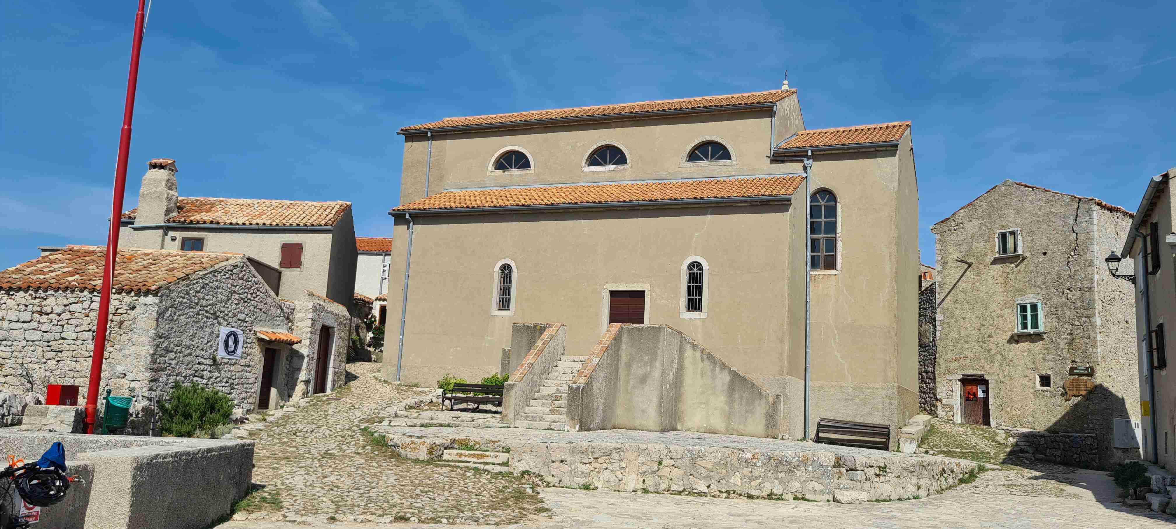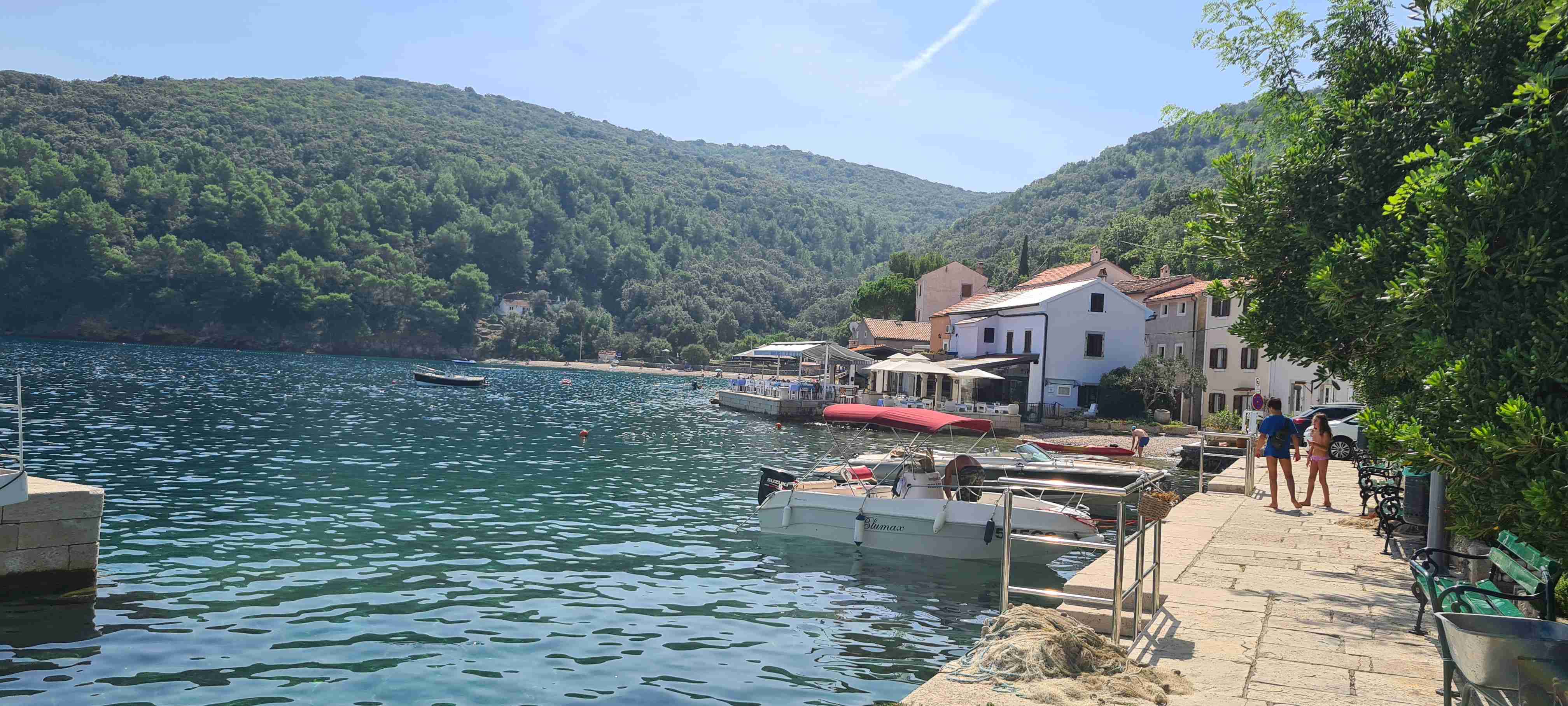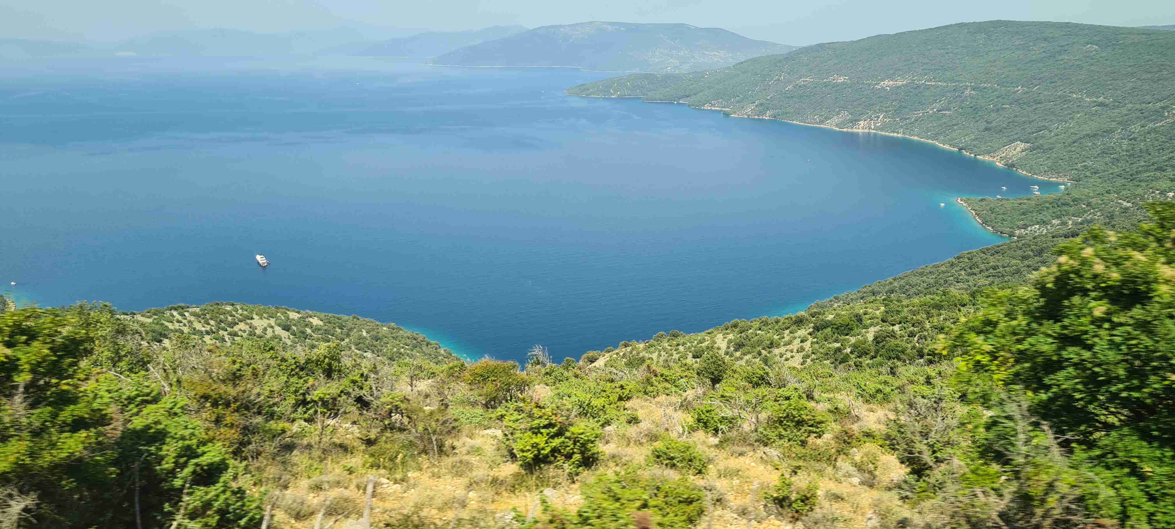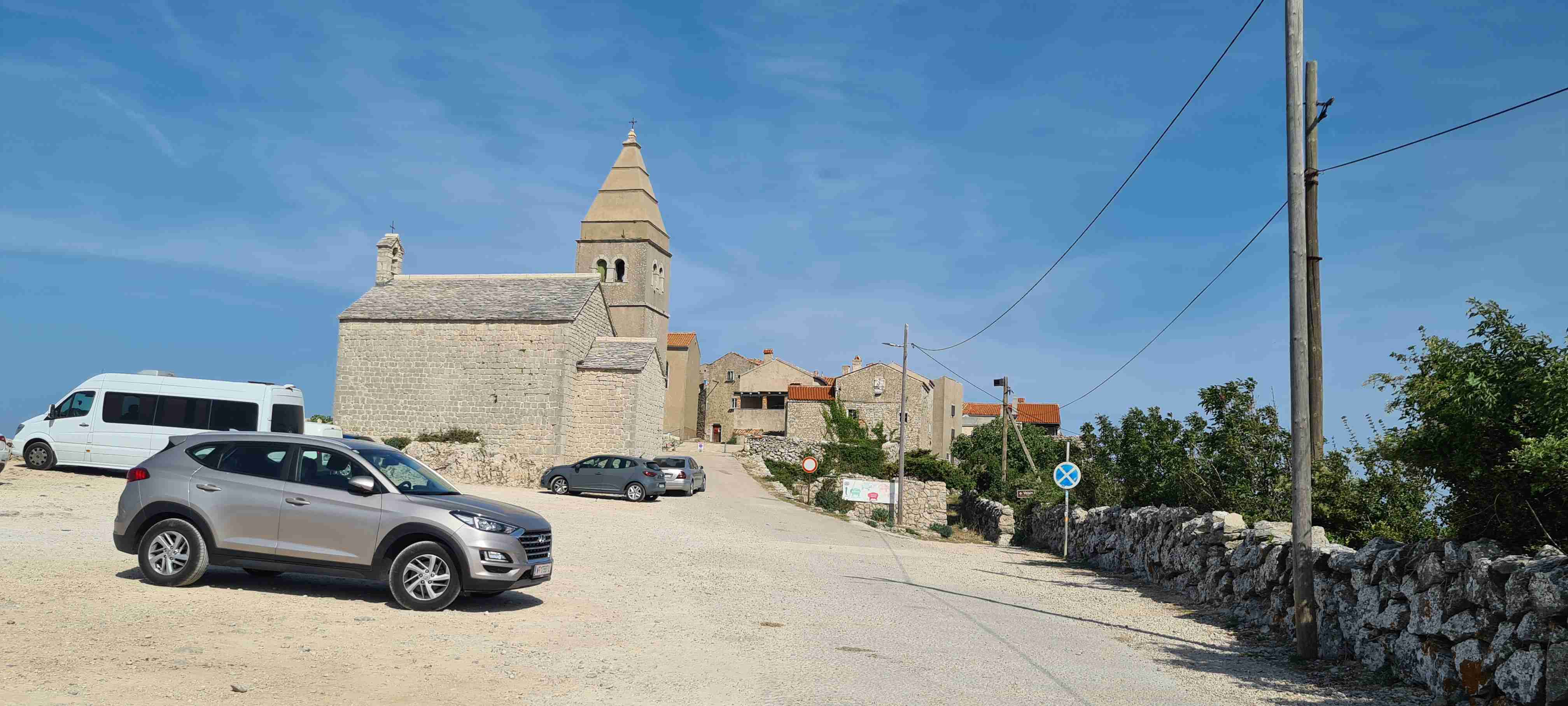 Z autobusu jsme vystoupili po necelé půlhodince jízdy na křižovatce nad obcí Valun a nejprve jsme zamířili do kopců, do nejvýše položené obce na Cresu, do Lubenice. Na 5 km jsme nastoupali přes 250 výškových metrů, abychom si dali v Lubenici pivo, udělali pár fotek obce i zálivu s pláží hluboko dole. Po odpočinku jsme sjeli zpět dolů k autobusu a kolem něj zamířili ještě níže do Valunu, který je břehu moře. Projeli jsme na konec, otočili se a vystoupali nahoru k autobusu. A opět vzhledem k teplotám a naší znalosti cesty, která vedla zase jen po silnici k hotelu, jsme po cca 15 km dnešní etapu ukončili, naložili se do autobusu a opět kolem 13. hodiny dorazili zpět na hotel. Tady jsme zopakovali včerejší scénář, hlavně rychle do moře.