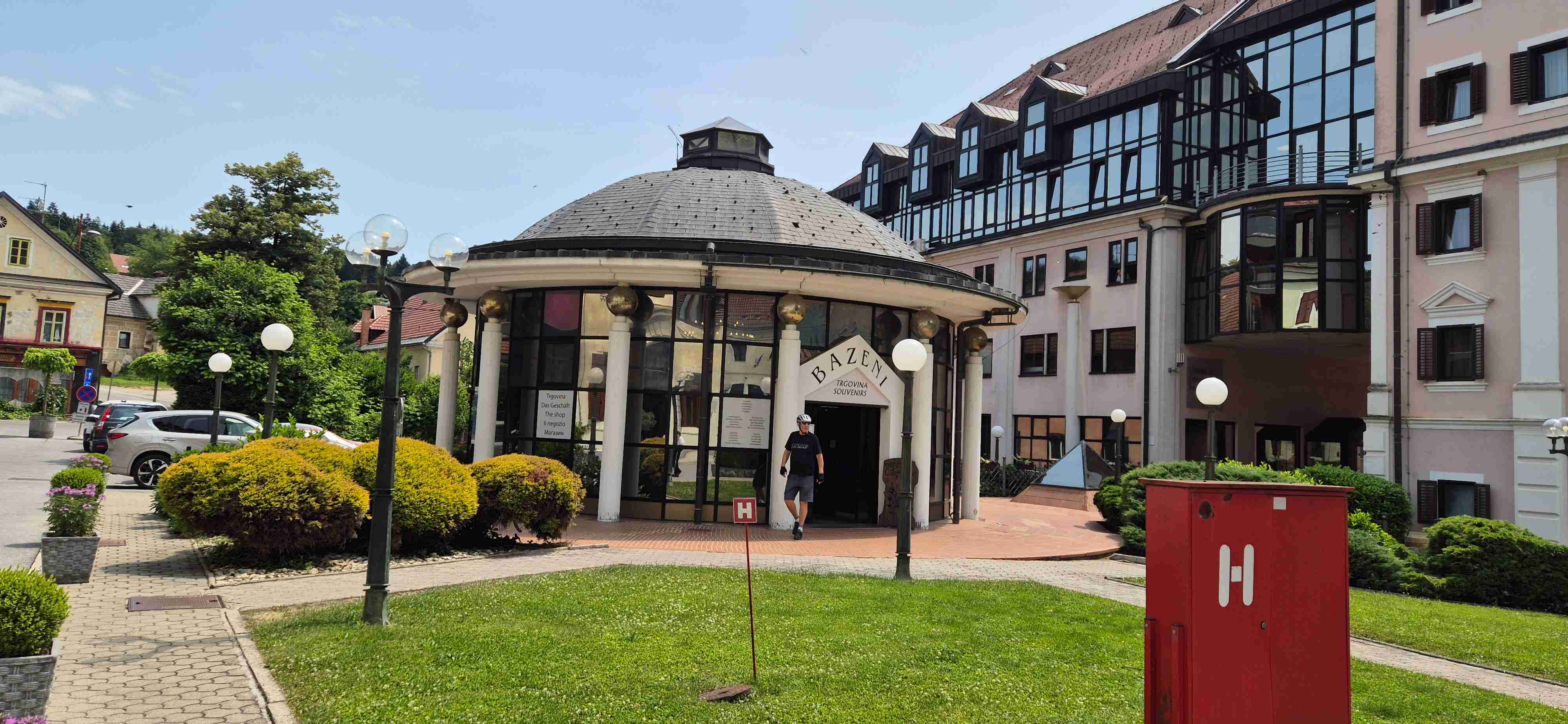 Ráno nás autobus odvezl asi hodinu od hotelu do obce Blatnik, kde jsme nasedli na kola a zahájili naše slovinské cestování. Tentokrát je s námi opět Vráťa a i jeho sestra Darka. No a Vráťa si hned na úvod zapomněl klíče od baterky na pokoji, tak celou dnešní trasu absolvoval bez baterky. Klobouk dolů - přeci jenom bylo na trase pár prudkých výjezdů. Po zhruba 12 km jsme se kousek za obcí Gorenje Sušice přiblížili k říčce Sušica, postupně jsme projeli obcemi na jejím břehu. Říčka se asi 2 km za nejstaršími místními termály Dolenskje Toplice vlévá do řeky Krka. Tady jsme ne chvilku přibrzdili a udělali pár fotek. Před městečkem Novo Mesto jsme po lávce přejeli na druhý břeh, v blízké hospodě jsme si dali pivo a nastudovali zbytek trasy. Po ochlazení jsme pokračovali v cestě, projeli jsme městečkem, udělali fotky a podél řeky Krka zamířili k hotelu. V šoférské restauraci u benzínky vedle hotelu jsme si dali ještě jedno pivo, které vzhledem tropickému počasí jen zasyčelo. Najeto cca 44 km, před večeří jsme hodinku strávili v hotelovém bazénu.