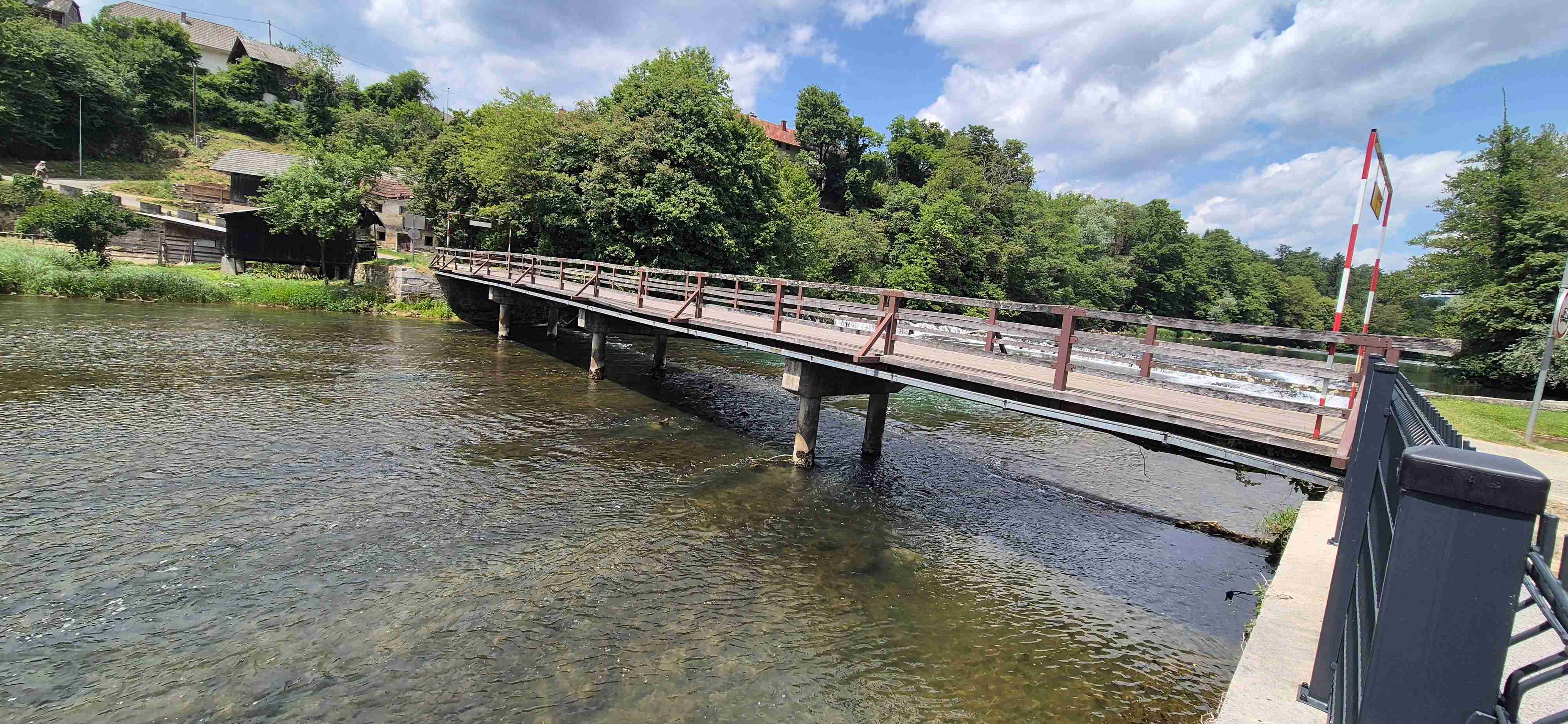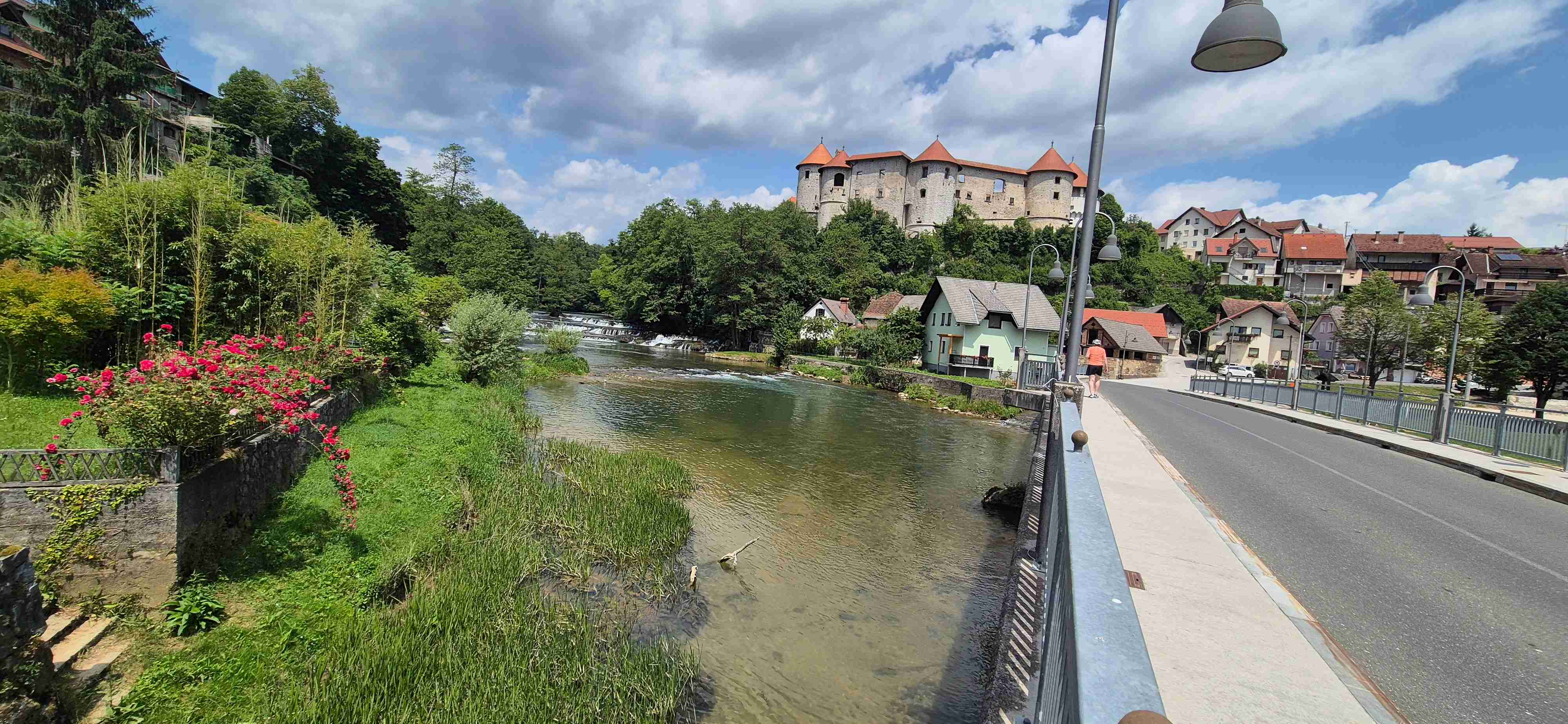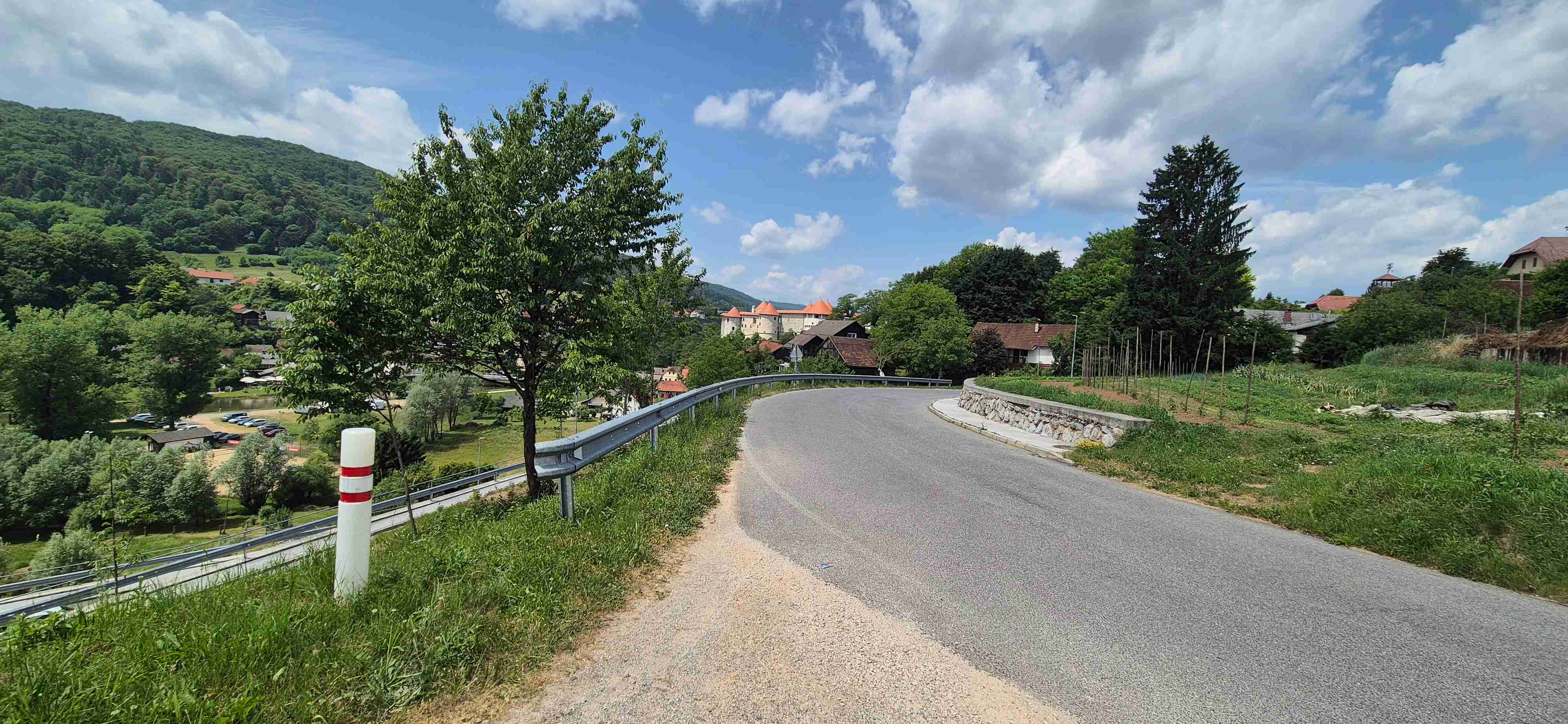 Jenom půl hodiny jsme ráno jeli autobusem do obce Trebnje odkud jsme před desátou vyrazili na kolech. Asi po hodině jsme dojeli do Žužemberku, kde jsme zastavili u stejnojmenného hradu, udělali jsme pár fotek, dali pivečko v přilehlé hospodě a poté jsme sjeli dolů k řece Krka a zbytek etapy jsme víceméně kopírovali její tok. Další zastávka byla v Novom Mestě v hospodě pod mostem, kterou jsme ve čtvrtek minuli. Pak již zbývalo cca 10 km na hotel, ale ještě jsme se kousek od hotelu již obligátně zastavili v šoférské hospodě, kde jsme dnešek ukončili. V opět tropickém vedru najeto něco přes 50 km.