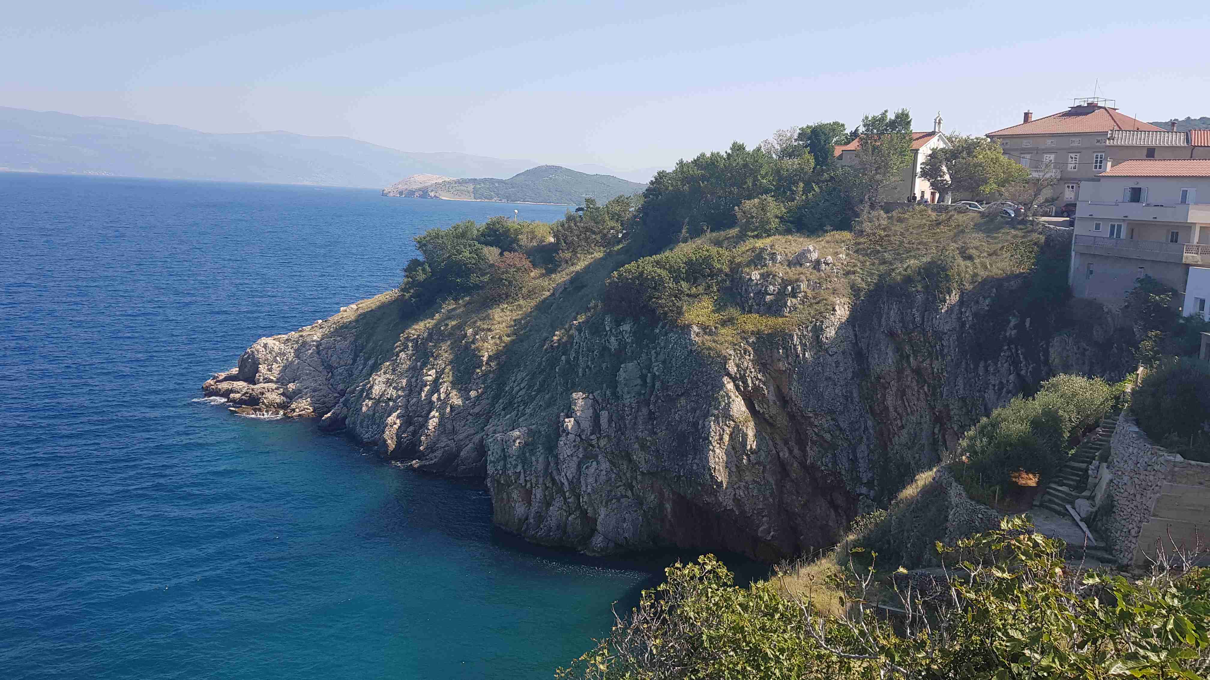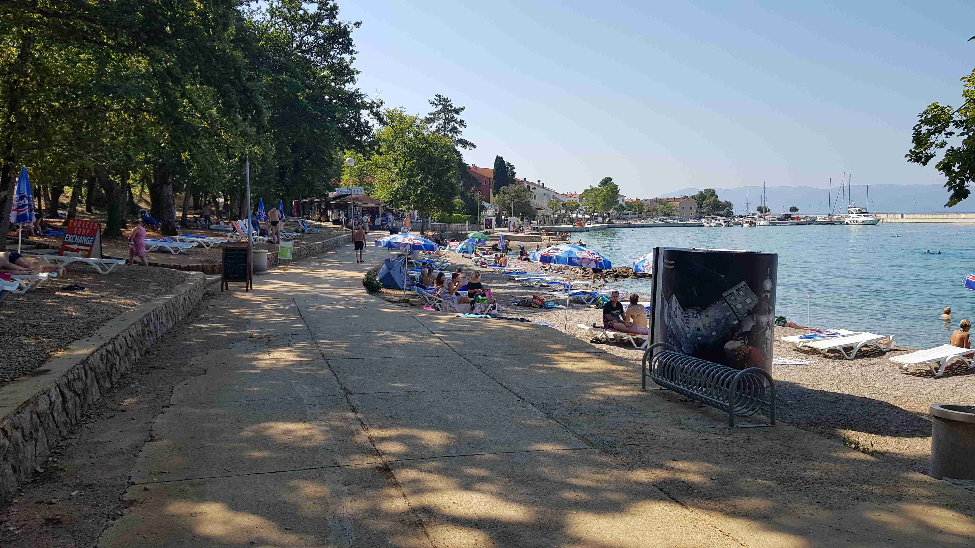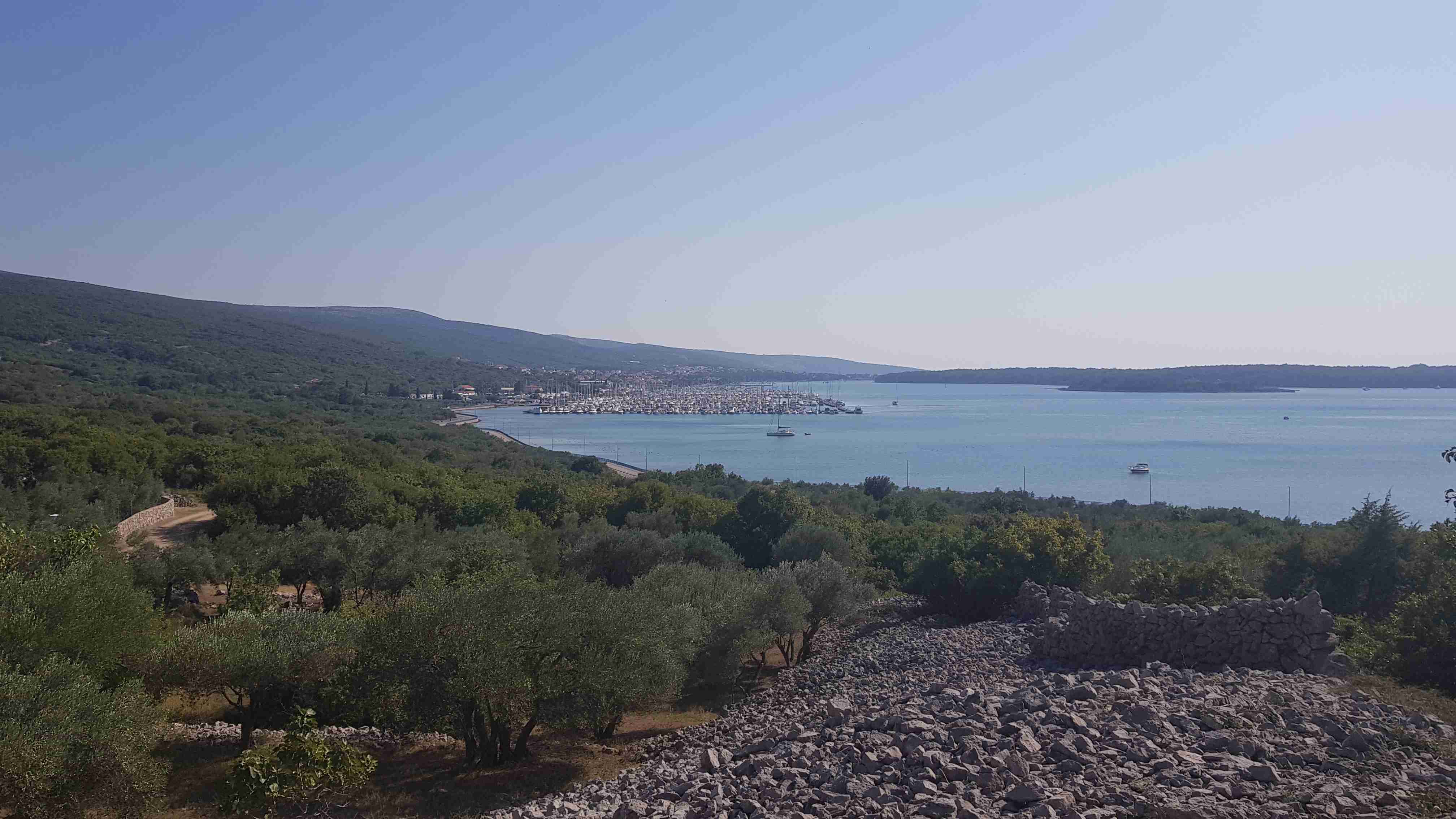 Na ostrově Krk jsme strávili 14 dní v roce 1996 a týden v roce 1997 a tak jsme se na něj vrátili po více jak 20 letech. Nejprve jsme trajektem přepluli cca 20 minut z Meragu na Cresu do Valbisky na Krku, dojeli jsme k hlavní silnici, která prochází Krkem a zatočili doleva na Rijeku. Po pár kilometrech jsme na kruhovém objezdu u Maršiči vyjeli vpravo a před obcí Gabonjin nás autobus vysadil. Všichni pokračovali ve směru příjezdu autobusu, my s Ivou jsme se naopak vrátili na kruhový objezd, který jsme přejeli rovně a vydali se k moři do velkého turistického centra Malinska. Tady jsme u moře zatočili doprava na stezku a po pobřeží zamířili do Njivice, kde jsme kdysi dovolenkovali. Bohužel, kousek před Njivicí stezka končila a já zjistil, že ta správná vede kousek dál a výš od moře. Tak jsme pracně vytlačili kola po kamenech nahoru a dostali jsme se na tu správnou cestu, která nás konečně dovedla do Njivice. Našli jsme místo, kde jsme tenkrát bydleli – pláž stejná, chaty všechny zbourané a místo nich moderní bungalovy. Udělali jsme pár fotek a po hlavní silnici vyrazili zpět do místa, kde nás autobus vyložil. Když jsme tam dorazili, měli jsme už 16 km najeto. Pokračovali jsme dál již v trase zájezdu směrem na Kras, Dobrinj, Gostinjac a Risiku a nakonec jsme sjeli z kopce do Vrbniku. Pomalu jsme projížděli uličkami města, místy jsme museli pěšky, až jsme našli hospodu, kde jsme si dali chobotnicový salát a pivo. Po obědě jsme vyjeli nahoru do kopce nad město a zamířili do města Krk, kam jsme dorazili po celkem cca 46 km a kde čekal autobus. Následoval pak opět přesun k trajektu, trajektem zpět na Cres a hurá na hotel, kde na nás již čekali s posunutou večeří. Takže dne opět žádné koupání.