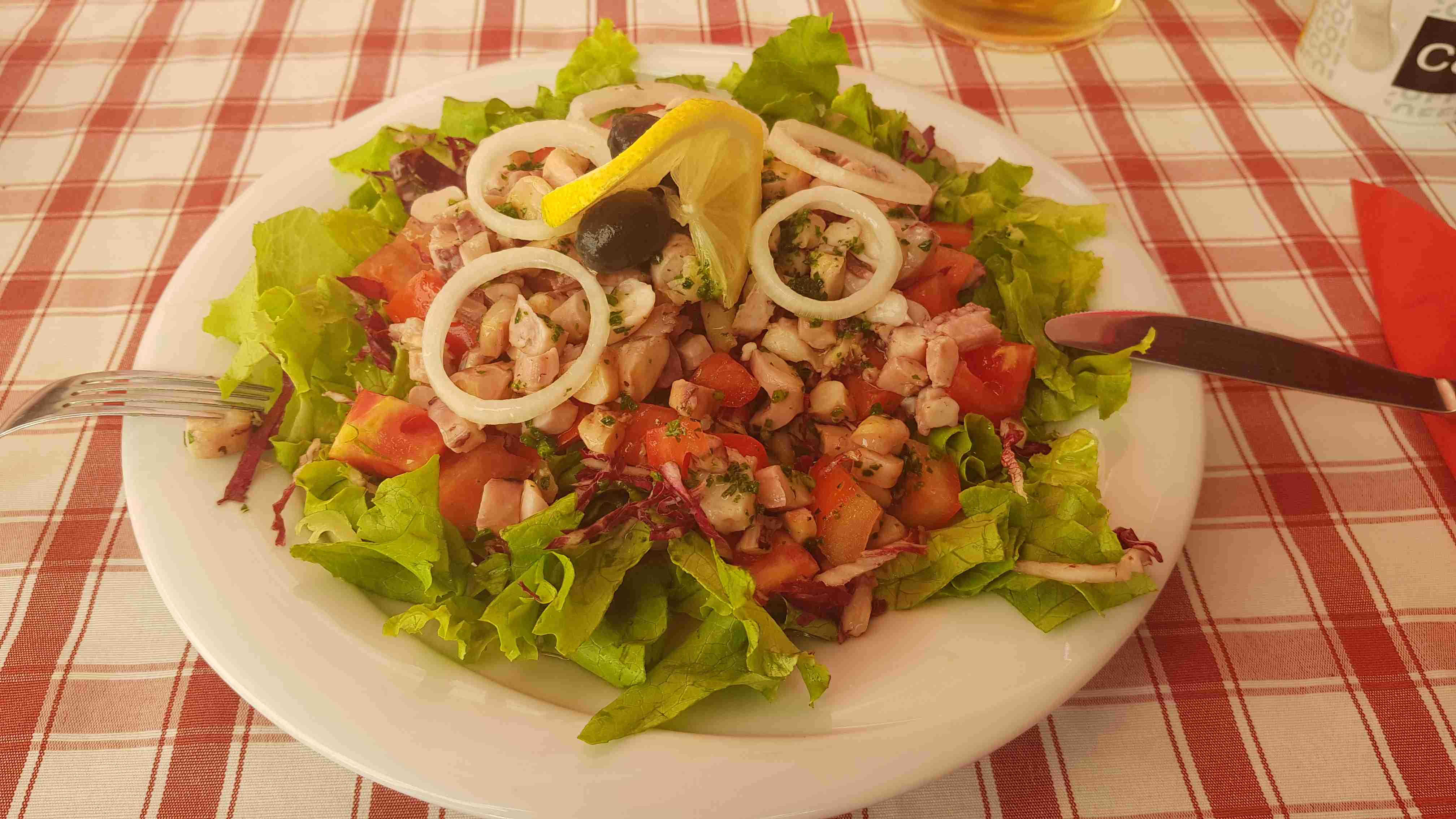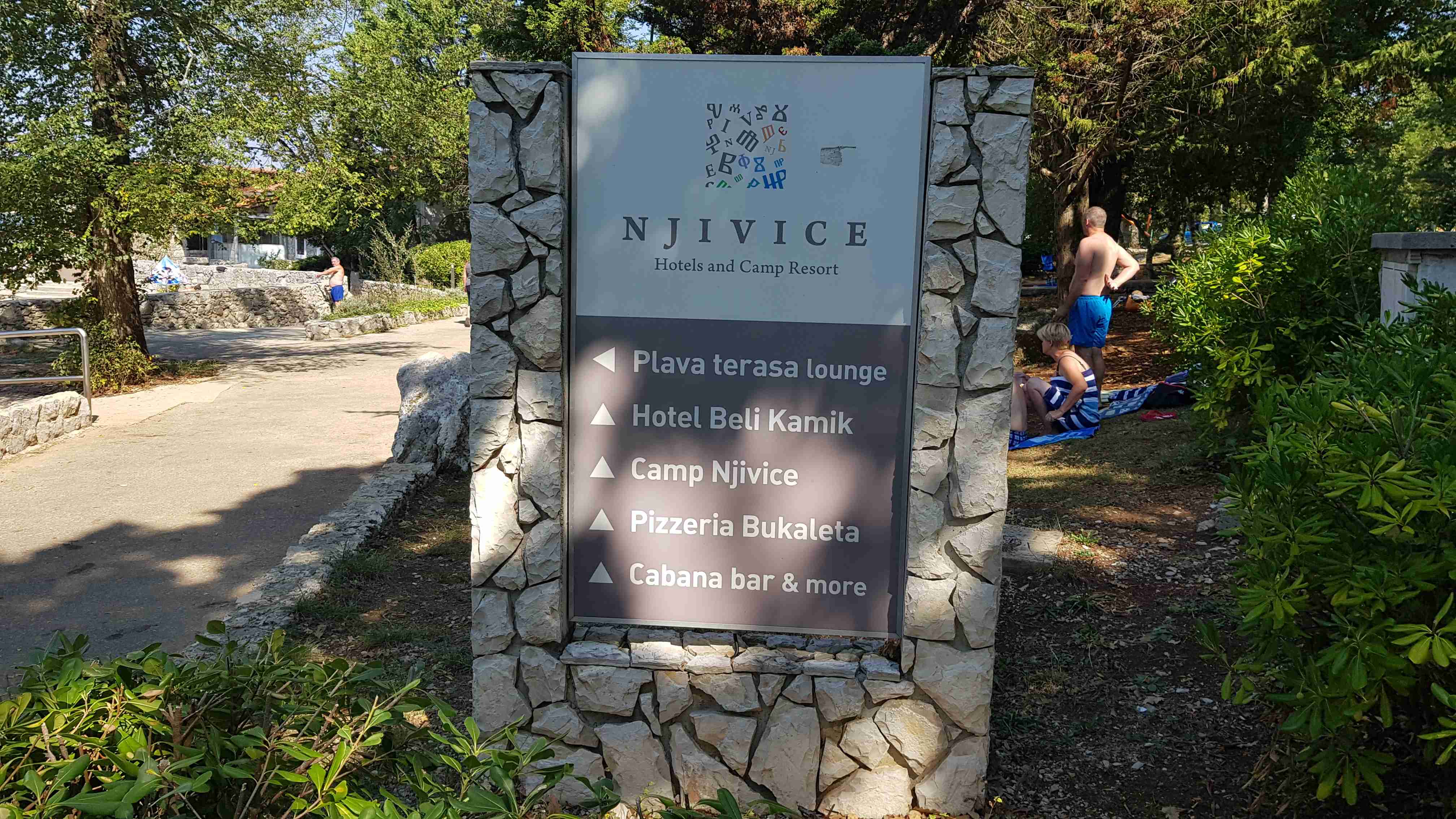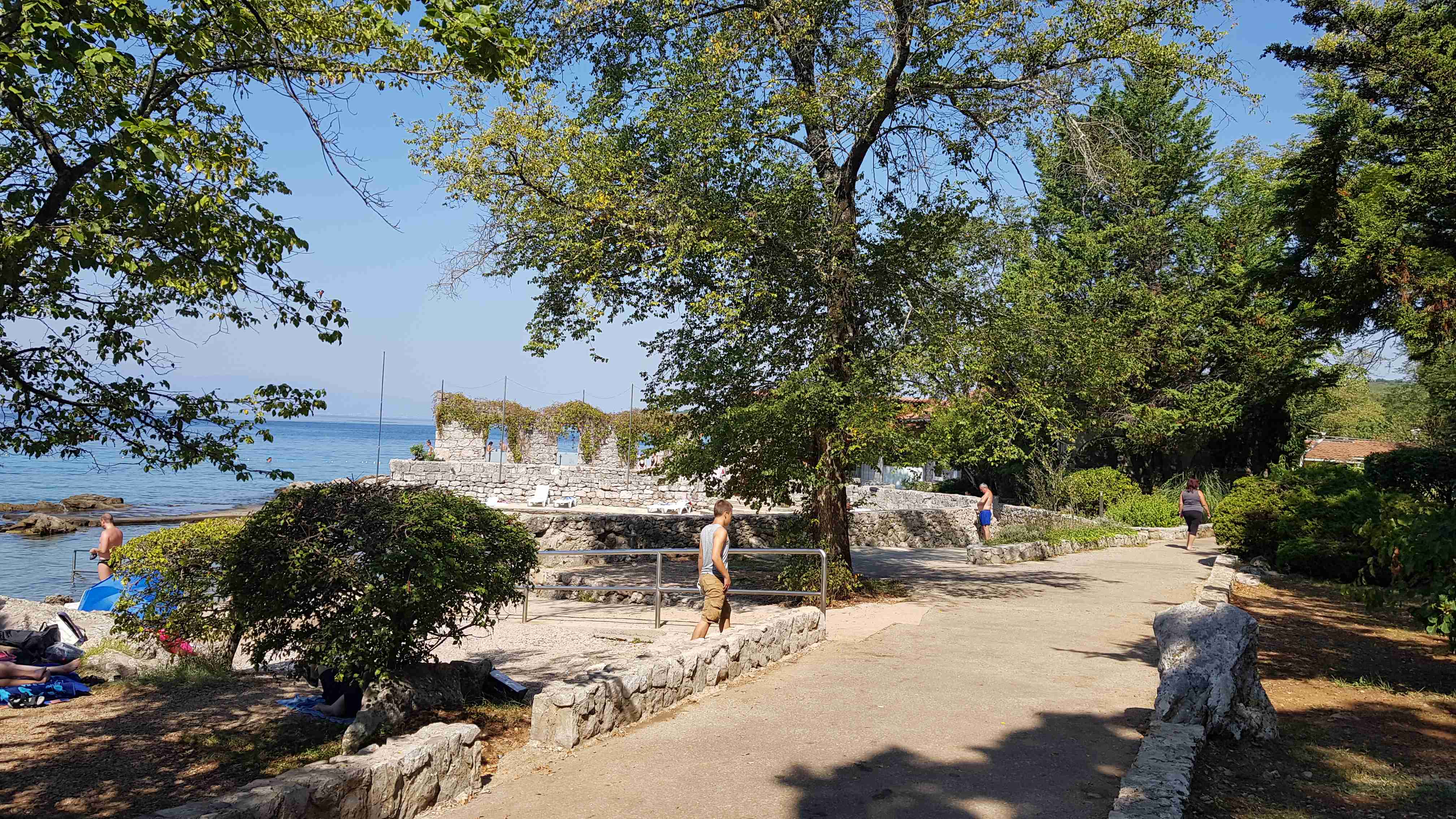 Na ostrově Krk jsme strávili 14 dní v roce 1996 a týden v roce 1997 a tak jsme se na něj vrátili po více jak 20 letech. Nejprve jsme trajektem přepluli cca 20 minut z Meragu na Cresu do Valbisky na Krku, dojeli jsme k hlavní silnici, která prochází Krkem a zatočili doleva na Rijeku. Po pár kilometrech jsme na kruhovém objezdu u Maršiči vyjeli vpravo a před obcí Gabonjin nás autobus vysadil. Všichni pokračovali ve směru příjezdu autobusu, my s Ivou jsme se naopak vrátili na kruhový objezd, který jsme přejeli rovně a vydali se k moři do velkého turistického centra Malinska. Tady jsme u moře zatočili doprava na stezku a po pobřeží zamířili do Njivice, kde jsme kdysi dovolenkovali. Bohužel, kousek před Njivicí stezka končila a já zjistil, že ta správná vede kousek dál a výš od moře. Tak jsme pracně vytlačili kola po kamenech nahoru a dostali jsme se na tu správnou cestu, která nás konečně dovedla do Njivice. Našli jsme místo, kde jsme tenkrát bydleli – pláž stejná, chaty všechny zbourané a místo nich moderní bungalovy. Udělali jsme pár fotek a po hlavní silnici vyrazili zpět do místa, kde nás autobus vyložil. Když jsme tam dorazili, měli jsme už 16 km najeto. Pokračovali jsme dál již v trase zájezdu směrem na Kras, Dobrinj, Gostinjac a Risiku a nakonec jsme sjeli z kopce do Vrbniku. Pomalu jsme projížděli uličkami města, místy jsme museli pěšky, až jsme našli hospodu, kde jsme si dali chobotnicový salát a pivo. Po obědě jsme vyjeli nahoru do kopce nad město a zamířili do města Krk, kam jsme dorazili po celkem cca 46 km a kde čekal autobus. Následoval pak opět přesun k trajektu, trajektem zpět na Cres a hurá na hotel, kde na nás již čekali s posunutou večeří. Takže dne opět žádné koupání.