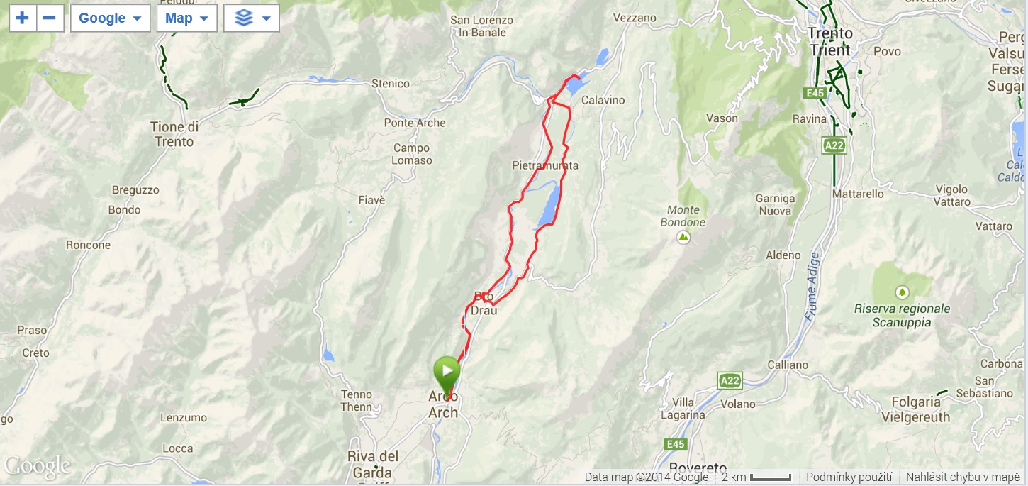 Snídaně v 8:00 byla relativně střídmá - pečivo, šunka, salám, sýr, vajíčko natvrdo. Pro milovníky sladého toho bylo také dost, vč. ovoce. V 8:45 jsme se na kolech přepravili do kempu, kde jsme měli od 9:00 briefing a to na oba následující dny. Cca v 10:00 jsme společně vyrazili od kempu vpravo po cyklostezce směrem na Dro. Stezka vedla mezi vinicemi a plantážemi kivi. V Dro si některí dali zmrzlinu a většina zamířila v čele s Honzou směrem na Pietramurata, ale kopcovitou stezkou. My jsme s Ivou jeli po silnici, která však byla téměř celou cestu, asi 8 km, do kopce a provoz byl docela nepříjemný. Ze silnice jsme sjeli v Pietramurata, na návsi jsme si udělali WC pauzu, dočerpali jsme si vodu do lahví a po cyklostezce podél řeky Sarca a místy ve stínu vzrostlých stromů jsme pokračovali směrem na Sarche. Když jsme dojeli na konec stezky, zatočili jsme po silnici doprava do Sarche a v něm jsme se pak stočili doleva k jezeru Lago di Toblino. Kolem jezera jsme dojeli k "poloostrovu" na kterém je zámek/hrad Castel Toblino, který byl naším dnešním cílem. Na hradě je hogo-fogo restaurace, kam jsme jenom nahlédli a sešli jsme zpět do podhradí, kde jsme si v restauraci na terase nad jezerem dali pivo a tzv. Crepes Insalata, což byla palačinka plněná sýrem a houbami a stačila jedna pro nás oba. Po občerstvení jsme se vydali na zpáteční cestu - vrátili jsme se kolem jezera do Sarche, na první křižovatce vlevo a na kruhovém objezdu zcela vlevo a rovně na Ponte Olivetti. V něm potom doprava a opět téměř po přímce do Pergolese, odkud silnice vede mezi plantážemi kivi a vinicemi podél řeky Rimone, která se vlévá do Lago di Cavedine. Dojeli jsme k jezeru a jeli po silnici podél něj až k restauraci, kde jsme si chtěli koupit něco k pití. Jaké bylo překvapení, když se náhle začali vynořovat kolegové, kteří jeli horskou variantu cesty. Dali přednost koupání v Lago di Cavedine před návštěvou Lago di Toblino, takže my s Ivou jsme téměř jako jediní splnili plán cesty. Chvíli jsme poklábosili a pak jsme společně pokračovali v cestě zpět do kempu. Dokončili jsme cestu kolem jezera a vystoupali nahoru na kopec, kde se před námí otevřel úchvatný pohled na kamenné moře, Dro a skálu s hradem Arco v pozadí. Udělali jsme pár fotek a jali jsme se sjíždět dolů do Dro. Ještě, že jsme to nejeli nahoru, fuj! V Dro si někteří opětovně dali zmrzlinu, tentokrát v té správné cukrárně, a byla prý vynikající. Do Zoo kempu jsme pak dojeli po nám již známé cyklostezce. Zde většina končila, neboť šli ještě na ferraty, my s Ivou jsme pokračovali do Arca, kde jsme si nakoupili víno a sýr (kozí s feferonkou) a kolem 16:45 jsme dorazili na hotel. Provedli jsme hygienu, najedli jsme se na balkonku a vyčkali do 21:00, kdy byl sraz u kostela na společné hodování. Sešla se nás většina a v kavárně hned na náměstí jsme popíjeli víno a plánovali druhý den až do půlnoci. V půl jedné jsme dorazili na hotel a rychle spát.