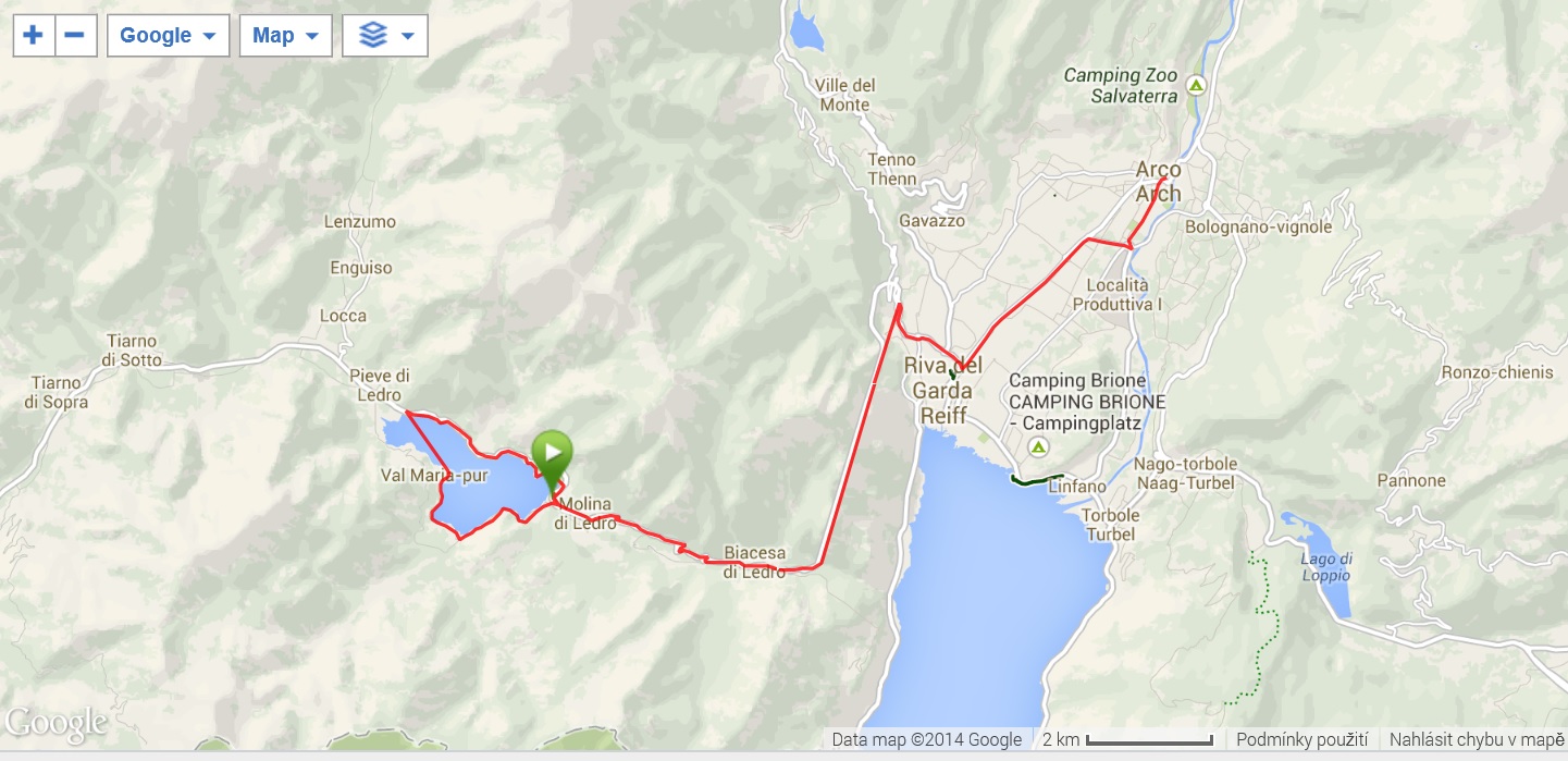 Navigace se mi při cestě kolem jezera na chvíli vypnula a naopak jsme ji zapomněl vypnout při cestě autem zpět do Arca, takže obrázek níže neodpovídá skutečné cestě ujeté na kole. Má omluva![]()