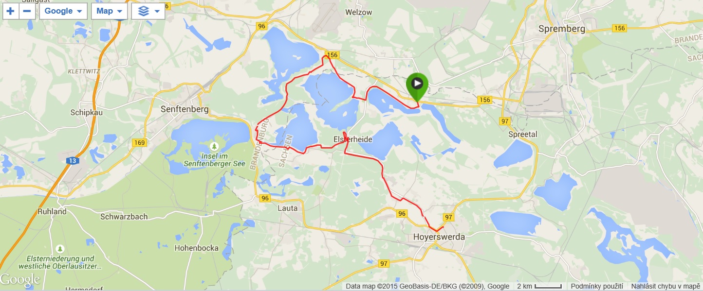 Ráno po půl deváté nás Honza naložil na D8 na poslední pumpě před německými hranicemi. K našemu překvapení jeli dva průvodci - Lubor i Pavel, ale známe je oba, takže dokonalé vedení bylo zajištěno. Mimo mě a Ivy jely ještě tři mladé dívky, pro které to byl první organizovaný cyklistický zájezd, neboť doposud jezdili pouze individuálně. Ideální komorní sestava. Před půl jedenáctou jsem dorazili do Hoyerswerdy k hotelu Achat, kde jsme nocovali i minulý rok. Jelikož bylo ještě brzo, dali nám k dispozici jeden pokoj, abychom se mohli převléknout do cyklistického. Poté nás Honza převezl asi dvacet km od hotelu do obce Bluno, kde jsme začali naši jezerní jízdu. Všichni společně jsme sjeli k jezeru Blunoer Südsee a jeli jsme cyklostezkou po severním břehu. Toto jezero není přístupné veřejnosti, pořád se teprve napouští. Po pár kilometrech jsme dojeli k jezeru Partwitzer See a to již bylo vidět čilý ruch na hladině - plachetnice, motorové čluny, koupající se návštěvníci. Za dalších pár kilometrů jsme dojeli k jezeru Sedlitzer See (opět uzavřeno pro veřejnost), kde se naše cesty rozdělily - Lubor s Pavlem pokračovali v objíždění Sedlitzer See a poté do Senftenbergu, my a děvčata jsme zvolili trasu přímo na jih mezi oběma jezery. V příšerném vedru (předpověď byla až 35°C) jsme podél jezera pokračovali pohodovou jízdou. Nafotili jsme stavědla mezi jezery - nejprve Rosendorfer Kanal mezi Partwitzer See a Sedlitzer See a po pár kilometrech Sornoer Kanal mezi Sedlitzer See a Geierswalder See. Po dokončení napouštění Sedlitzer See se počítá s lodním provozem mezi těmito jezery, tak jako je to již u některých jiných. Zastavili jsme se ve vesničce Kleinkoschen, kde jsme si v pivní zahradě vychutnali studené pivo, neboť voda v našich cyklistických lahvích dosahovala teploty ranní kávy. Po krátkém odpočinku jsme pokračovali k jezeru Geierswalder See podél jehož jižního břehu jsme dojeli k přístavištím lodí , kde jsme si v restauraci u majáku dali opět pivo a trochu jsme se i najedli. Čekal nás poslední úsek cesty a ve chvíli, kdy jsme opouštěli břeh jezera, zjistili jsme, že jsme v místech, kde jsme jeli již loni. Stezka vedla lesem a za podjezdem pod silnicí byla vloni přerušena a my se museli vracet a hledat alternativní cestu. Letos byl můstek přes řeku Schwaze Elster zprovozněn, ale na druhé straně byly ukazatele na všechny možné obce, jenom na Hoyerswerdu chyběl. Kde asi soudruzi z NDR udělali chybu? Vydali jsme se tedy po břehu řeky, kde byla šotolinová cesta, na druhém břehu vedla silnice, po které jsme jeli vloni, takže směr jsme měli správný. Když jsme po pár kilometrech dojeli k mostu, tak se objevilo cykloznačení na Hoyerswerdu, ale pro změnu bylo přeškrtané a tak jsme zvolili jako cestu nejmenšího odporu, cestu po silnici, která nebyla příliš frekventovaná - kdy by taky v tom vedru někam jezdil! Na hranici města jsme pak již opět najeli na cyklostezku a po té jsme po cca 40 km asi v půl páté dorazili na hotel. Nejprve jsme si dali pivo v sousední restauraci a poté se šli ubytovat. Pokoj jsme sice dostali, ale všechny věci jsme měli na provizorním pokoji spolu s věcmi ostatních a tak až když dorazil Lubor s Pavlem, dokončili jsme plnohodnotně ubytování. Večer jsme pak vyrazili za ostatními do řecké restaurace, ale bohužel jsme ji nenašli a tak jsme den ukončili pivem z hotelové pípy.