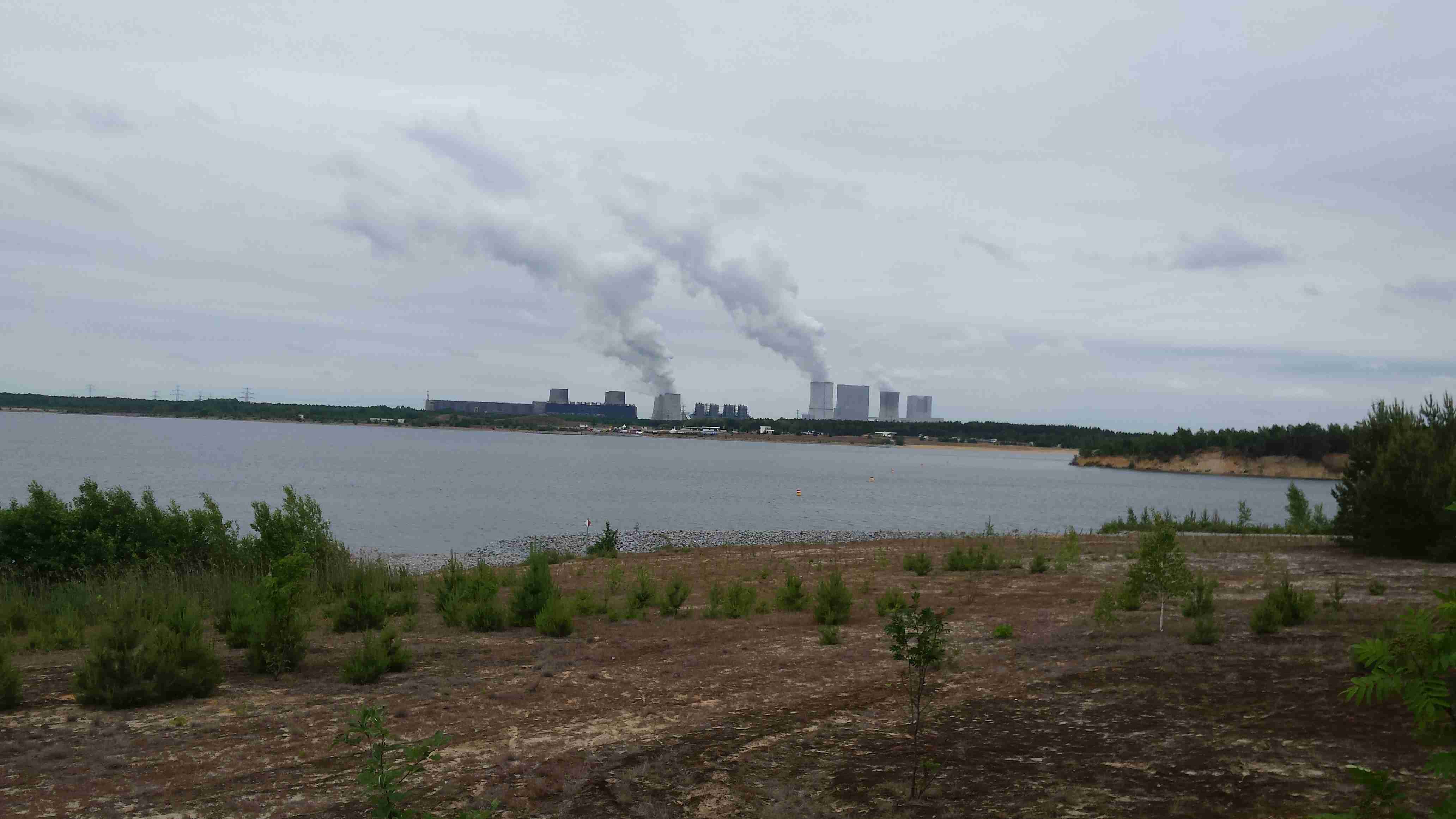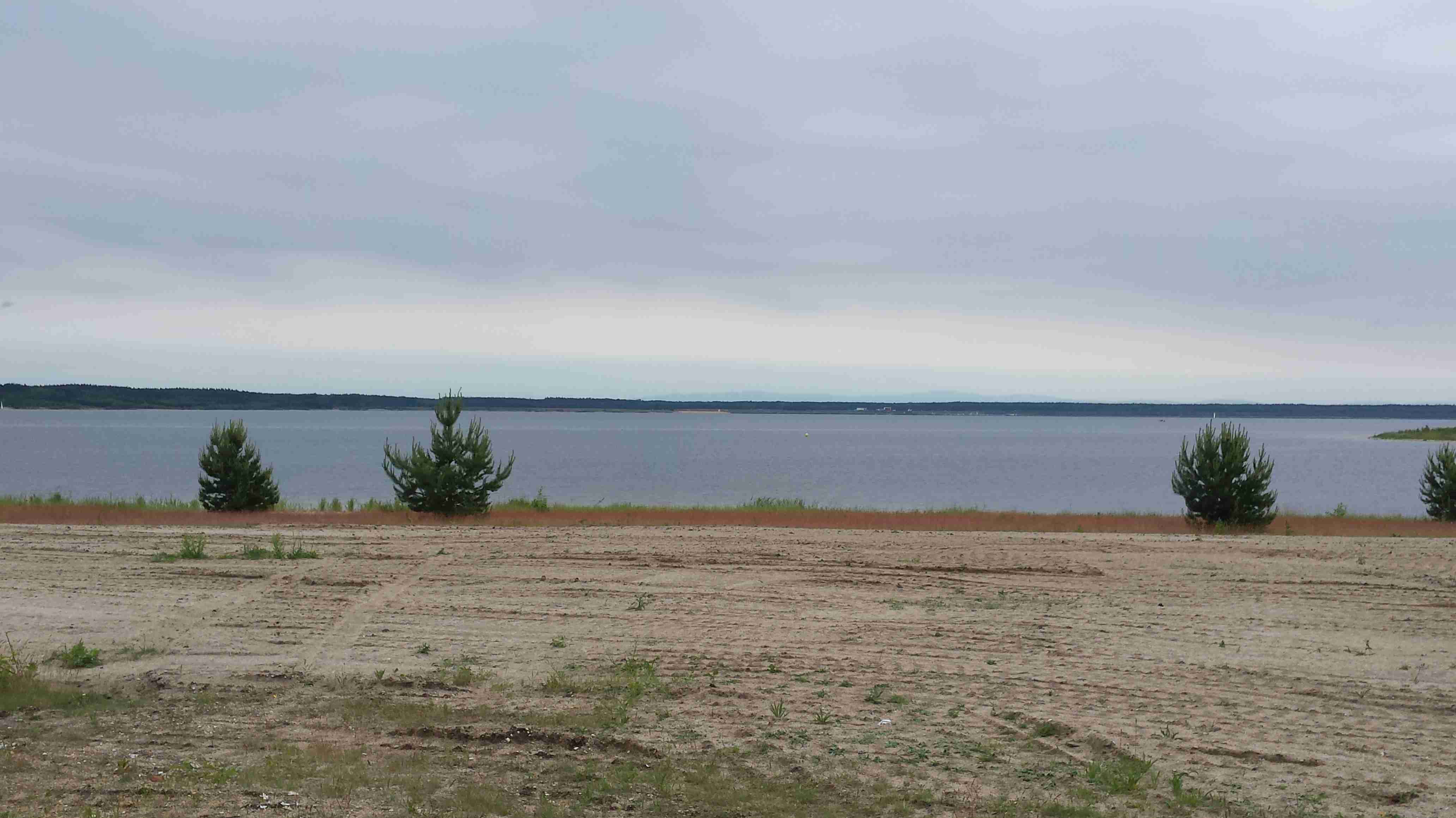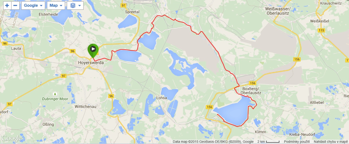 Na snídani jsme vyrazili už v půl osmé, ale spěchat jsme nemuseli - podle předpovědi bylo zhruba o 15°c méně než včera a zataženo. Během snídaně několikrát pršelo a tak jsme se na srazu v 9 hodin rozhodli se sejít v 10 hodin. To už bylo po dešti a tak jsme vše naložili do mikrobusu a vydali se na cestu - dvě děvčata volila jižnější trasu a my zbylí jsme se pod vedením Lubora vydali na severní variantu. Projeli jsme nové město - hornické sídliště ze 70. let a po pár kilometrech jsme dojeli k jezeru Scheibe See a téměř celý severní břeh jsme objeli. Na úrovni Burgu jsme zamířili na sever, projeli Burgem a dojeli k jezeru Bernsteinsee. Podél břehu jsme dojeli do Burghammeru, vzápětí do Burgneudorfu a kousek za ním jsme se stočili na východ a místy podél řeky Sprévy jsme dojeli do Neustadtu. Měli jsme za sebou téměř 20 km bez většího zastavení a tak jsme zvolili občerstvení v pěkné velké restauraci - pivo a řízek s bramborovým saláte. Všem chutnalo a zhruba po hodince jsme pokračovali v cestě. Cyklostezka vedla podél silnice, vpravo jsme měli nějaký vojenský prostor, vepředu v dáli se rýsovalz chladící věže elektrárny Boxberg. V obci Sprey, kousek od jezera Bärwalder See, se nám ztratil Pavel s děvčetem a tak jsme jezero objížděli pouze s Luborem. Na severním břehu bylo přístaviště a různé zázemí včetně informačního střediska, udělali jsme pár fotek a objížděli jsme jezero po východním břehu po kvalitní asfaltové cyklostezce. Pohodovou jízdou jsme dojeli až na jižní břeh u města Uhyst, kde kousek od pláží čekal Honza s mikrobusem, stejně jako vloni byl autobus. Dorazili jsme kolem 15. hodiny po necelých 50 km a protože jsme měli ještě čas do odjezdu, zašli jsme do stánku na pláži na pivo a kafe. Postupně do stánku dorazili i ostatní, dali si něco k jídlu, u mikrobusu jsme pak udělali závěrečné foto, dopili naší meruňkovici a po půl páté vyrazili k domovu. Do Ústí jsme dojeli krátce po čtvrt na sedm, na zprávy jsme byli doma. Místo na gauči jsme strávili víkend v sedle kola ve společnosti příjemných lidí.
