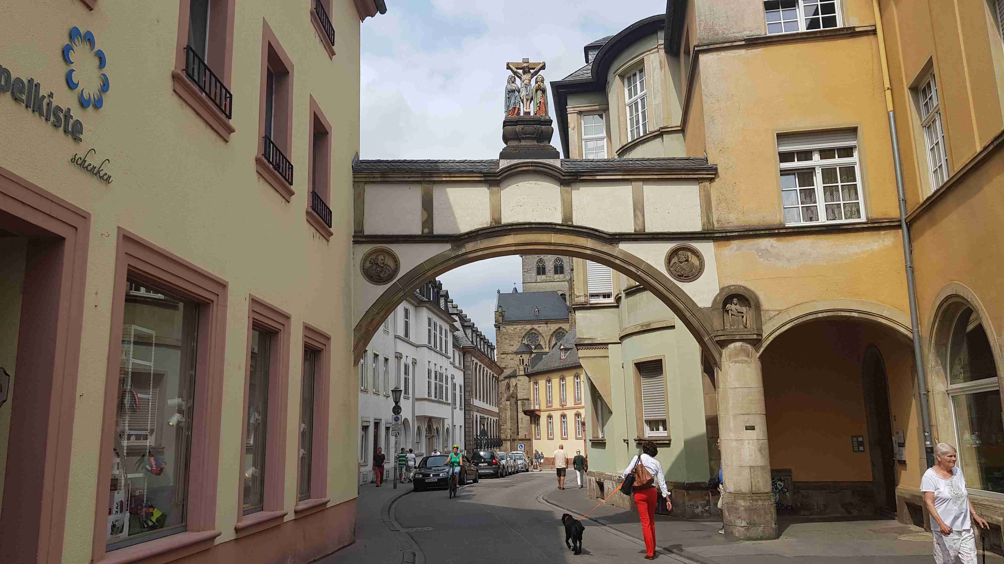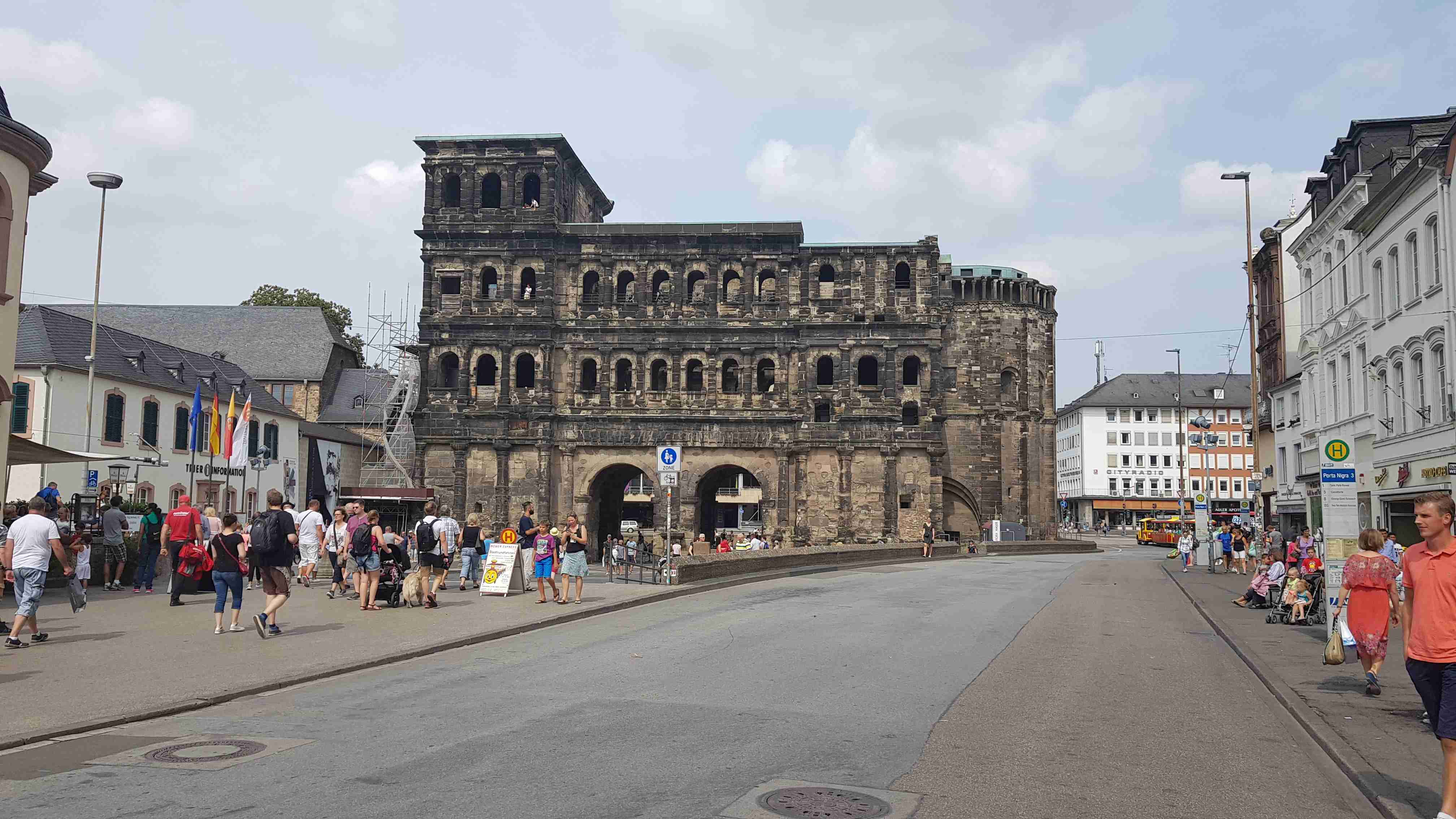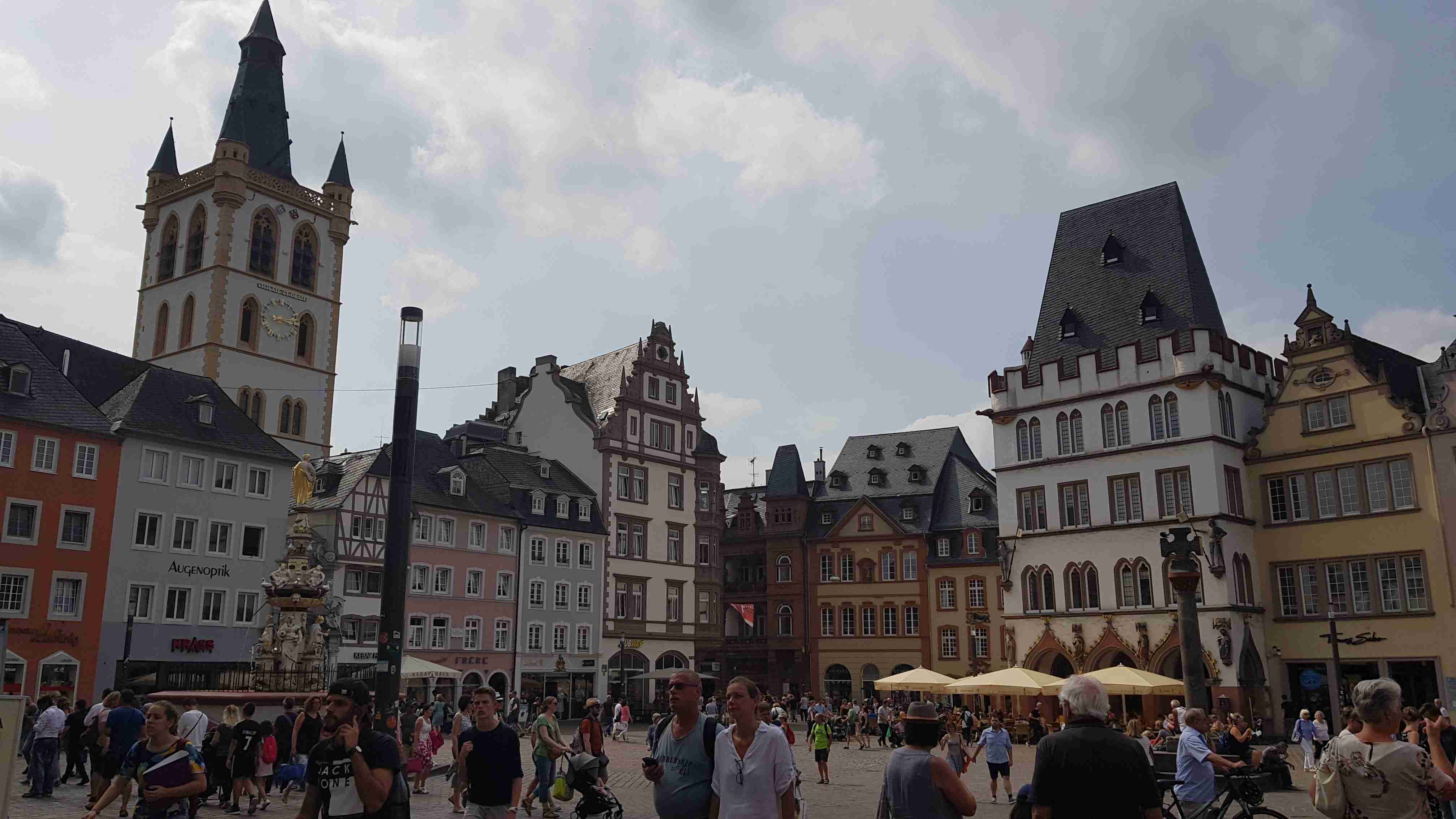 Autobusem jsme se ráno přepravili do Hermeskeilu, což bylo skoro hodinu a půl cesty. Odtud jsme pak vyrazili na kolech po Ruwer-Hochwald Radweg, jenž vedla opět po bývalé železniční trati, do Trevíru, jednoho z nejstarších měst v Německu. Bylo pod mrakem, a tak cesta byla oproti předchozím hodně slunečným dnům příjemnější. Po cyklostezce jsme dojeli do Trevíru, projeli okrajem města a našli jsme autobus parkující kousek od císařských lázní. Kola jsme nechali u busu a pěšky vyrazili do centra, které jsme již znali z naší předchozí návštěvy. Došli jsme až k Porta Nigra, kde jsme si v restauraci u infocentra dali pivo a víno a pomalu jsme se vrátili k autobusu a odjeli zpět na penzion.
