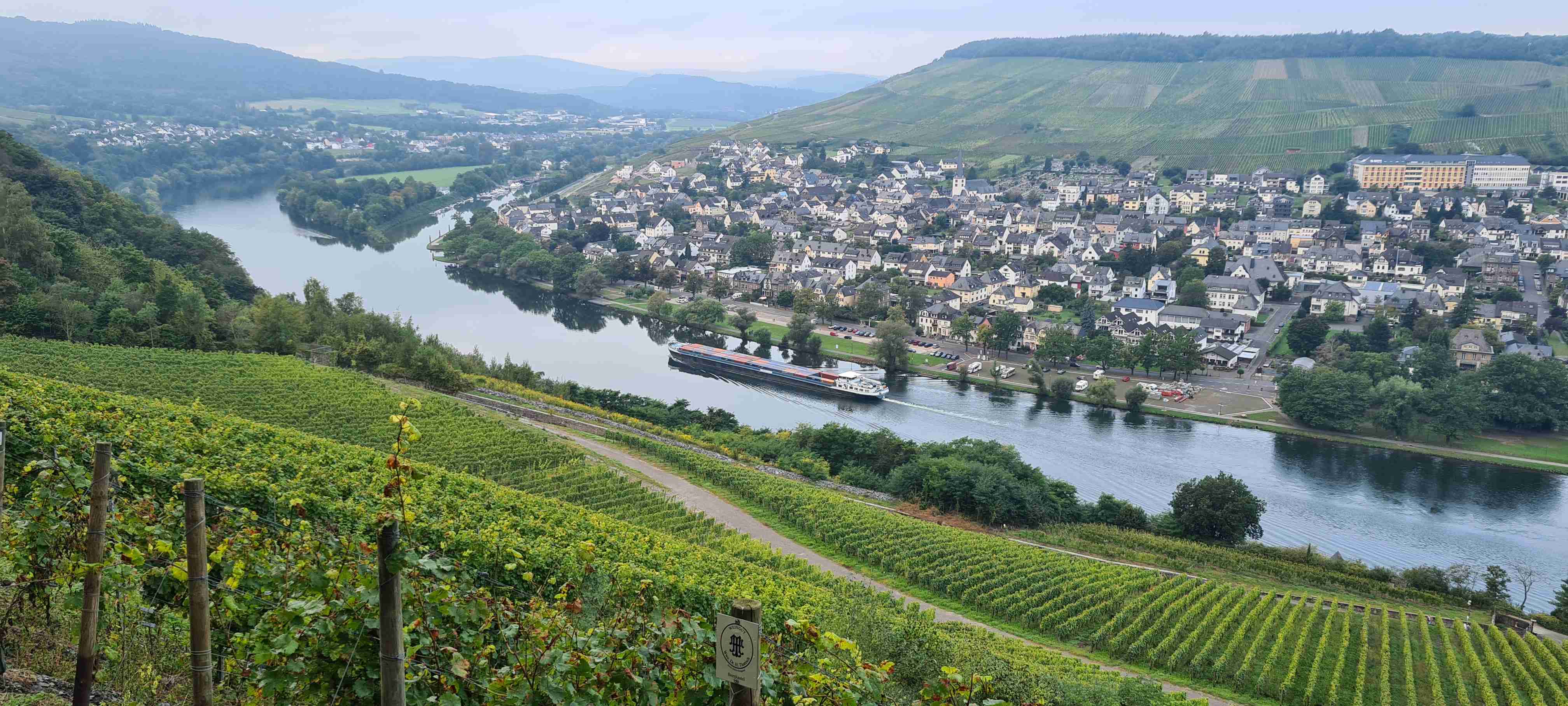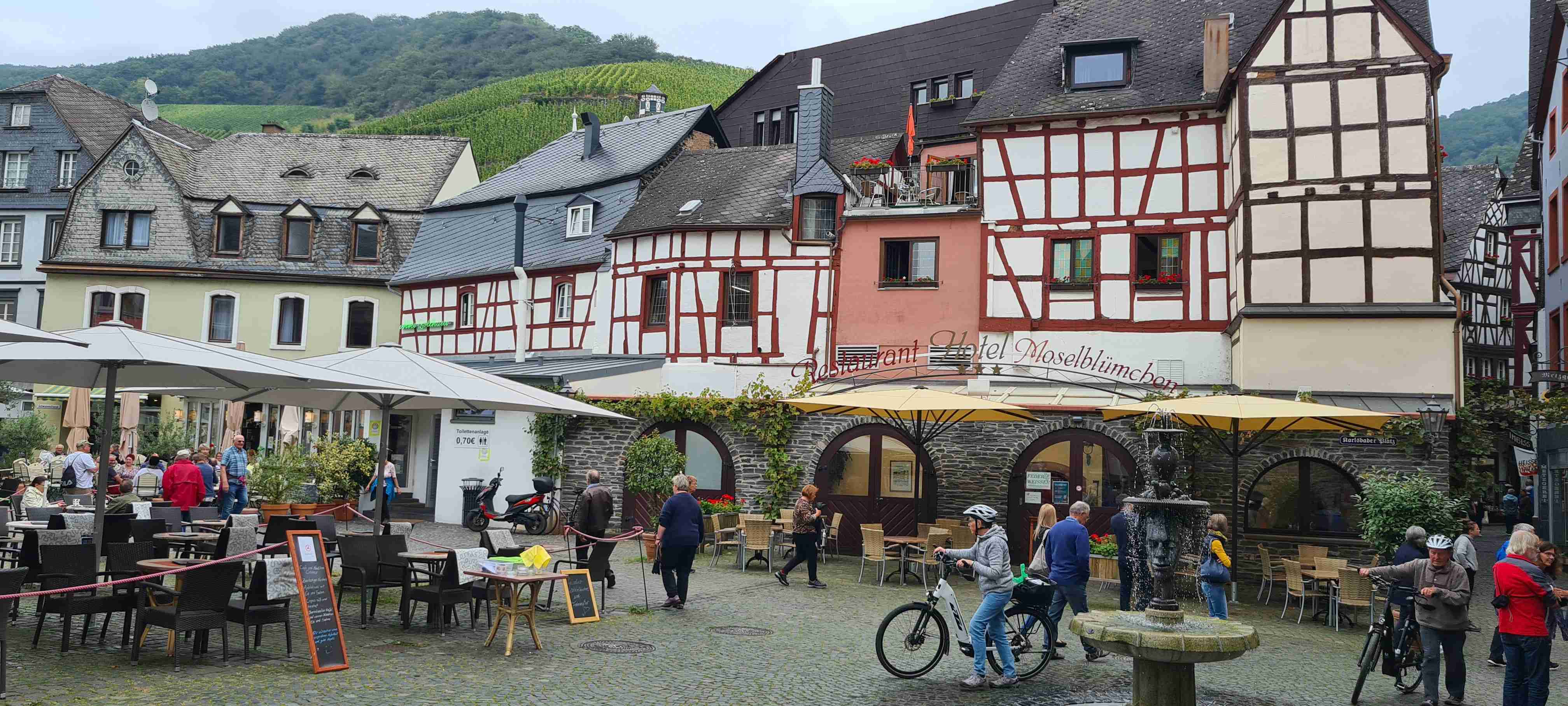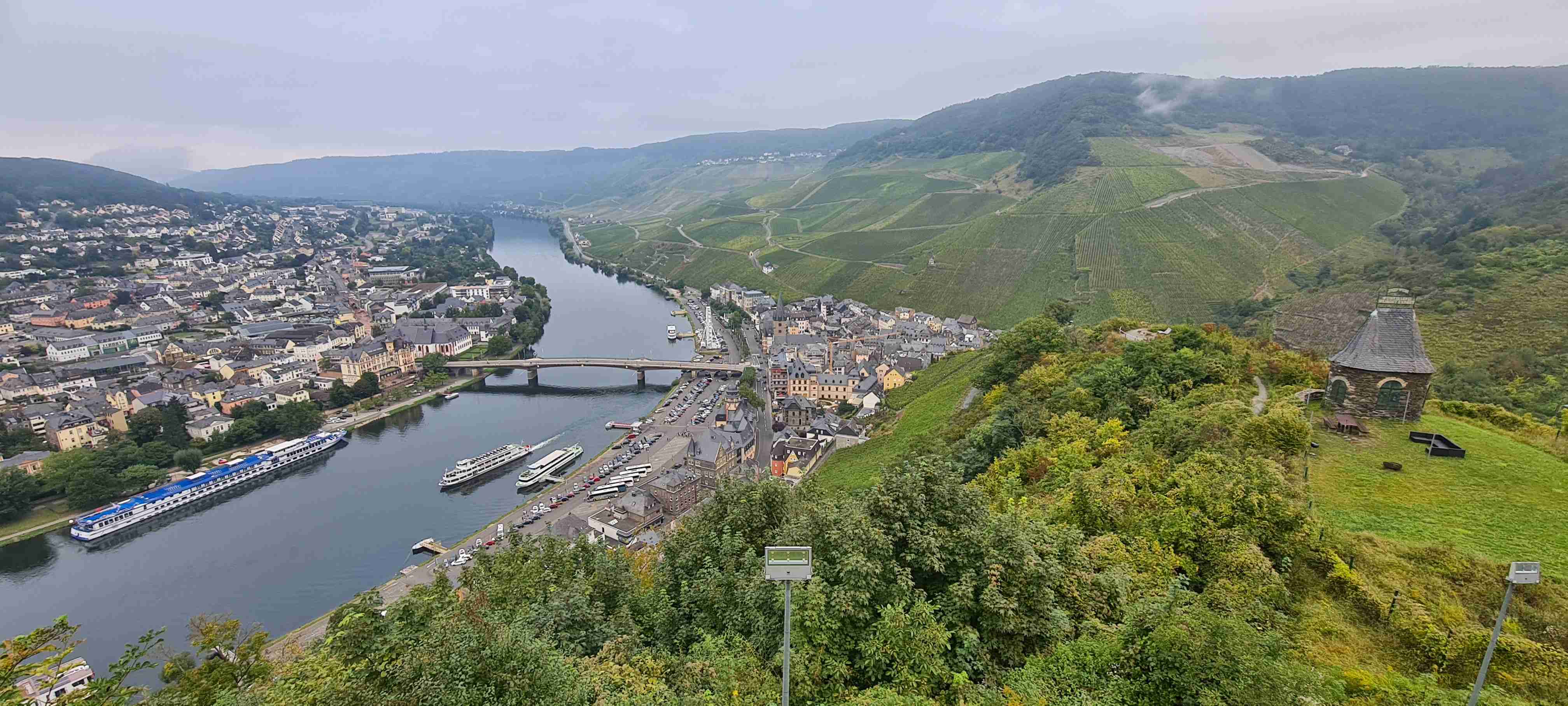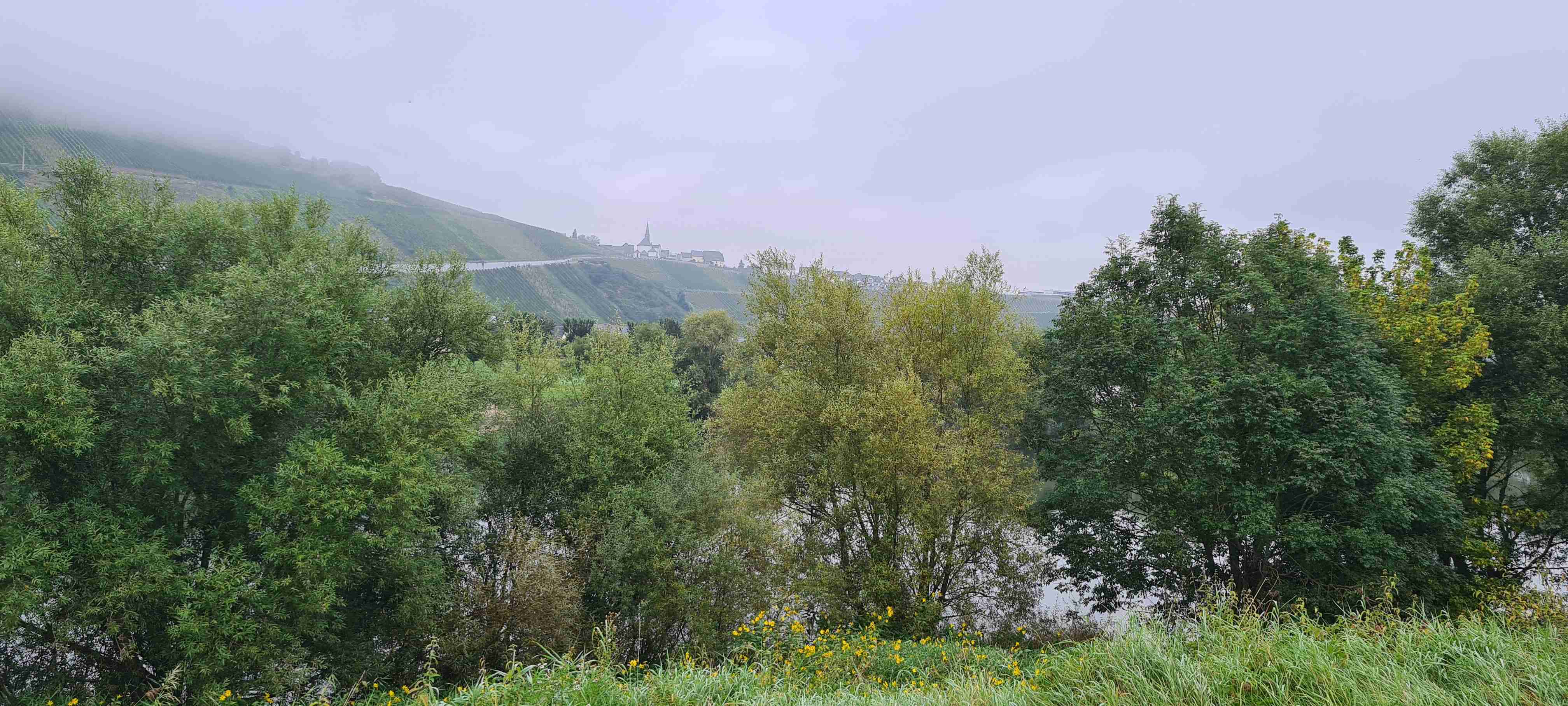 Po snídani jsme si naložili vše do autobusu a na kolech vyrazili do další destinace. Pořád podél řeky, ráno se ještě nad řekou i okolím vznášela mlha, která se po poledni rozplynula. Od začátku jsem měl problém s navigací, nechtěla si načíst satelity a v podstatě až po cca 10 km, když jsem dojížděl do Bernkastel-Kuesu, naskočila. Nakonec však stejně jako předešlý den se trasa jízdy zasekla a je nedostupná, a tudíž ani nejsou k dispozici videa Relive. Přes zimu ji dám do servisu a uvidíme. V Bernkastelu jsem si jako minule vydupal nahoru ke hradu Landshut, kopec je to příšerný, ale výhledy stojí za to. Po pořízení několika fotografií jsem sjel zpět dolů do města a zajel do centra, které jsem si již po třetí prošel a opětovně nafotil. Tady mne zastihl Luborův telefonát, že vinotéka na druhém břehu je i dnes otevřená. Přejel jsem tedy po mostě, ve vinotéce koupil dvě lahve moselského a popojel pár set metrů k autobusu, který zde čekal právě z důvodu uložení nakoupeného vína. Dojedl jsem zbytky zásob z Čech, dal si pivo a pokračoval jsem v cestě. Vrátil jsem se na pravý břeh a vykružoval meandry mezi vinicemi. Kolem 13. hodiny se spustil déšť, oblékl jsem tedy nepromokavé doplňky a pokračoval v cestě. Po hodině déšť ustal, tak jsem se opět odstrojil. Po 14. hodině jsem dorazil do Traben - Trarbachu, udělal jsem pár fotek, prošel jsem se pěší zónou a pomalu dojel zbývajících cca 5 km do Enkirchu do hotelu Loosen, kde jsme měli naplánovány dvě noci. Najeto cca 45 km, v klídku jsem se zkulturnil a navečer jsme vyrazili do nevelké hotelové restaurace, která byla jen pro nás. Tady jsem se odměnil krásným steakem a pivečkem ve společnosti přátel z Rubikonu. Co víc si přát!