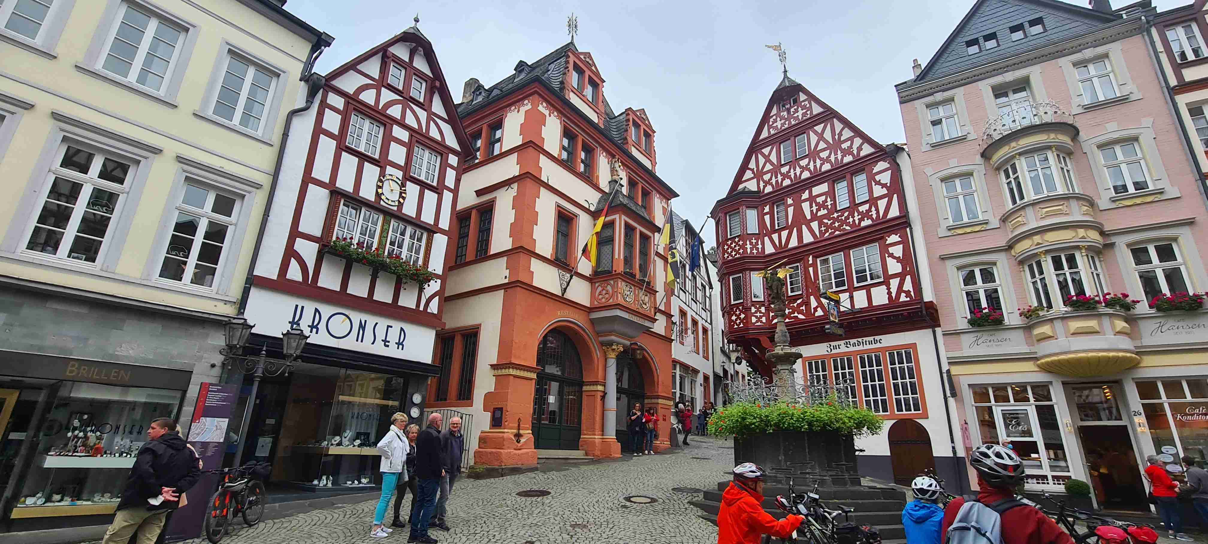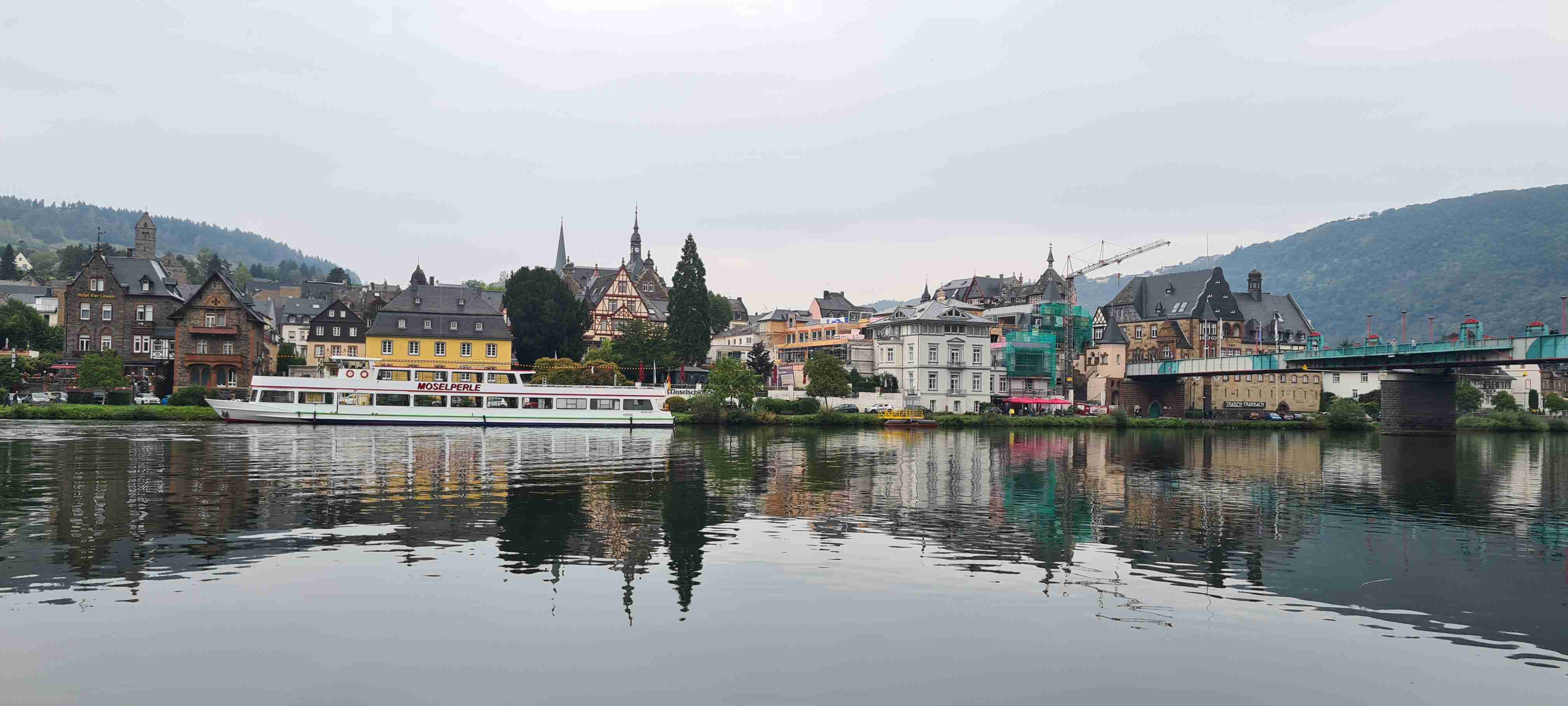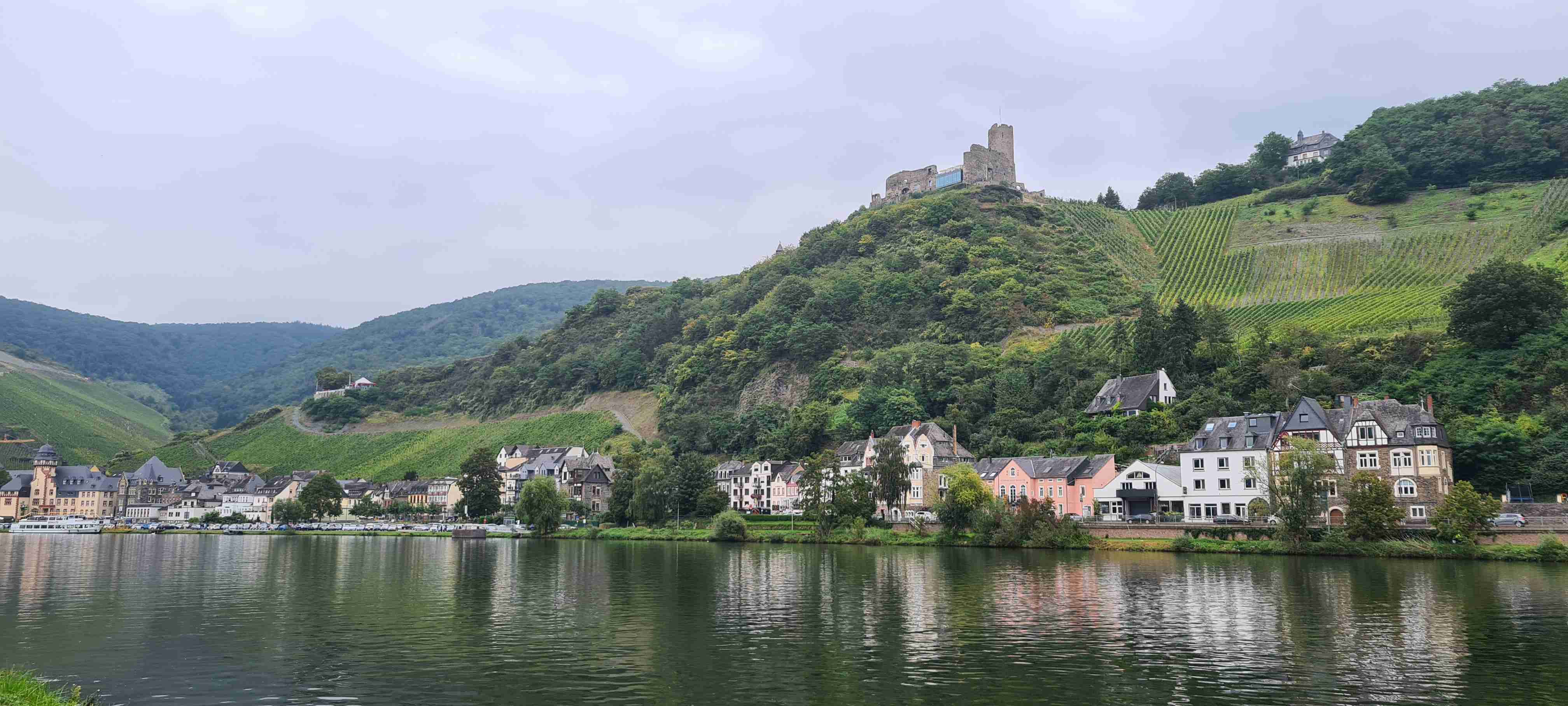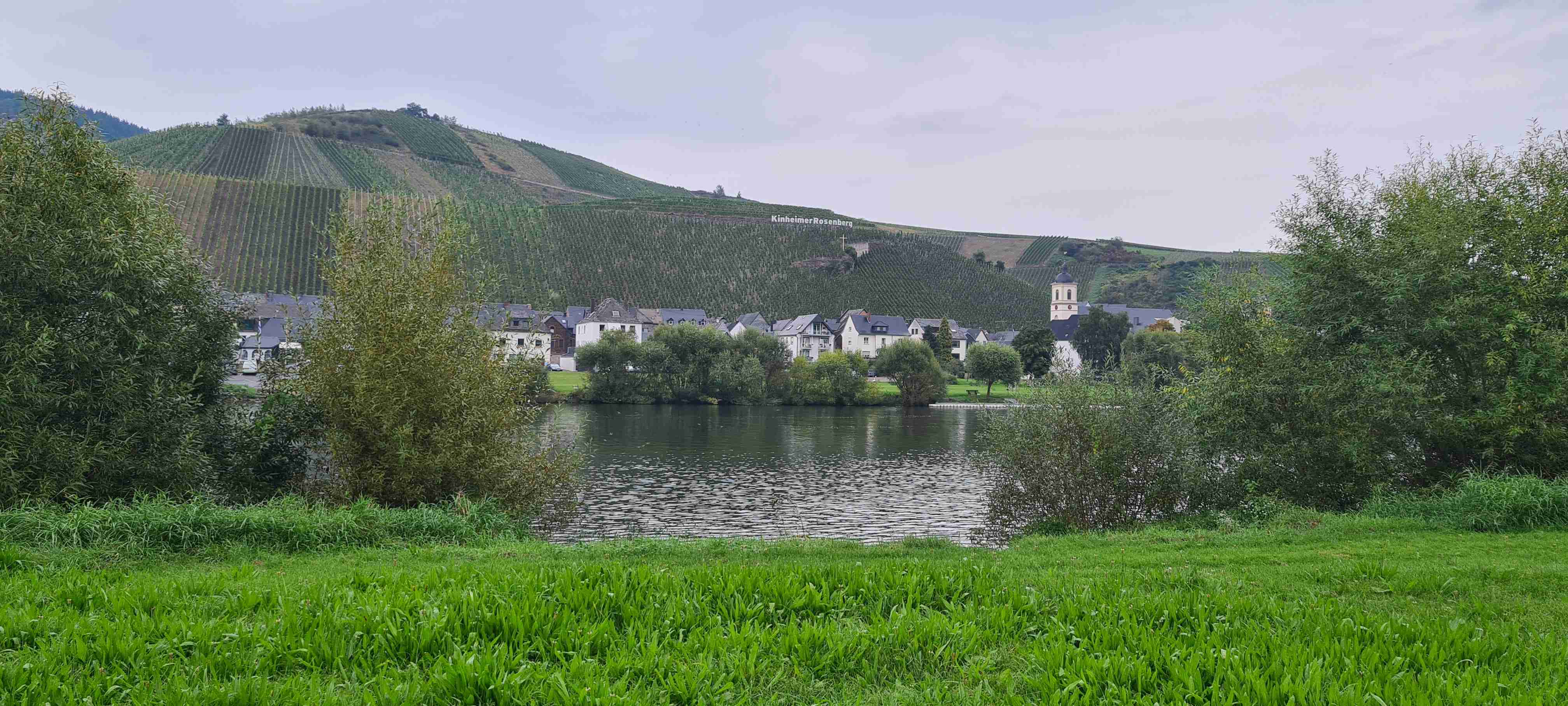 Po snídani jsme si naložili vše do autobusu a na kolech vyrazili do další destinace. Pořád podél řeky, ráno se ještě nad řekou i okolím vznášela mlha, která se po poledni rozplynula. Od začátku jsem měl problém s navigací, nechtěla si načíst satelity a v podstatě až po cca 10 km, když jsem dojížděl do Bernkastel-Kuesu, naskočila. Nakonec však stejně jako předešlý den se trasa jízdy zasekla a je nedostupná, a tudíž ani nejsou k dispozici videa Relive. Přes zimu ji dám do servisu a uvidíme. V Bernkastelu jsem si jako minule vydupal nahoru ke hradu Landshut, kopec je to příšerný, ale výhledy stojí za to. Po pořízení několika fotografií jsem sjel zpět dolů do města a zajel do centra, které jsem si již po třetí prošel a opětovně nafotil. Tady mne zastihl Luborův telefonát, že vinotéka na druhém břehu je i dnes otevřená. Přejel jsem tedy po mostě, ve vinotéce koupil dvě lahve moselského a popojel pár set metrů k autobusu, který zde čekal právě z důvodu uložení nakoupeného vína. Dojedl jsem zbytky zásob z Čech, dal si pivo a pokračoval jsem v cestě. Vrátil jsem se na pravý břeh a vykružoval meandry mezi vinicemi. Kolem 13. hodiny se spustil déšť, oblékl jsem tedy nepromokavé doplňky a pokračoval v cestě. Po hodině déšť ustal, tak jsem se opět odstrojil. Po 14. hodině jsem dorazil do Traben - Trarbachu, udělal jsem pár fotek, prošel jsem se pěší zónou a pomalu dojel zbývajících cca 5 km do Enkirchu do hotelu Loosen, kde jsme měli naplánovány dvě noci. Najeto cca 45 km, v klídku jsem se zkulturnil a navečer jsme vyrazili do nevelké hotelové restaurace, která byla jen pro nás. Tady jsem se odměnil krásným steakem a pivečkem ve společnosti přátel z Rubikonu. Co víc si přát!
