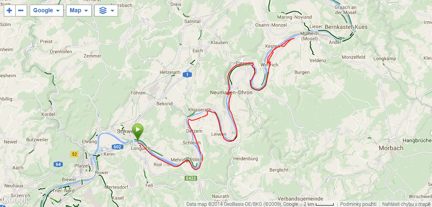 Snídaně v 8:00, briefing v 9:00. Hned po brífinku jsem zajel rychle do marketu koupit chleba a papriky a současně jsem koupil dvě lahve vína. Po návratu na hotel jsme naložili zavazadla do busu a krátce po desáté jsme za sluníčka vyrazili – přejeli jsme po mostě na pravý břeh a zase podél řeky po cyklostezce lemované vinicemi. Jednou Iva, následujíce příkladu některých kolegů, neodolala, a hrozen si utrhla. Jinak jsme v poklidu vykružovali meandry řeky Mosely a po cca 25 km jsem v městečku Neumagen-Dhron narazili na vinobraní. Silnice, probíhající středem městečka, byla uzavřená pro provoz a byla plná stánků se vším možným. Sedli jsme si do jedné předzahrádky a dali si ještě s našimi jedněmi kolegy pár skleniček (každý 2 x 1 dl !). Po tomto krátkém občerstvení jsme prošli s koly zbytek ulice, na konci opět nasedli na kolo a po mostě, na doporučení Lubora, přejeli na druhý, levý břeh, po kterém jsme jeli pár kilometrů až k obci Piesport, kde jsme se po mostě, uzavřeném pro dopravu, vrátili zpět na pravý břeh. Po zhruba hodince jízdy jsme dorazili do obce Wintrich, kde jsme našli penzion Beauty-Farm. Dostali jsme dva jednolůžkové pokoje spojené balkonem, no prostě opět luxusní bydlení. Protože bylo poměrně brzo, vyrazili jsme ještě dál do cca 4 km vzdáleného Braunebergu, kde bylo také vinobraní. Na začátku pijácké zóny jsme zamkli kola a pěšky jsme se chvílemi prodírali zástupy lidí – všude samé stánky, víno, jídlo, šmuky. Došli jsme na konec, otočili se a cestou zpět jsme si dali v jednom dvoře opět trochu burčáku. Poté jsme se vrátili ke kolům a na nich zpět do našeho penzionu. Celkově jsme měli najeto asi 53 km. V penzionu nebyla žádná restaurace, takže se nám hodil můj ranní nákup – pojedli jsme z vlastních, pořád ještě dostatečných zásob, a víno jsme si vychutnali až do dna. Hotovo, spát.
