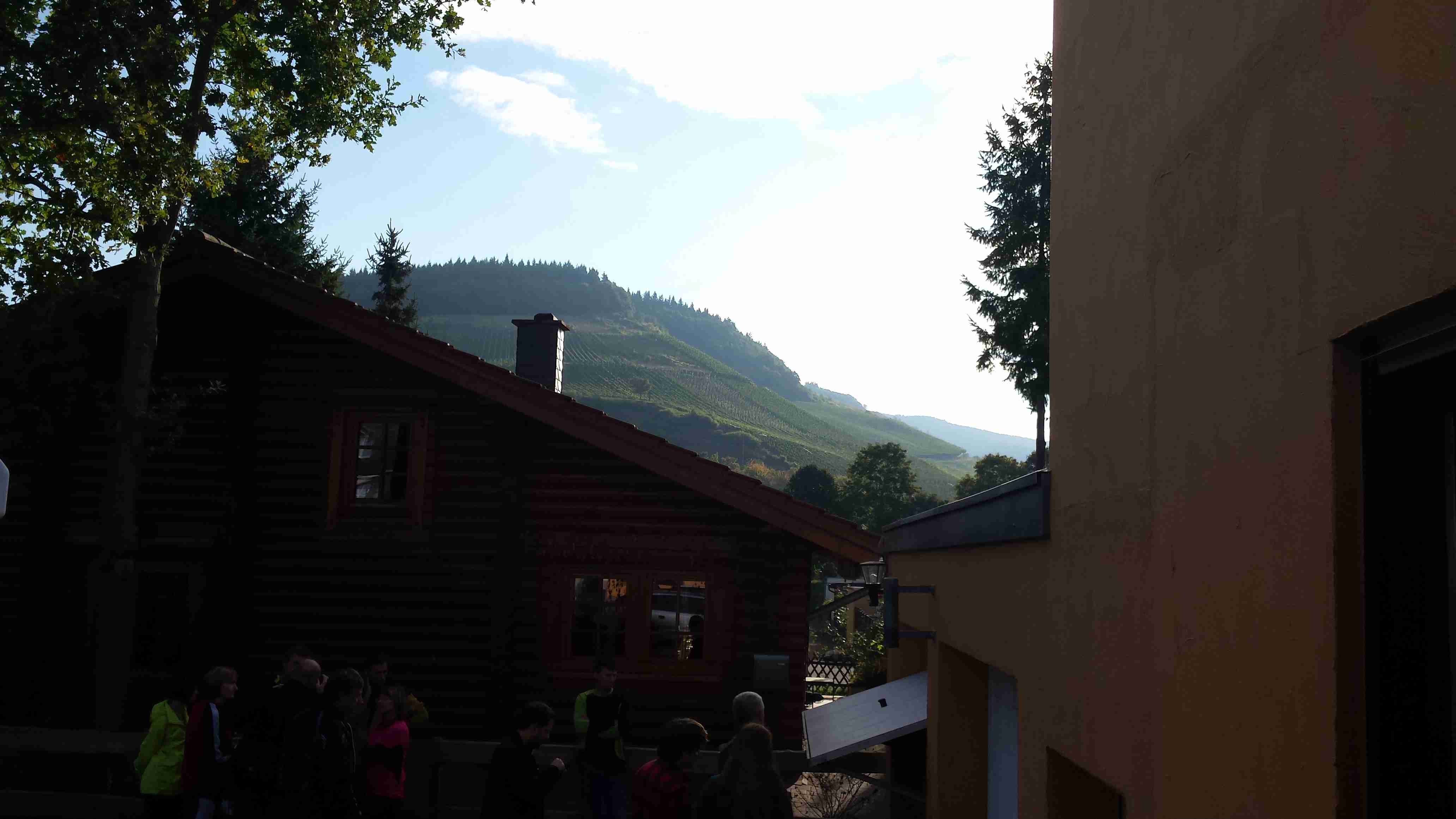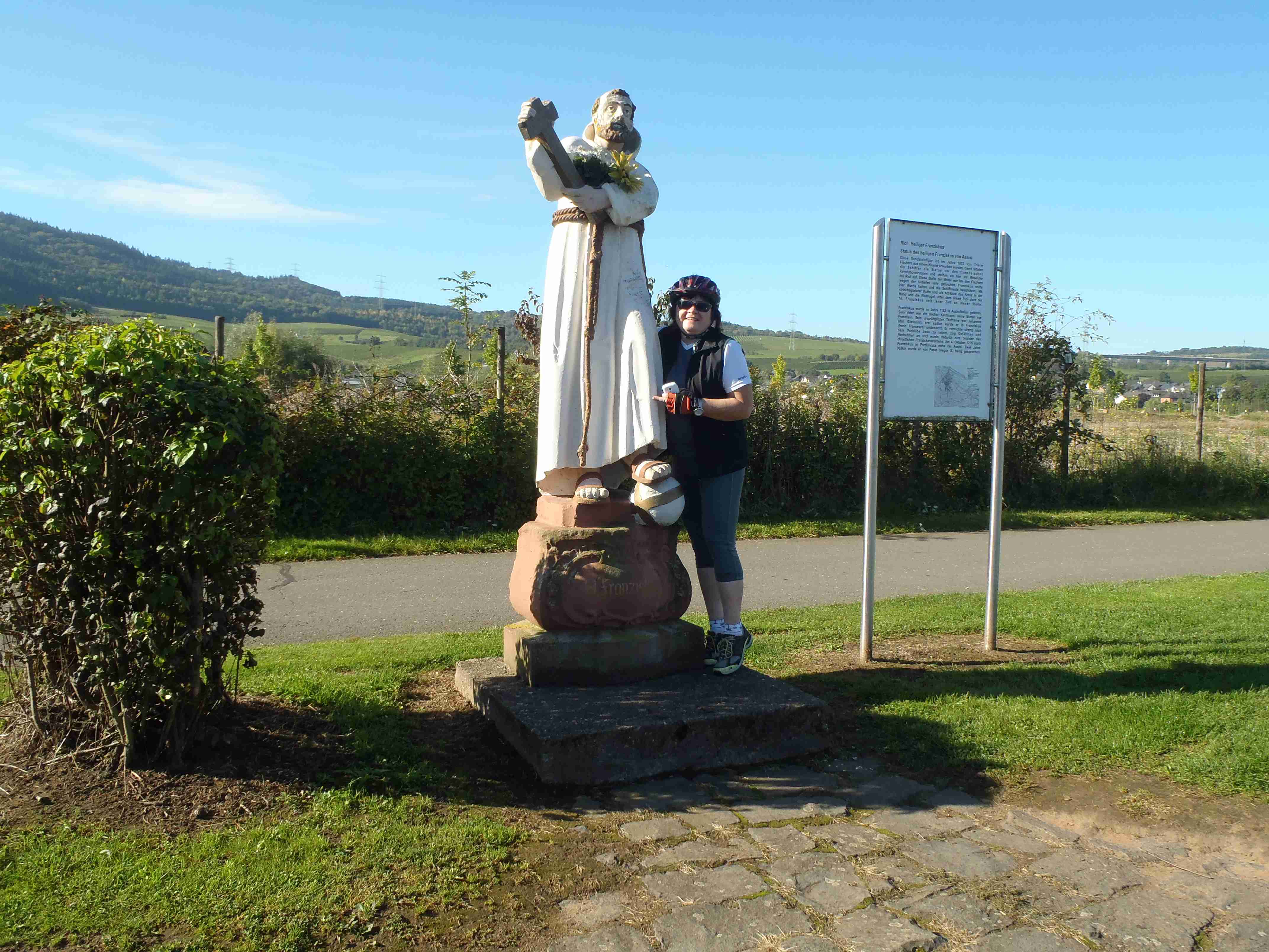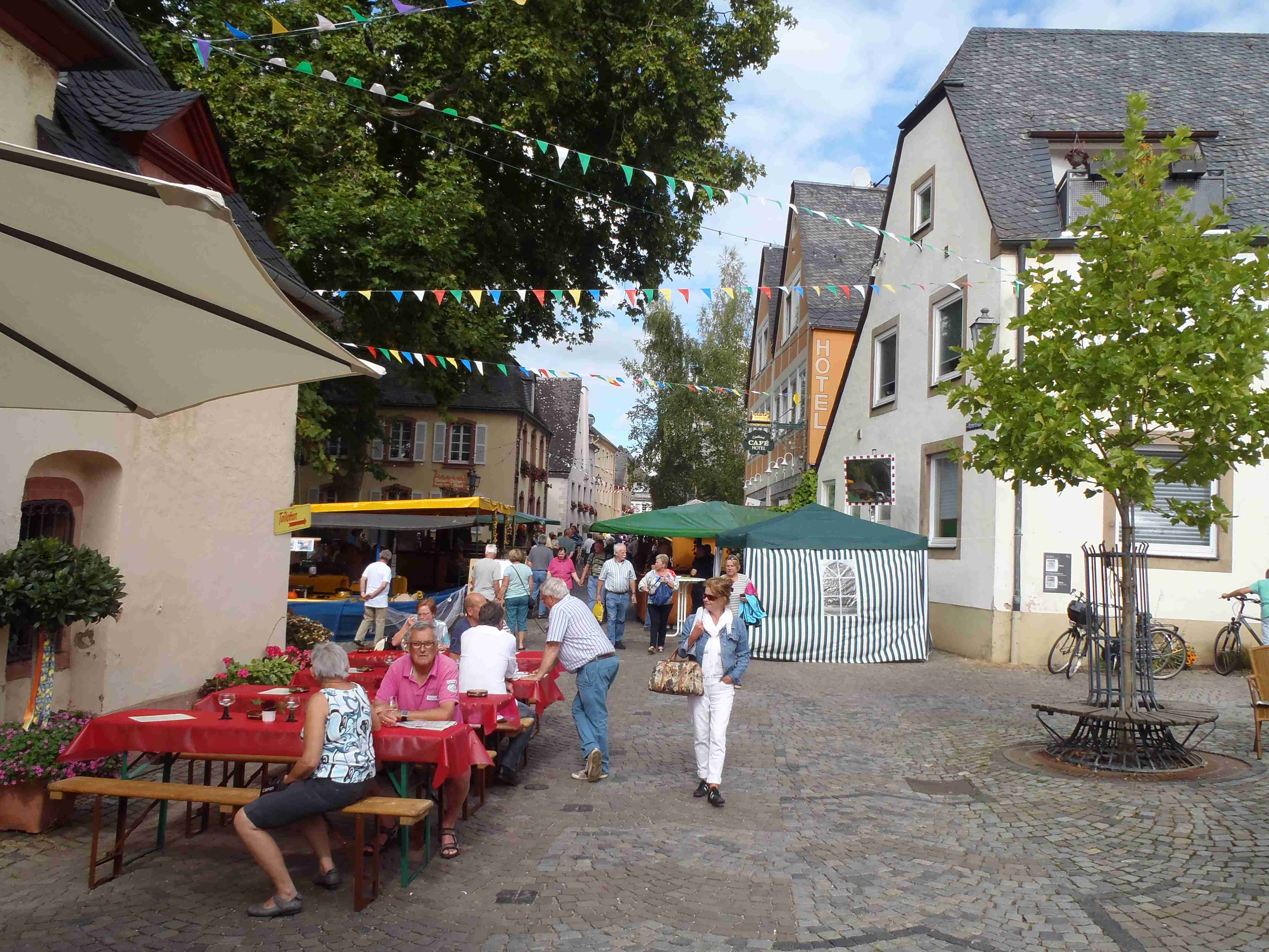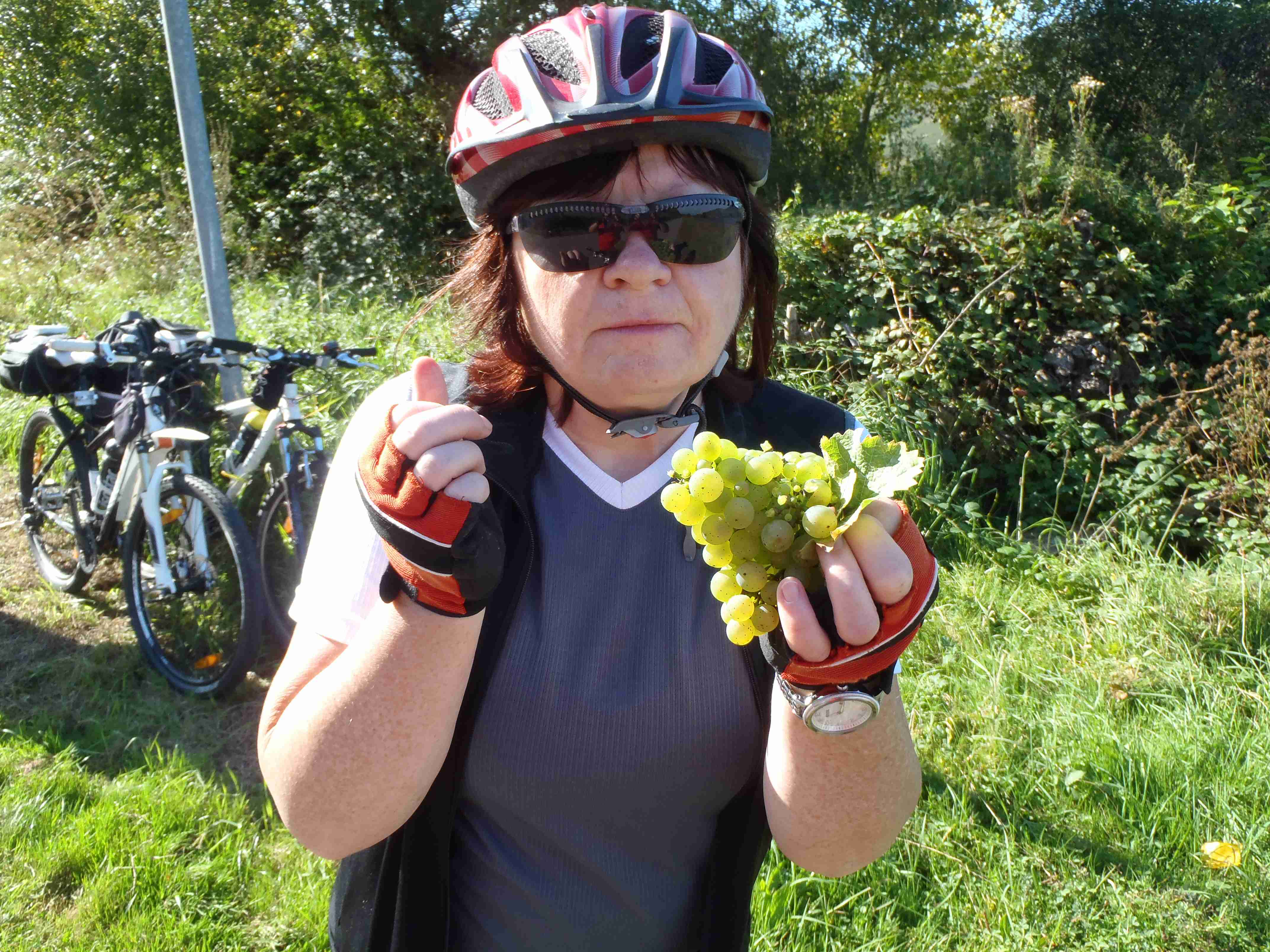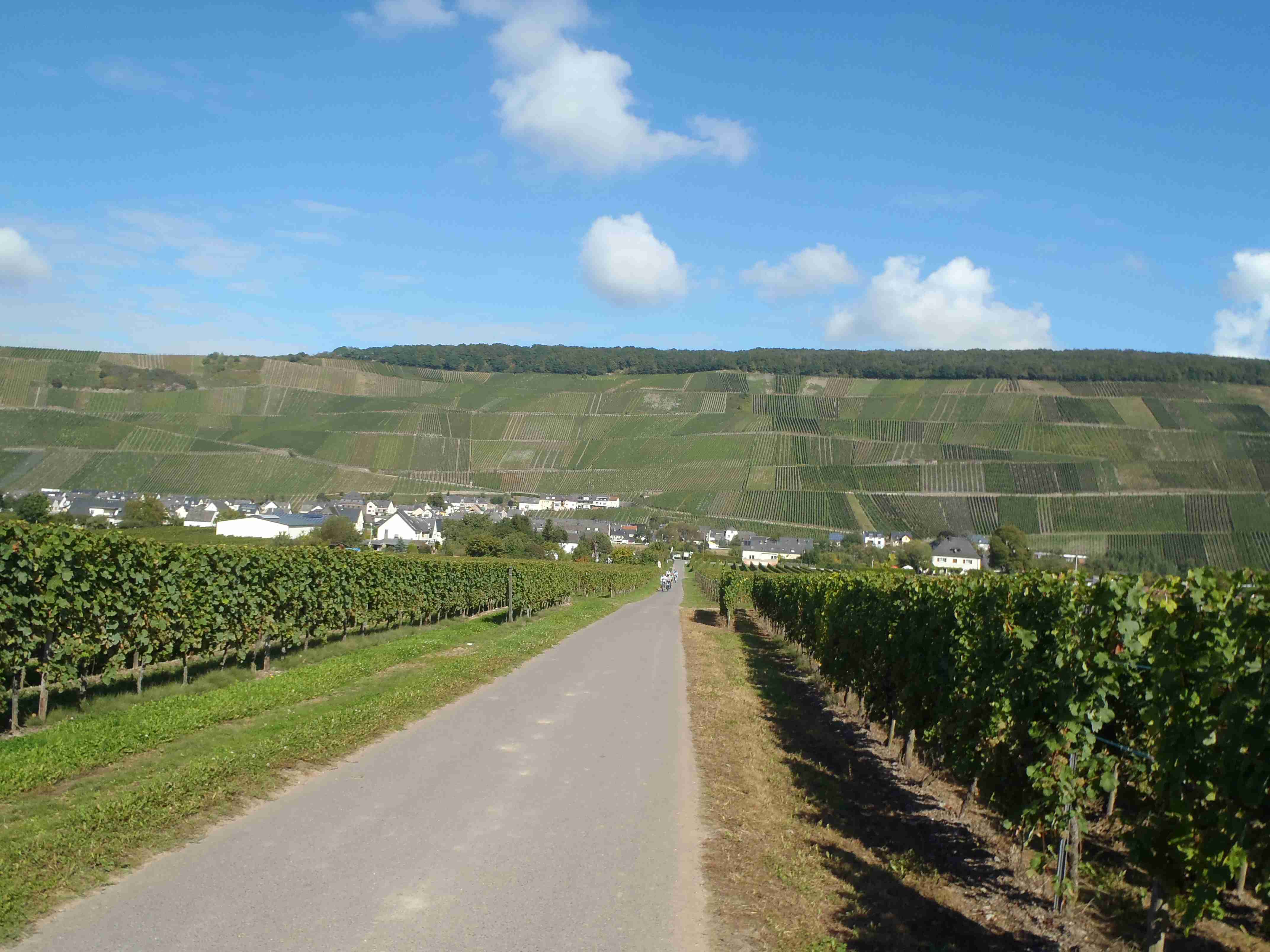 Snídaně v 8:00, briefing v 9:00. Hned po brífinku jsem zajel rychle do marketu koupit chleba a papriky a současně jsem koupil dvě lahve vína. Po návratu na hotel jsme naložili zavazadla do busu a krátce po desáté jsme za sluníčka vyrazili – přejeli jsme po mostě na pravý břeh a zase podél řeky po cyklostezce lemované vinicemi. Jednou Iva, následujíce příkladu některých kolegů, neodolala, a hrozen si utrhla. Jinak jsme v poklidu vykružovali meandry řeky Mosely a po cca 25 km jsem v městečku Neumagen-Dhron narazili na vinobraní. Silnice, probíhající středem městečka, byla uzavřená pro provoz a byla plná stánků se vším možným. Sedli jsme si do jedné předzahrádky a dali si ještě s našimi jedněmi kolegy pár skleniček (každý 2 x 1 dl !). Po tomto krátkém občerstvení jsme prošli s koly zbytek ulice, na konci opět nasedli na kolo a po mostě, na doporučení Lubora, přejeli na druhý, levý břeh, po kterém jsme jeli pár kilometrů až k obci Piesport, kde jsme se po mostě, uzavřeném pro dopravu, vrátili zpět na pravý břeh. Po zhruba hodince jízdy jsme dorazili do obce Wintrich, kde jsme našli penzion Beauty-Farm. Dostali jsme dva jednolůžkové pokoje spojené balkonem, no prostě opět luxusní bydlení. Protože bylo poměrně brzo, vyrazili jsme ještě dál do cca 4 km vzdáleného Braunebergu, kde bylo také vinobraní. Na začátku pijácké zóny jsme zamkli kola a pěšky jsme se chvílemi prodírali zástupy lidí – všude samé stánky, víno, jídlo, šmuky. Došli jsme na konec, otočili se a cestou zpět jsme si dali v jednom dvoře opět trochu burčáku. Poté jsme se vrátili ke kolům a na nich zpět do našeho penzionu. Celkově jsme měli najeto asi 53 km. V penzionu nebyla žádná restaurace, takže se nám hodil můj ranní nákup – pojedli jsme z vlastních, pořád ještě dostatečných zásob, a víno jsme si vychutnali až do dna. Hotovo, spát.